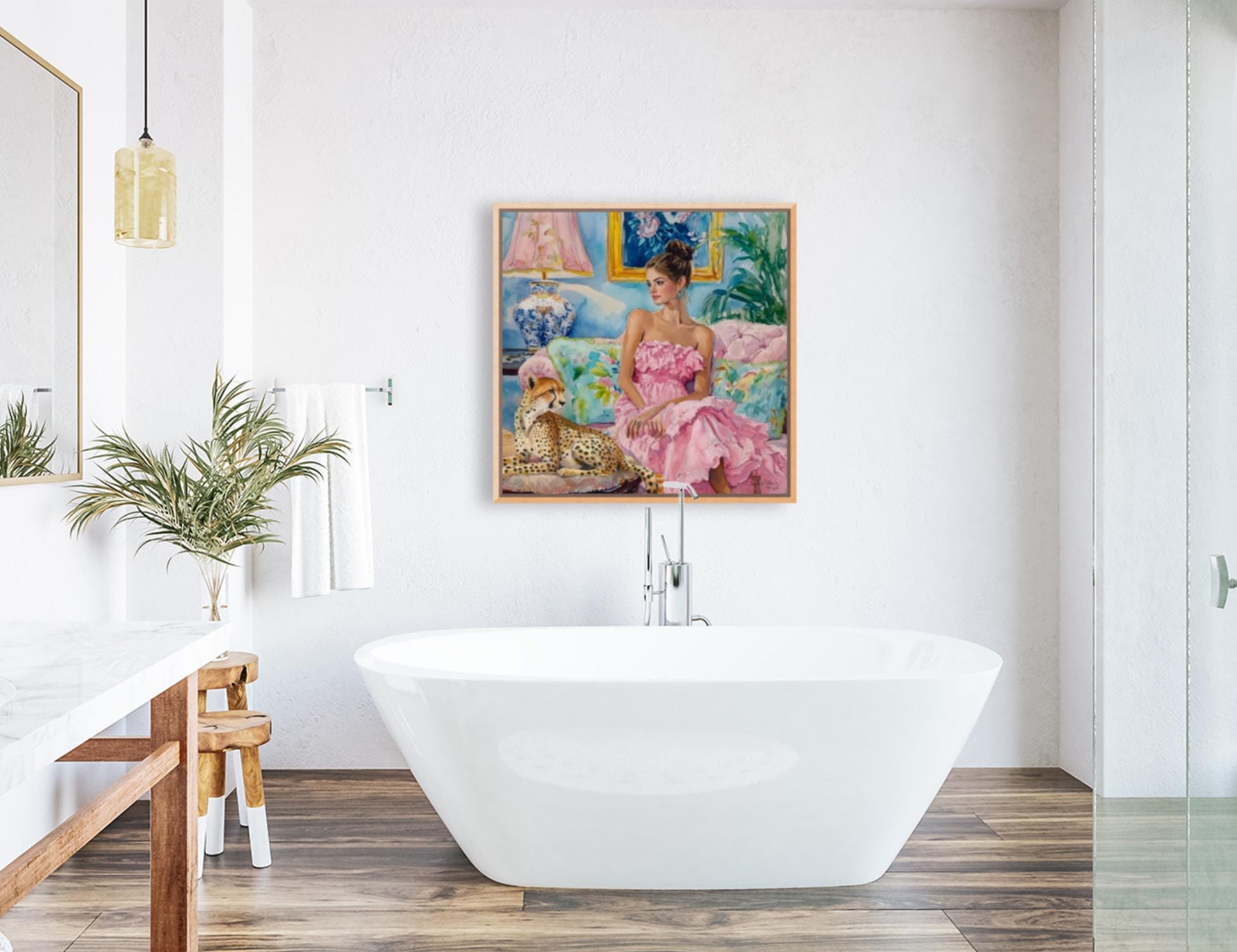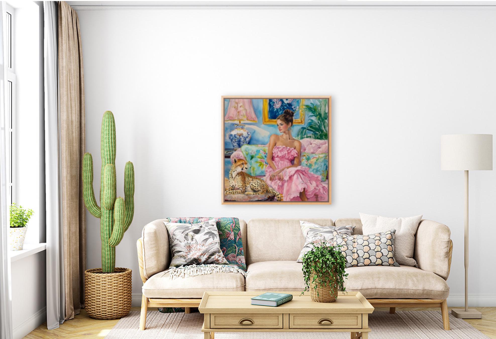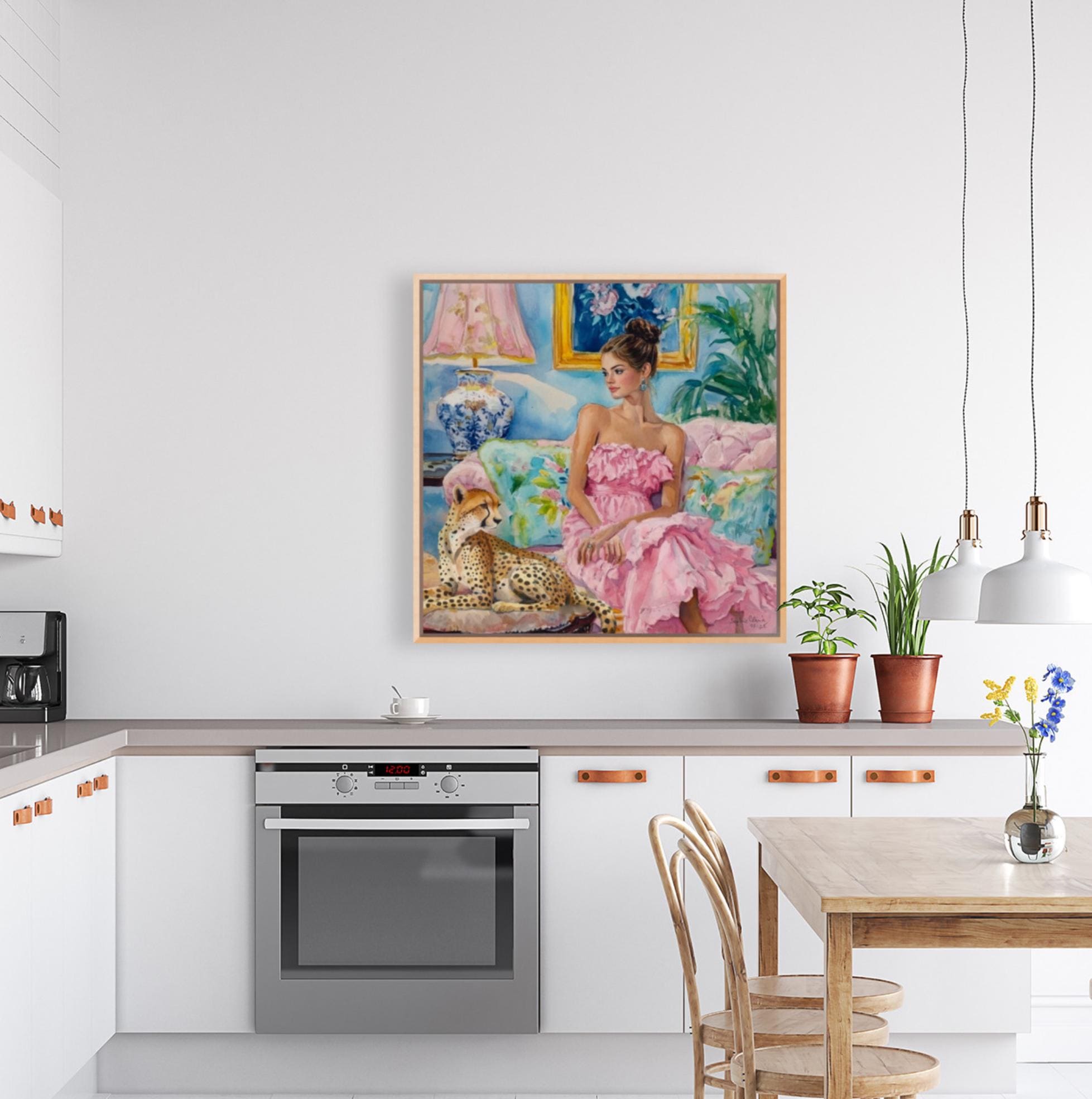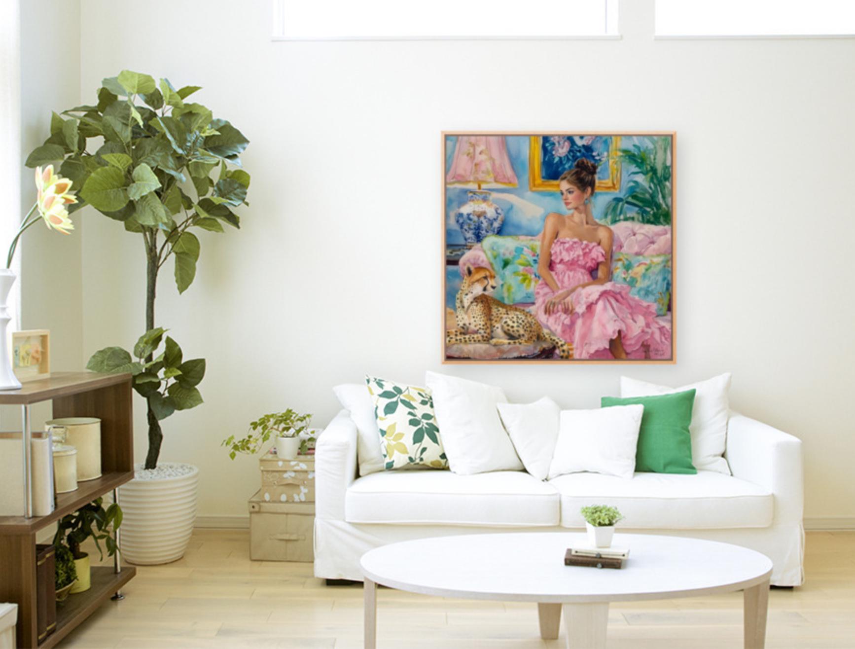 Grandmillennial art, Girl in pink dress with a sitting cheetah, whimsical watercolor art