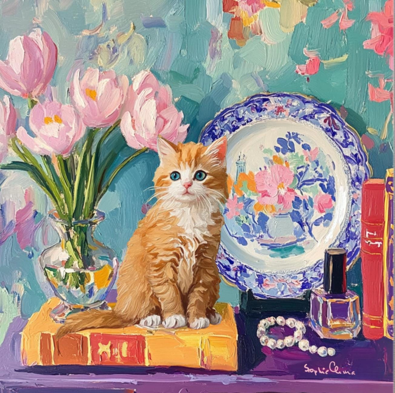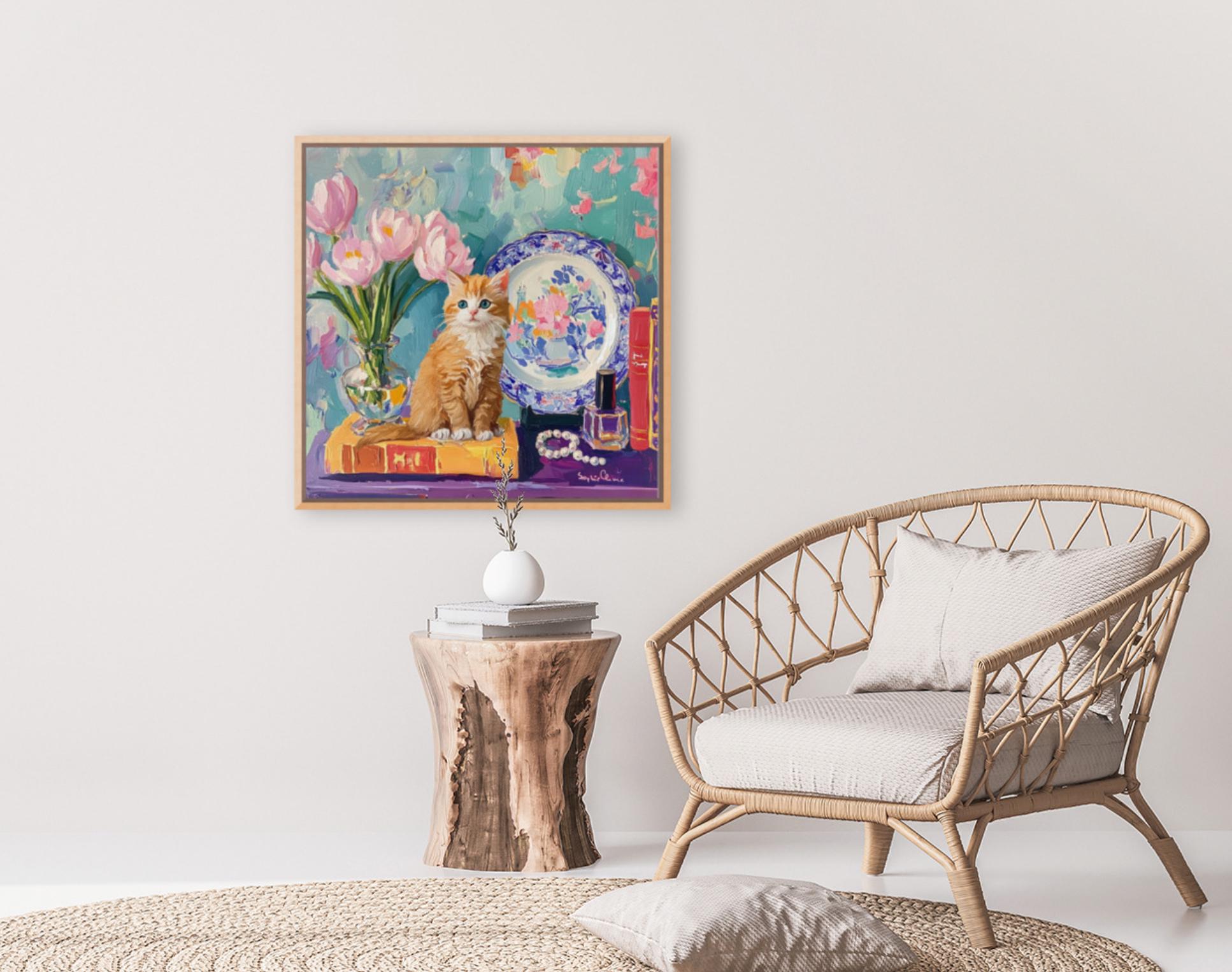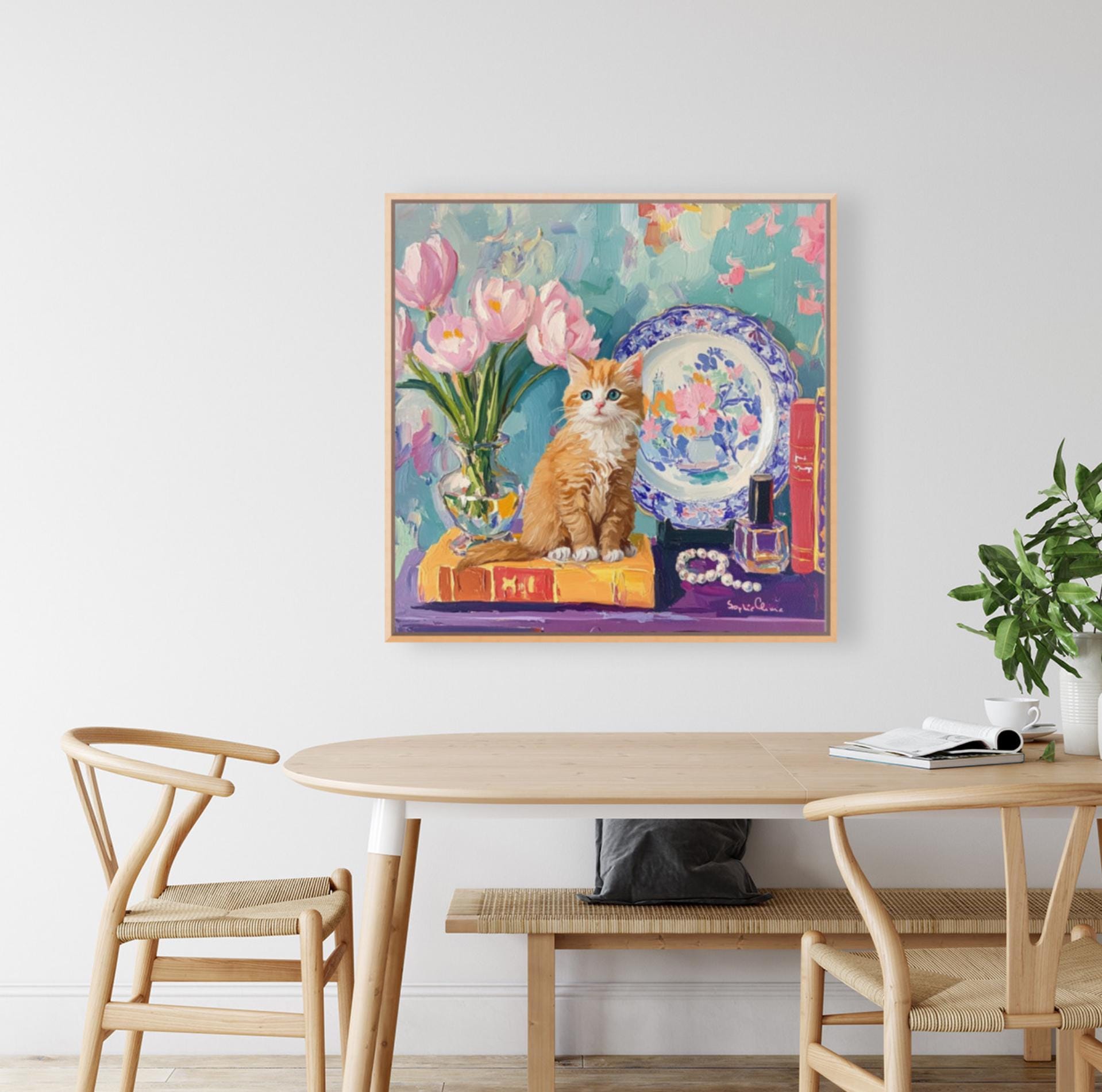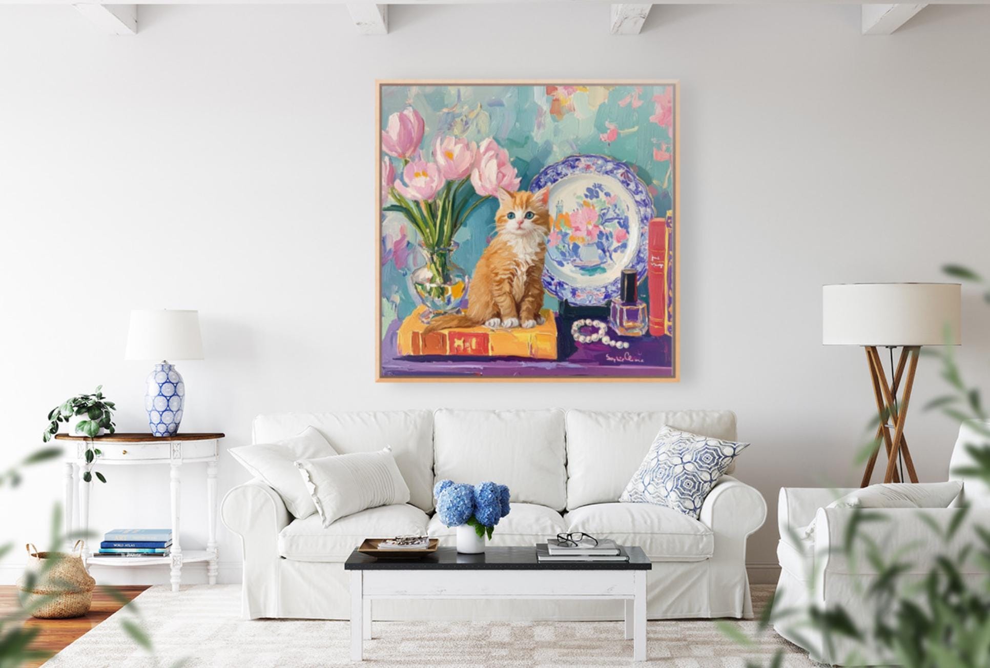 Grandmillennial art, Ginger and the pearls, whimsical cat art