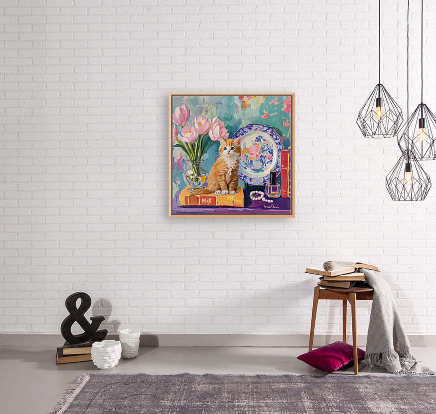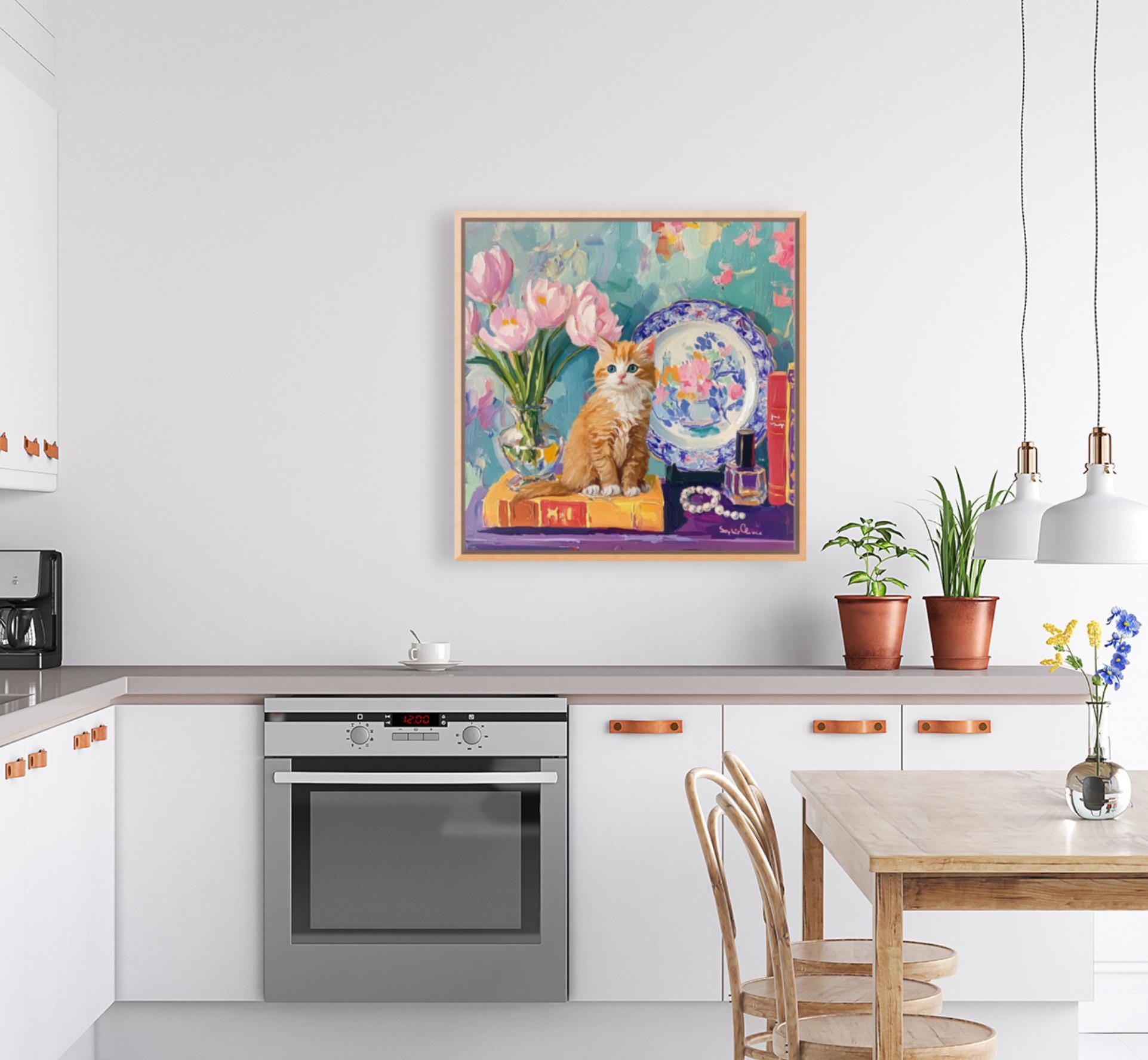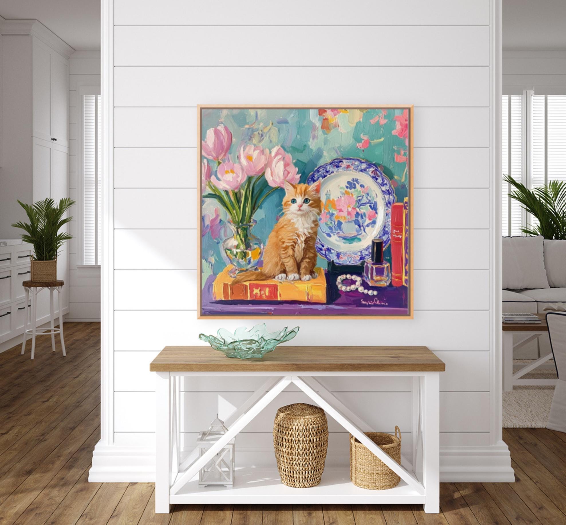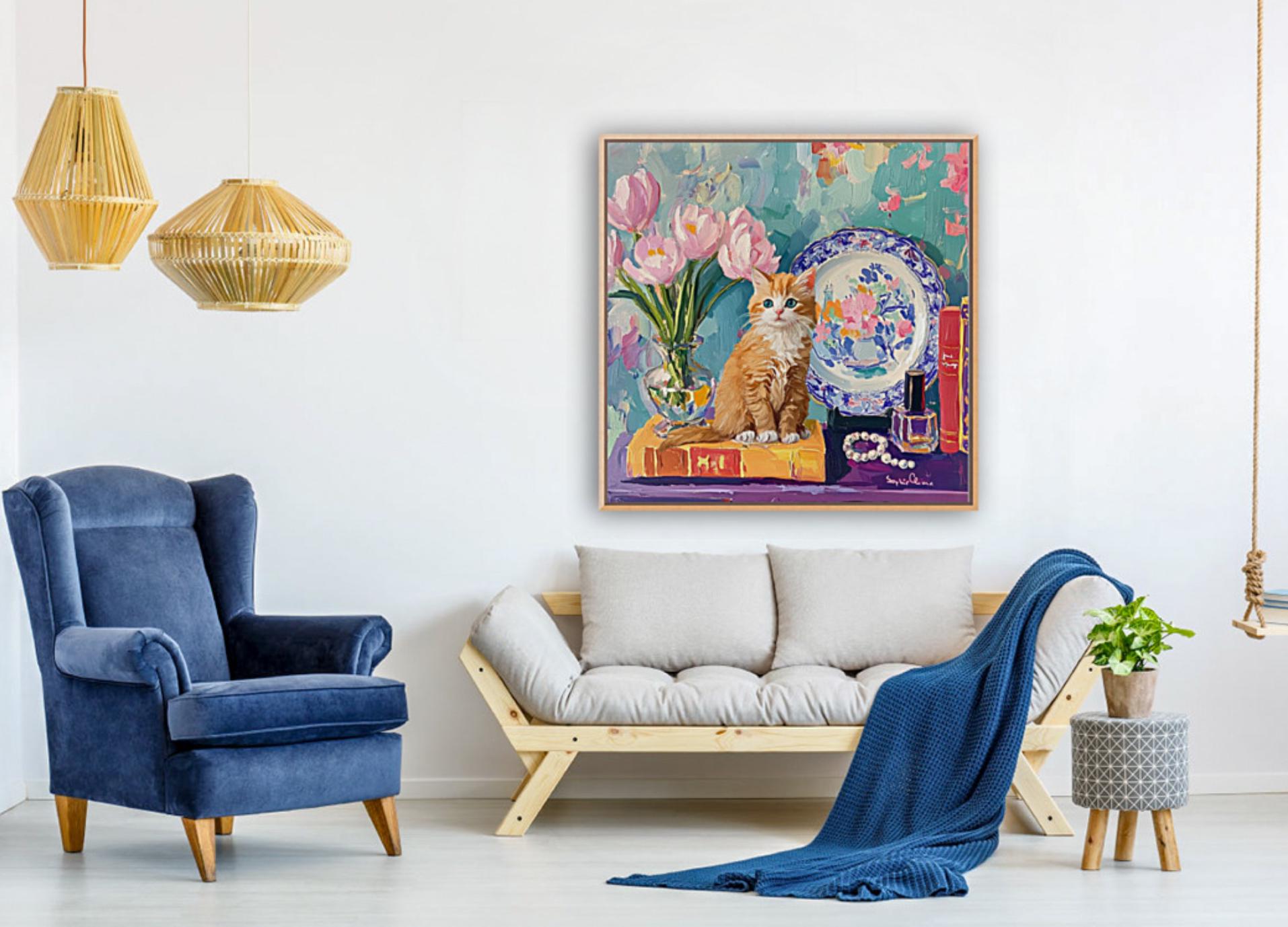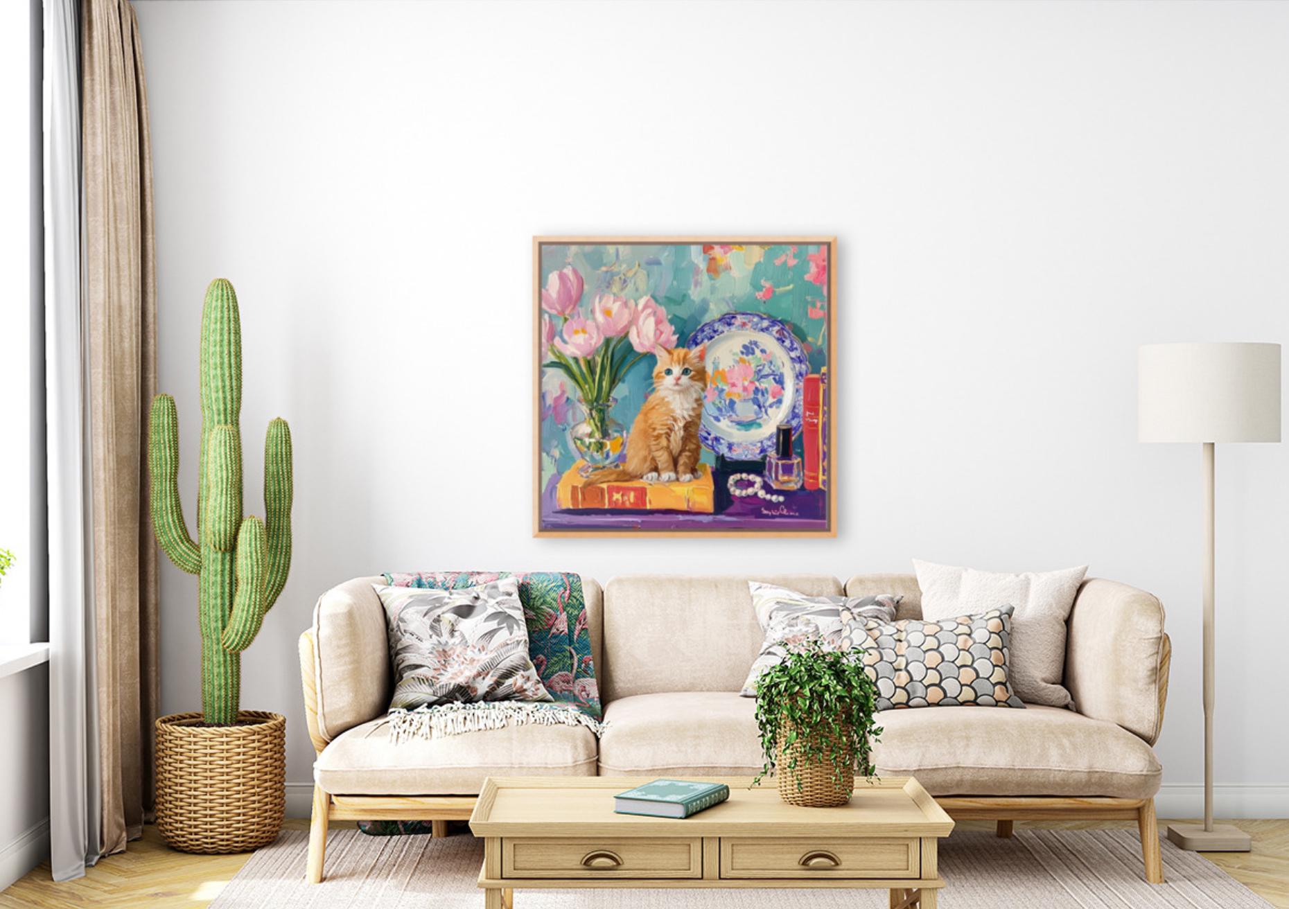 Grandmillennial art, Ginger and the pearls, whimsical cat art