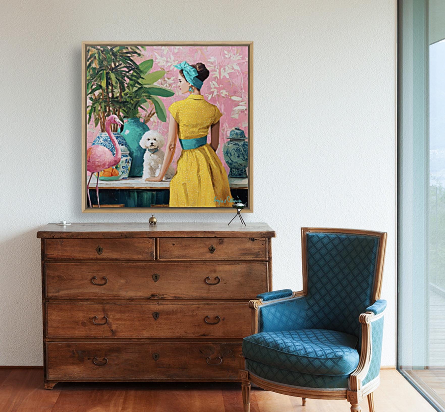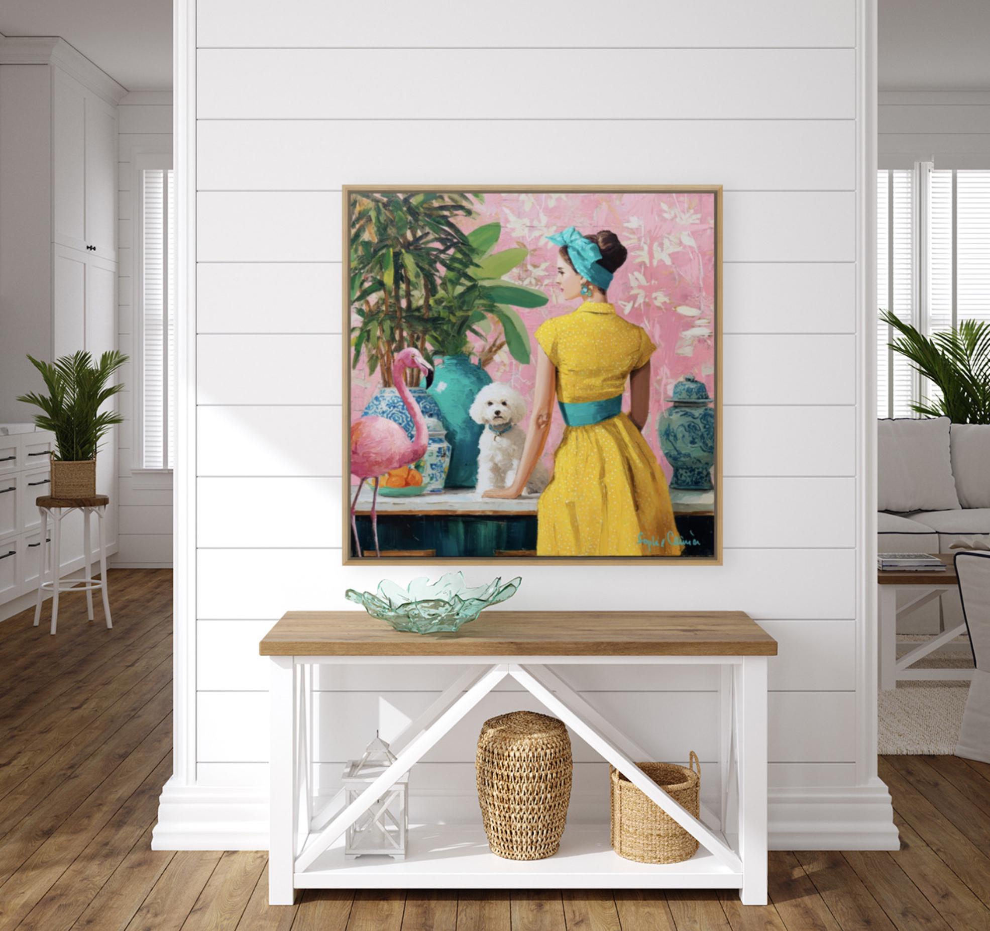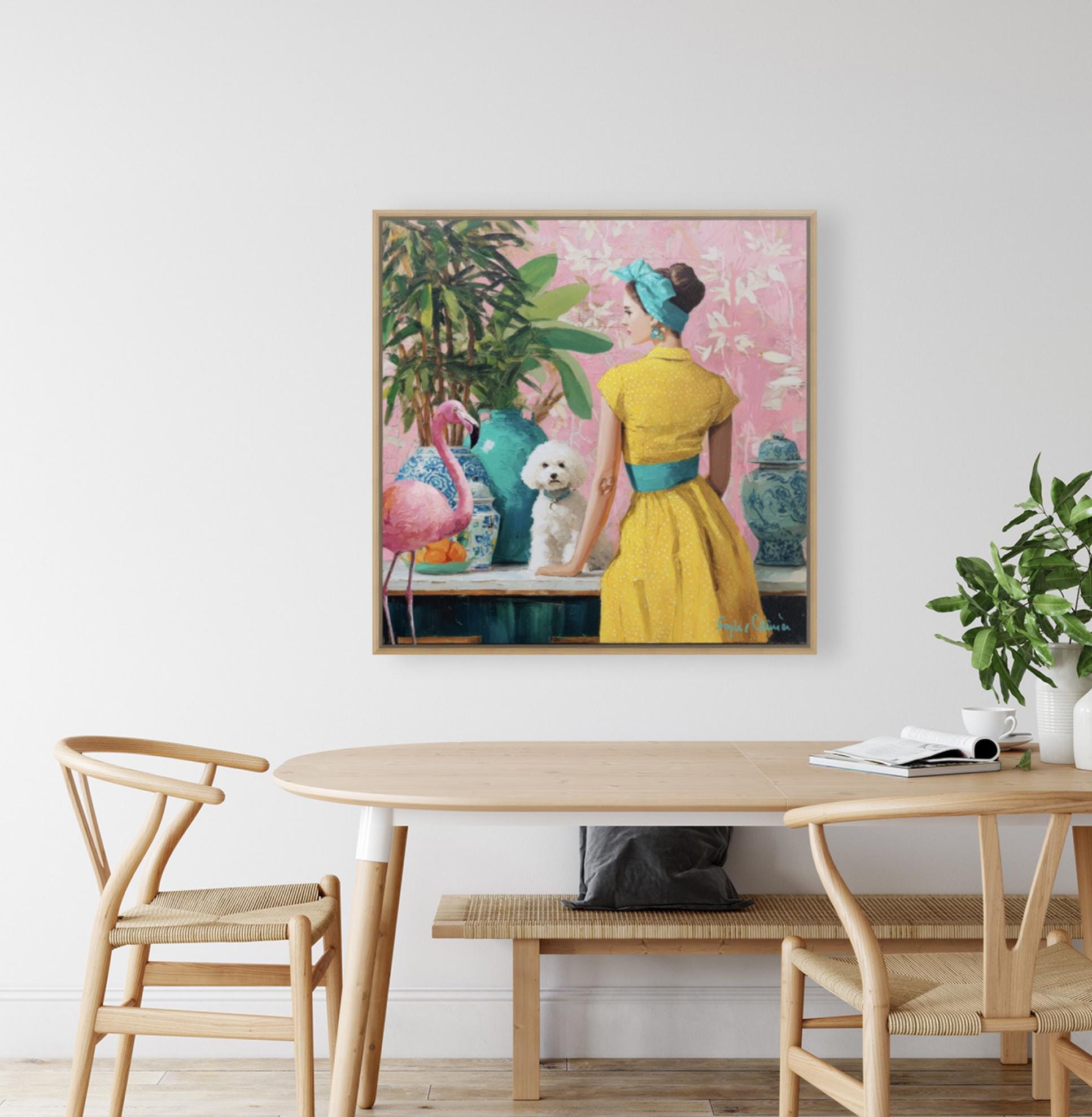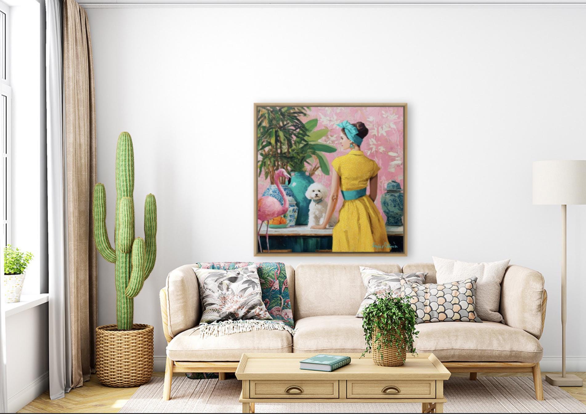 PLEASE NOTE SIZES ARE IN CM. Large giclee print of an original watercolor by Sophie. Fun and whimsical piece. Paper prints are printed using archival ink, on 310 gsm Hahnemuhle German Etching paper. Canvas prints ship ready stretched and UV varnished, Paper prints are shipped rolled in a hard cardboard tube. Add a splash of Palm Beach charm to your walls with this whimsical giclée art print, featuring a preppy woman in a yellow polka-dot dress, a fluffy white Bichon, and a pink flamingo in a vibrant chinoiserie setting. Perfect for lovers of grandmillennial style, storytelling interiors, and tropical luxury.