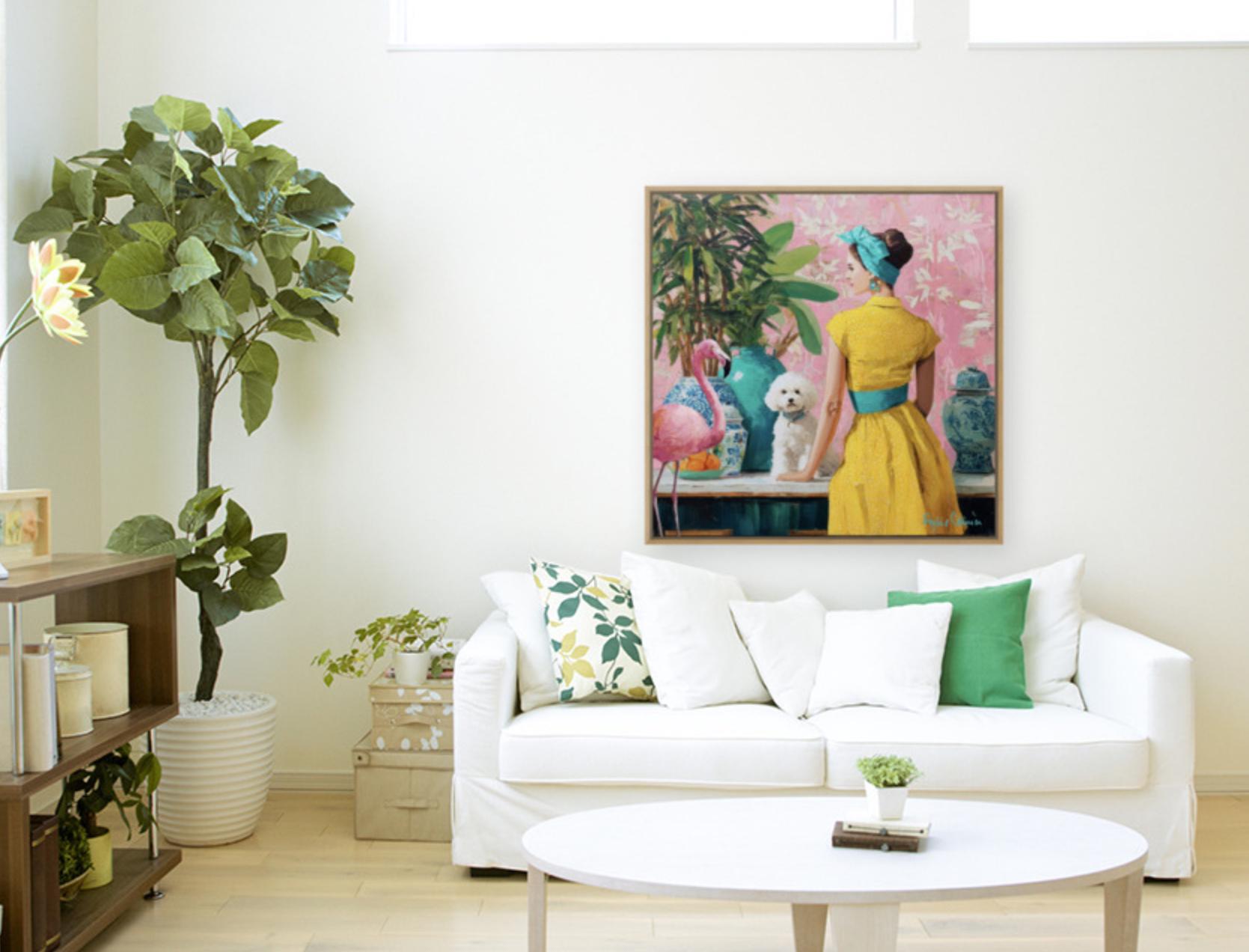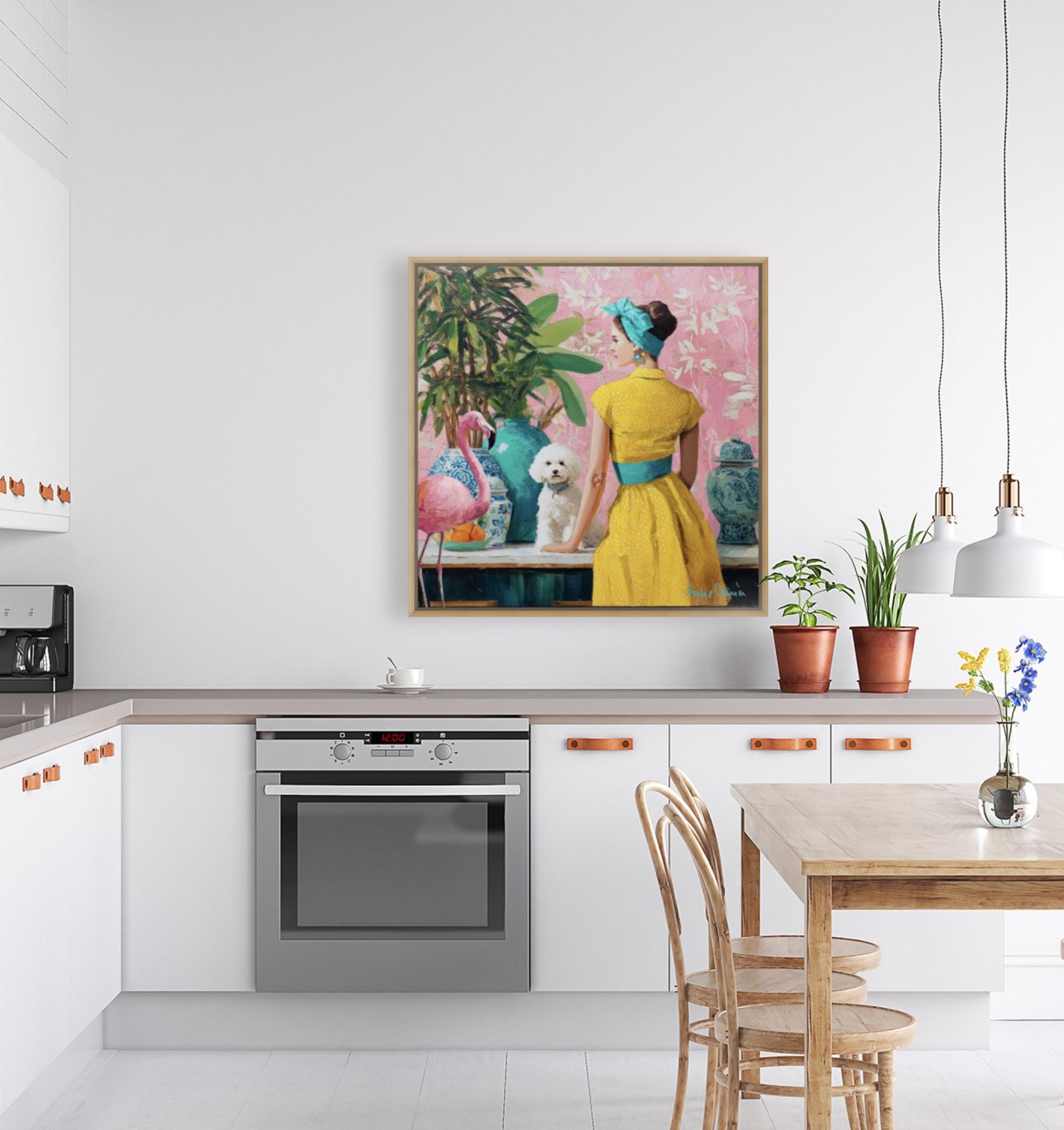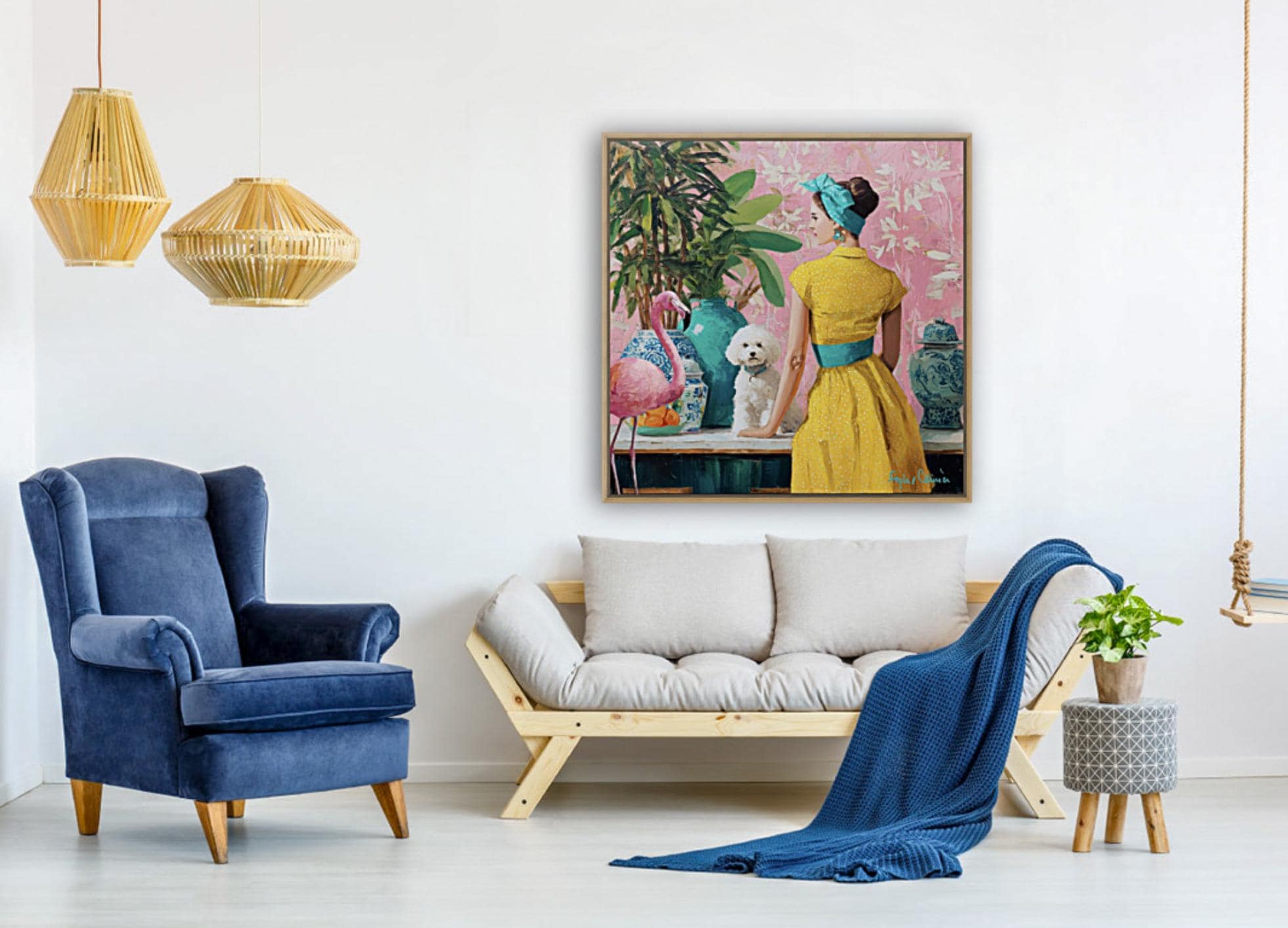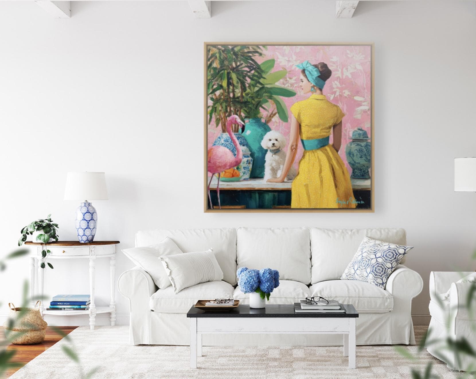 PLEASE NOTE SIZES ARE IN CM. Large giclee print of an original watercolor by Sophie. Fun and whimsical piece. Paper prints are printed using archival ink, on 310 gsm Hahnemuhle German Etching paper. Canvas prints ship ready stretched and UV varnished, Paper prints are shipped rolled in a hard cardboard tube. Add a splash of Palm Beach charm to your walls with this whimsical giclée art print, featuring a preppy woman in a yellow polka-dot dress, a fluffy white Bichon, and a pink flamingo in a vibrant chinoiserie setting. Perfect for lovers of grandmillennial style, storytelling interiors, and tropical luxury.
