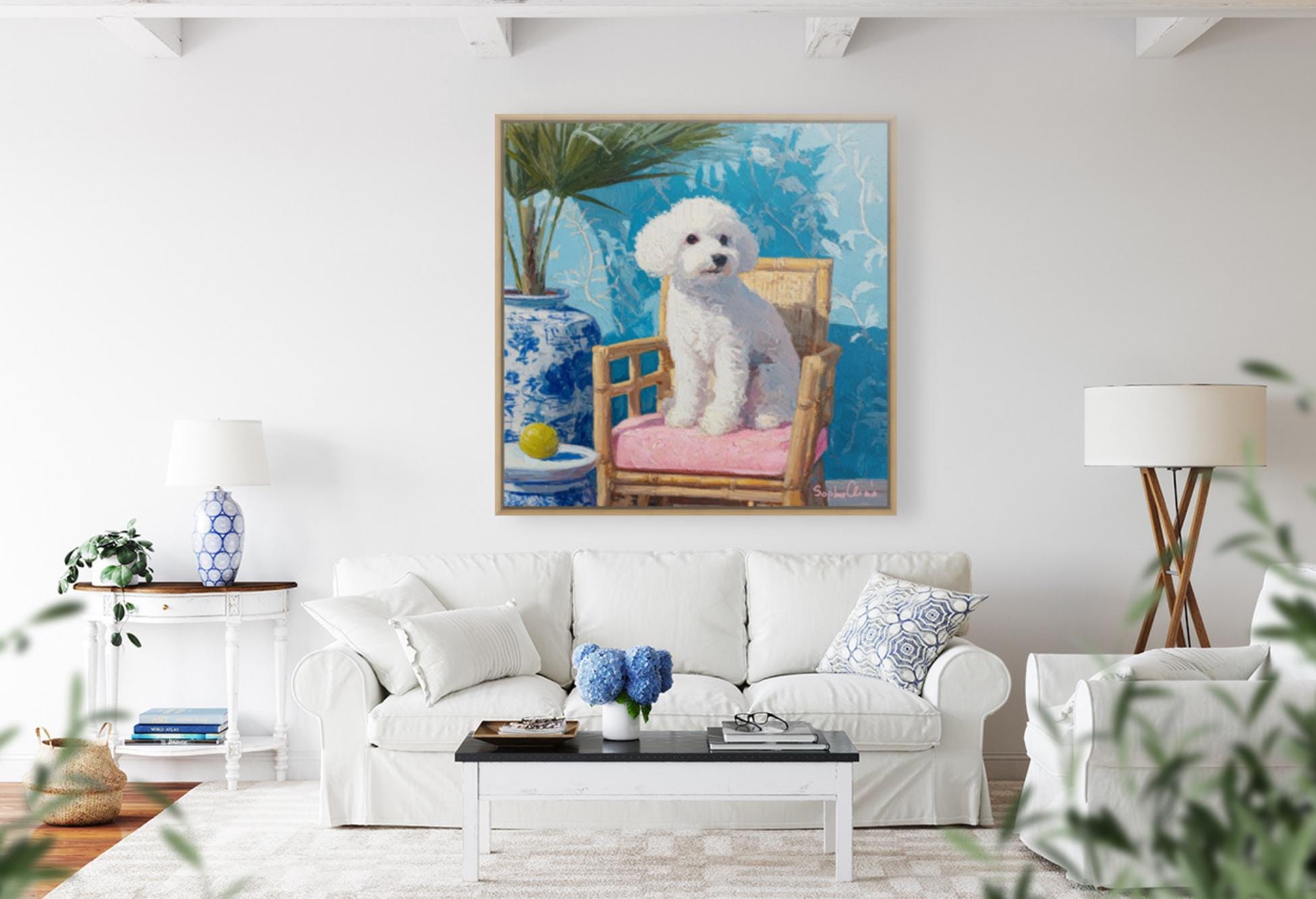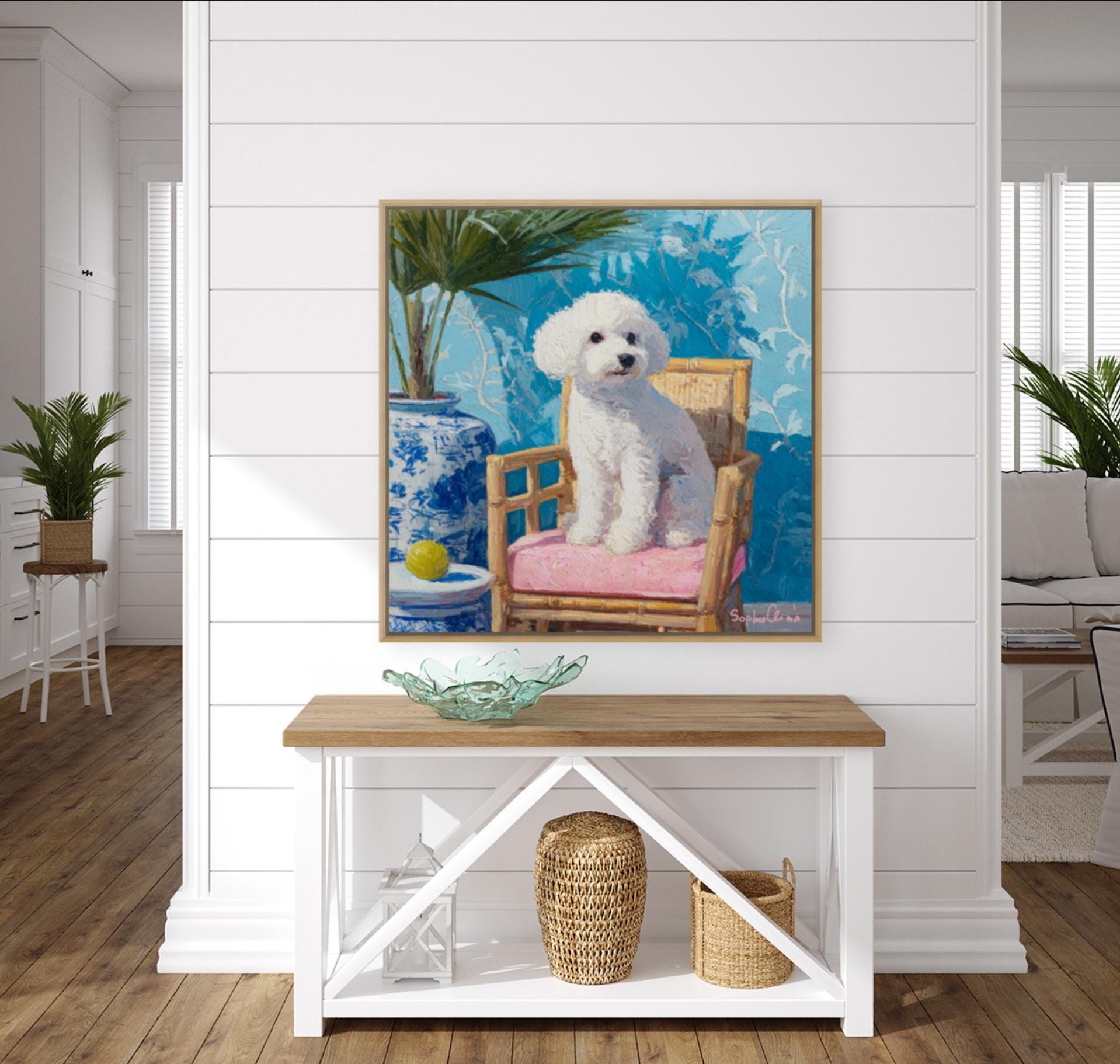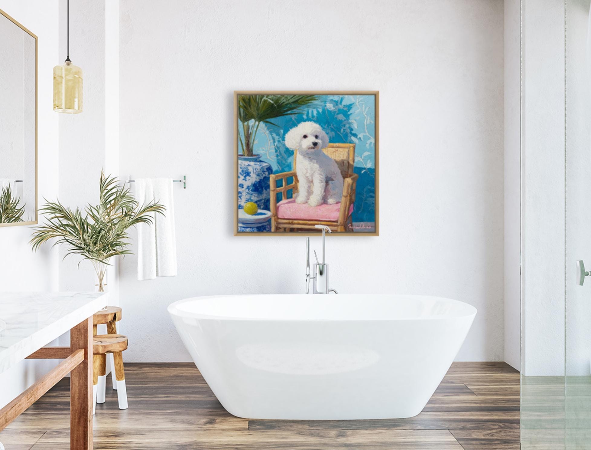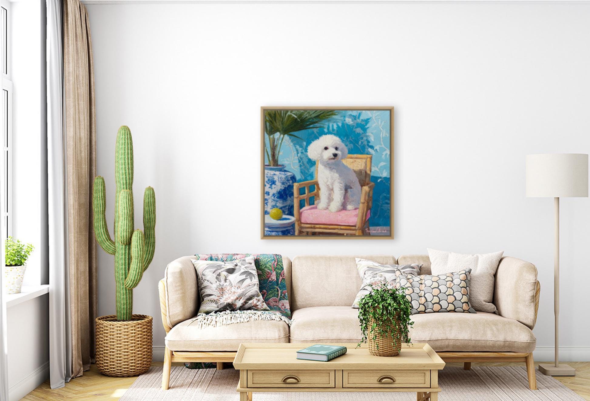 A glamorous fluffy white doggy lounges in full Palm Beach style,  This museum-quality giclée print is perfect for dog lovers with a flair for interiors.