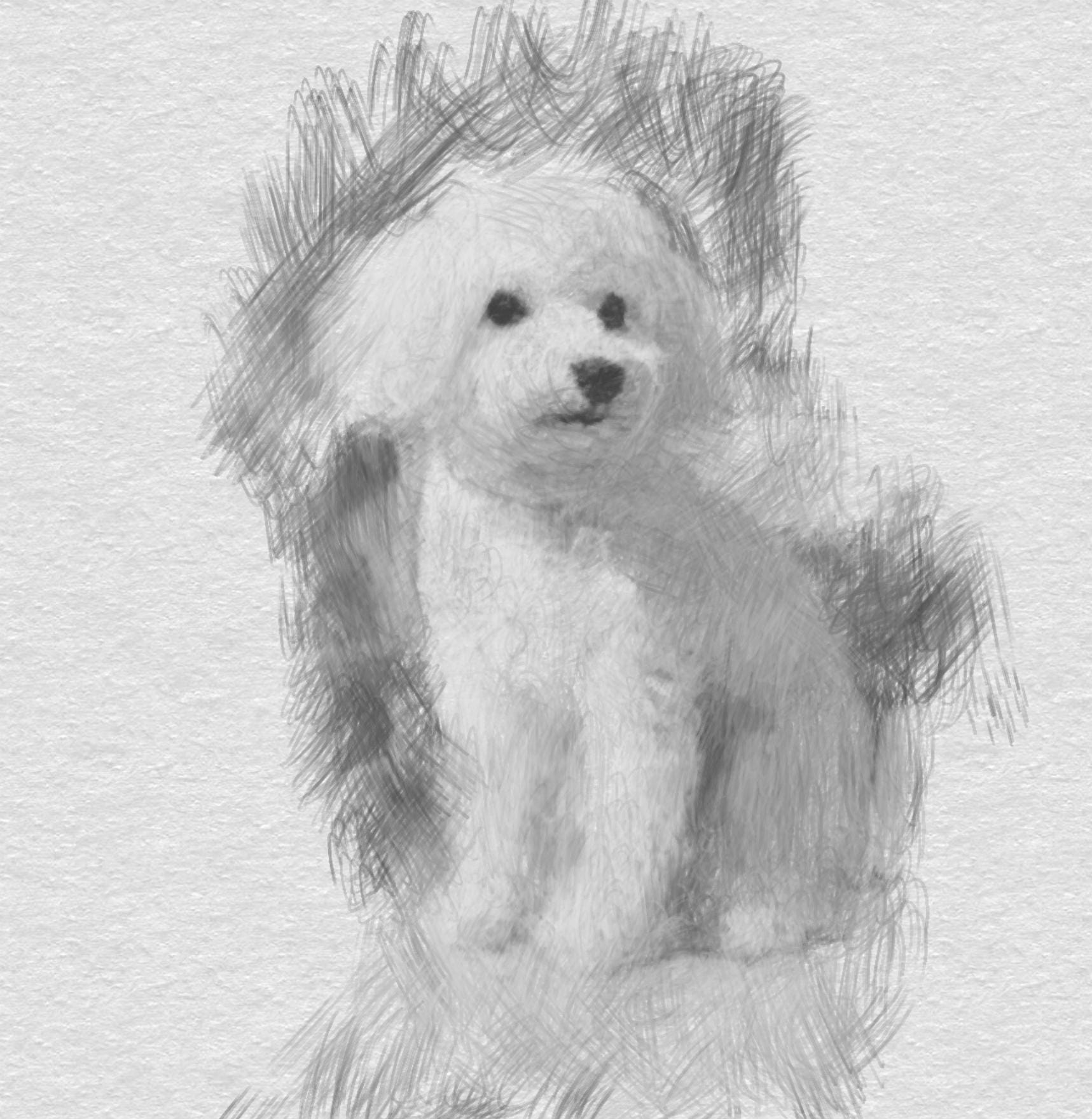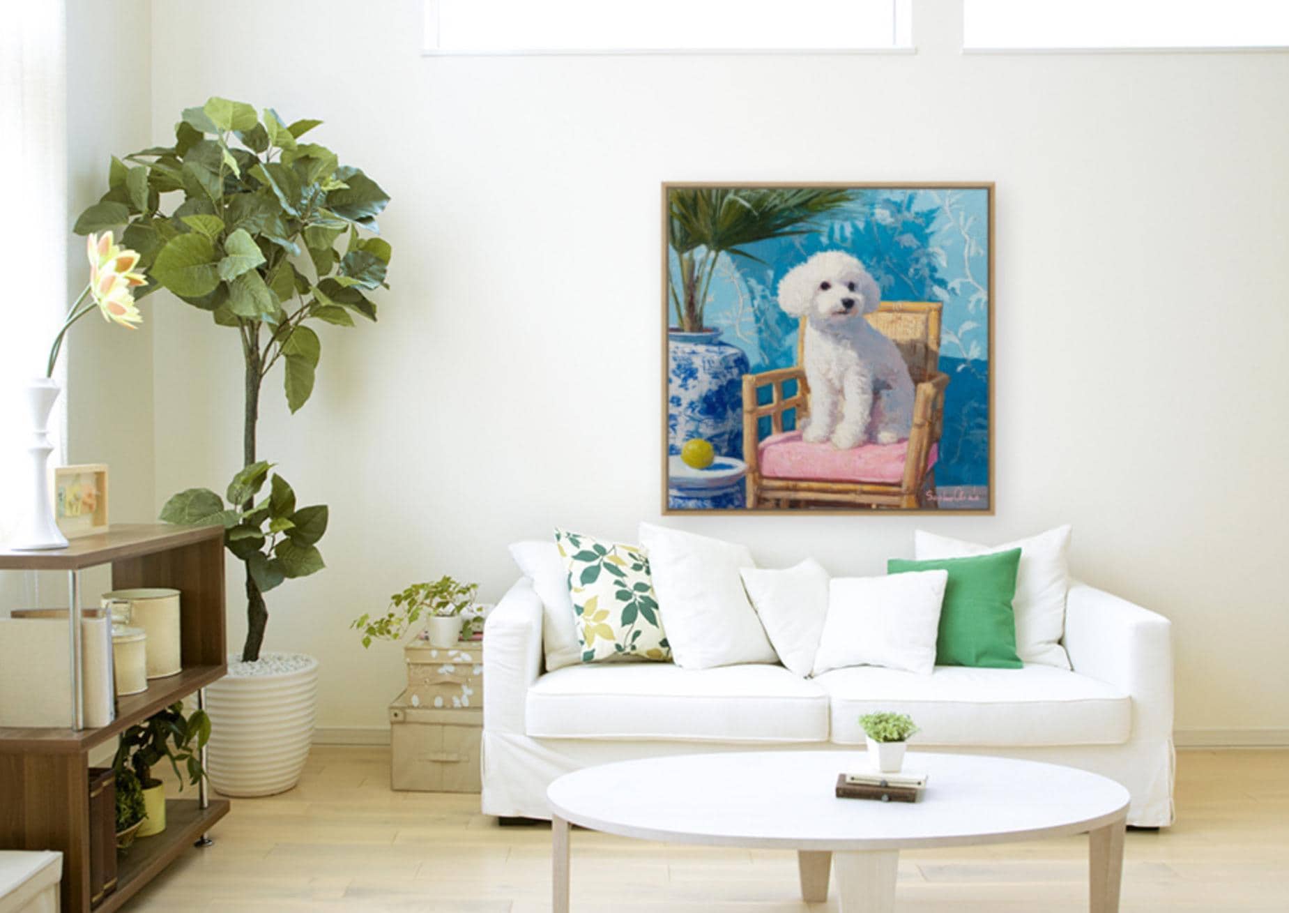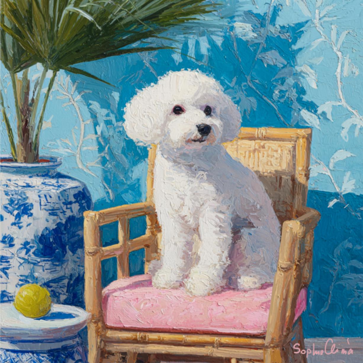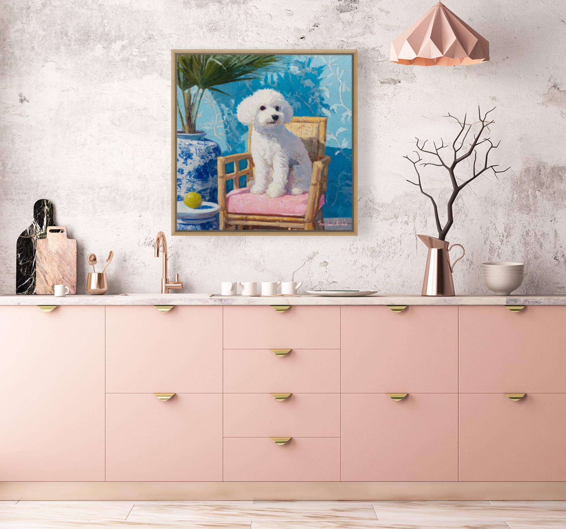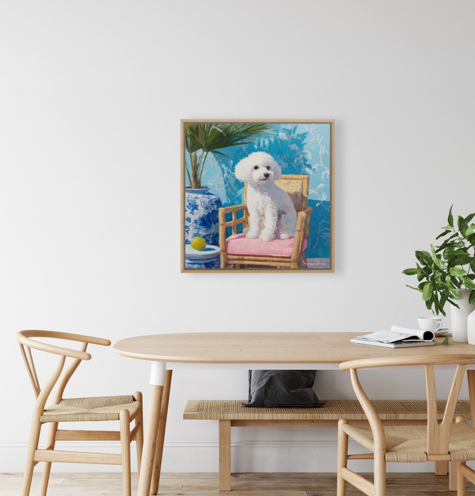 A glamorous fluffy white doggy lounges in full Palm Beach style,  This museum-quality giclée print is perfect for dog lovers with a flair for interiors.