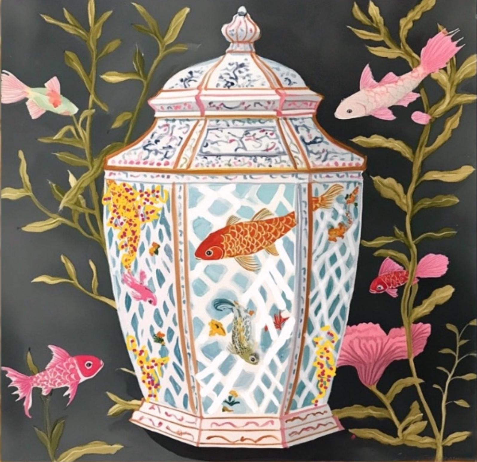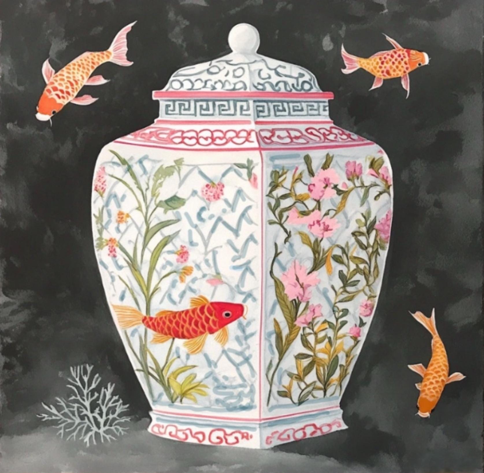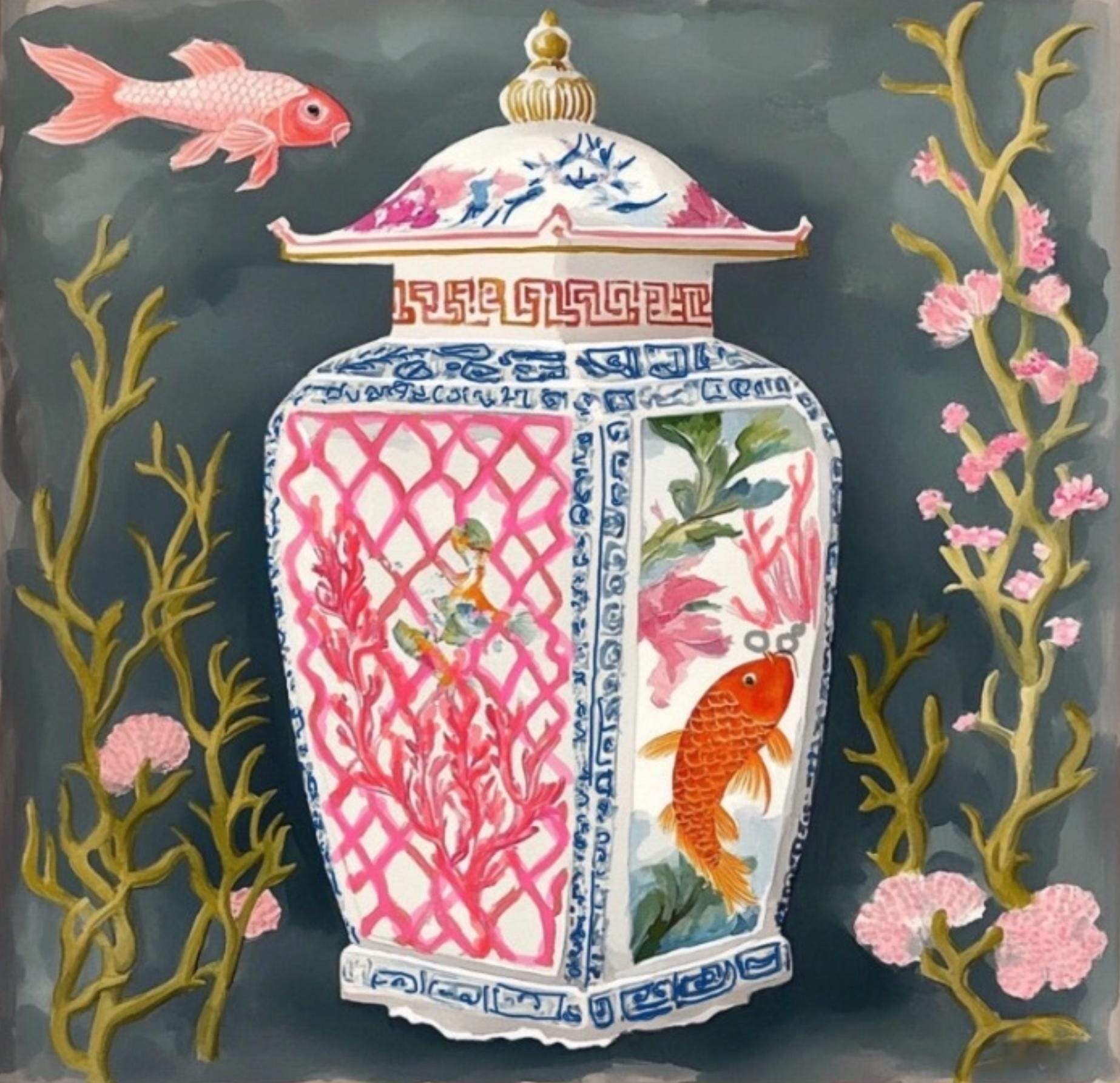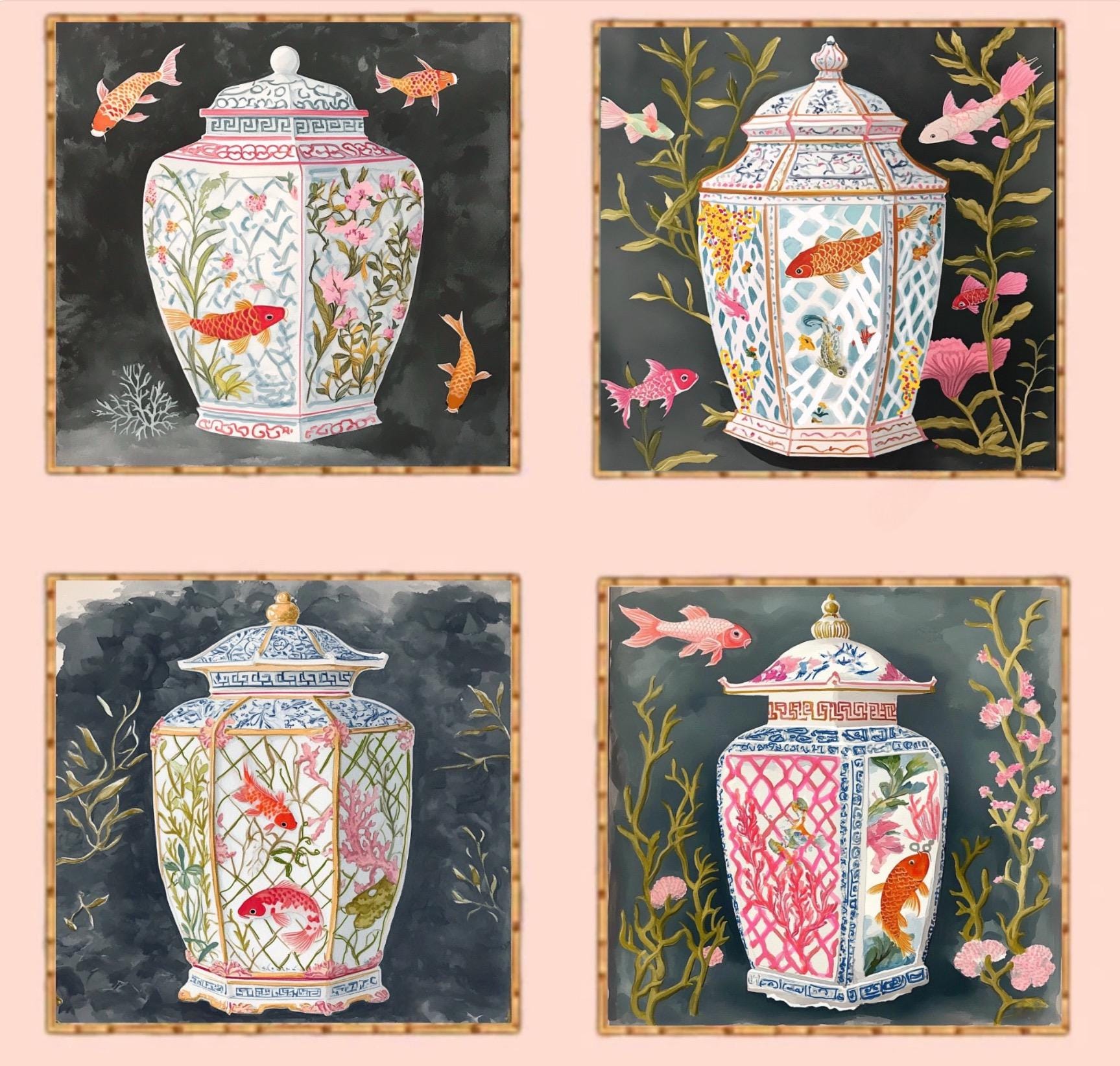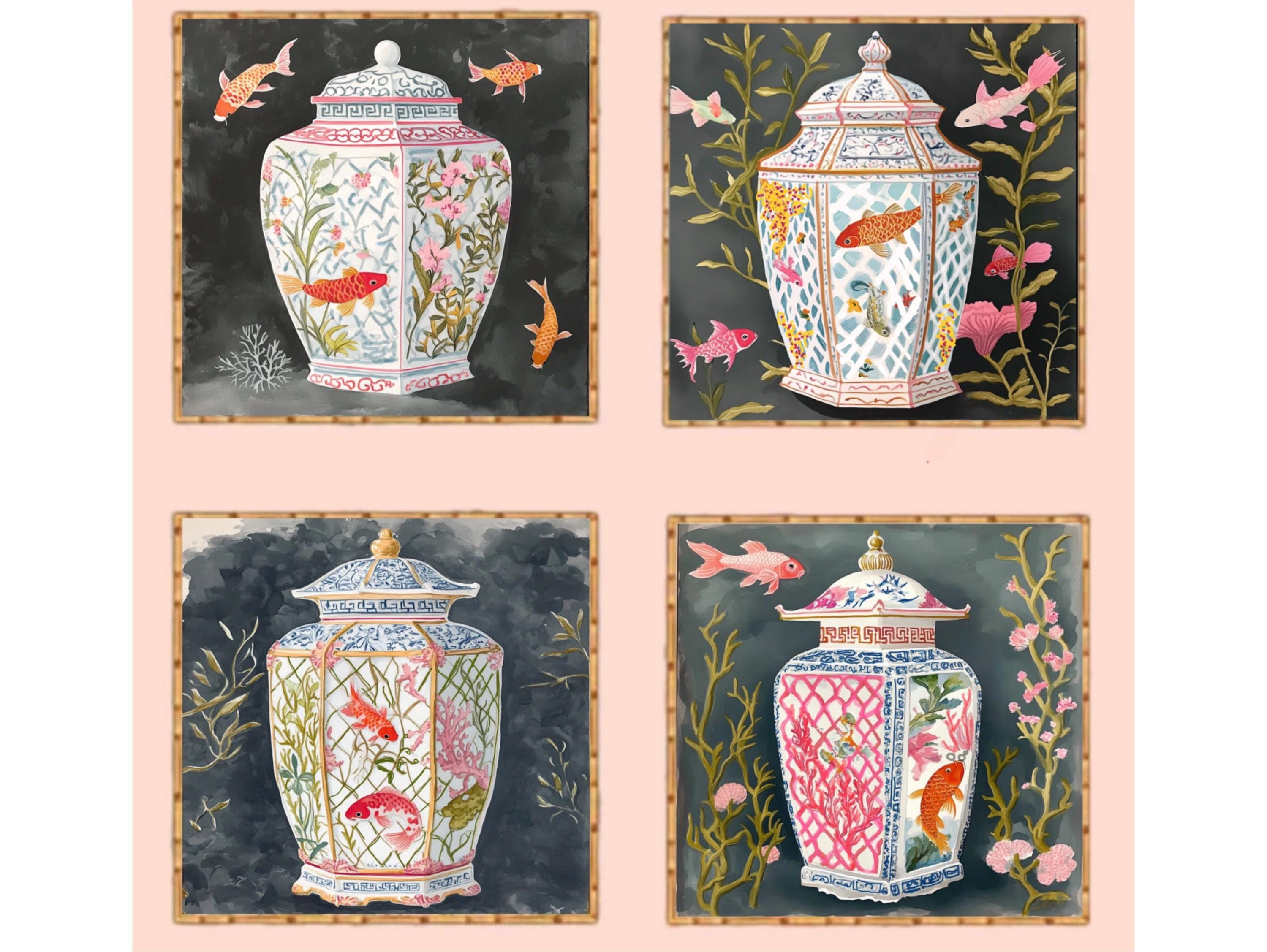 Chinoiserie Giclee Prints: Pink Vases, Coral, Koi Fish - Set of 4