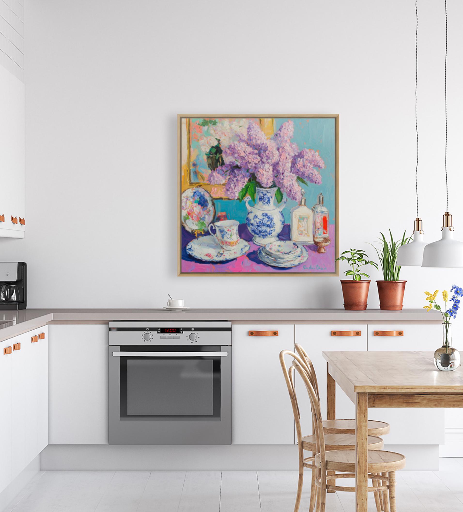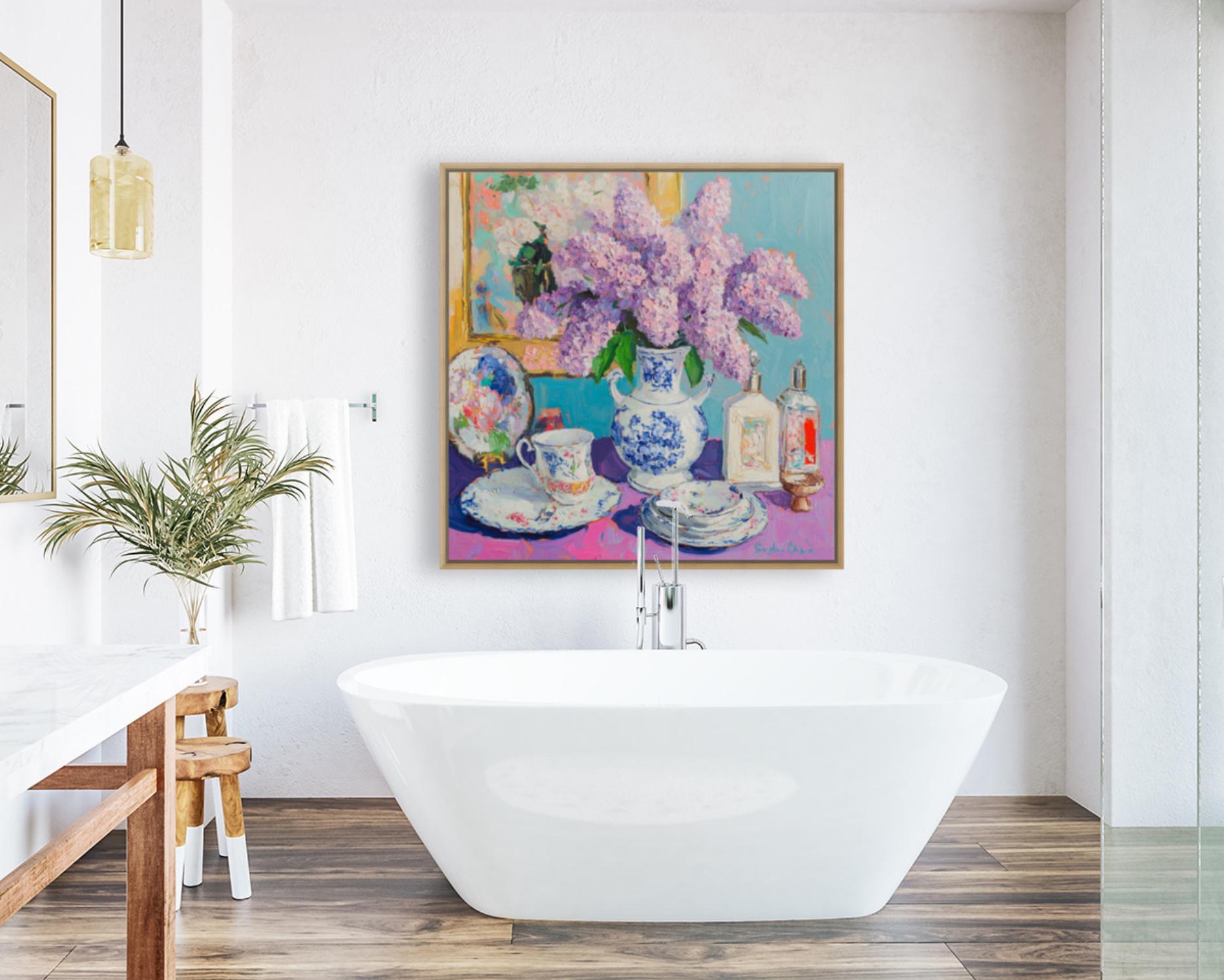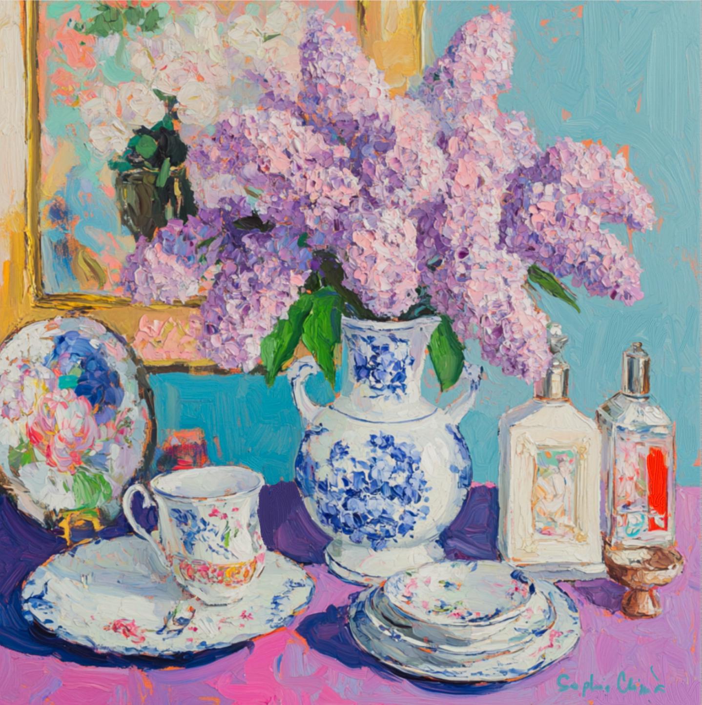 grandmillennial art, Still life with lilac in ginger jar, oil painting