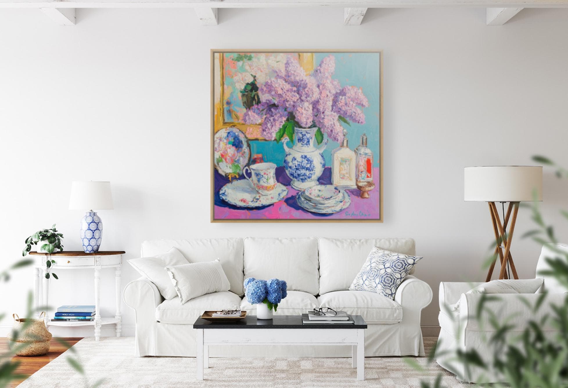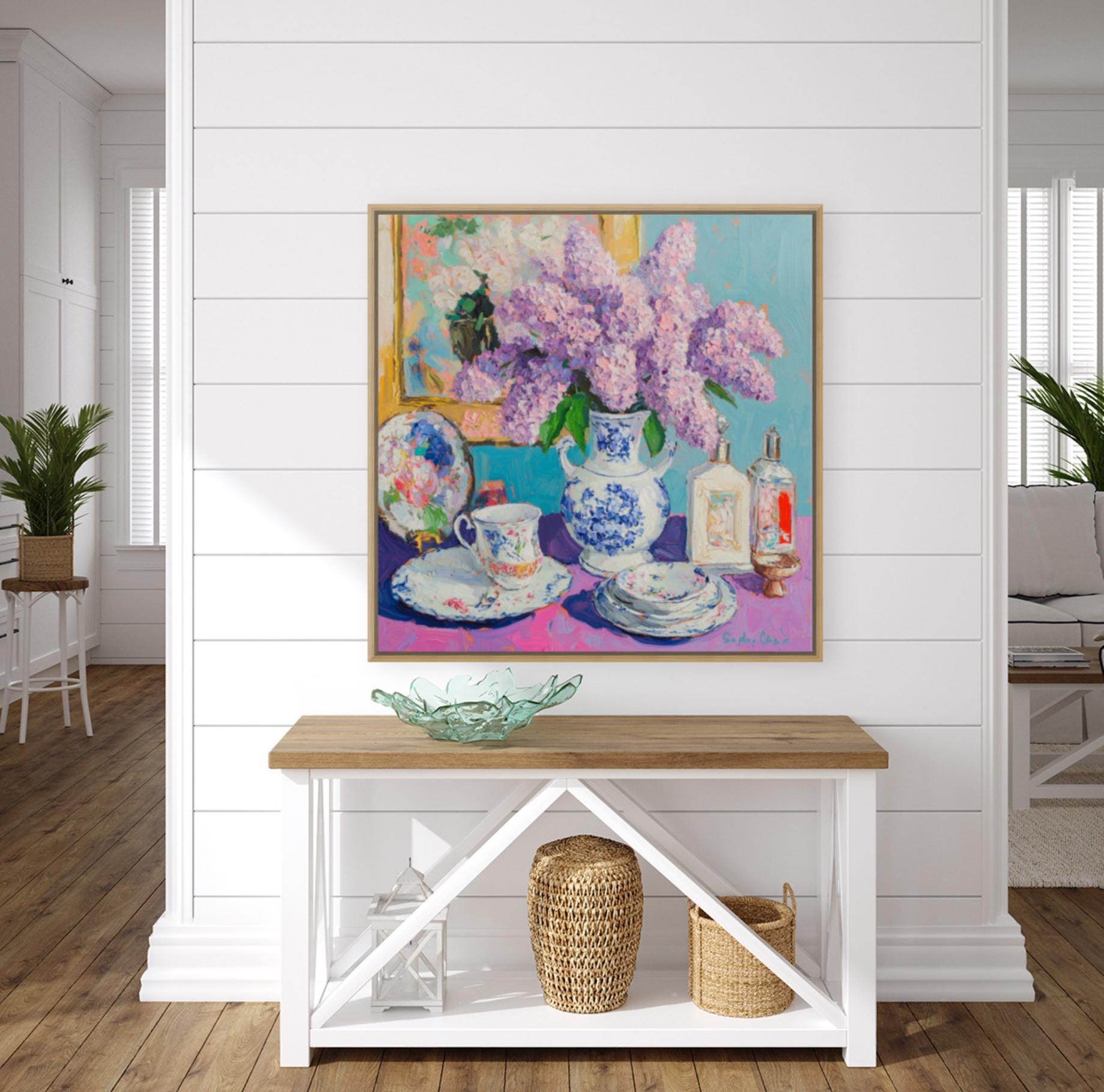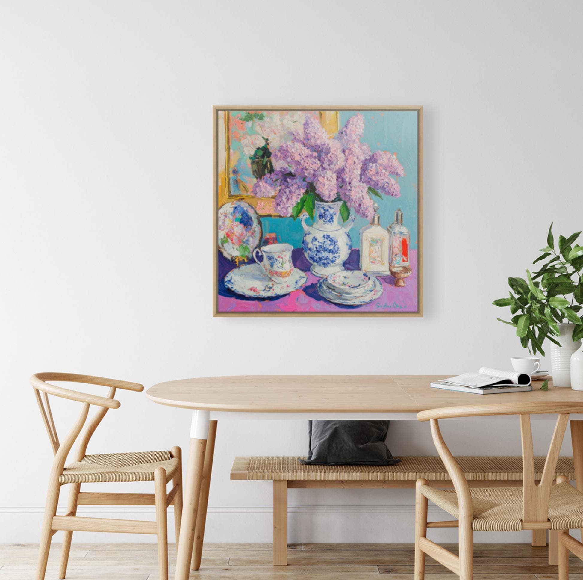 grandmillennial art, Still life with lilac in ginger jar, oil painting