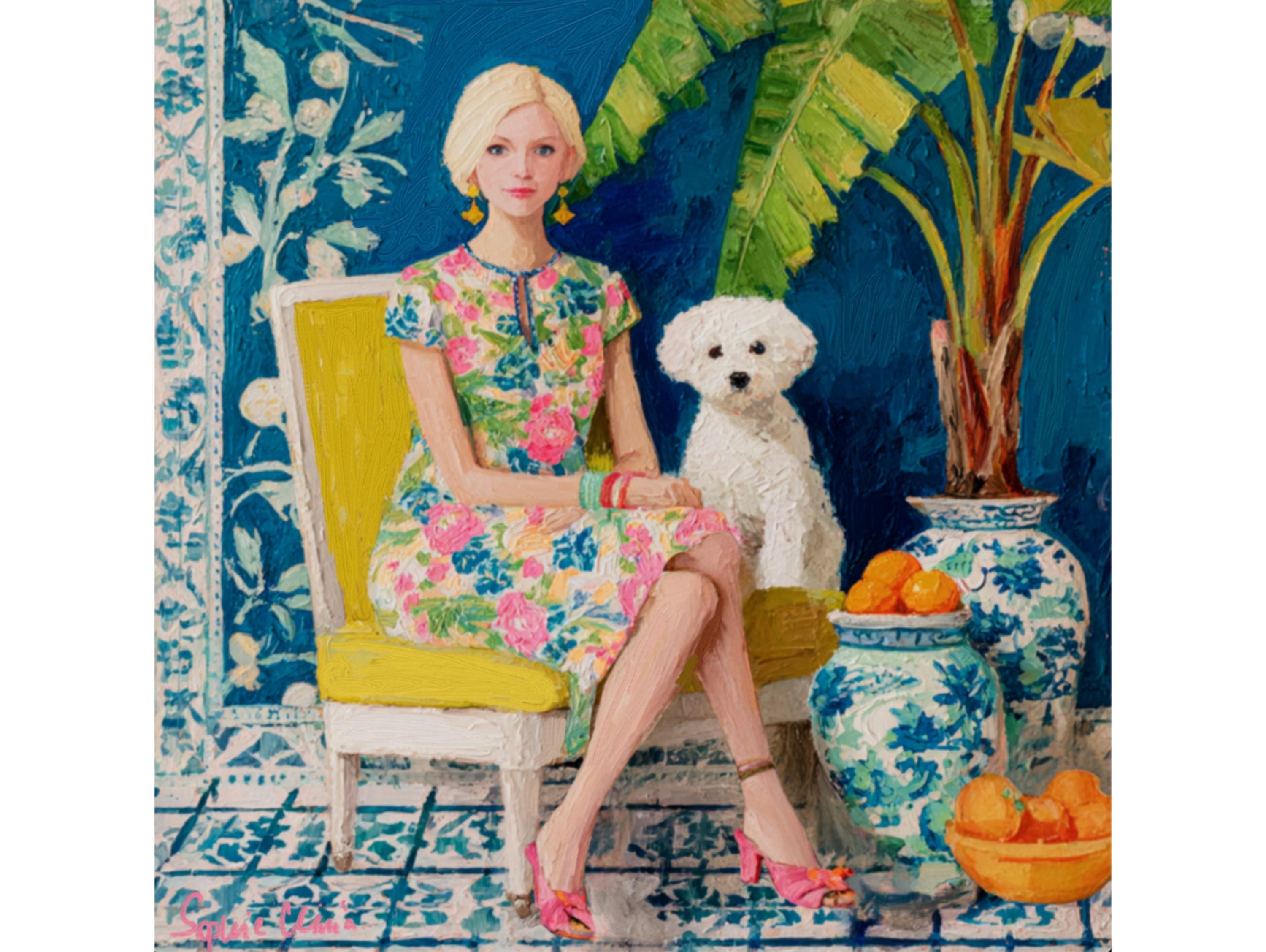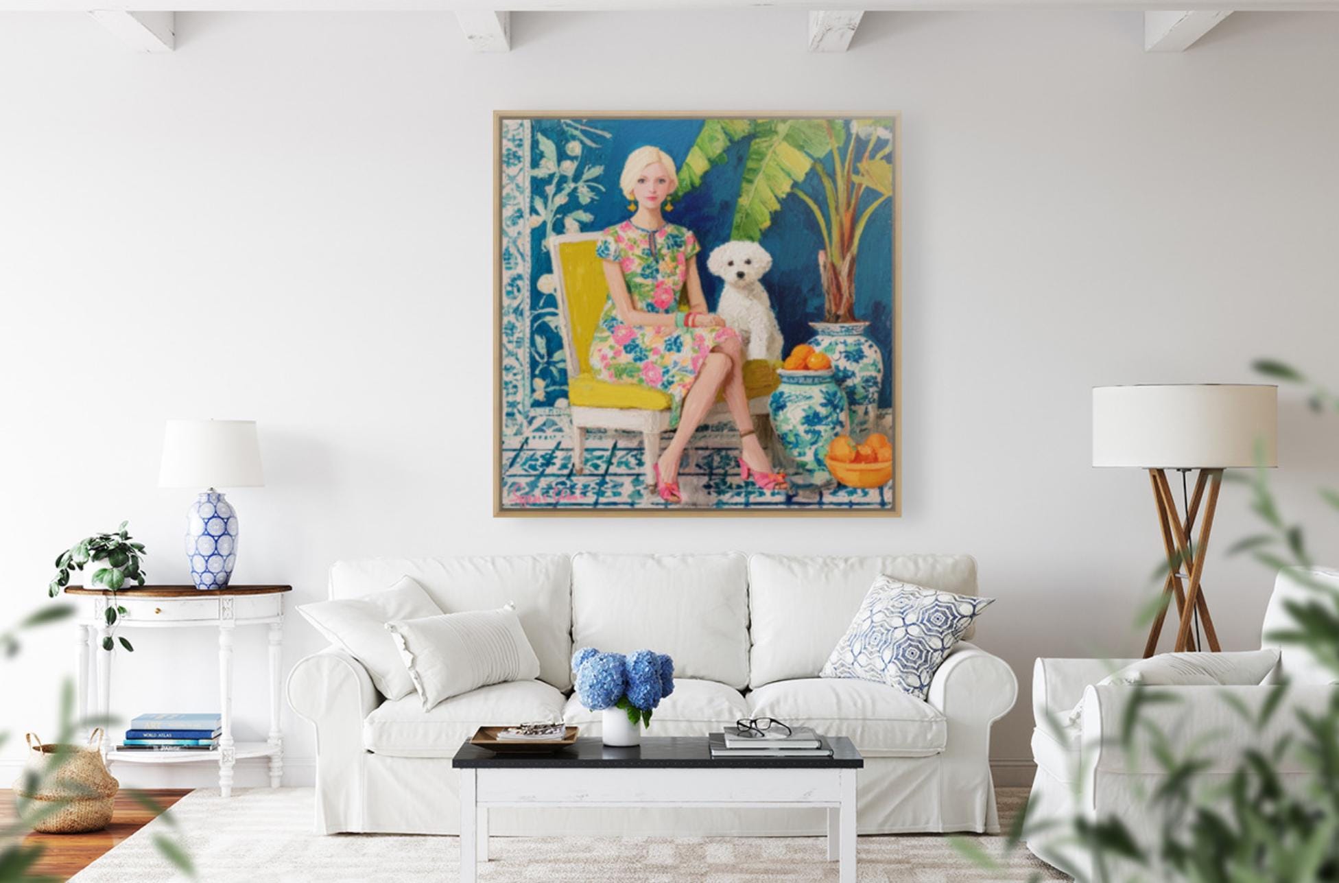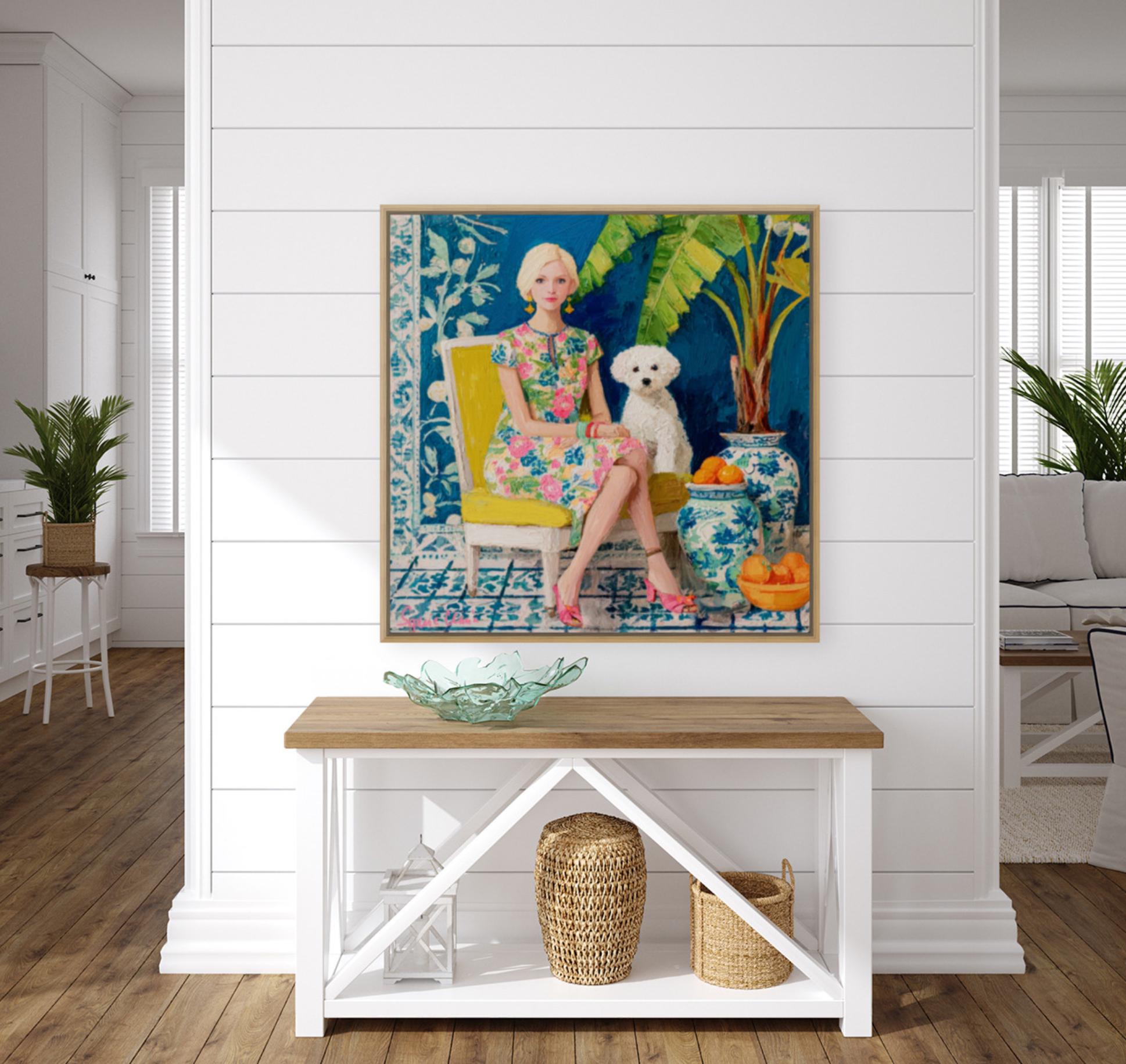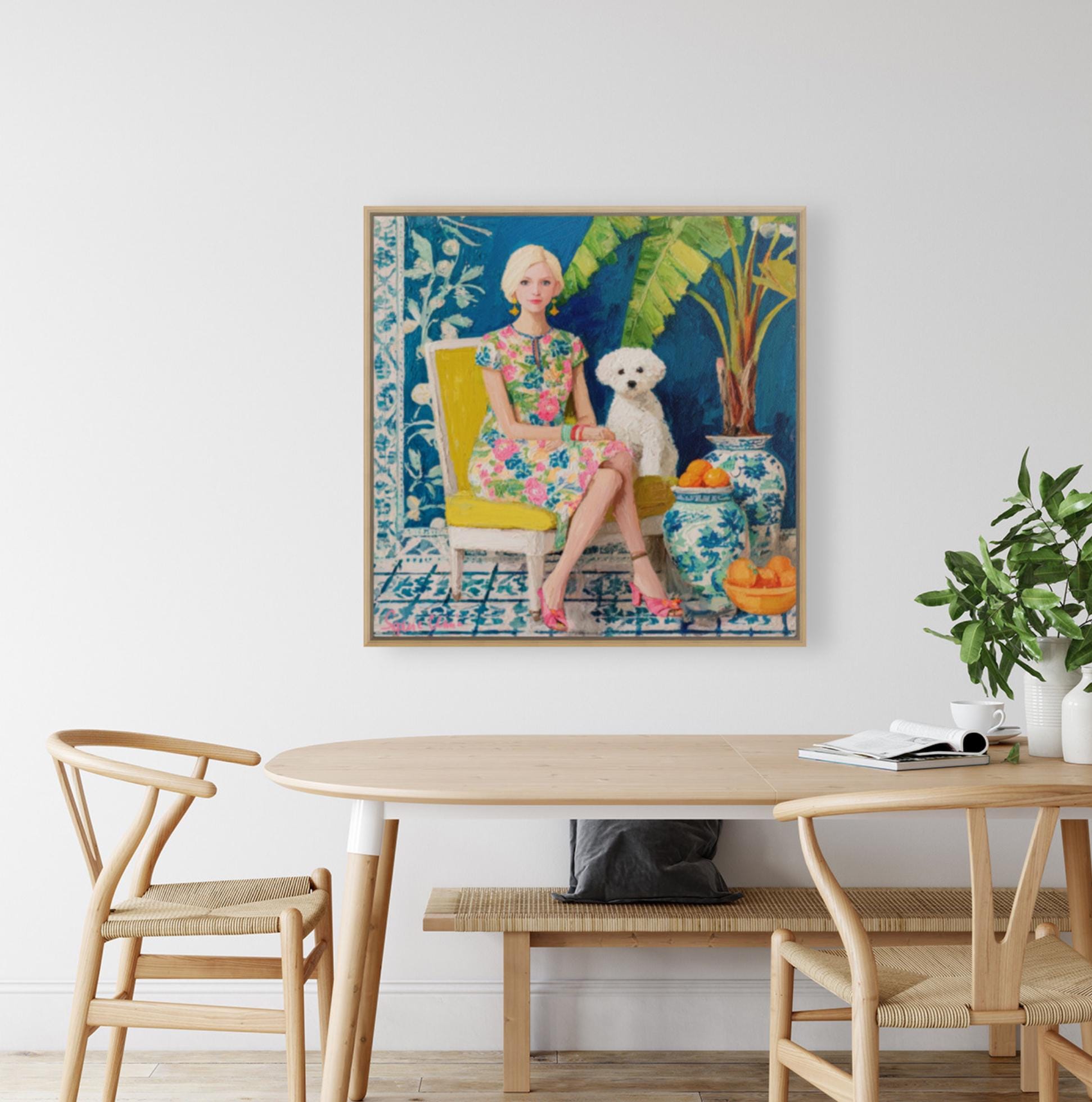 Whimsical Grandmillennial Fine Art: Girl with Bichon Frise - Preppy Southern Coastal Painting
