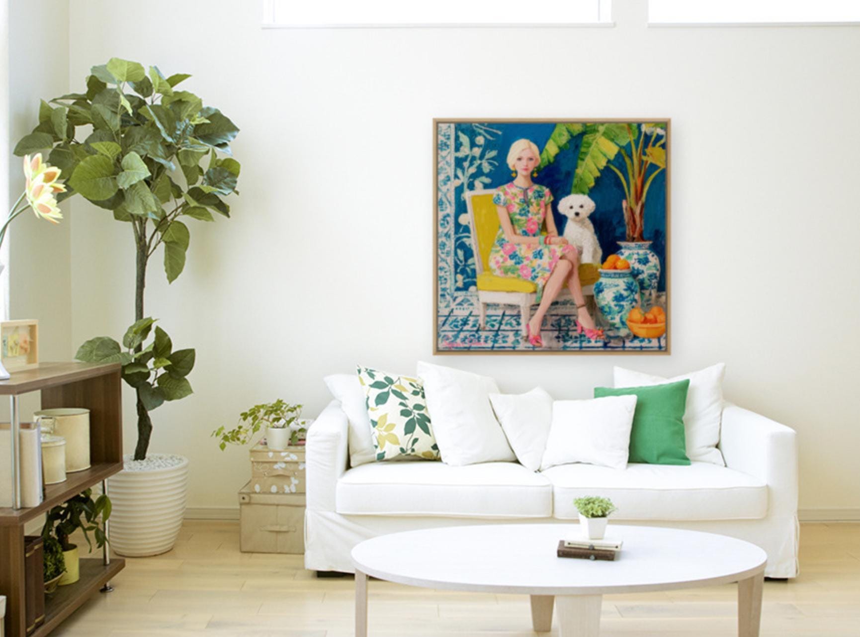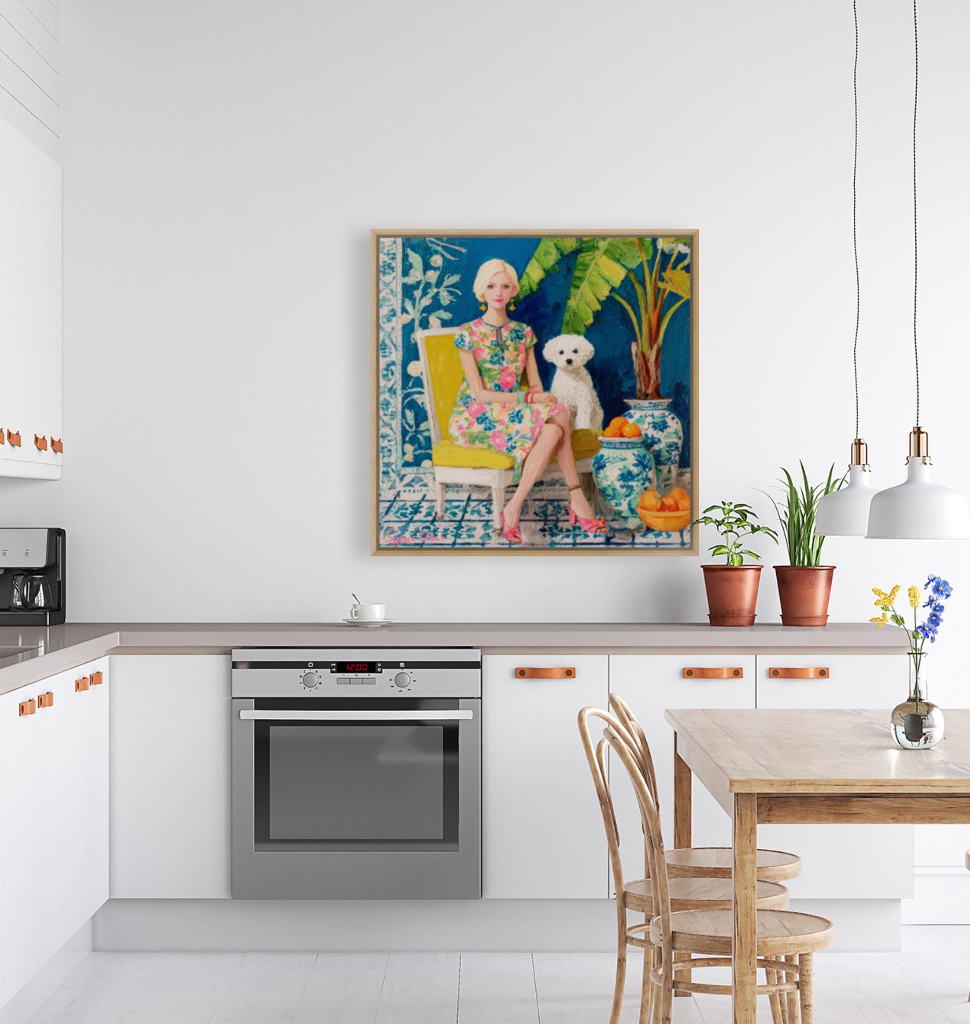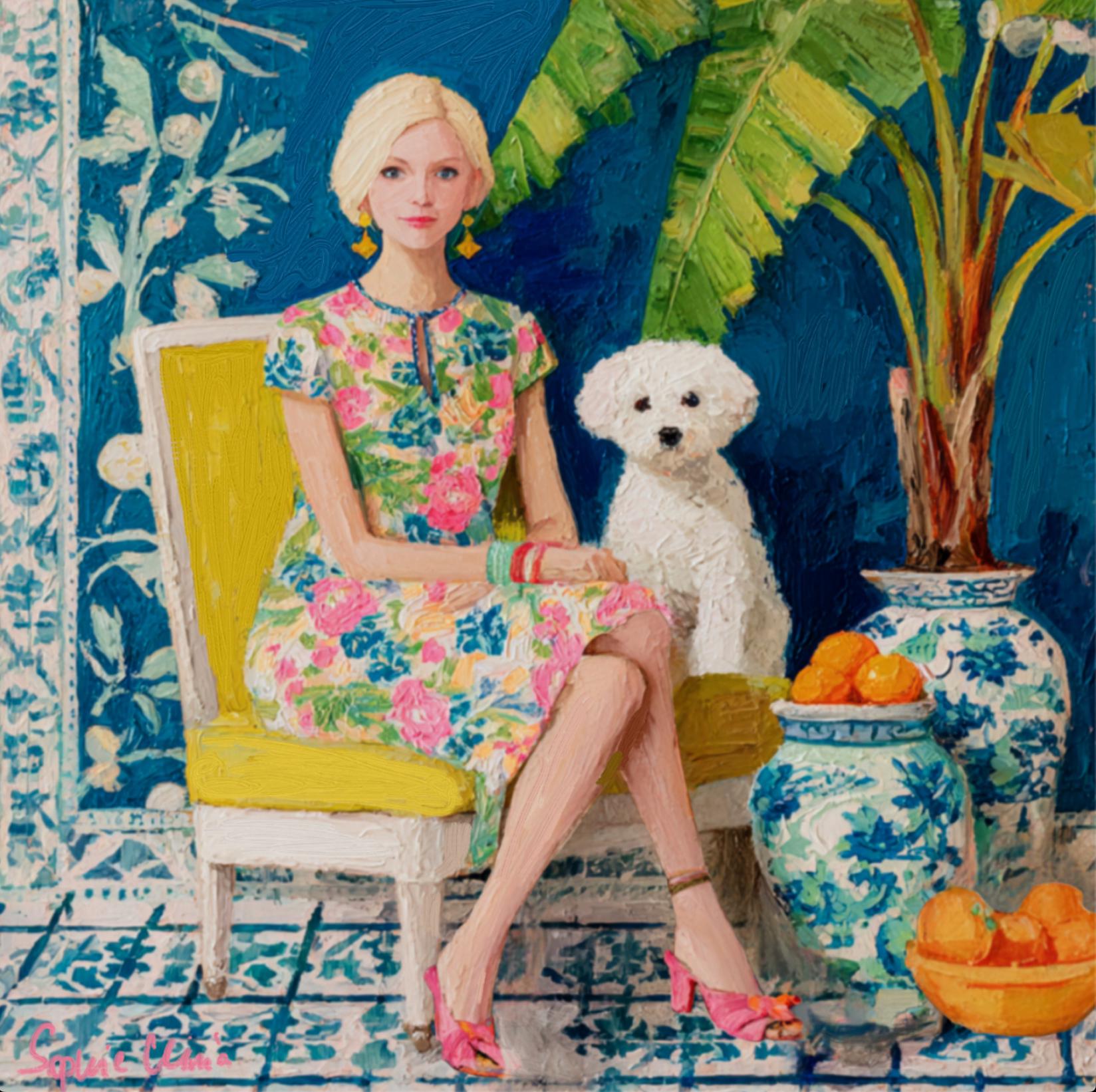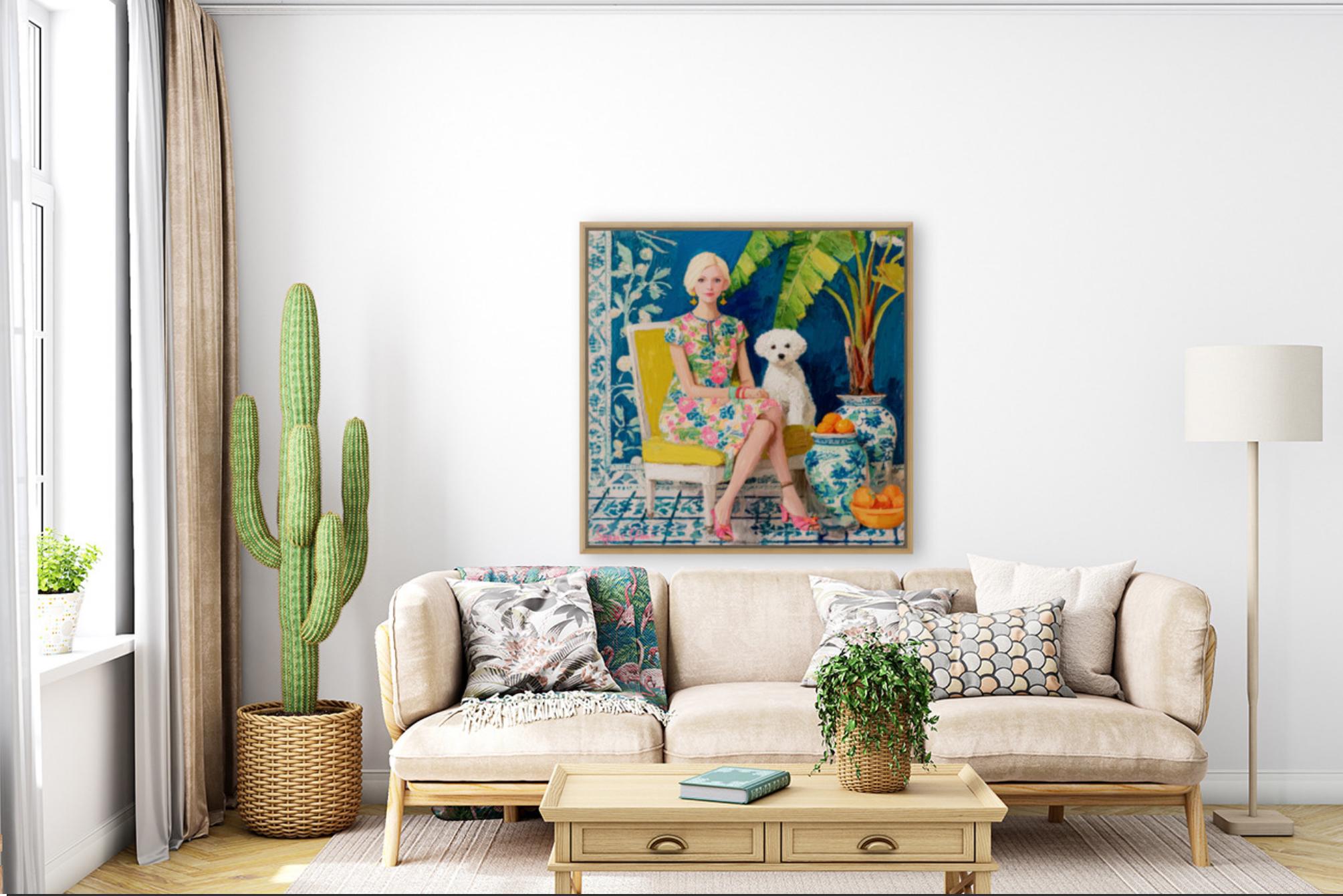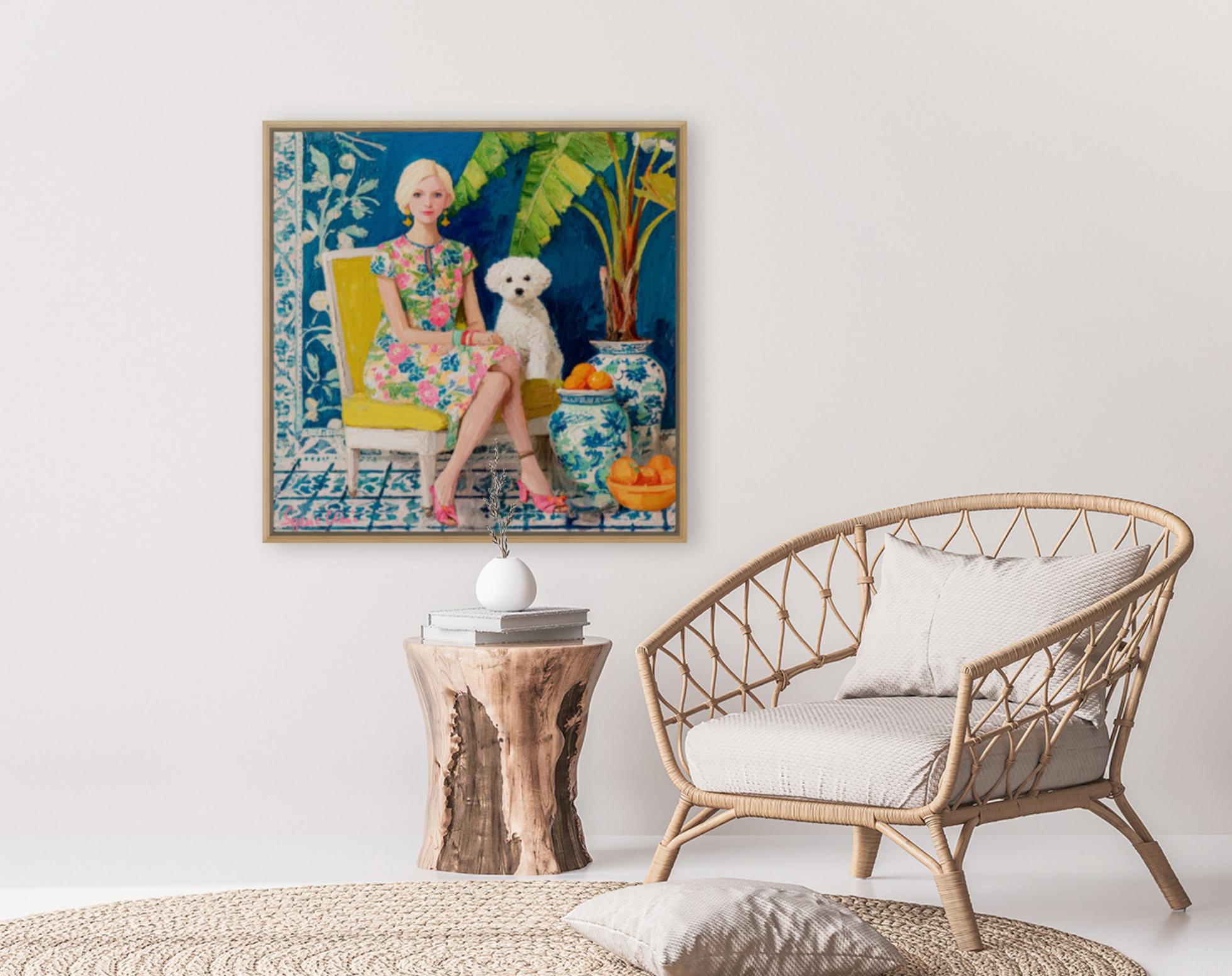 Whimsical Grandmillennial Fine Art: Girl with Bichon Frise - Preppy Southern Coastal Painting