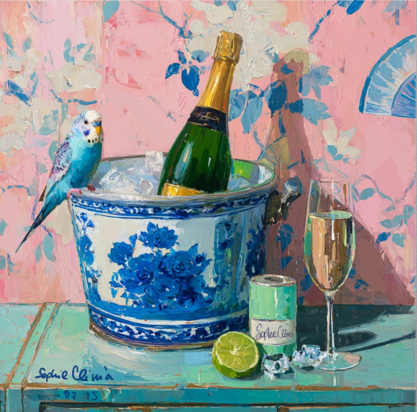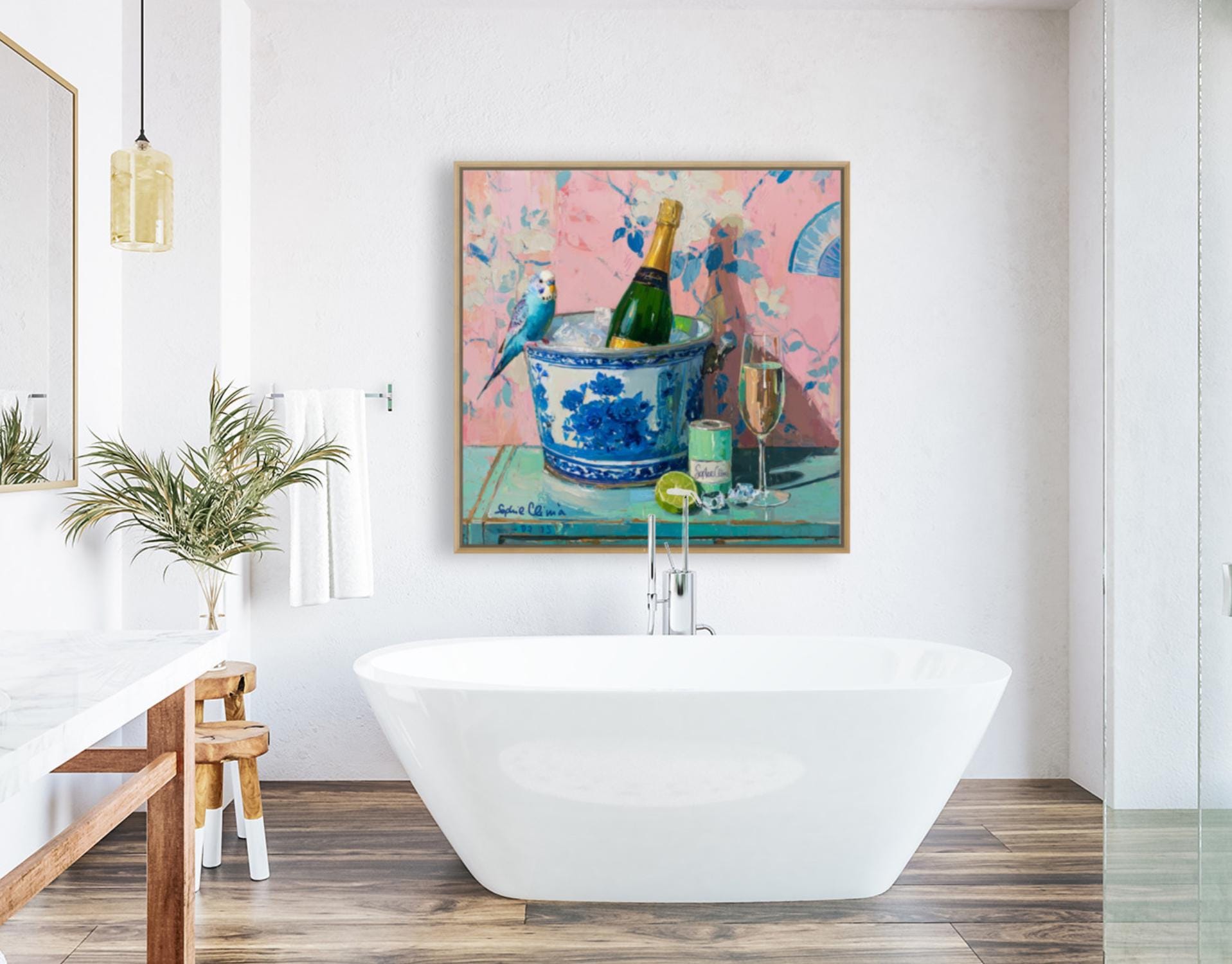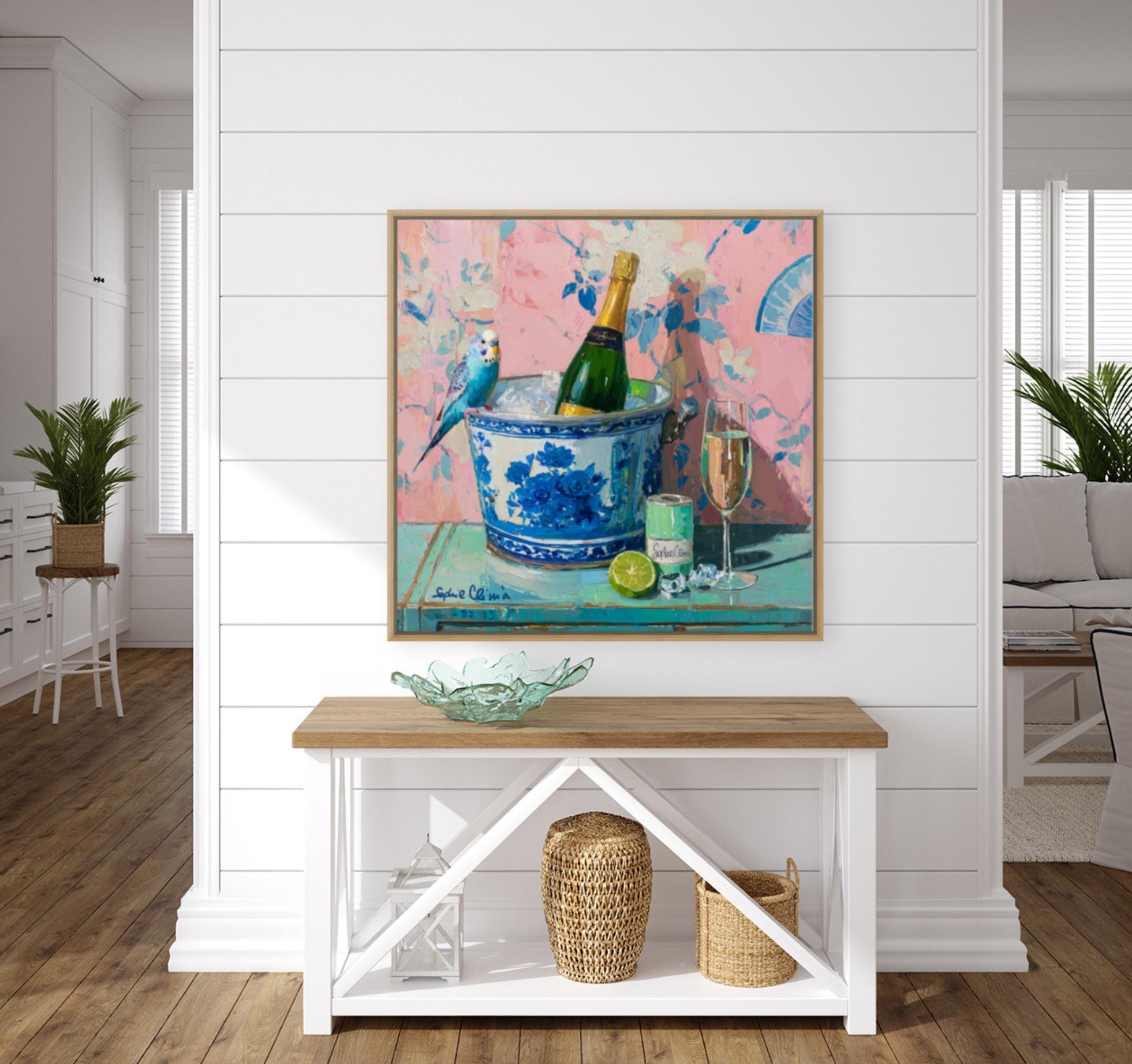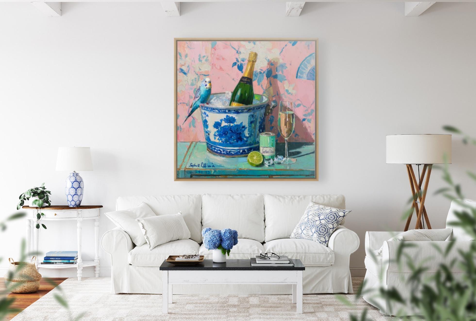 Pop the bubbly and meet your new party guest! This charming giclée art print captures everything we love about Grandmillennial style—whimsy, elegance, and a dash of cheek. Featuring a blue budgie perched on a chinoiserie ice bucket chilling champagne, this vibrant artwork blends Palm Beach glamour with playful sophistication.