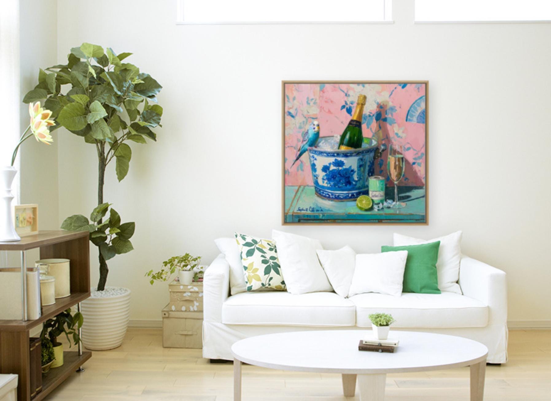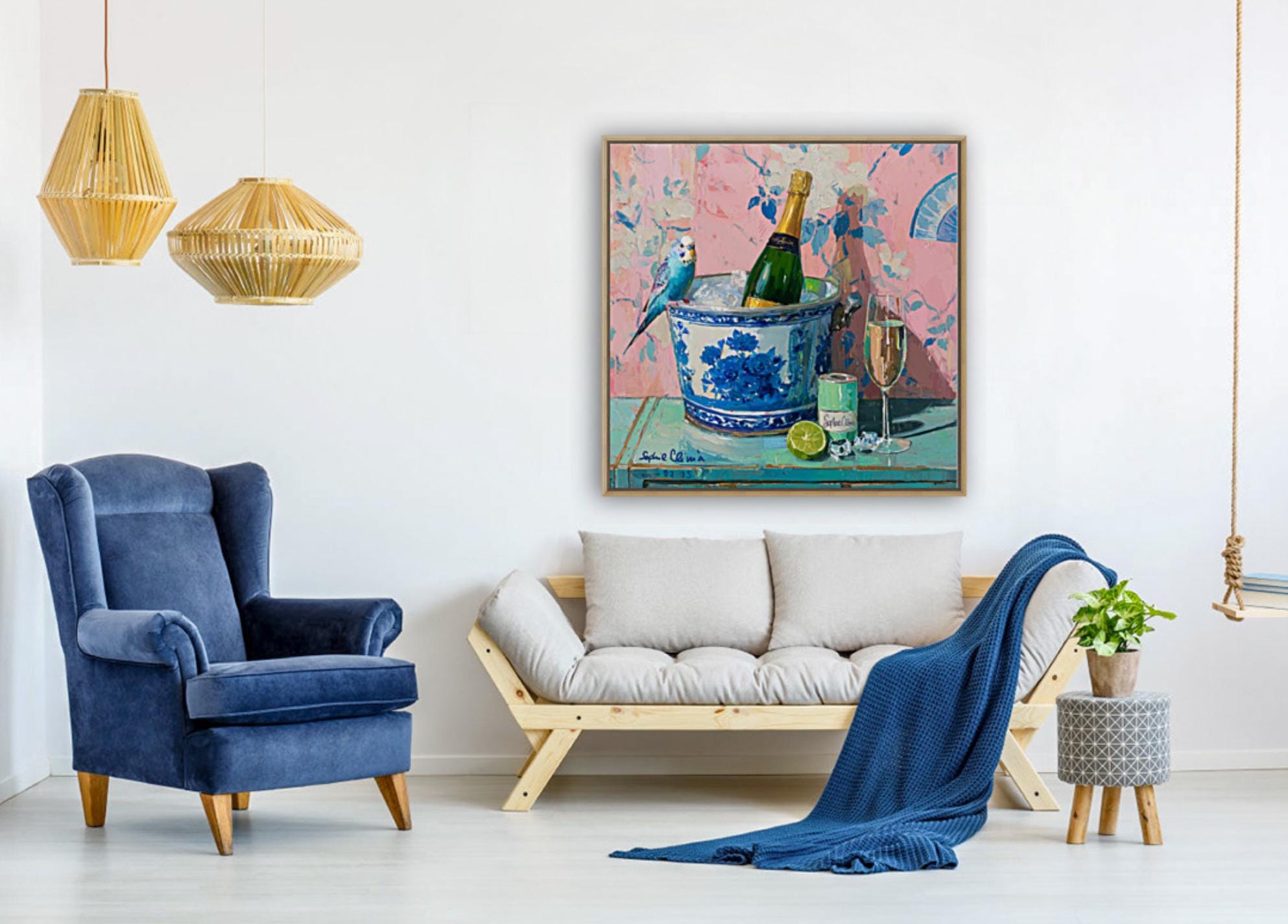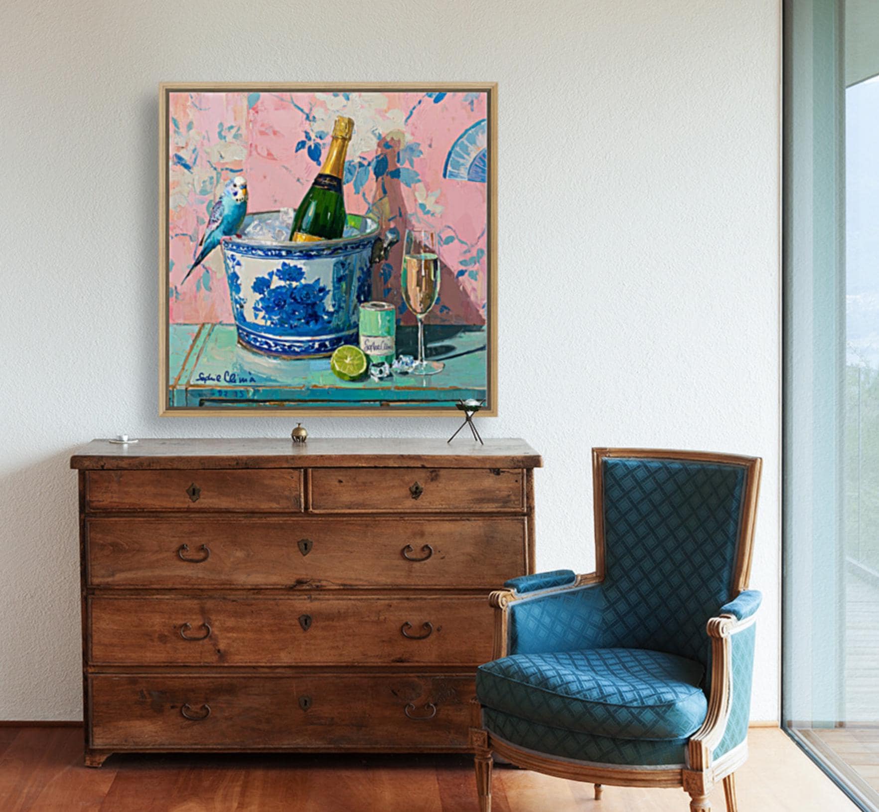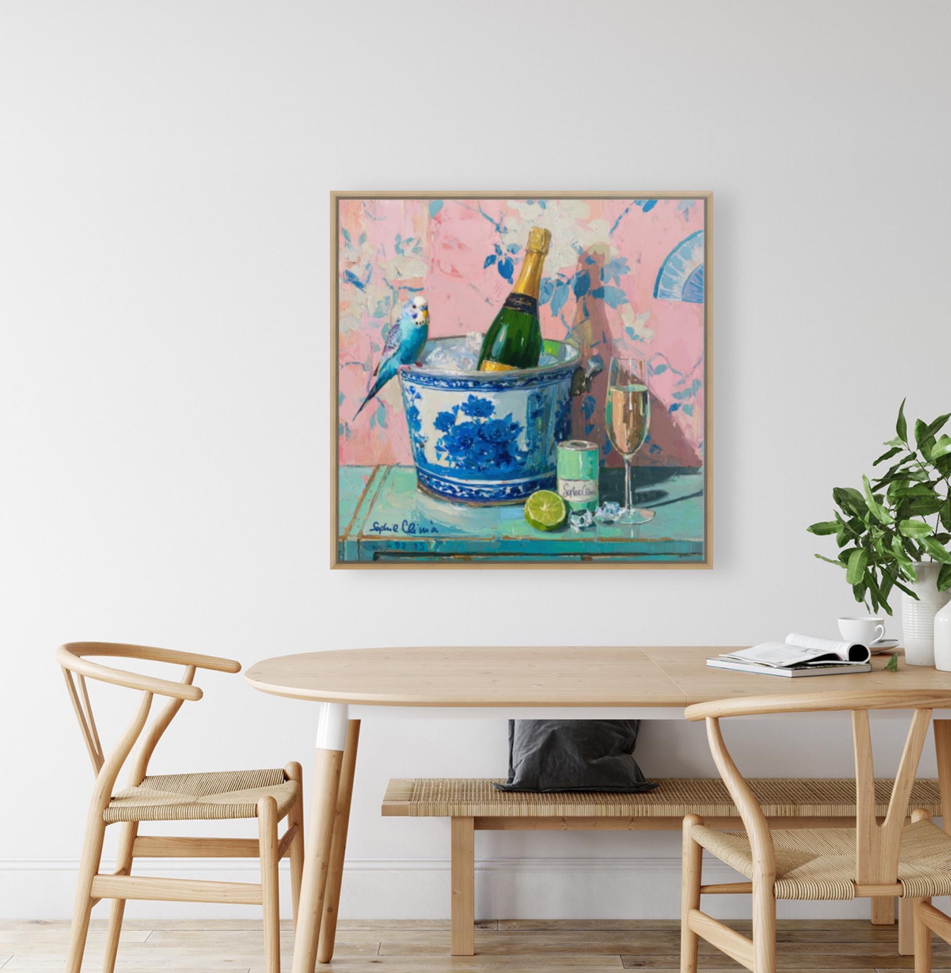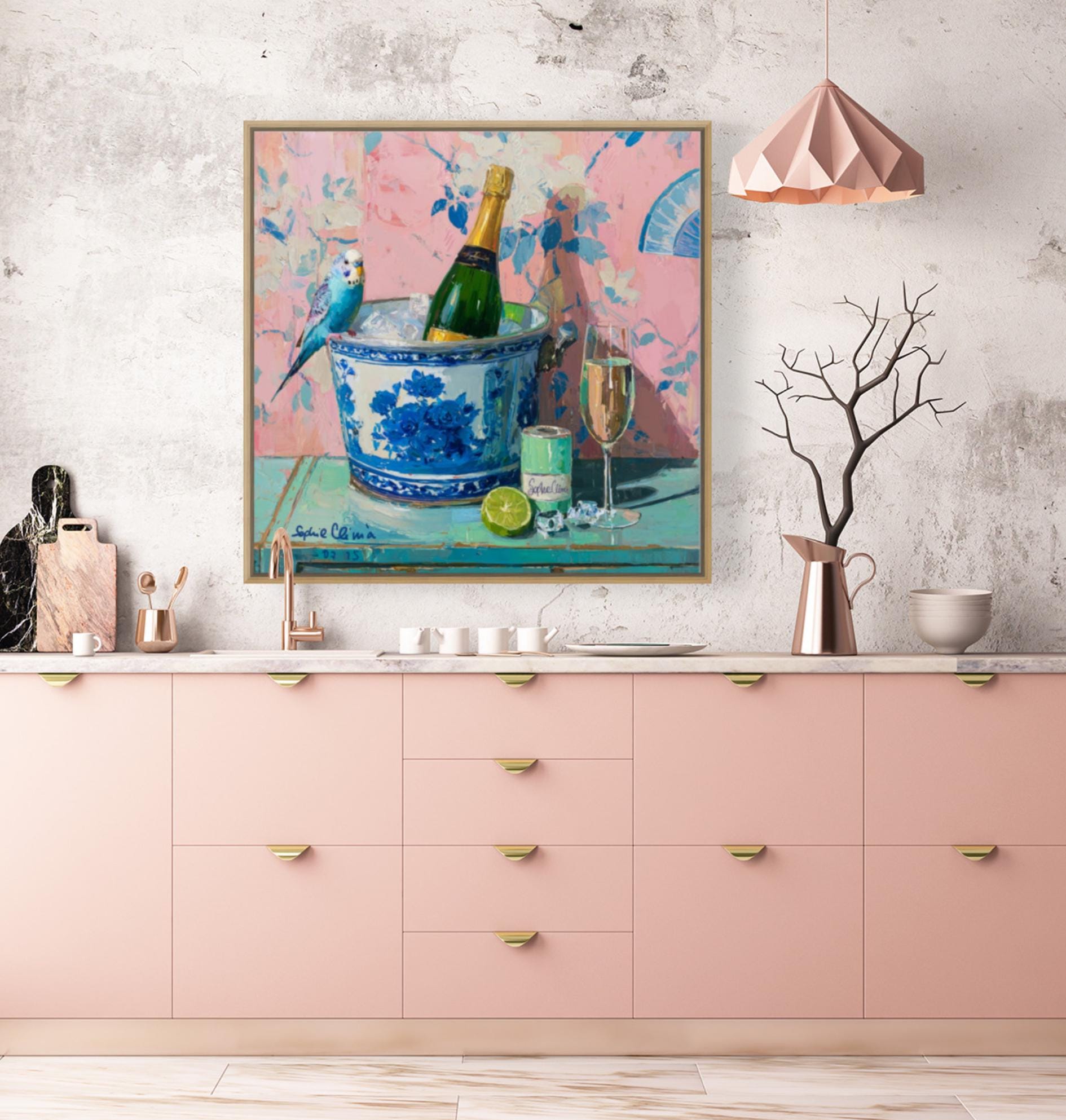 Pop the bubbly and meet your new party guest! This charming giclée art print captures everything we love about Grandmillennial style—whimsy, elegance, and a dash of cheek. Featuring a blue budgie perched on a chinoiserie ice bucket chilling champagne, this vibrant artwork blends Palm Beach glamour with playful sophistication.