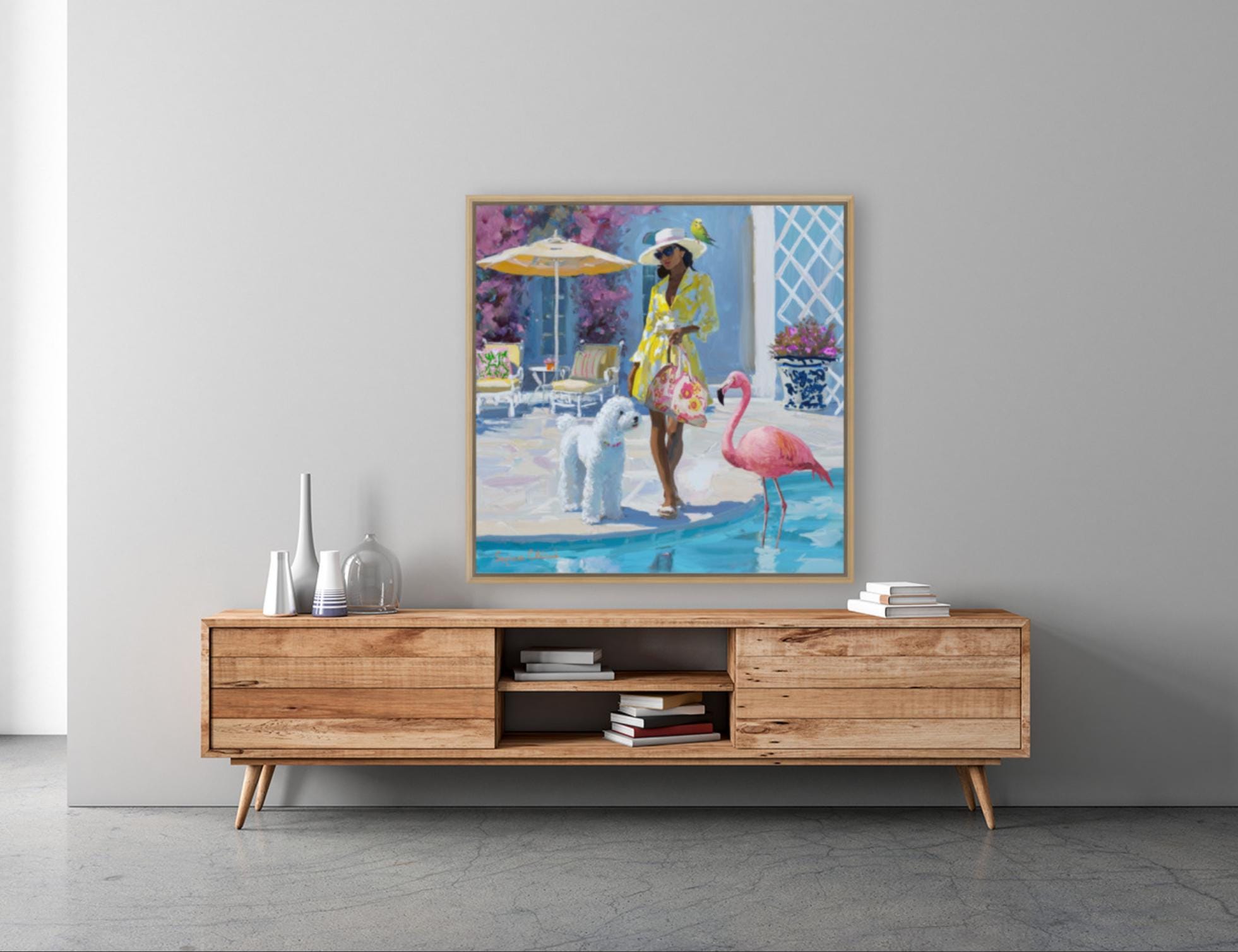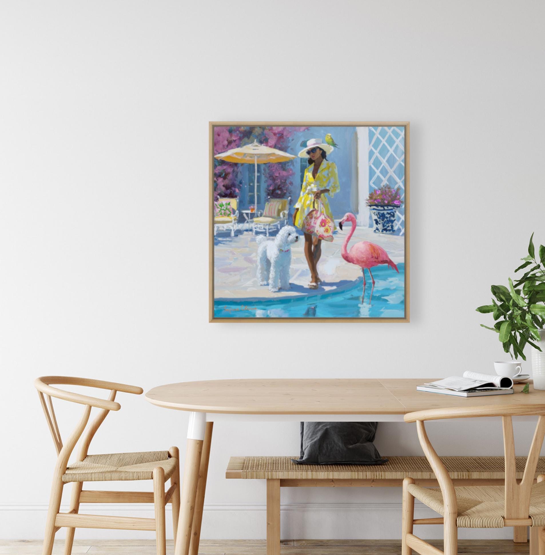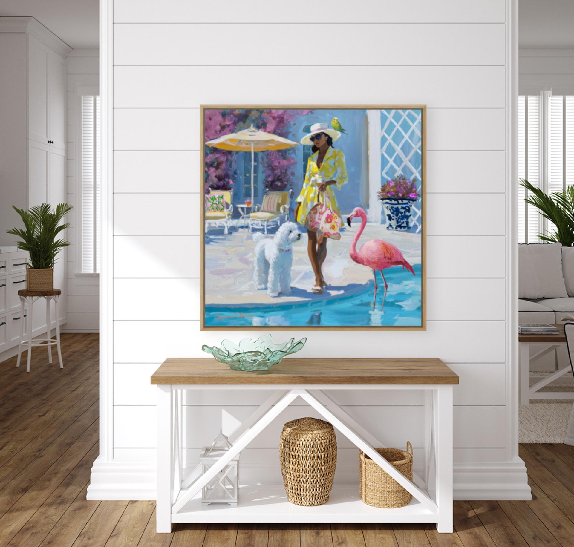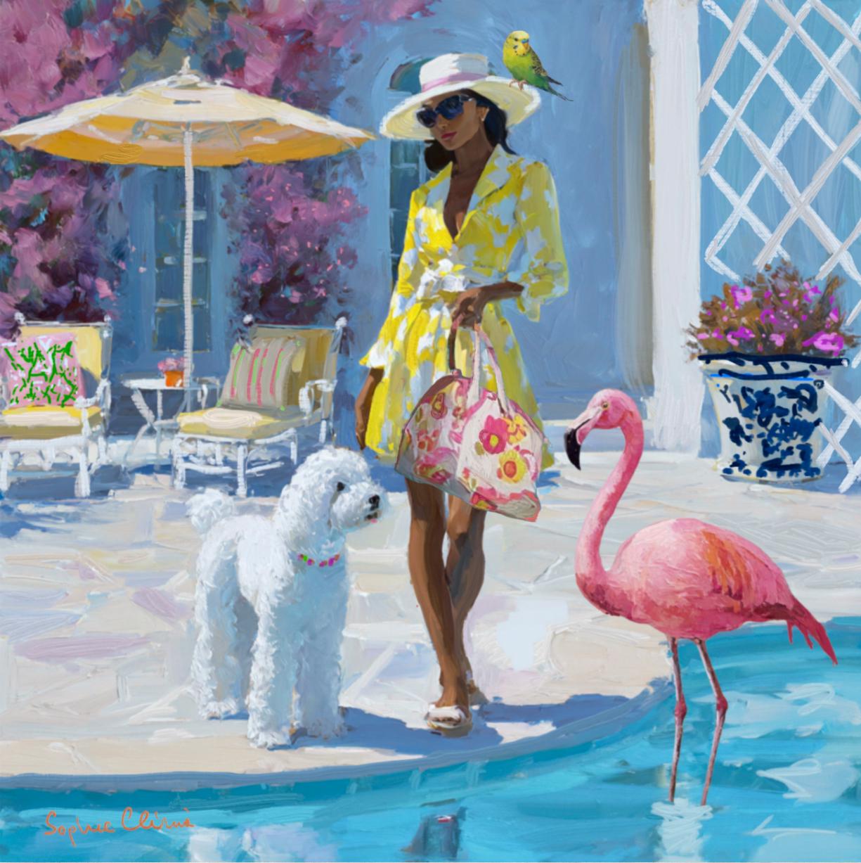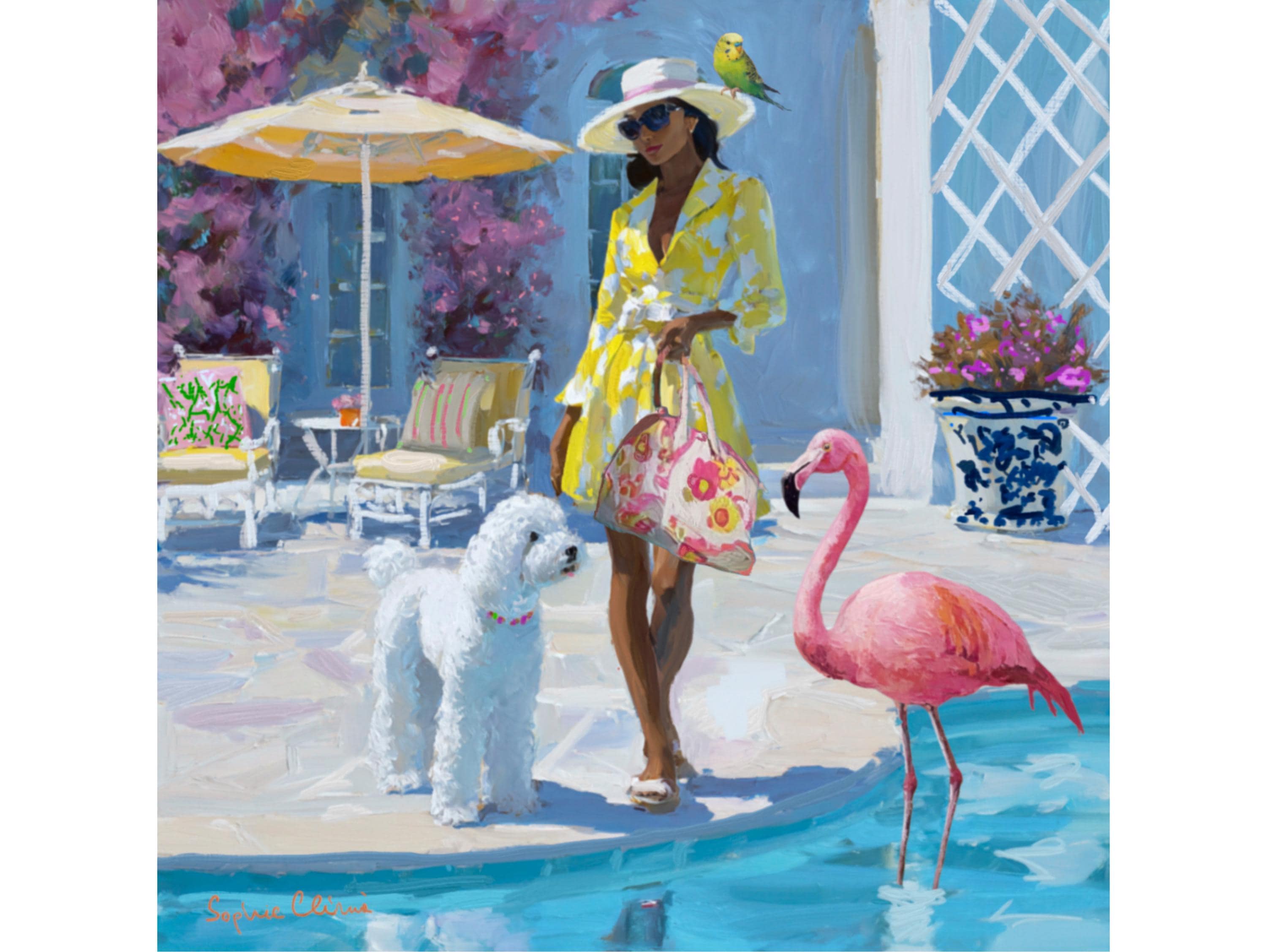 Whimsy meets glam in this vibrant Palm Beach daydream. A stylish girl in a lemon-yellow dress shares a poolside moment with her  bichon, a curious flamingo, and a sun-loving budgie. From the chinoiserie planter to the pink peony bag, every detail sparkles with Southern charm and Grandmillennial flair.