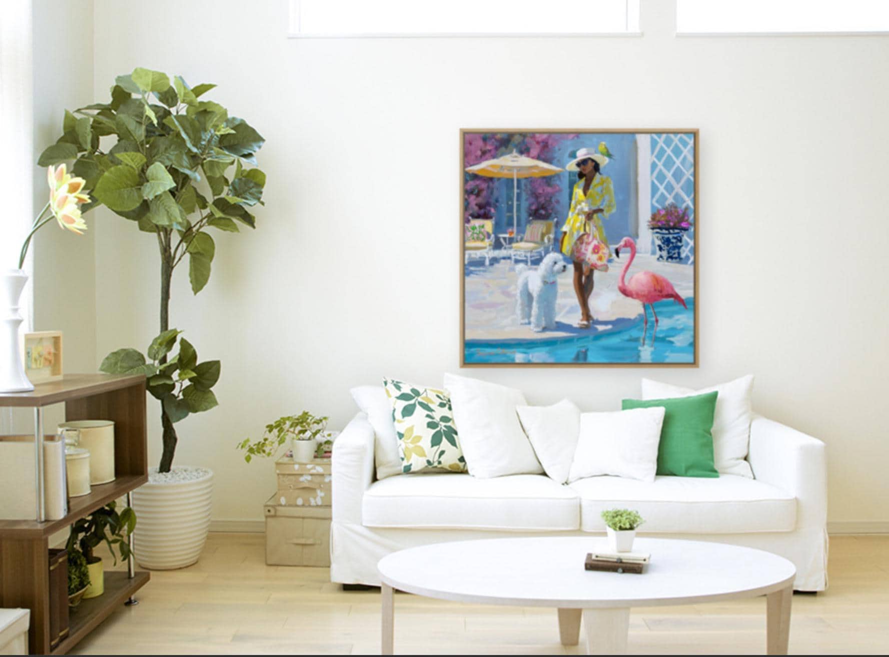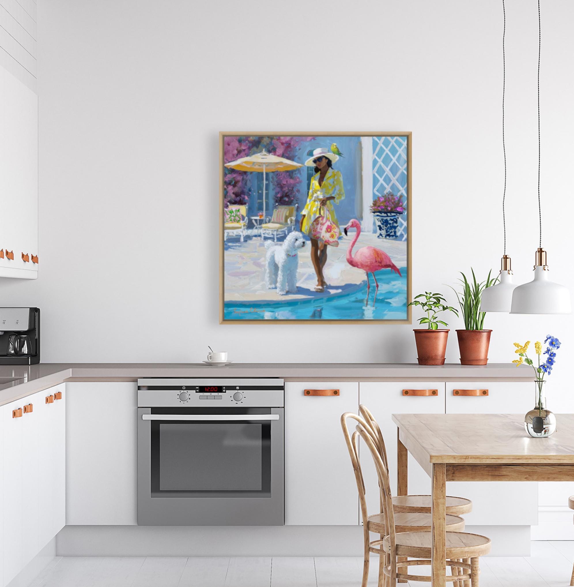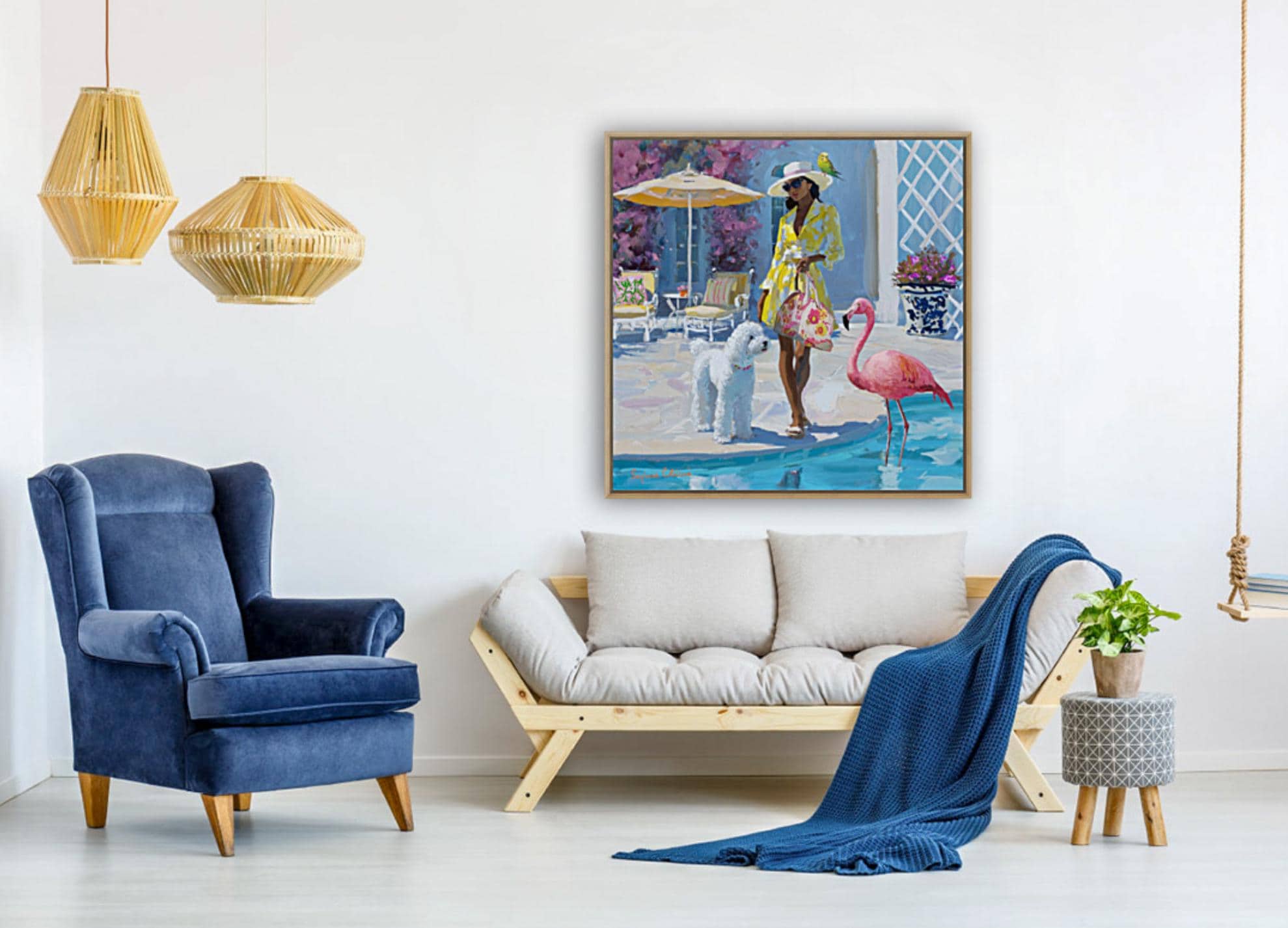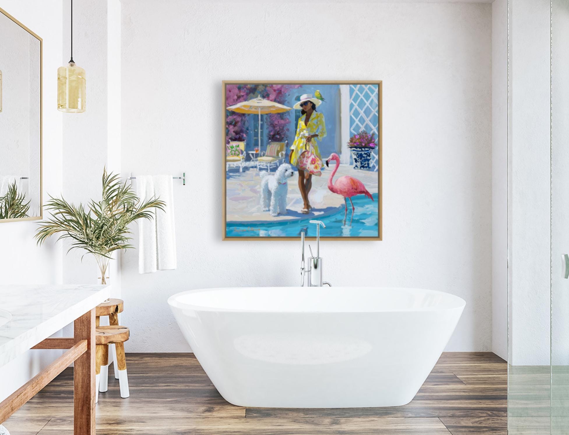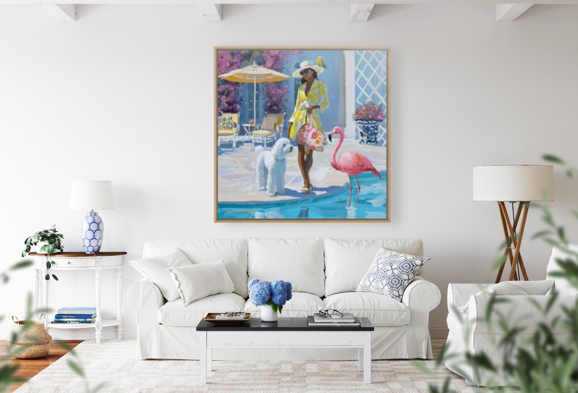 Whimsy meets glam in this vibrant Palm Beach daydream. A stylish girl in a lemon-yellow dress shares a poolside moment with her  bichon, a curious flamingo, and a sun-loving budgie. From the chinoiserie planter to the pink peony bag, every detail sparkles with Southern charm and Grandmillennial flair.