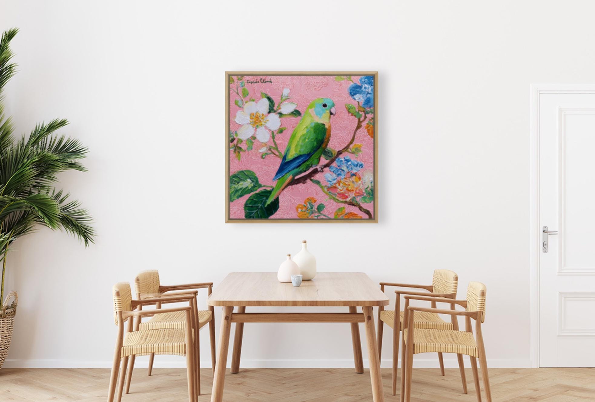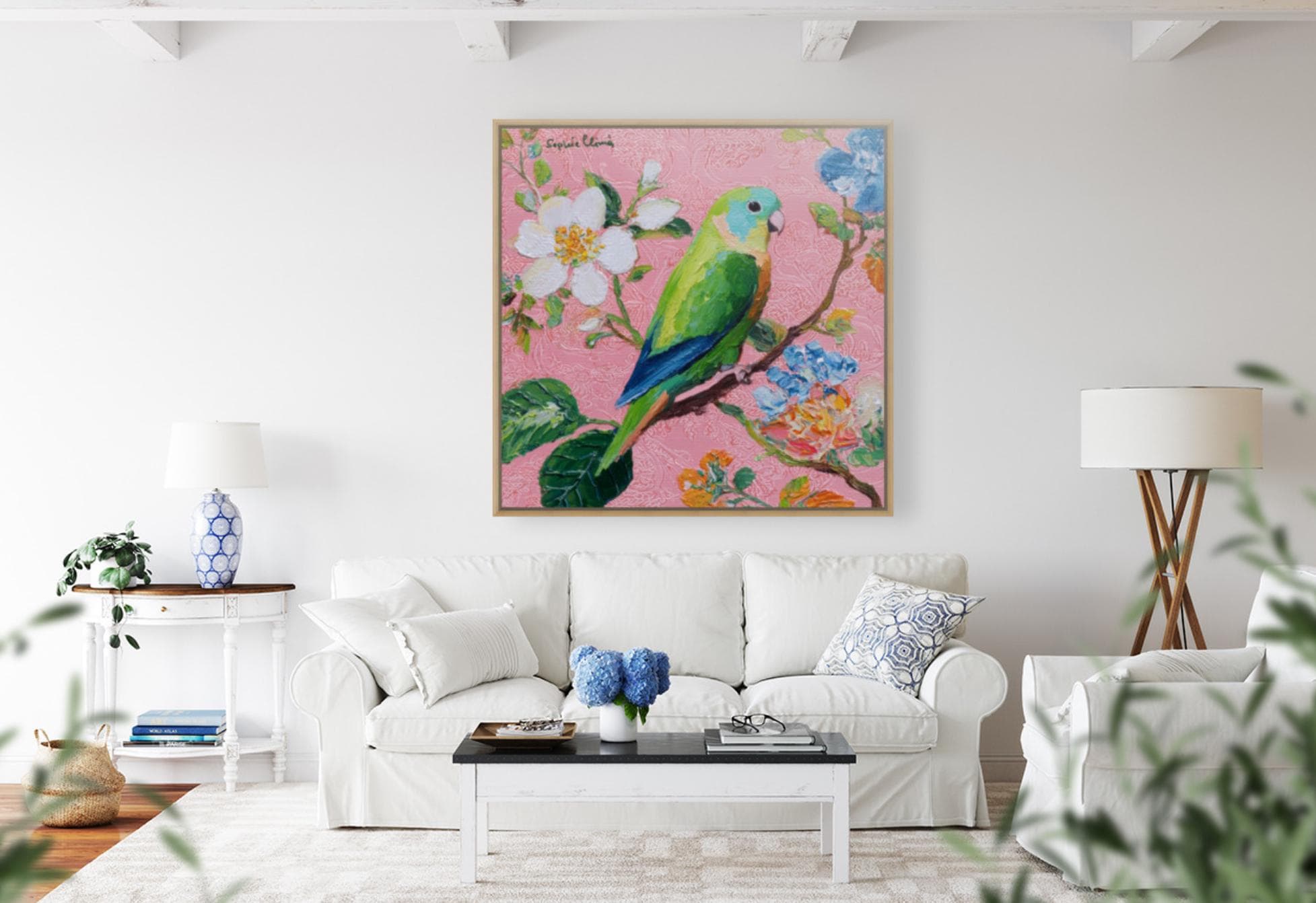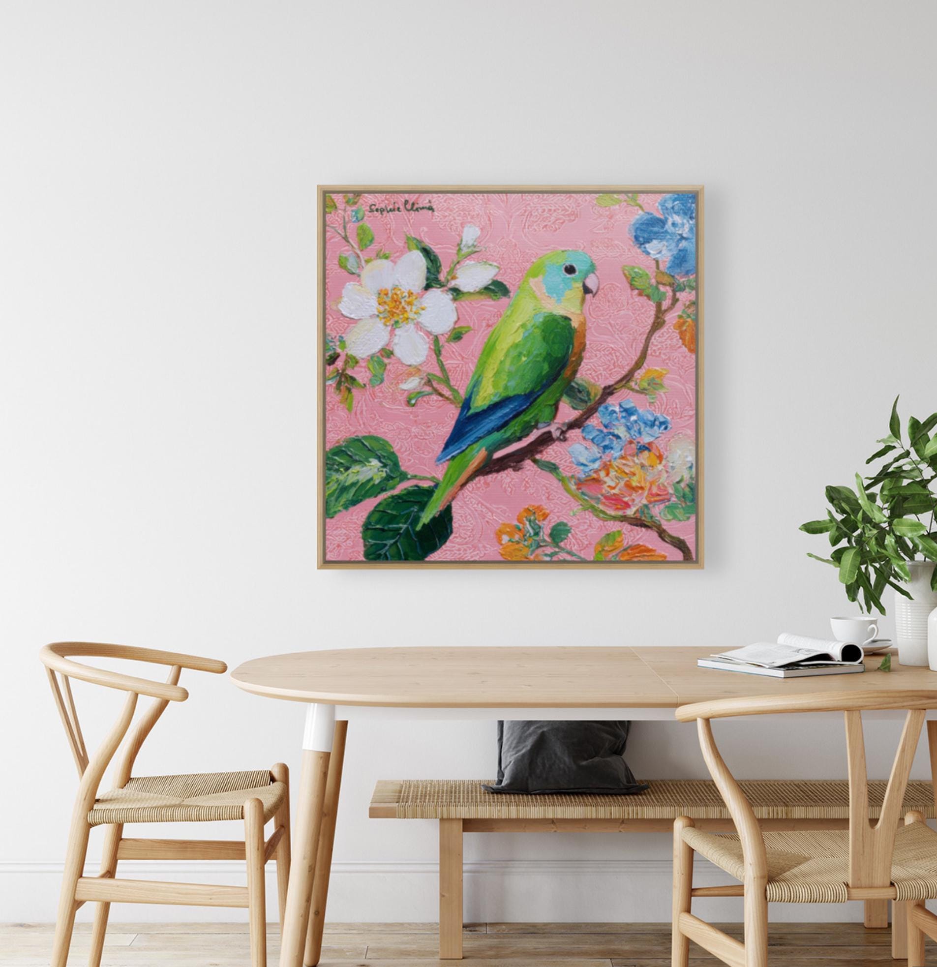 Grandmillennial art, Love bird in pink chinoiserie garden