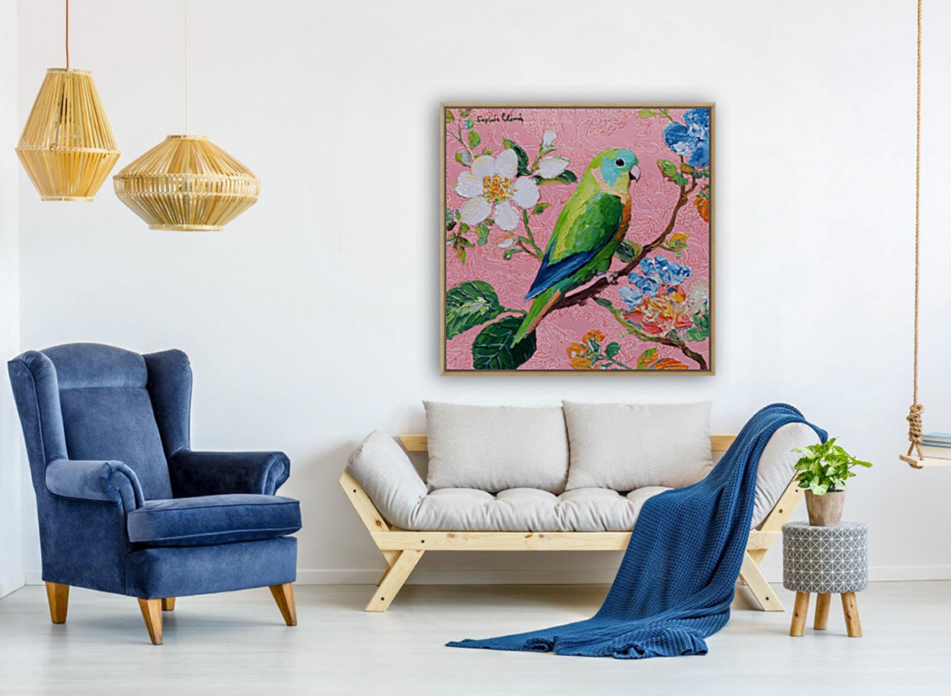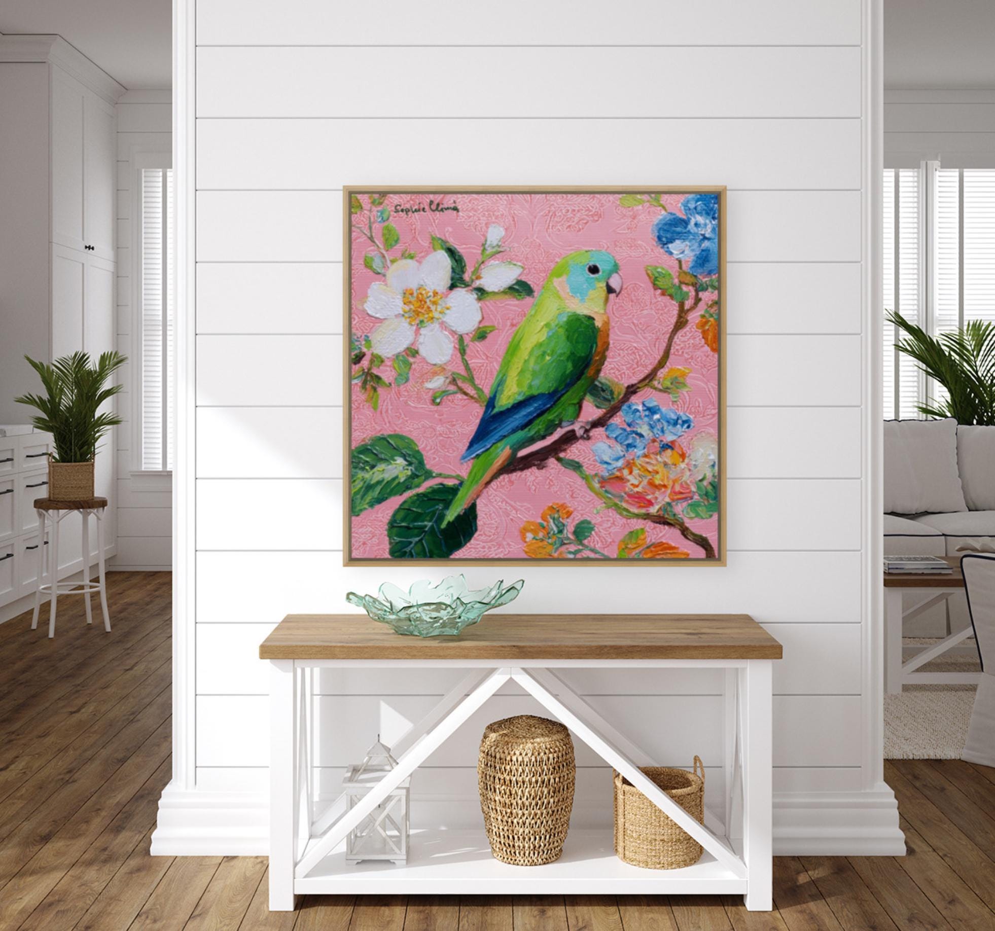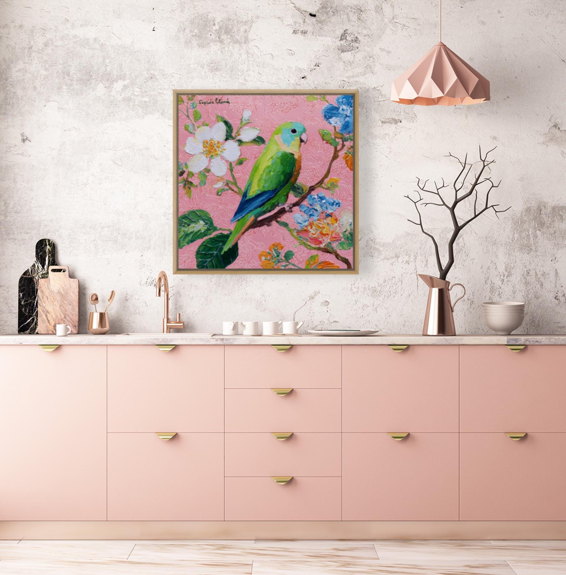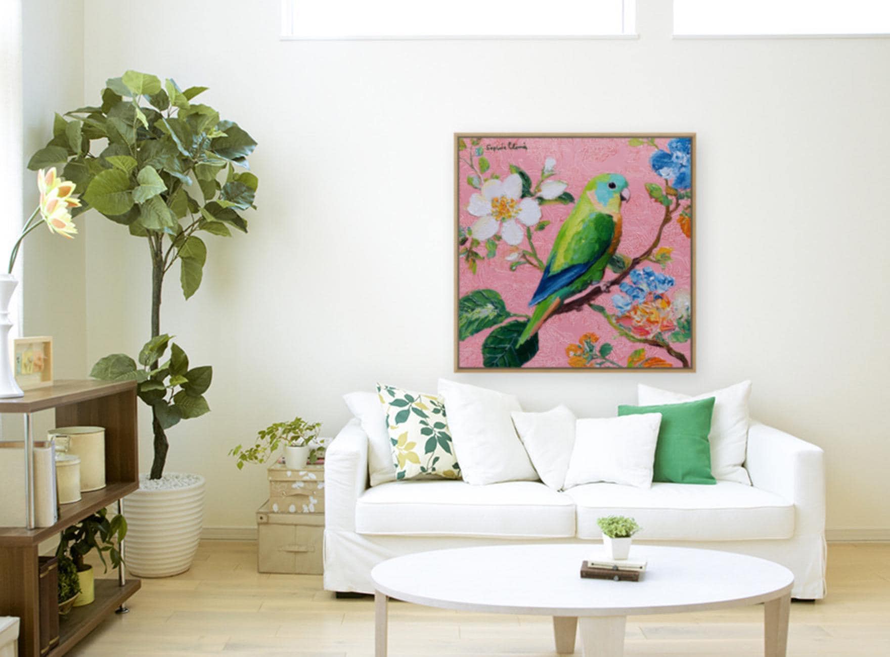 Grandmillennial art, Love bird in pink chinoiserie garden