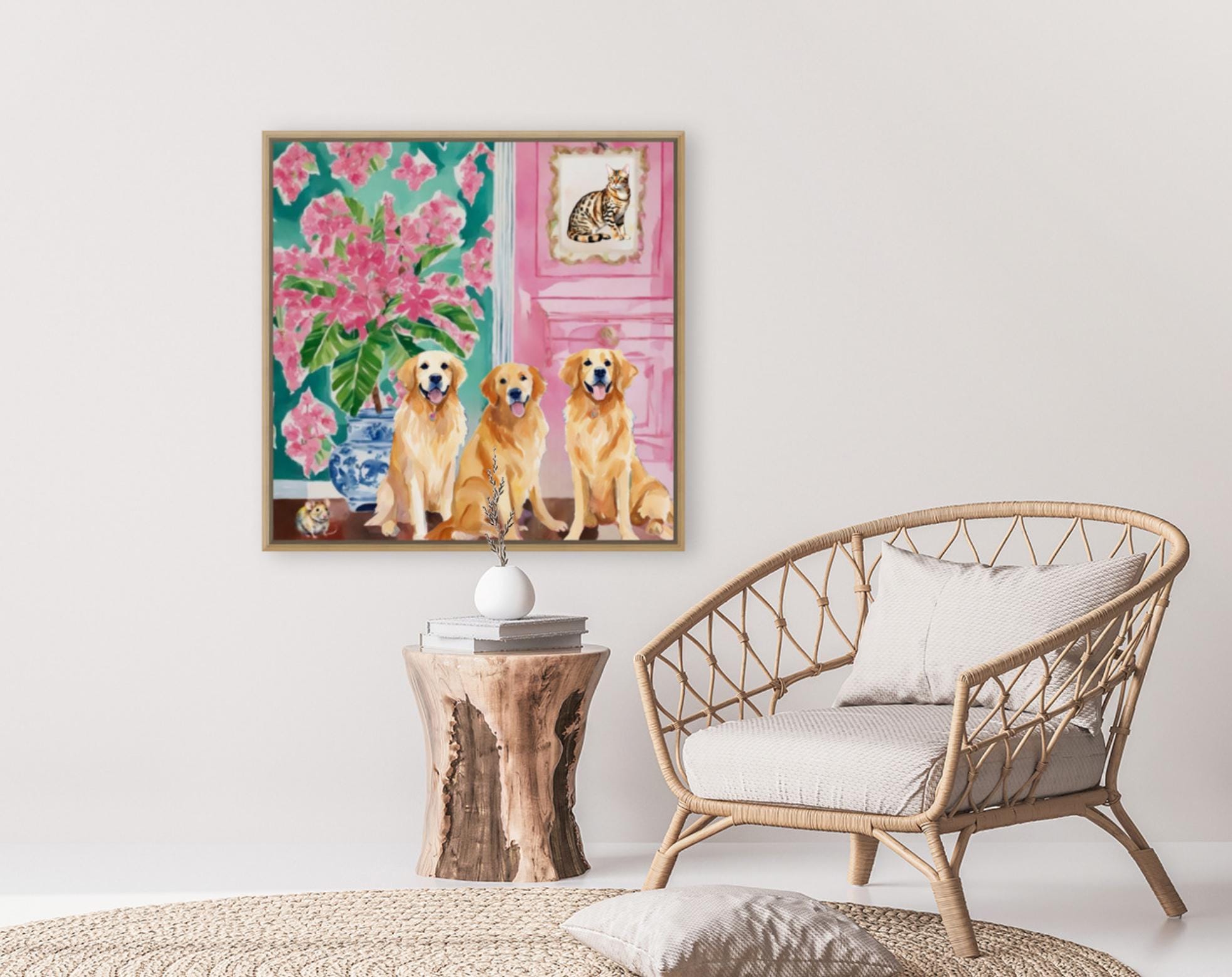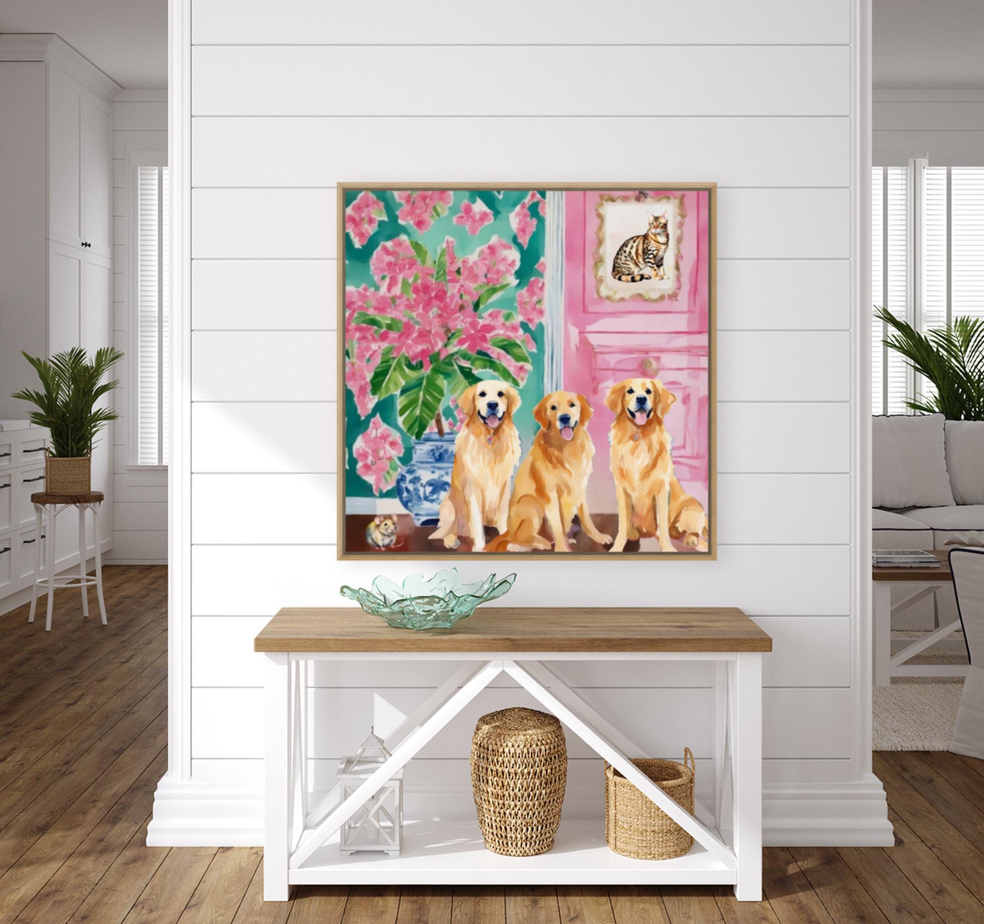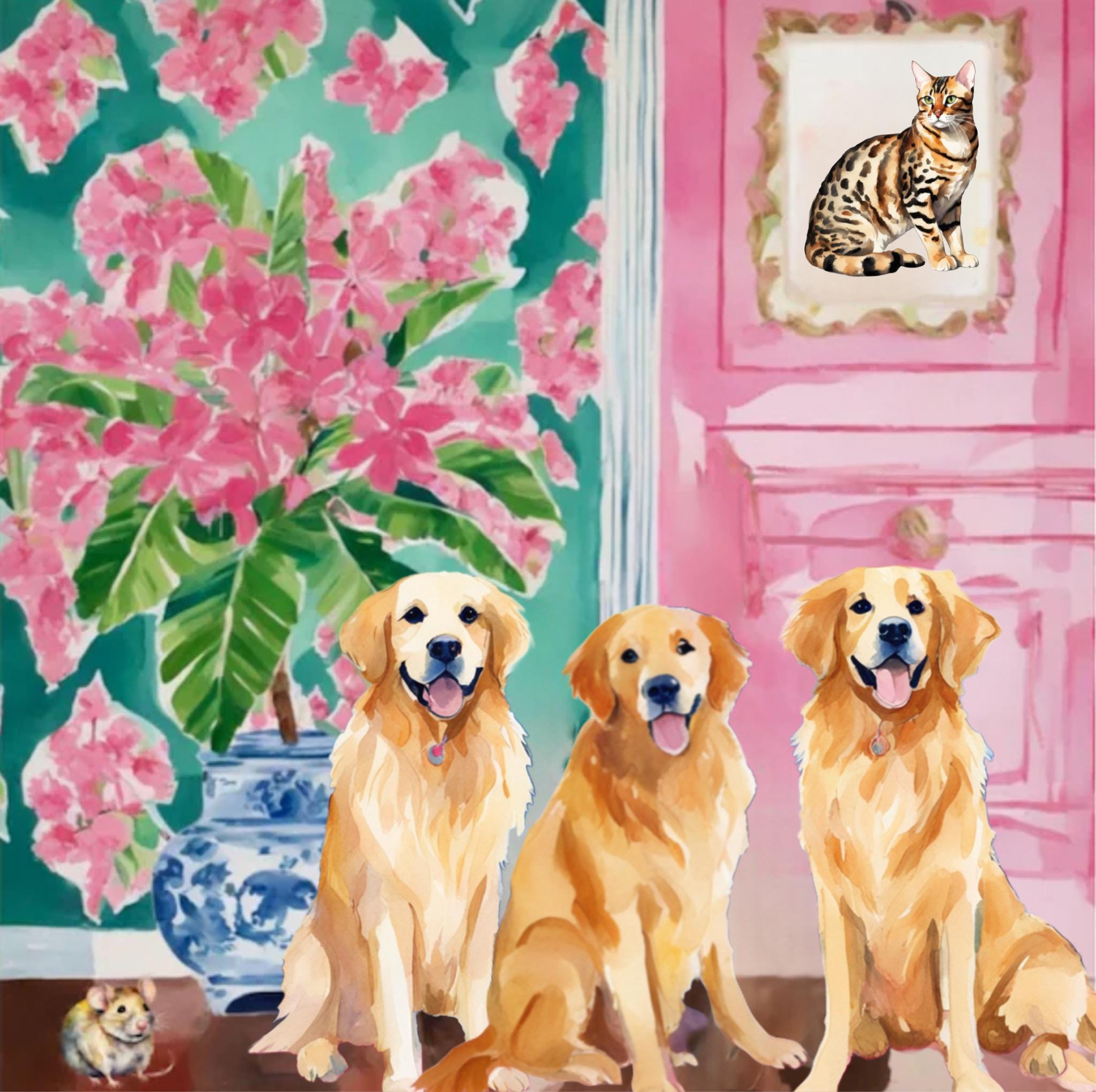 Grandmillennial art, They brought a cat home, preppy whimsical watercolor