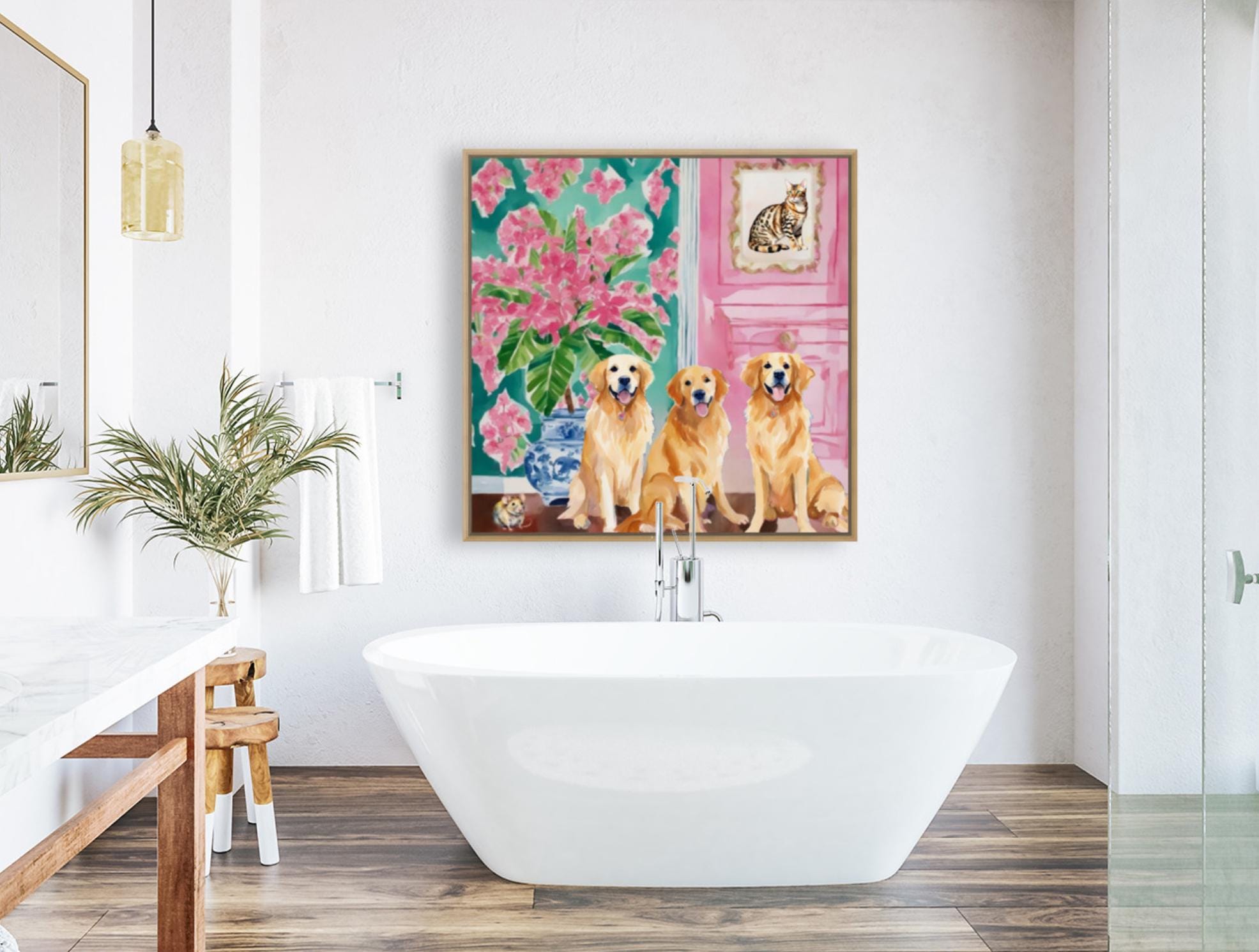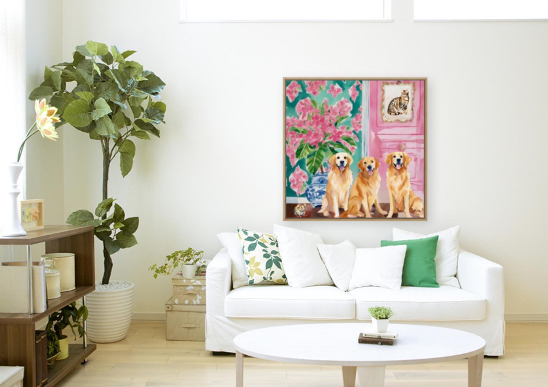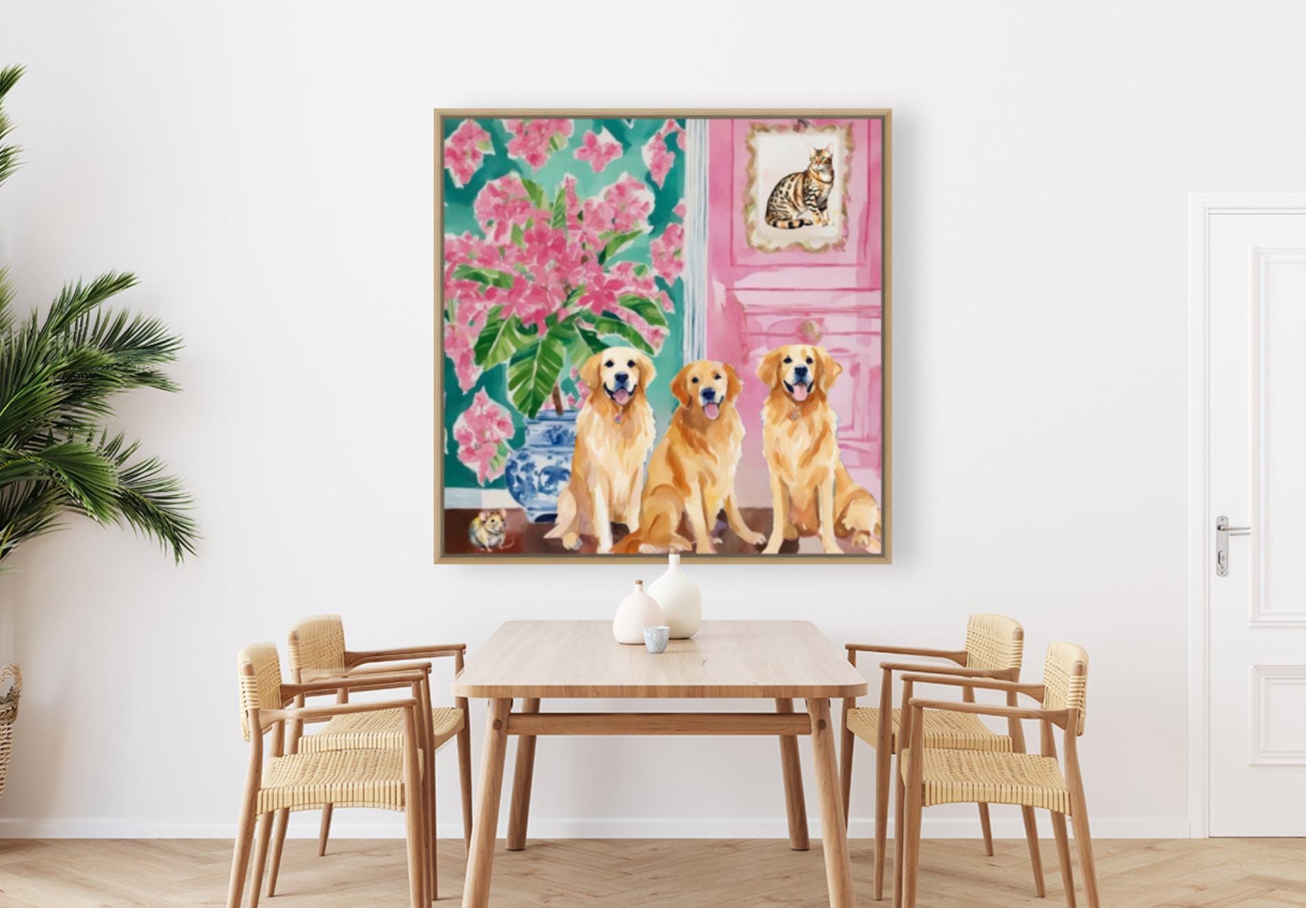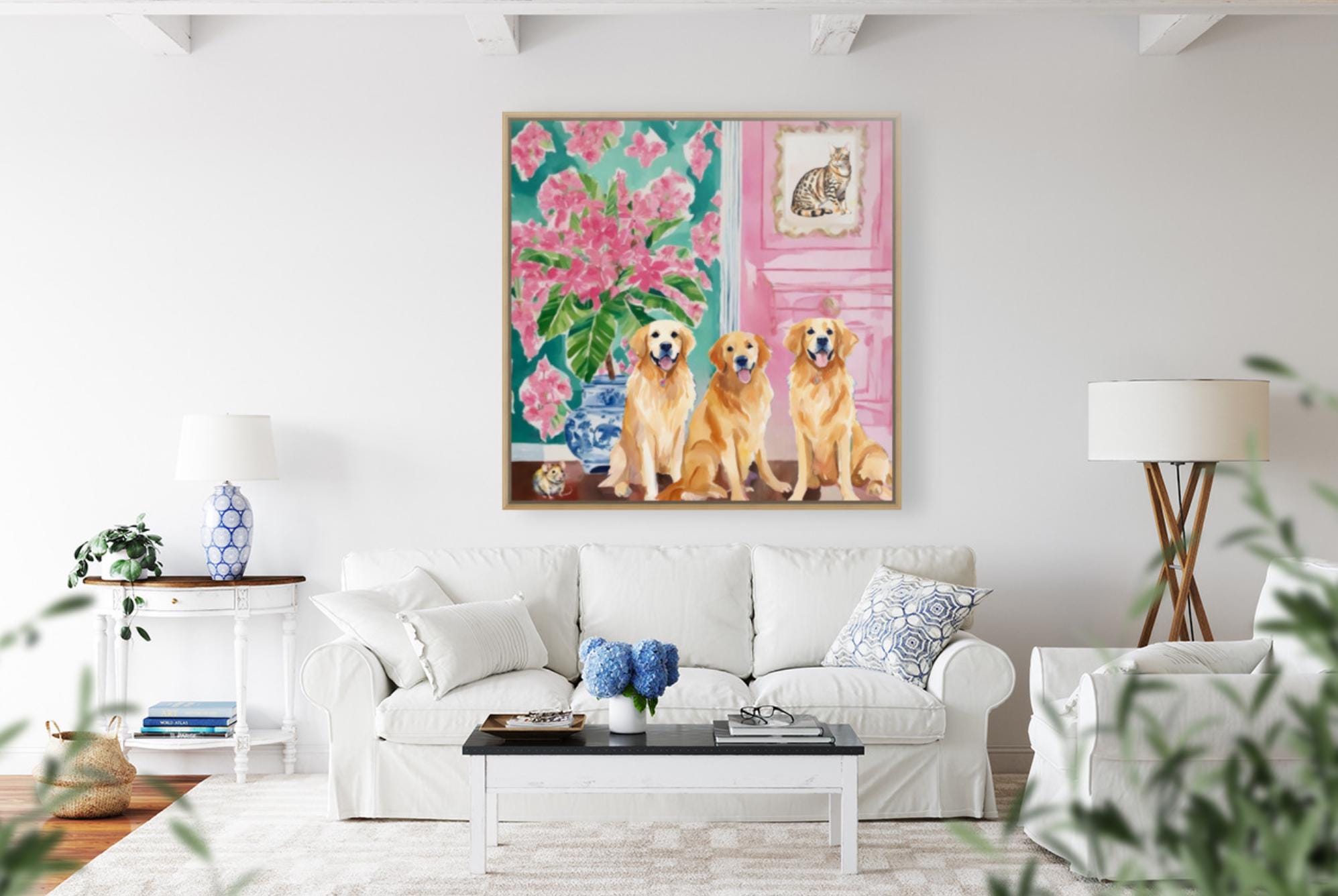 Grandmillennial art, They brought a cat home, preppy whimsical watercolor