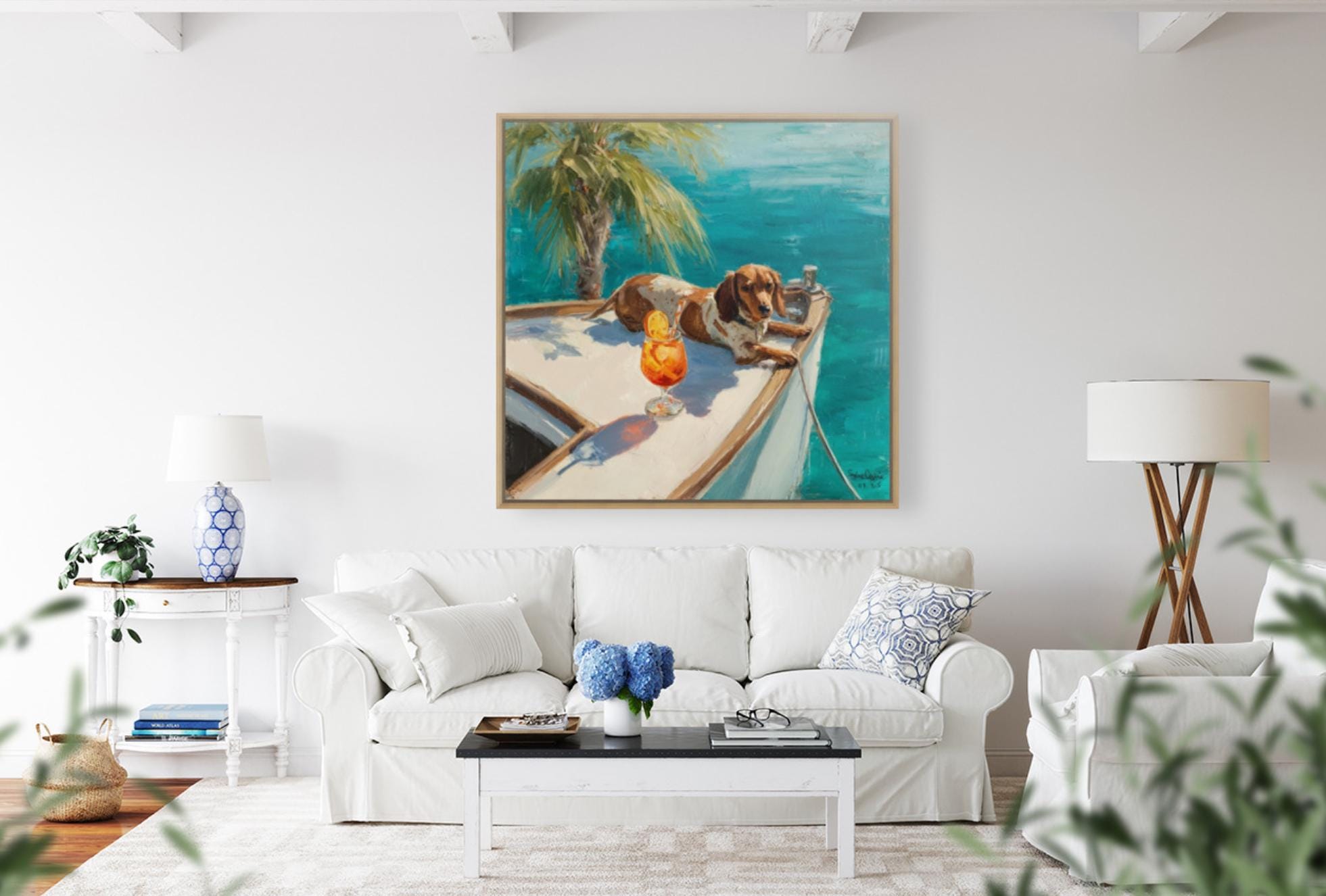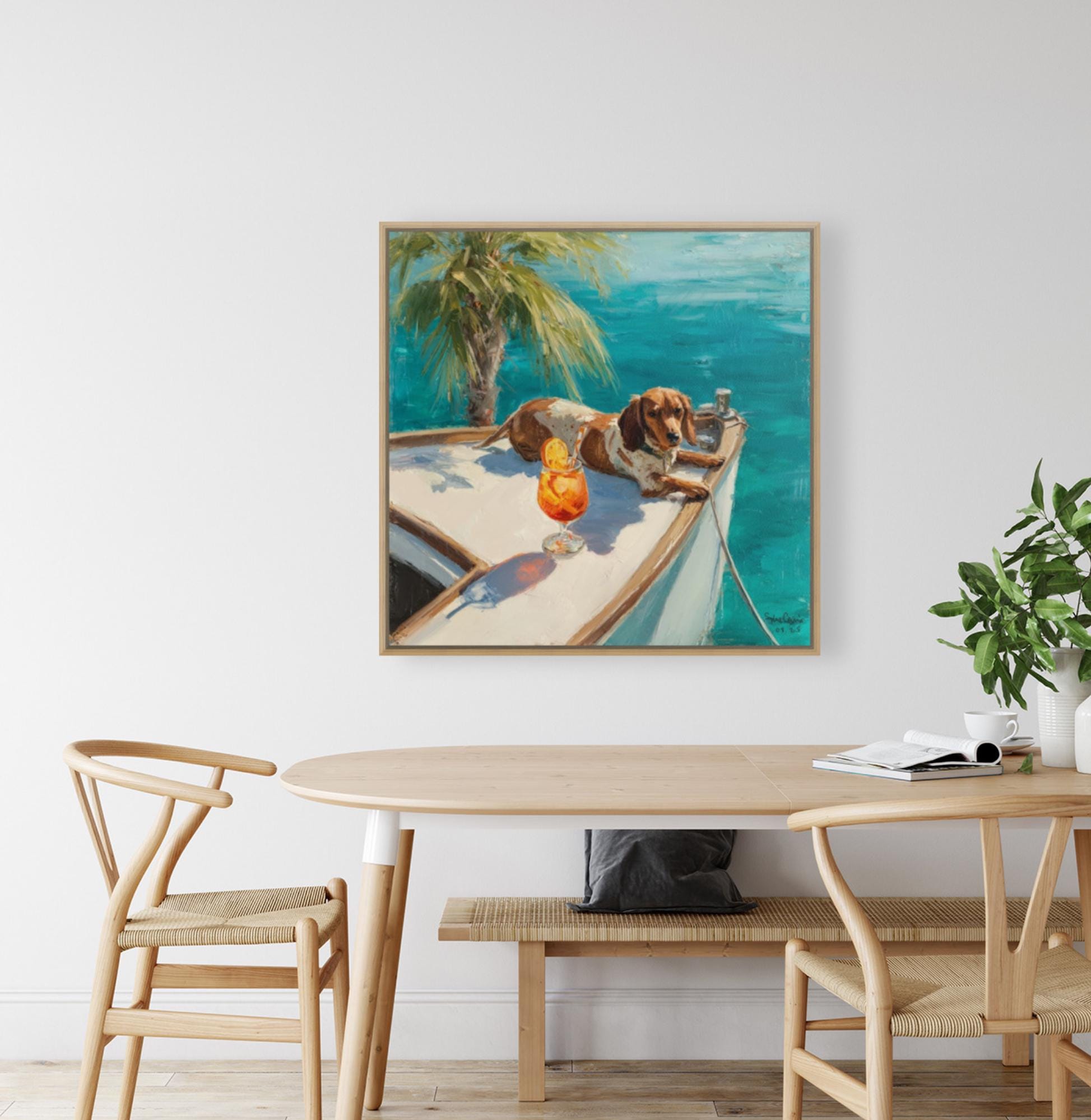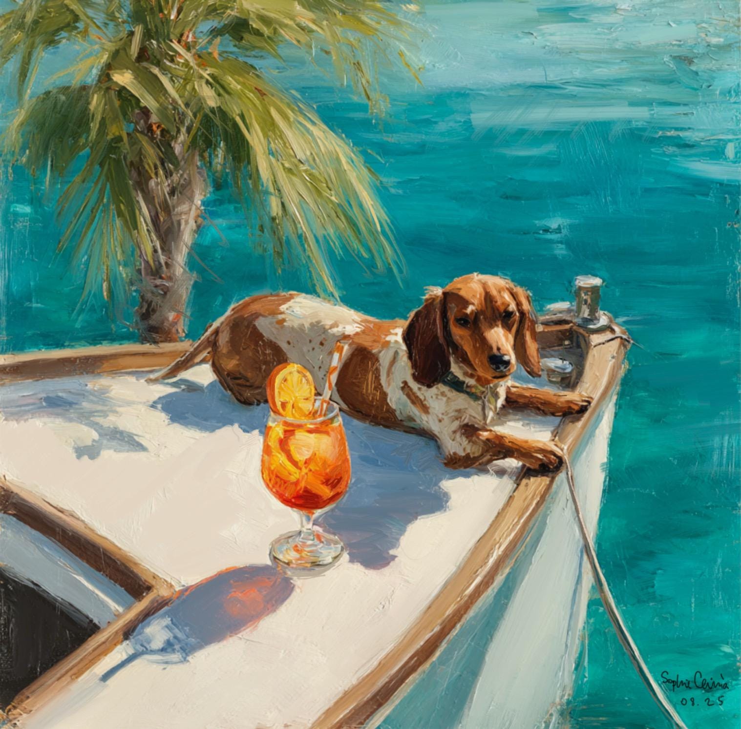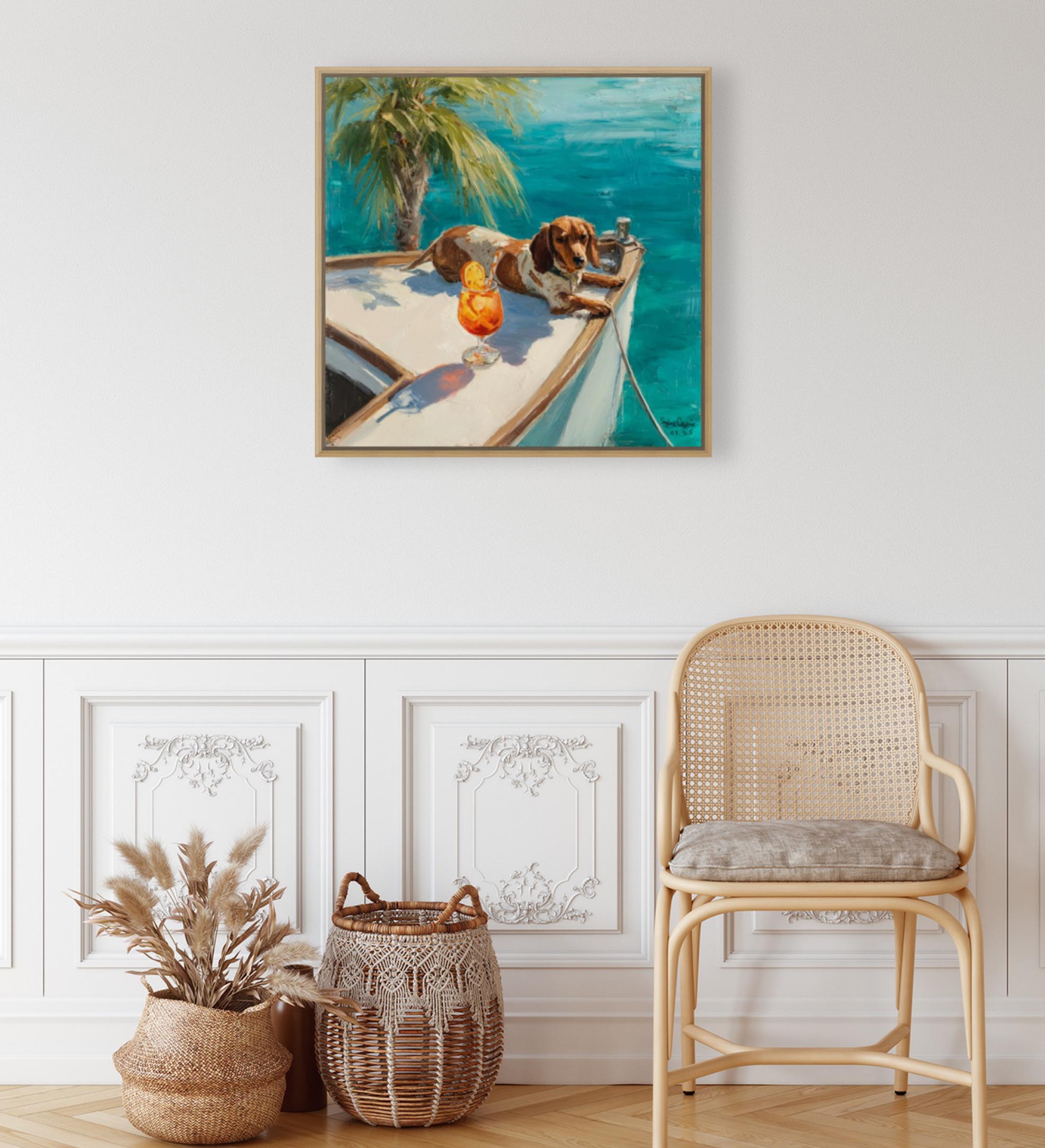 PLEASE NOTE SIZES ARE IN CM. Bring coastal vibe and preppy charm to your walls with this fun  art print. Featuring a cutest dachshund lounging on a sailboat beside a bright Aperol spritz, with turquoise waters and a palm in the background, this piece captures the joy of endless summer and gives Slim Aarons vibe, dachshund versionđ¶.