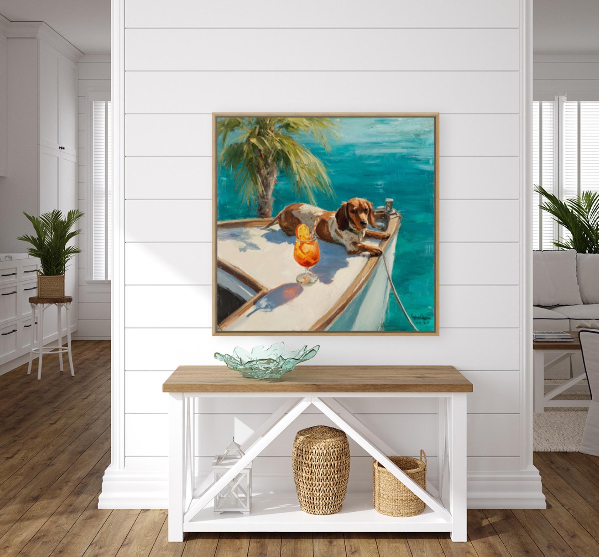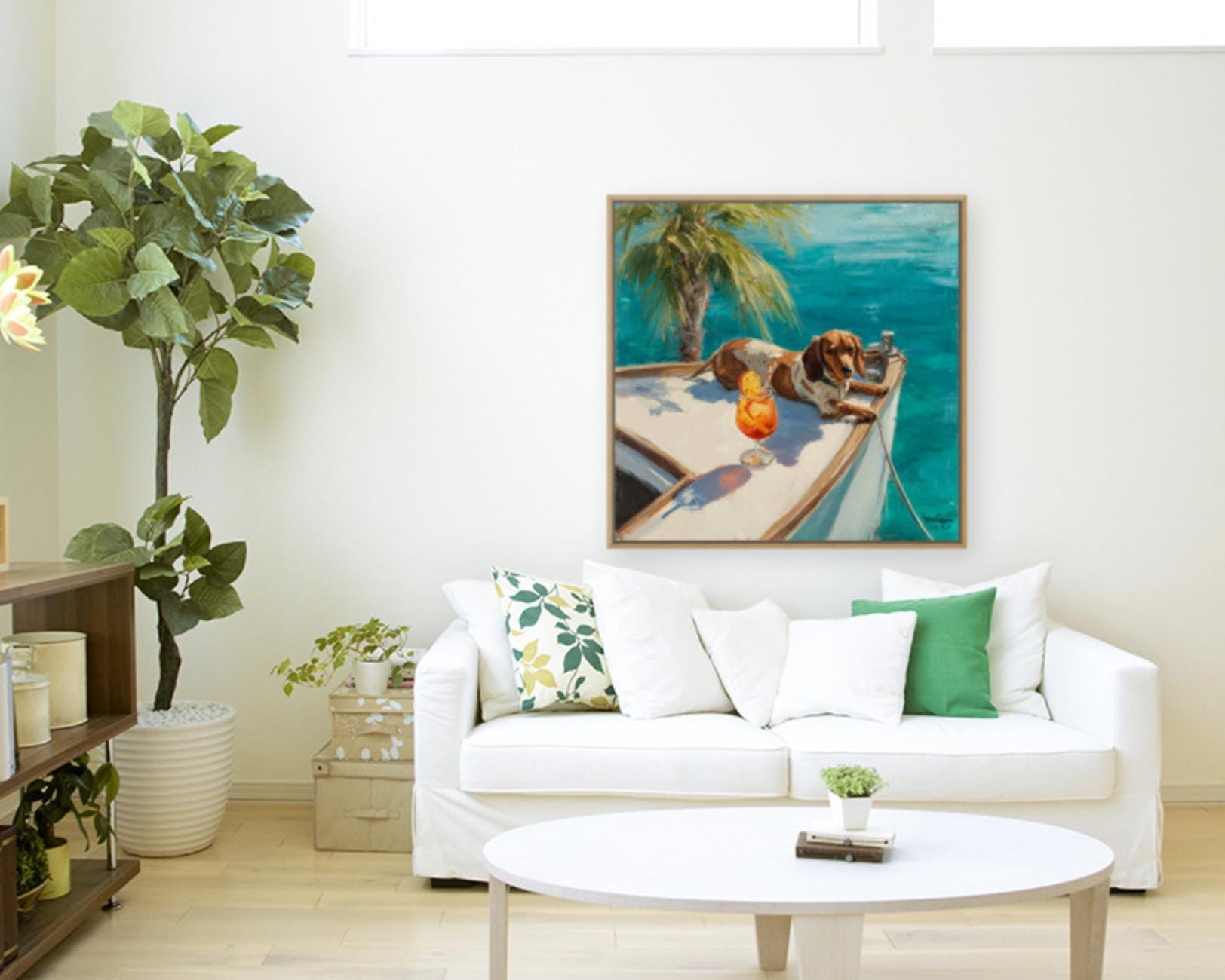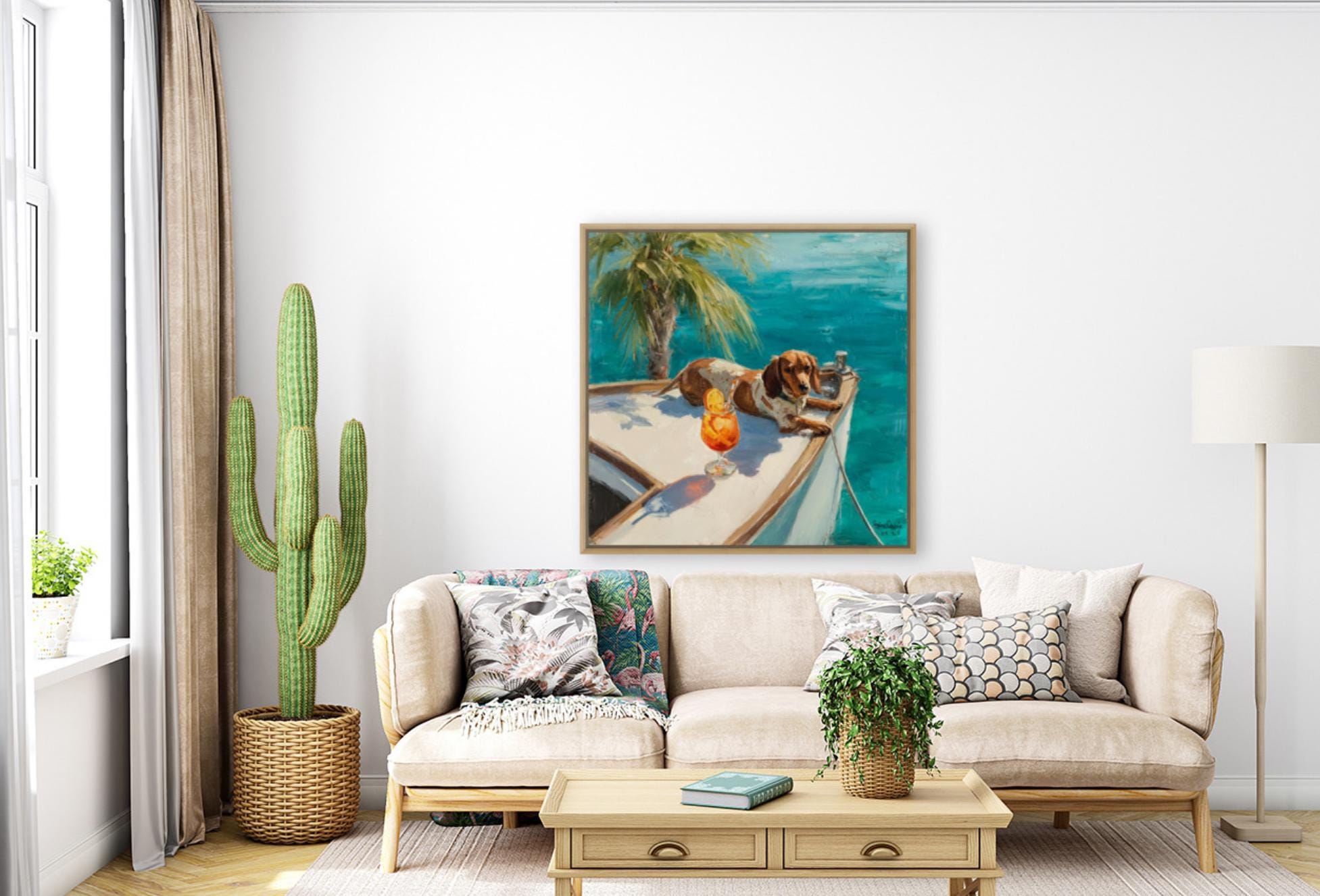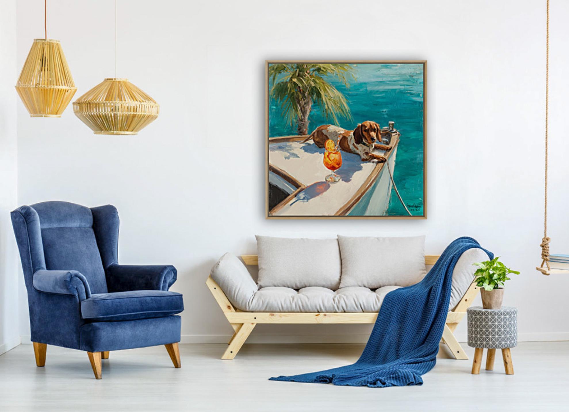 PLEASE NOTE SIZES ARE IN CM. Bring coastal vibe and preppy charm to your walls with this fun  art print. Featuring a cutest dachshund lounging on a sailboat beside a bright Aperol spritz, with turquoise waters and a palm in the background, this piece captures the joy of endless summer and gives Slim Aarons vibe, dachshund versionđ¶.