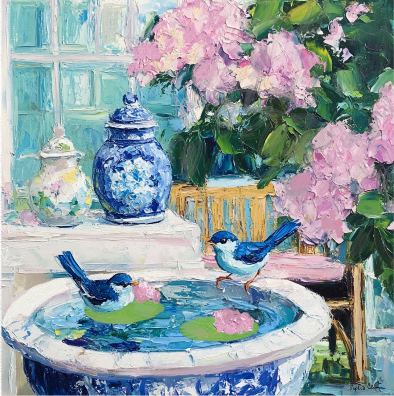 Sophie's art is the modern interpretation of Chinese artistic traditions featuring pagodas, landscapes, blue and white porcelain, ginger jars, pagodas, cheetahs and monkeys. Sophie developed her own recognizable style with bright colors and whimsical details.
