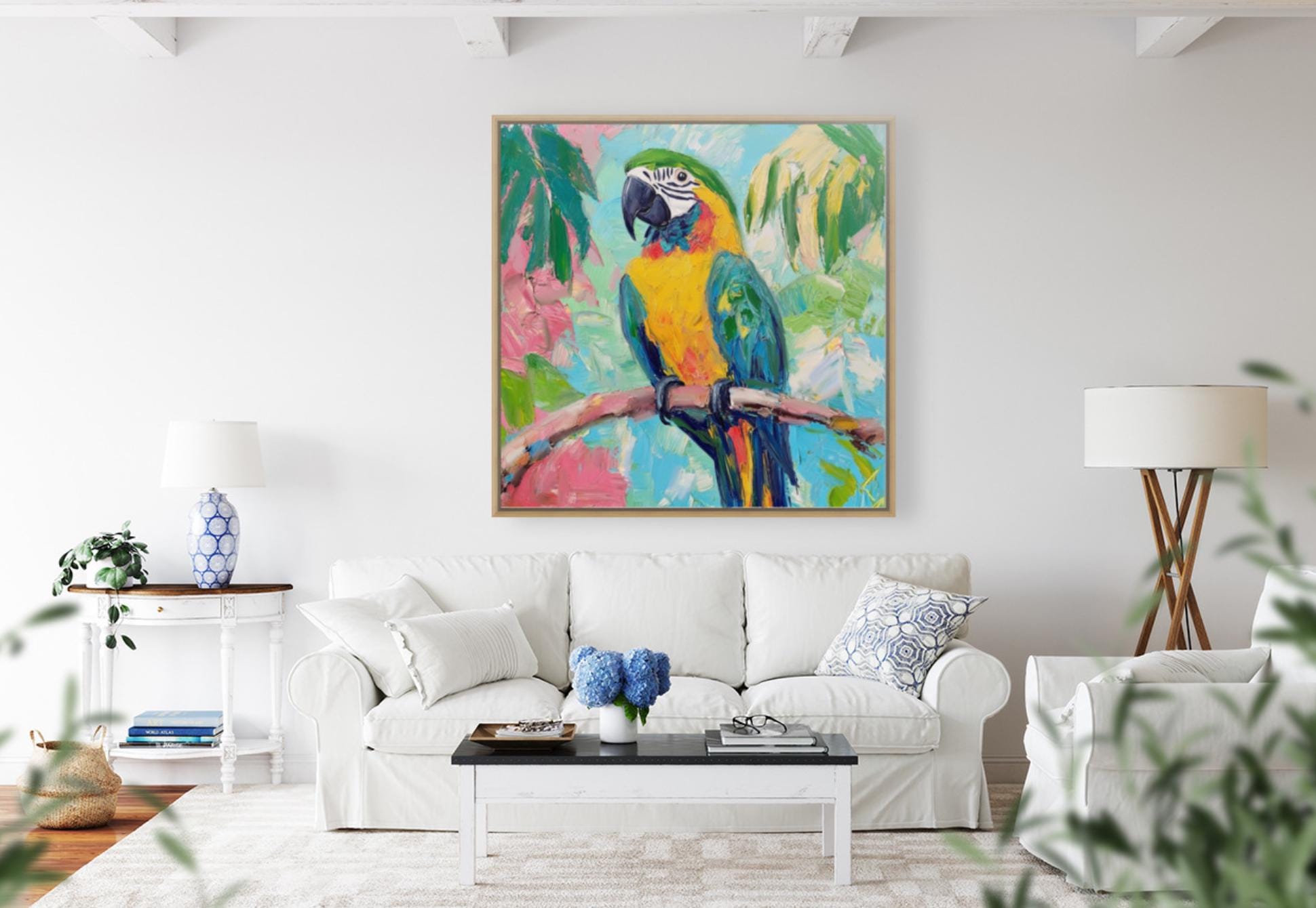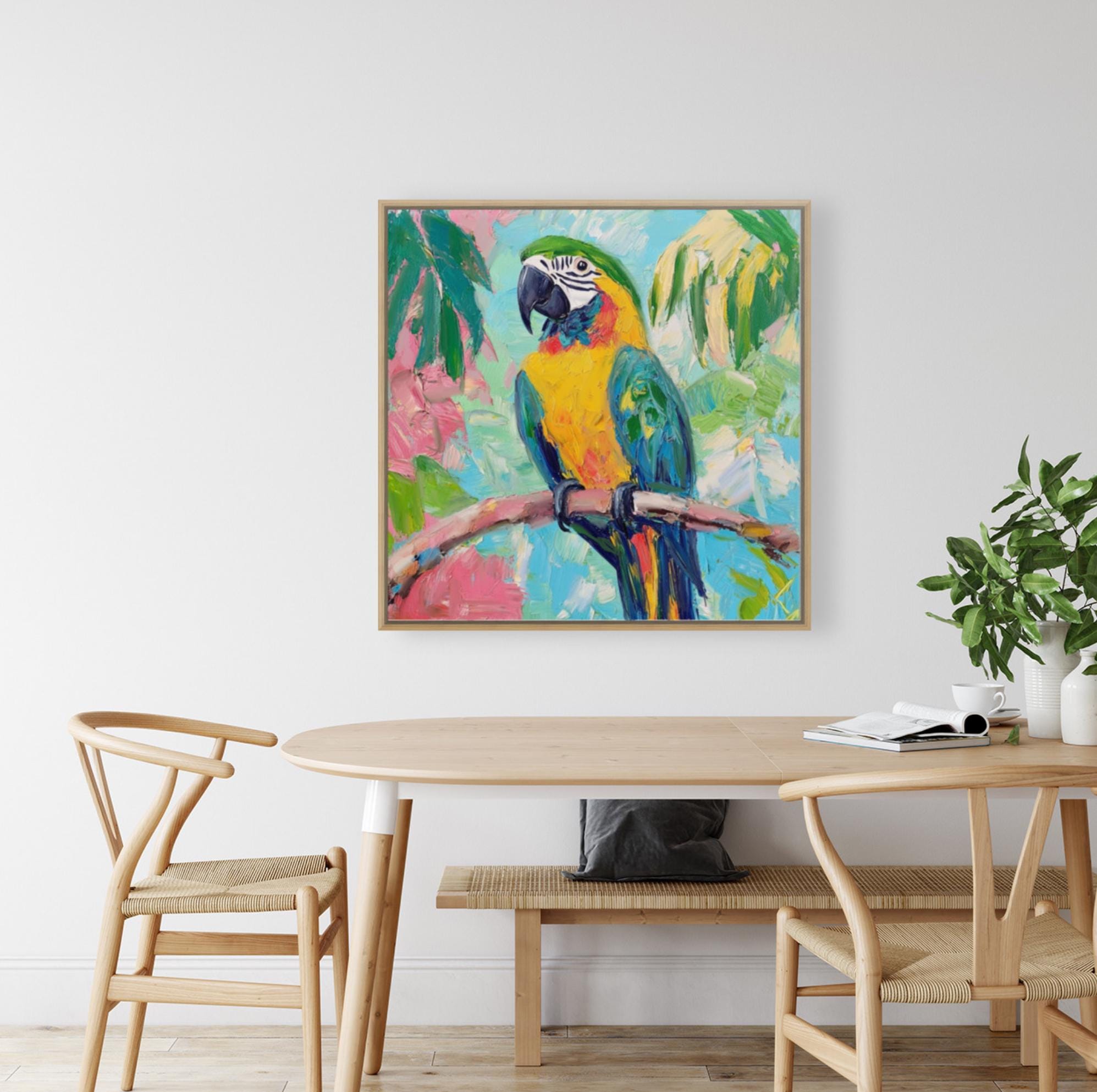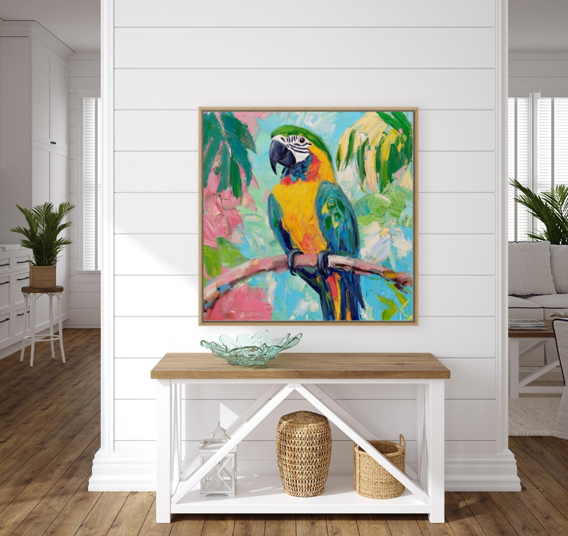 PLEASE NOTE SIZES ARE IN CM. Bring a burst of tropical charm into your home with this luxury giclée print of a  macaw parrot, painted in bold preppy colors. Perfect for Palm Beach style interiors, Grandmillennial homes, and coastal chic décor, this artwork features a dazzling parrot perched against a lively pastel background.