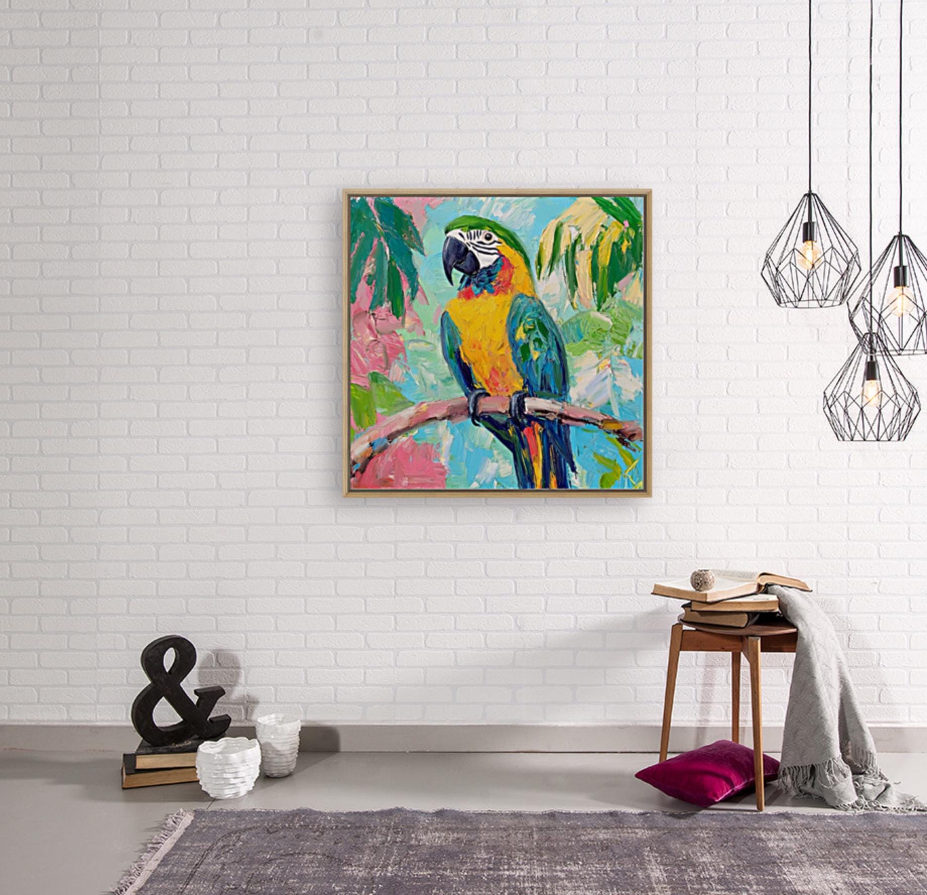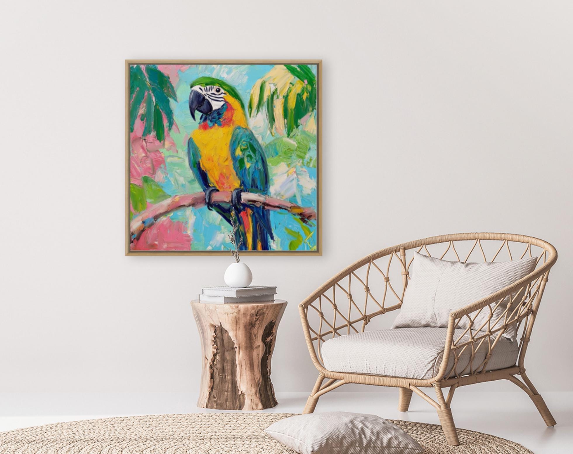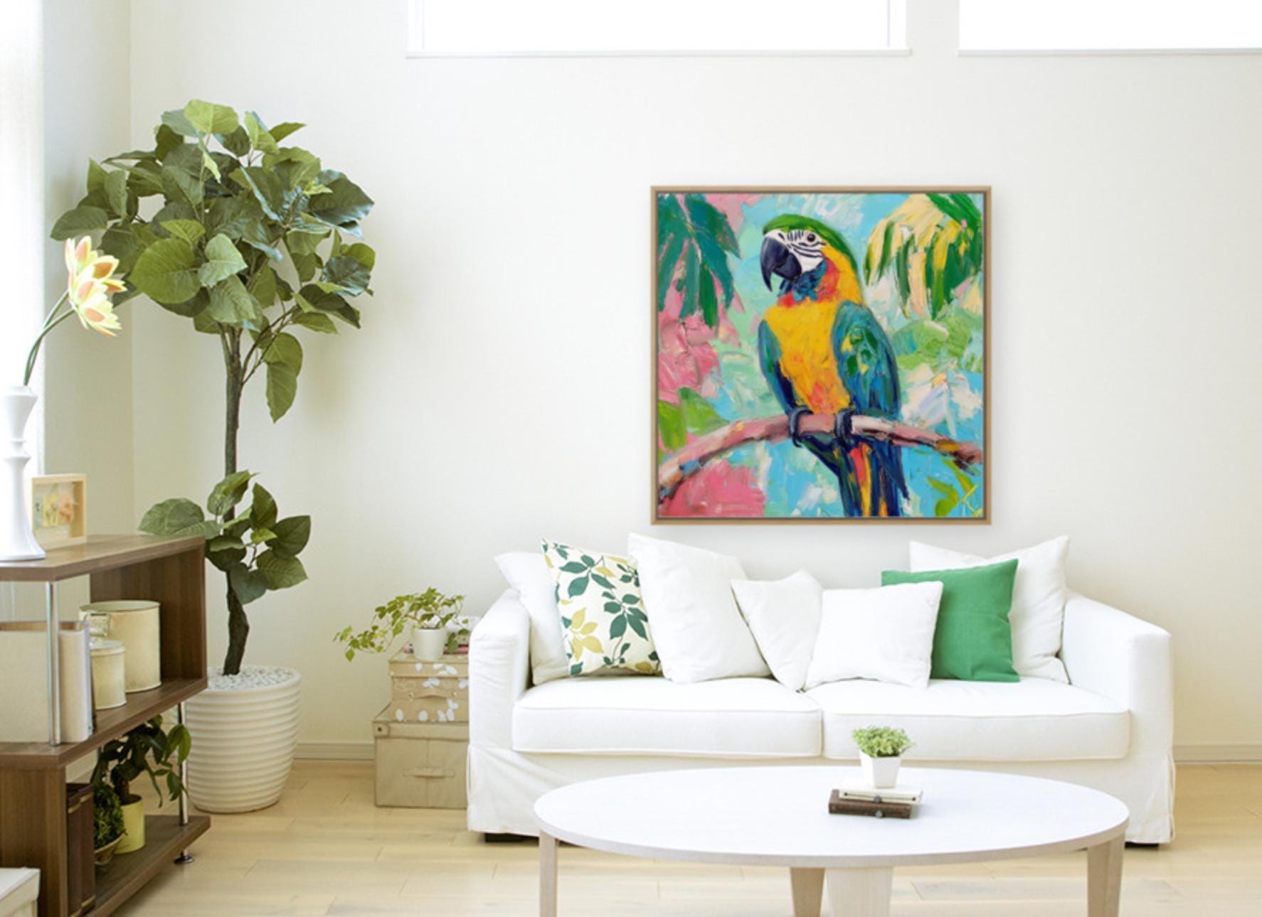 PLEASE NOTE SIZES ARE IN CM. Bring a burst of tropical charm into your home with this luxury giclée print of a  macaw parrot, painted in bold preppy colors. Perfect for Palm Beach style interiors, Grandmillennial homes, and coastal chic décor, this artwork features a dazzling parrot perched against a lively pastel background.
