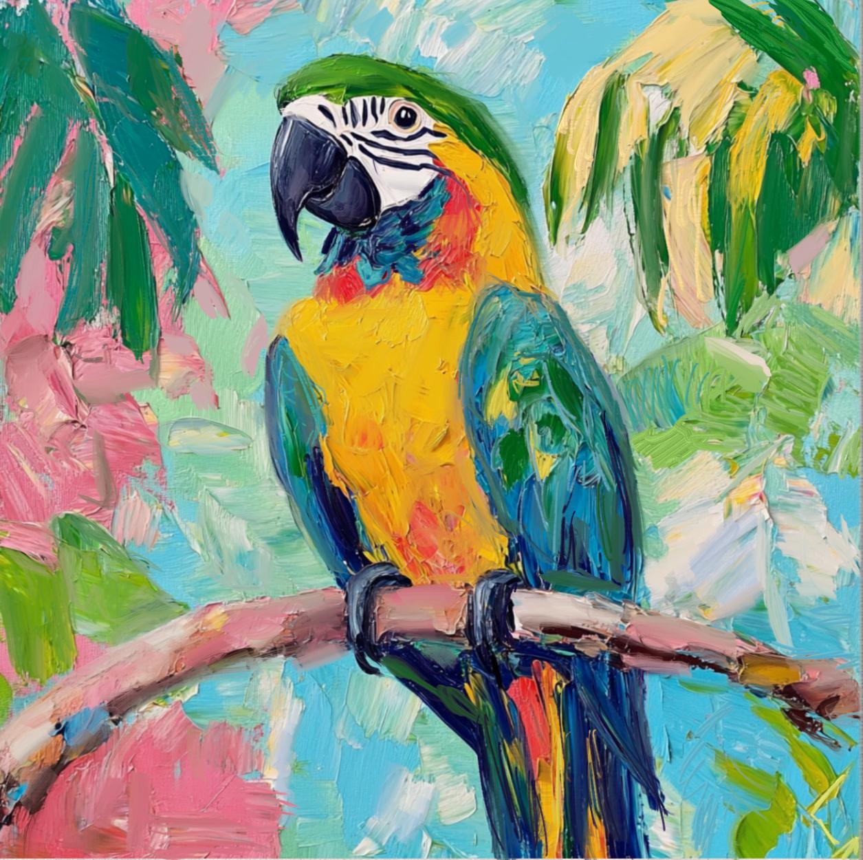Bold, colorful tropical macaw for a preppy, Palm Beach vibe