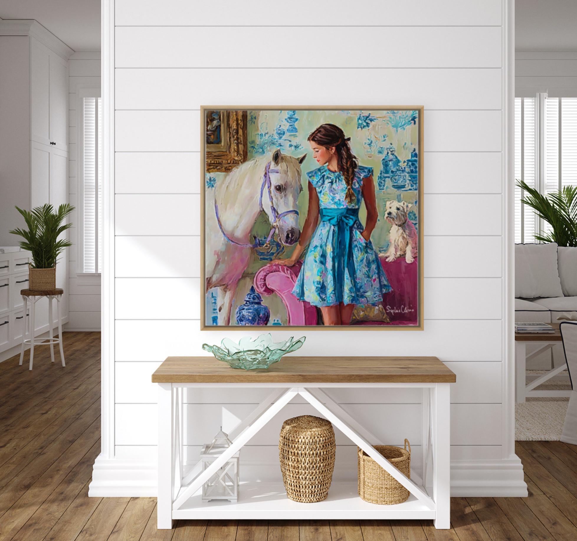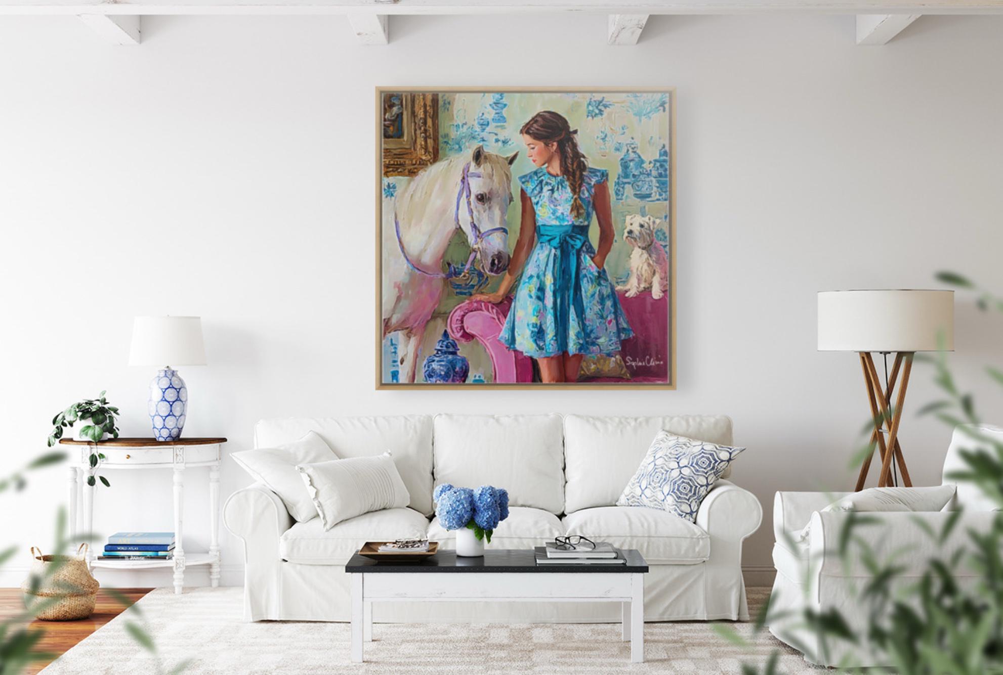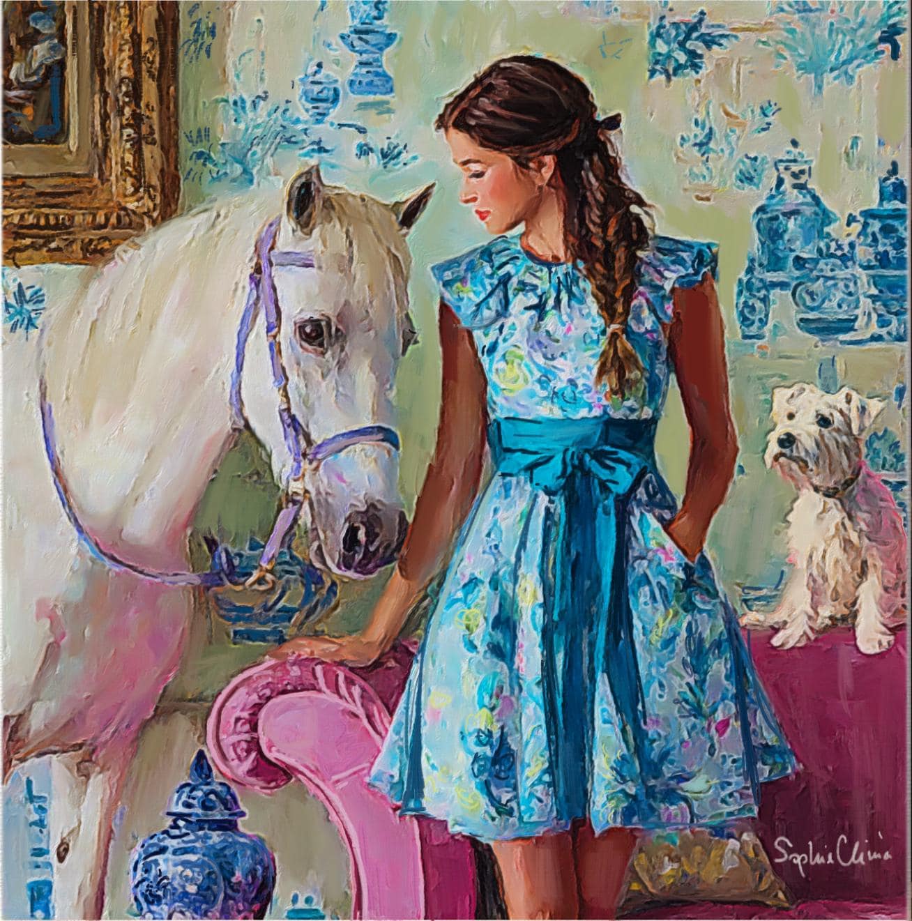 Grandmillennial art, A girl with a white horse, whimsical fine art