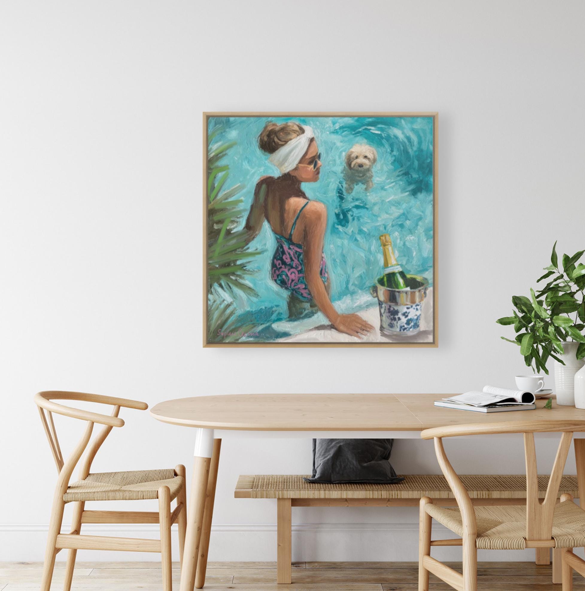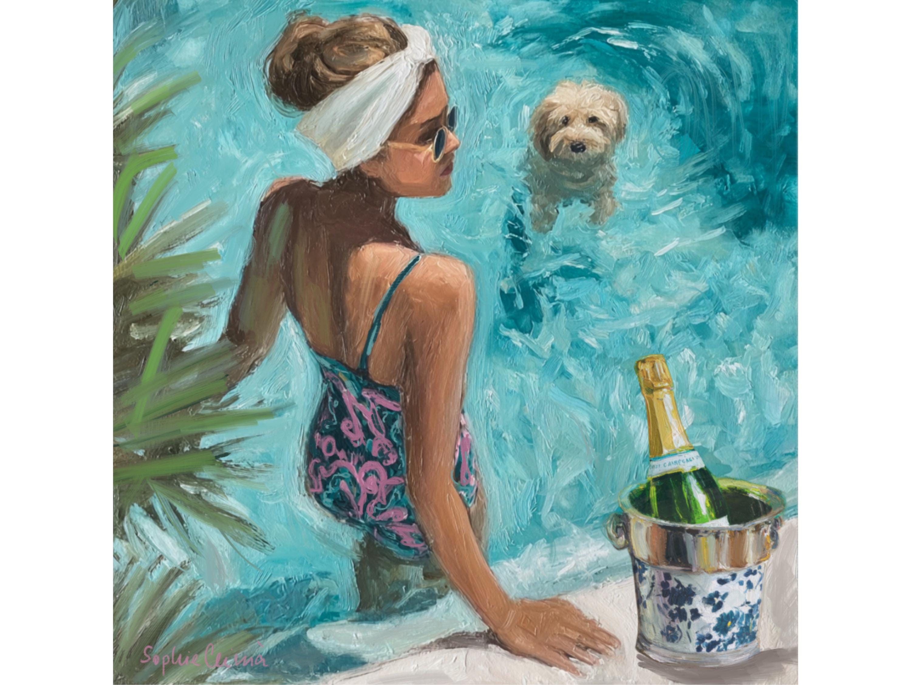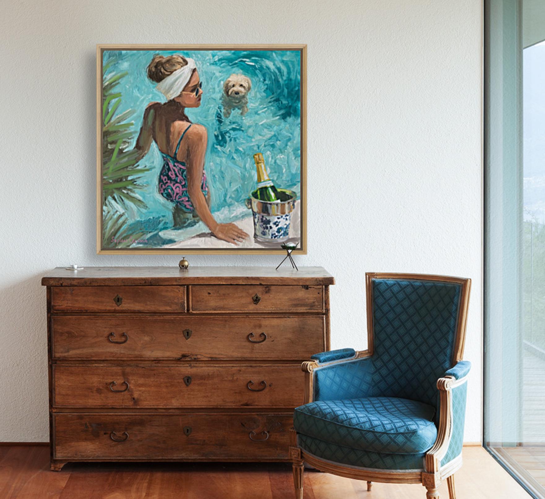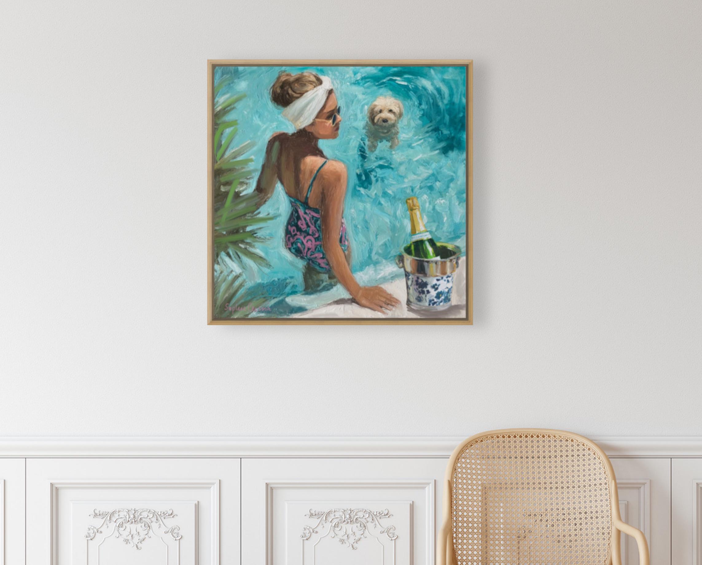 Bring the effortless glamour of Palm Beach summers into your home. This original artwork by Sophie Clima captures a chic poolside moment: a sun-kissed woman in a patterned swimsuit, her fluffy dog paddling nearby, and champagne cooling in a chinoiserie ice bucket.