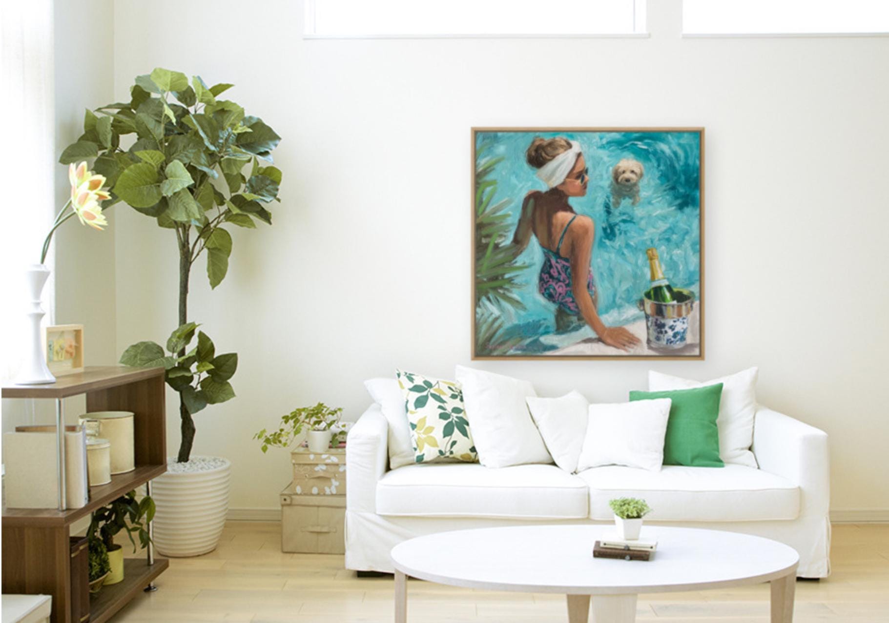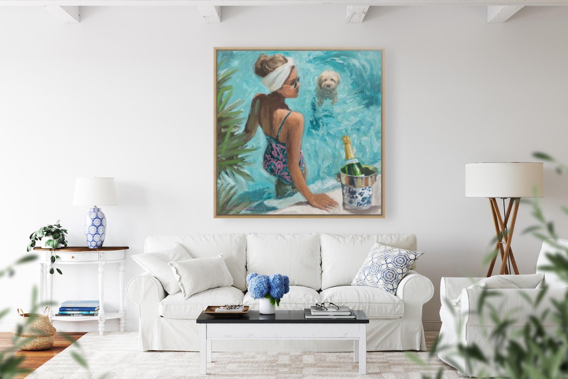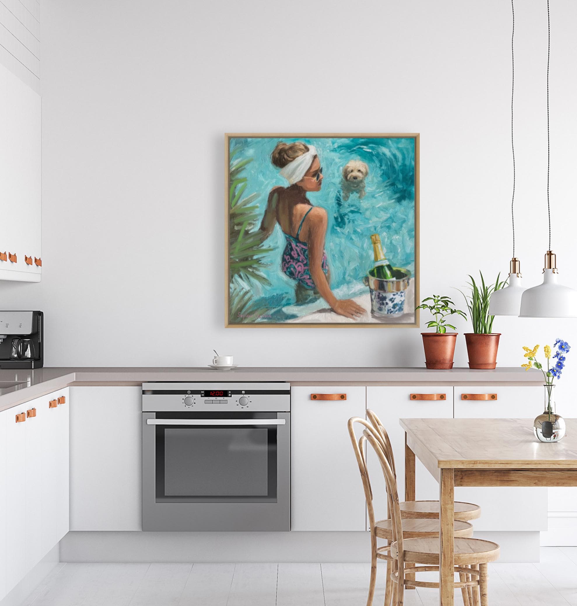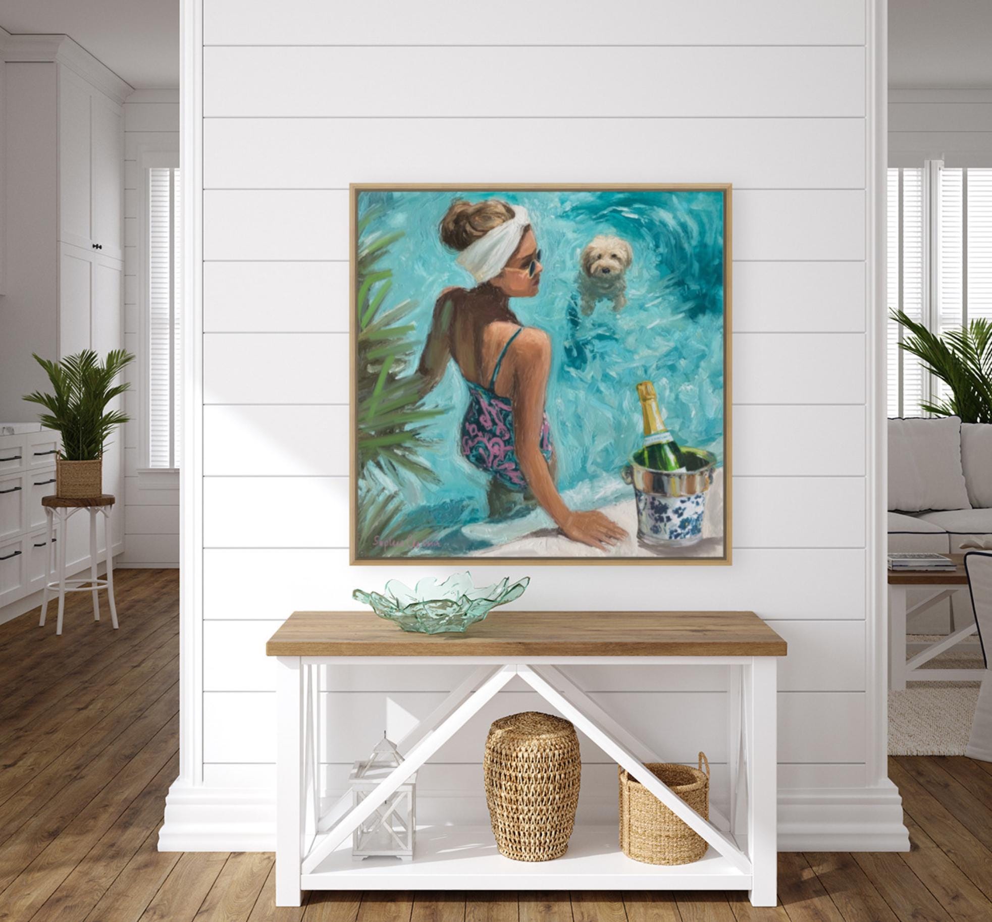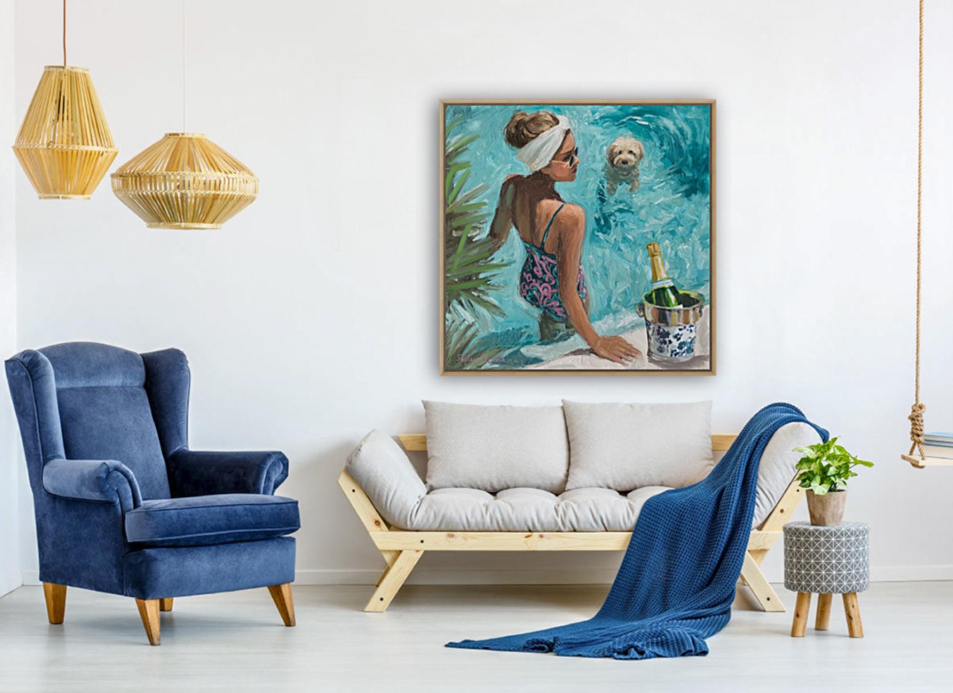 Bring the effortless glamour of Palm Beach summers into your home. This original artwork by Sophie Clima captures a chic poolside moment: a sun-kissed woman in a patterned swimsuit, her fluffy dog paddling nearby, and champagne cooling in a chinoiserie ice bucket.