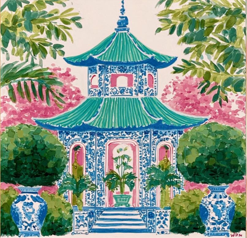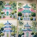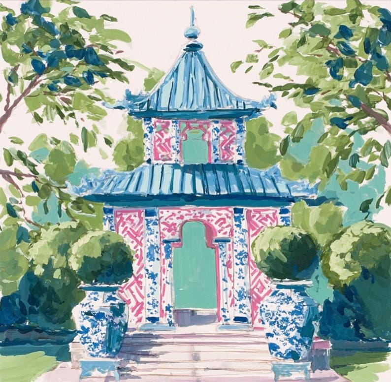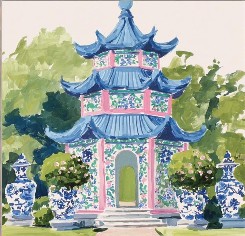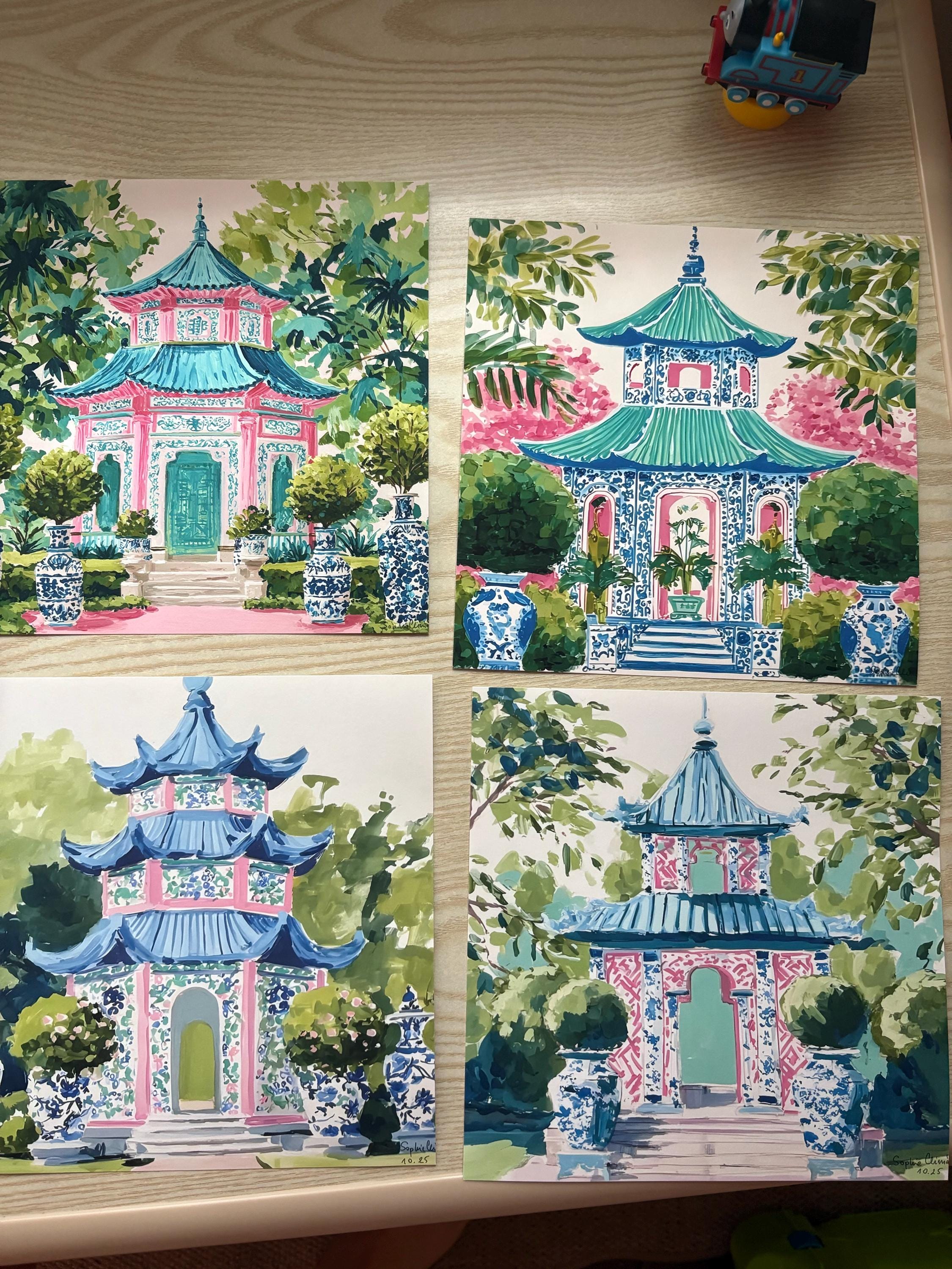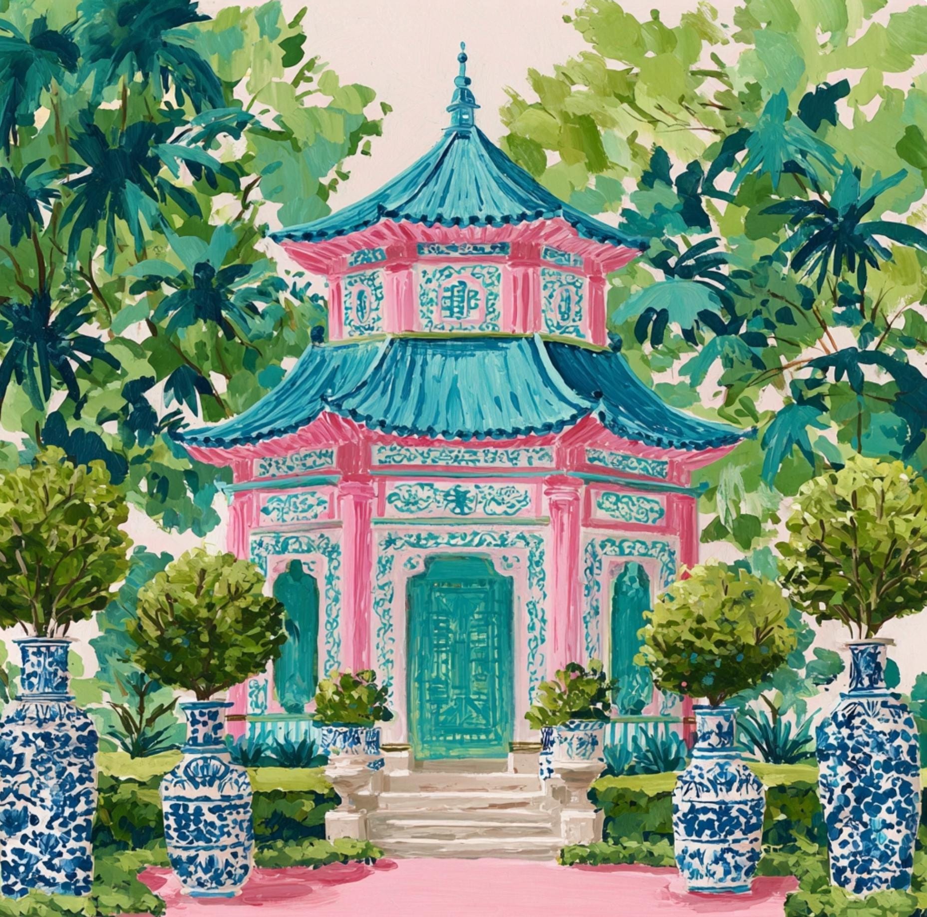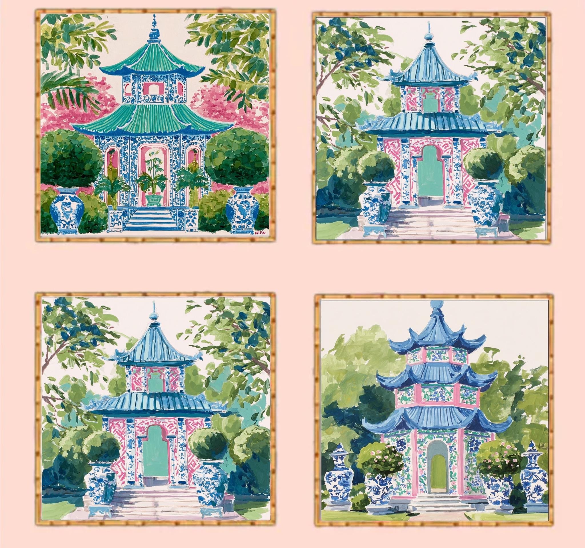 Chinoiserie pink and turquoise Pagoda Watercolor Art Prints - Set of 4