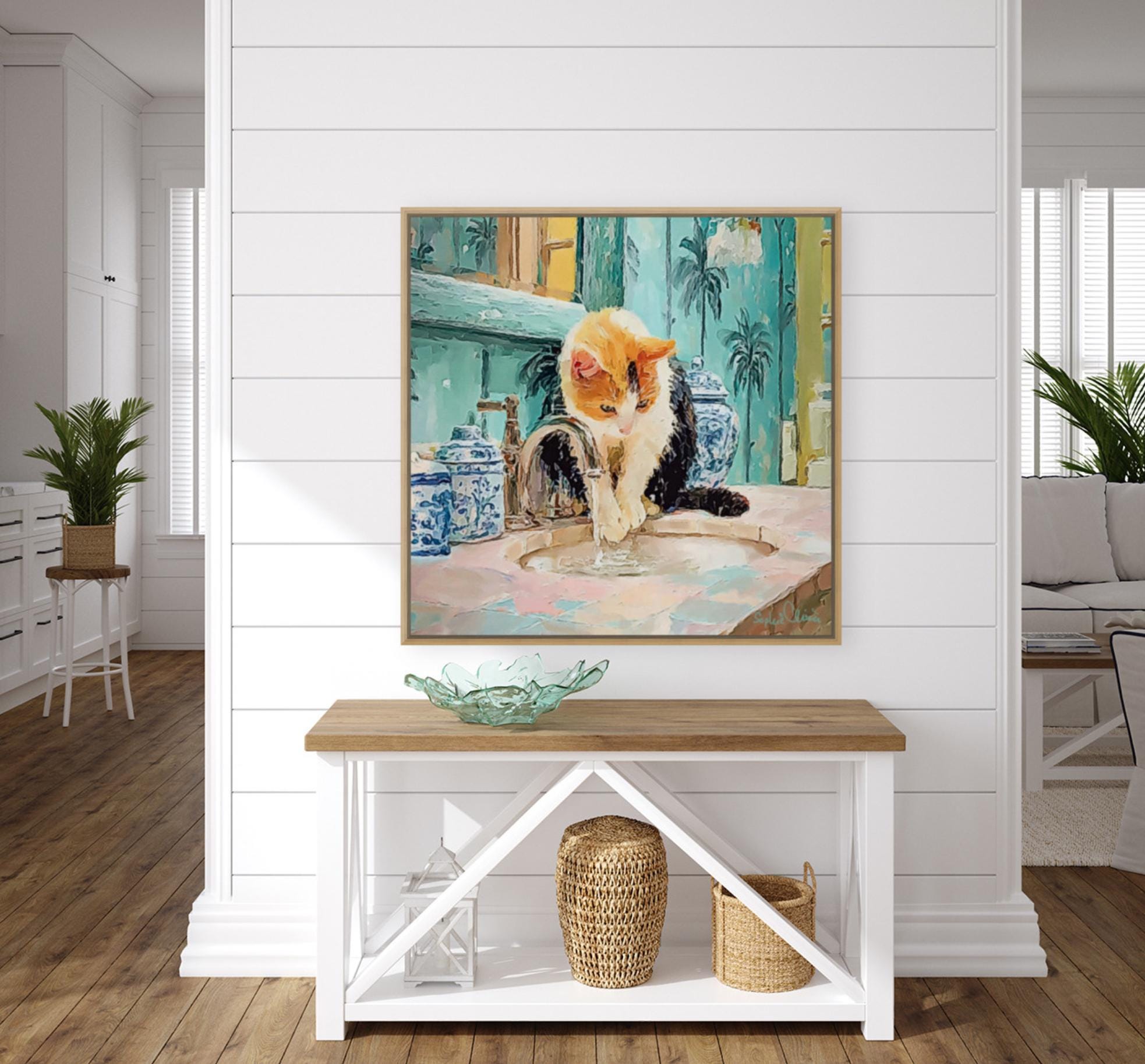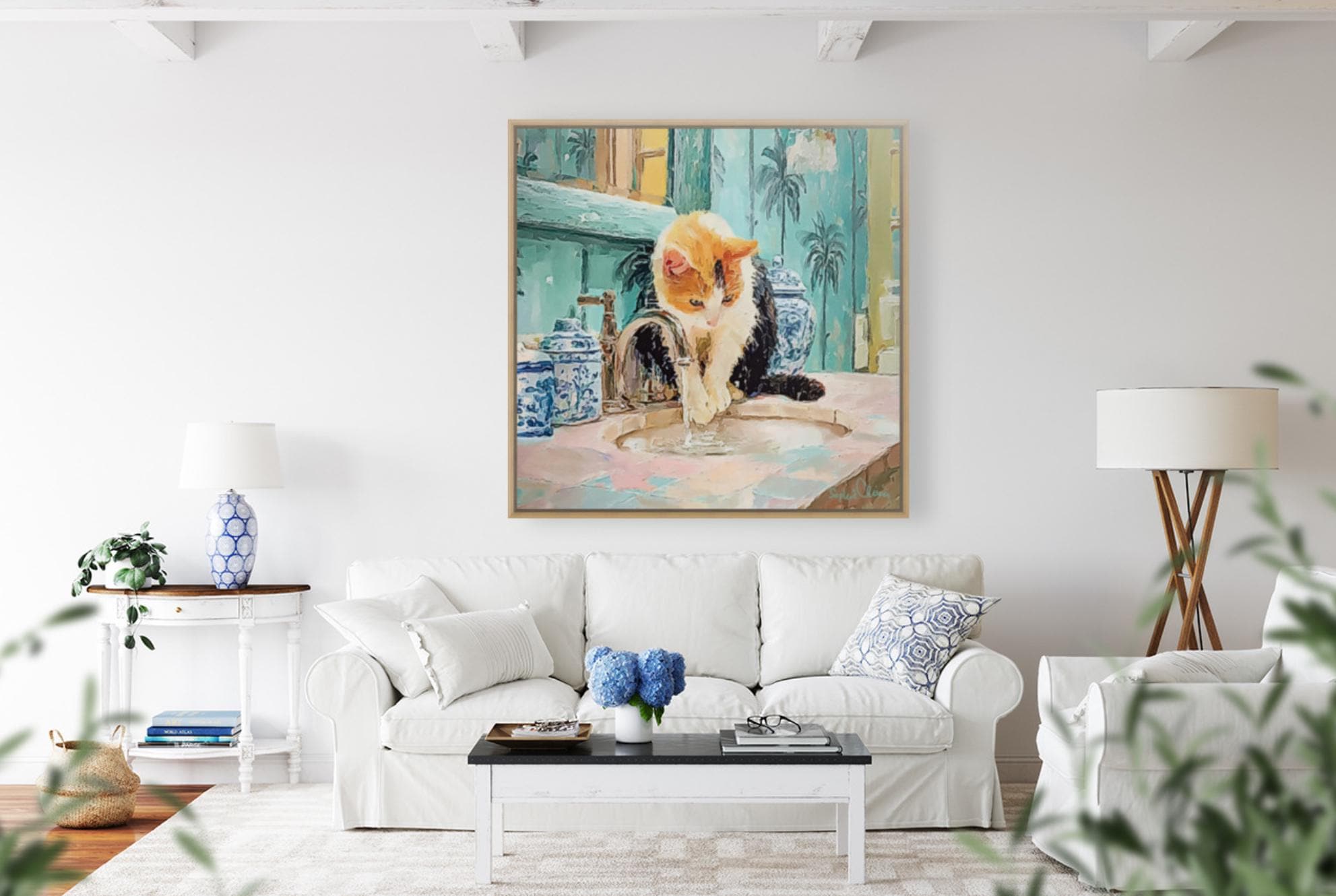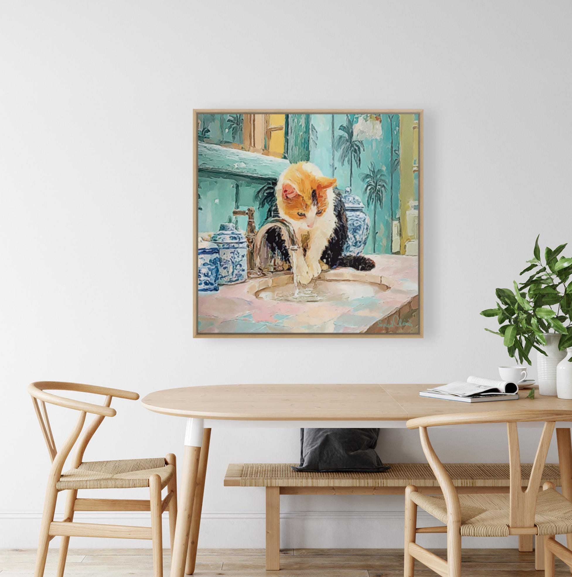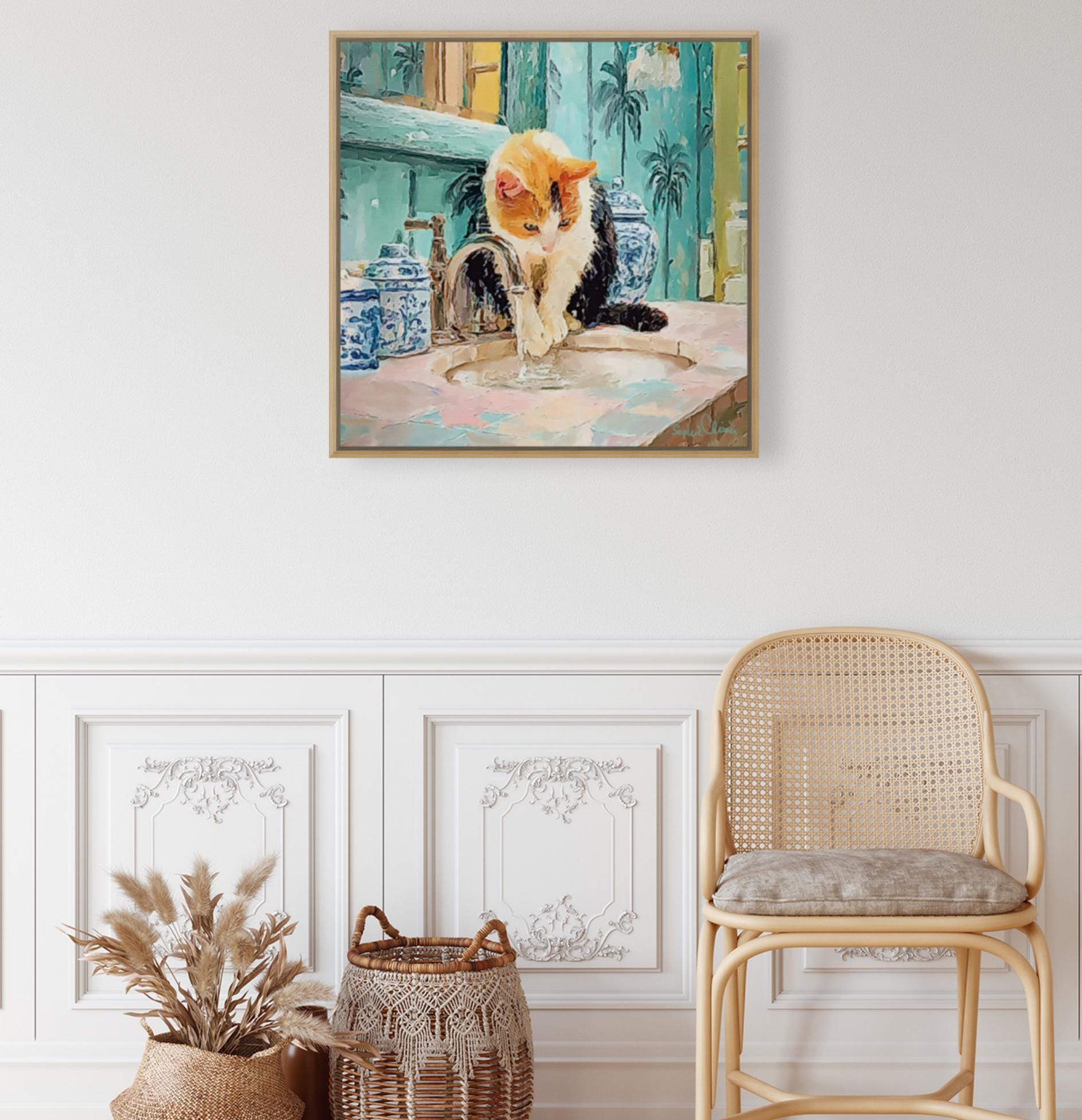 PLEASE NOTE SIZES ARE IN CM. Bring timeless charm to your home with this Grandmillennial-style cat art print, featuring a playful calico kitty fascinated by the sink in a chinoiserie-inspired bathroom. Surrounded by elegant blue-and-white ginger jars and palm wallpaper, this artwork blends classic preppy design with whimsical charm.