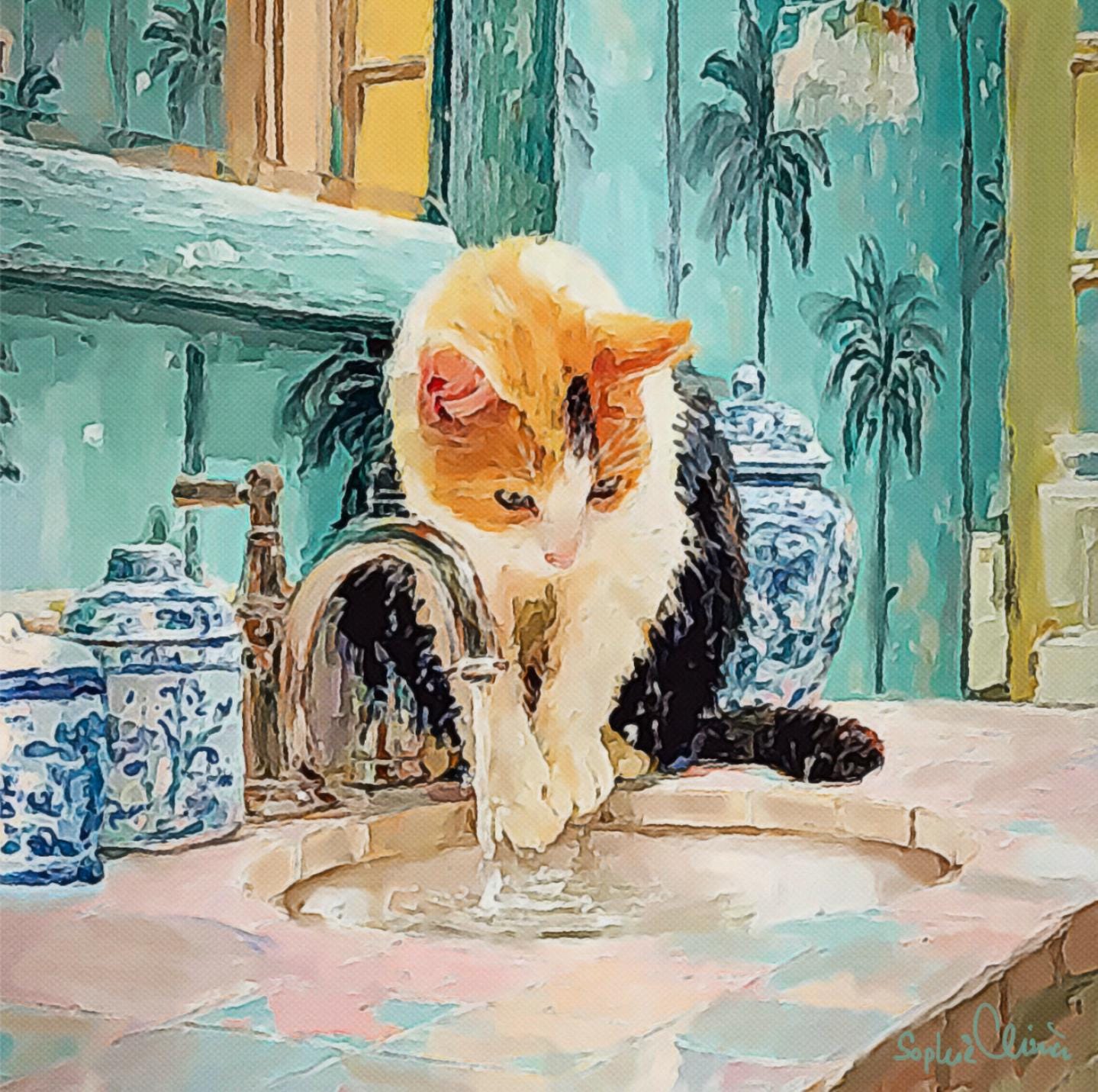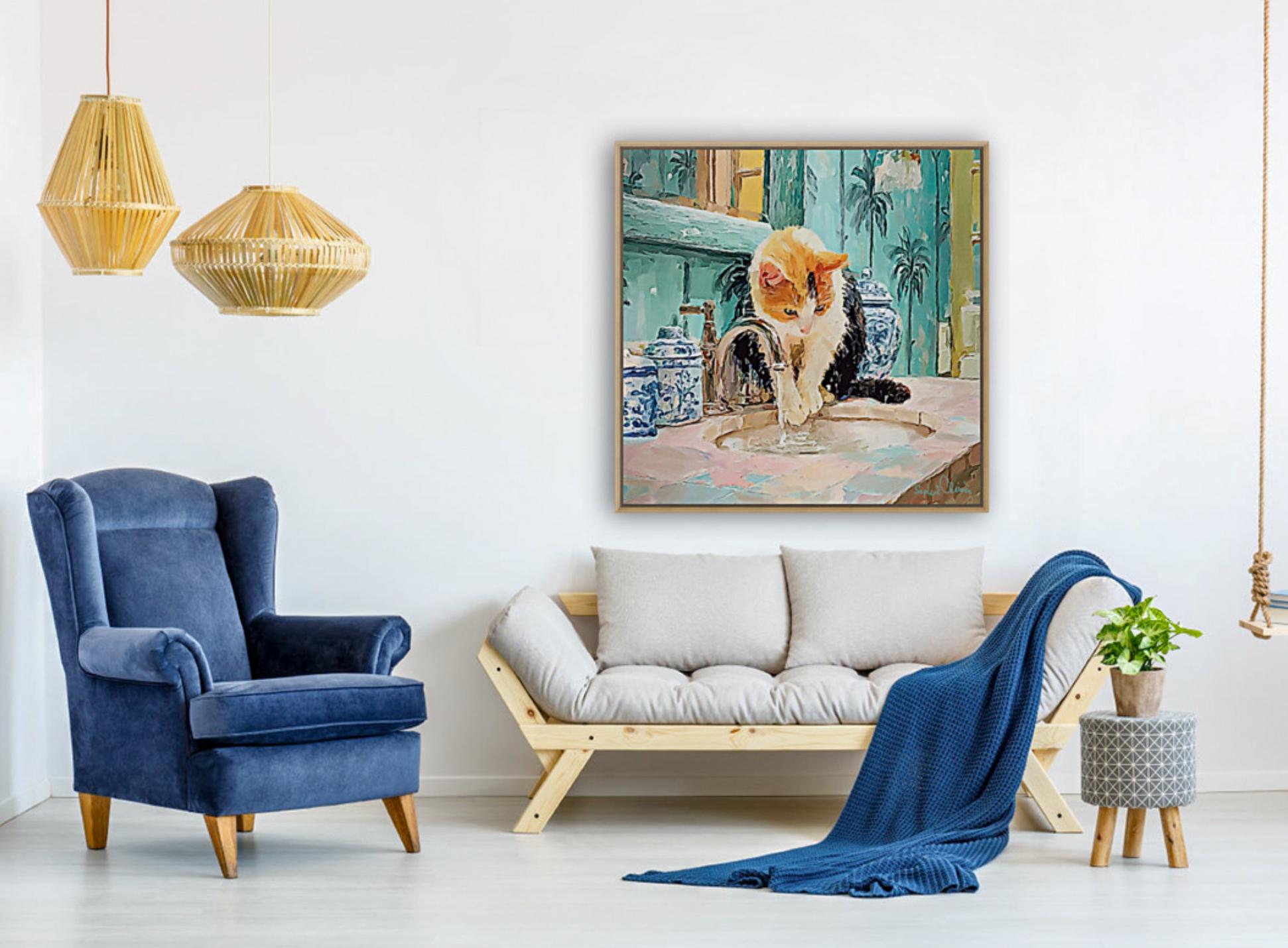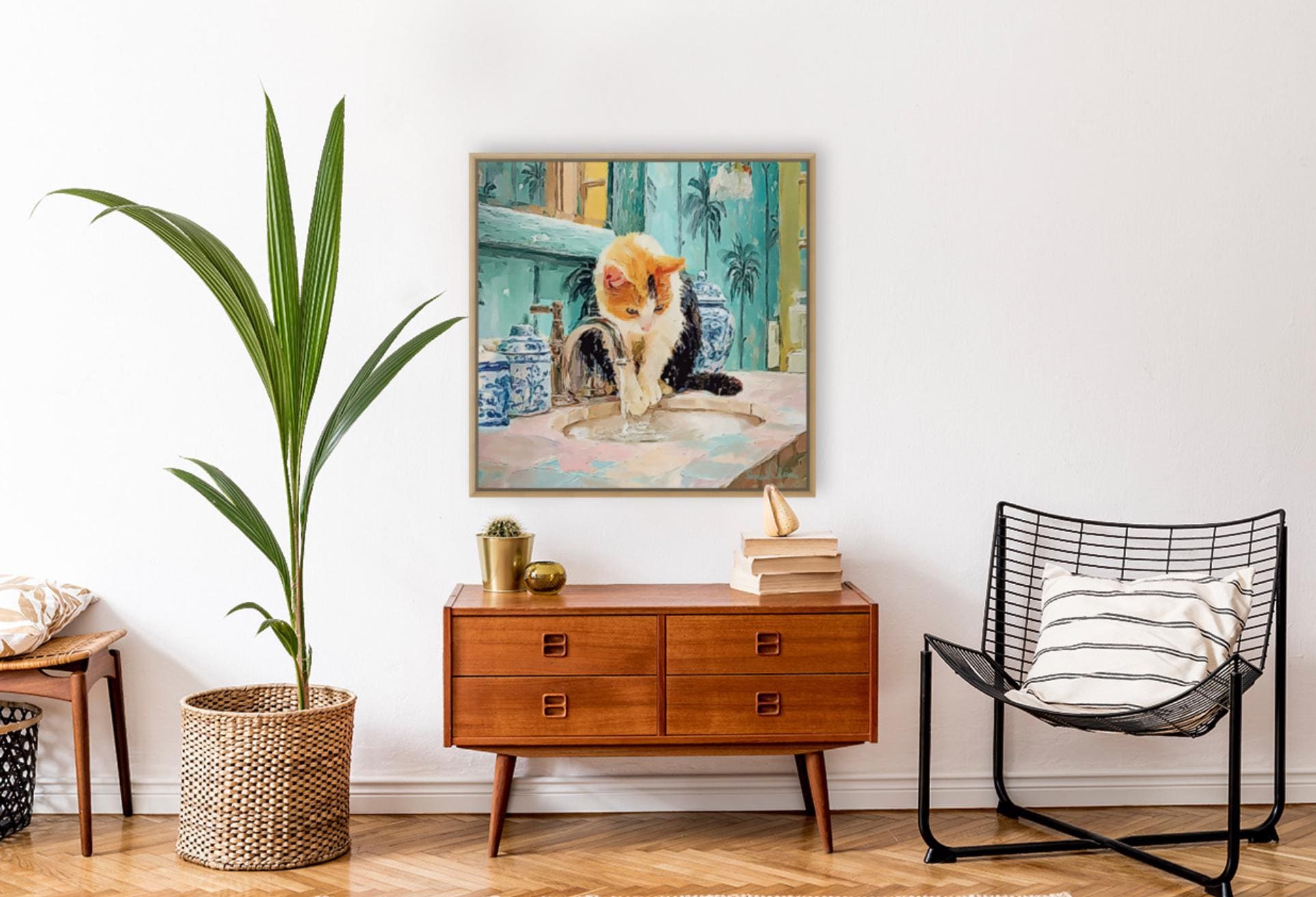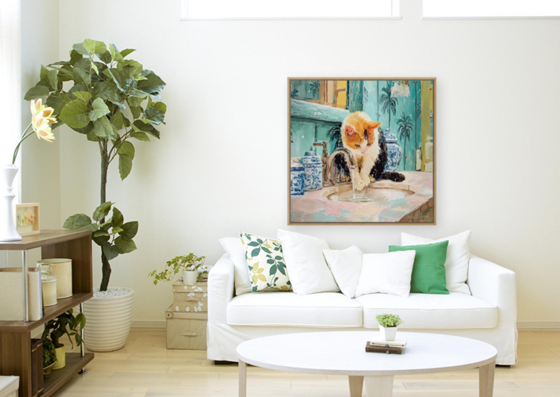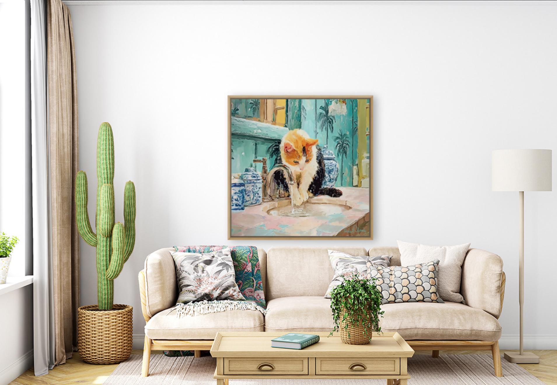 PLEASE NOTE SIZES ARE IN CM. Bring timeless charm to your home with this Grandmillennial-style cat art print, featuring a playful calico kitty fascinated by the sink in a chinoiserie-inspired bathroom. Surrounded by elegant blue-and-white ginger jars and palm wallpaper, this artwork blends classic preppy design with whimsical charm.
