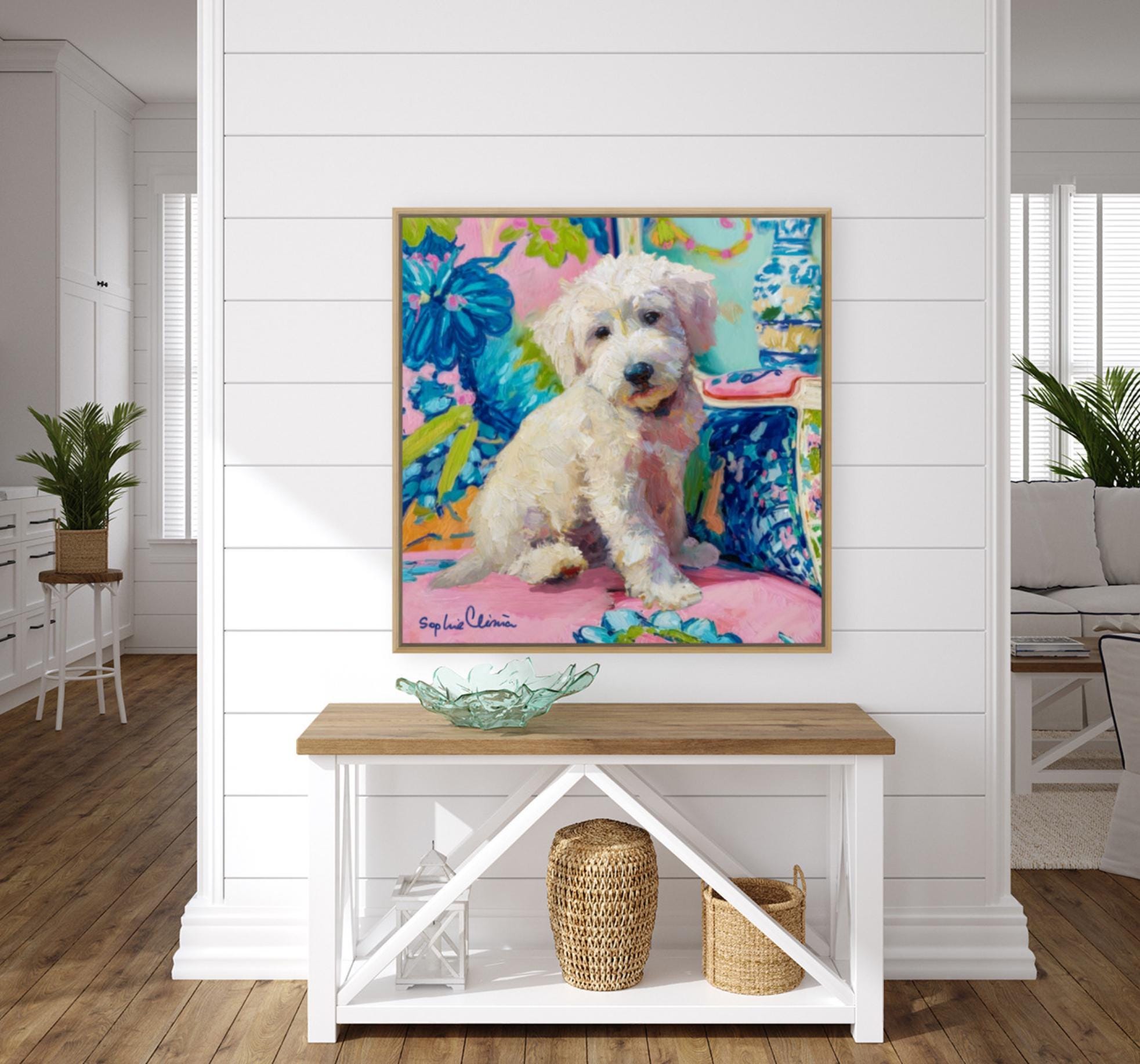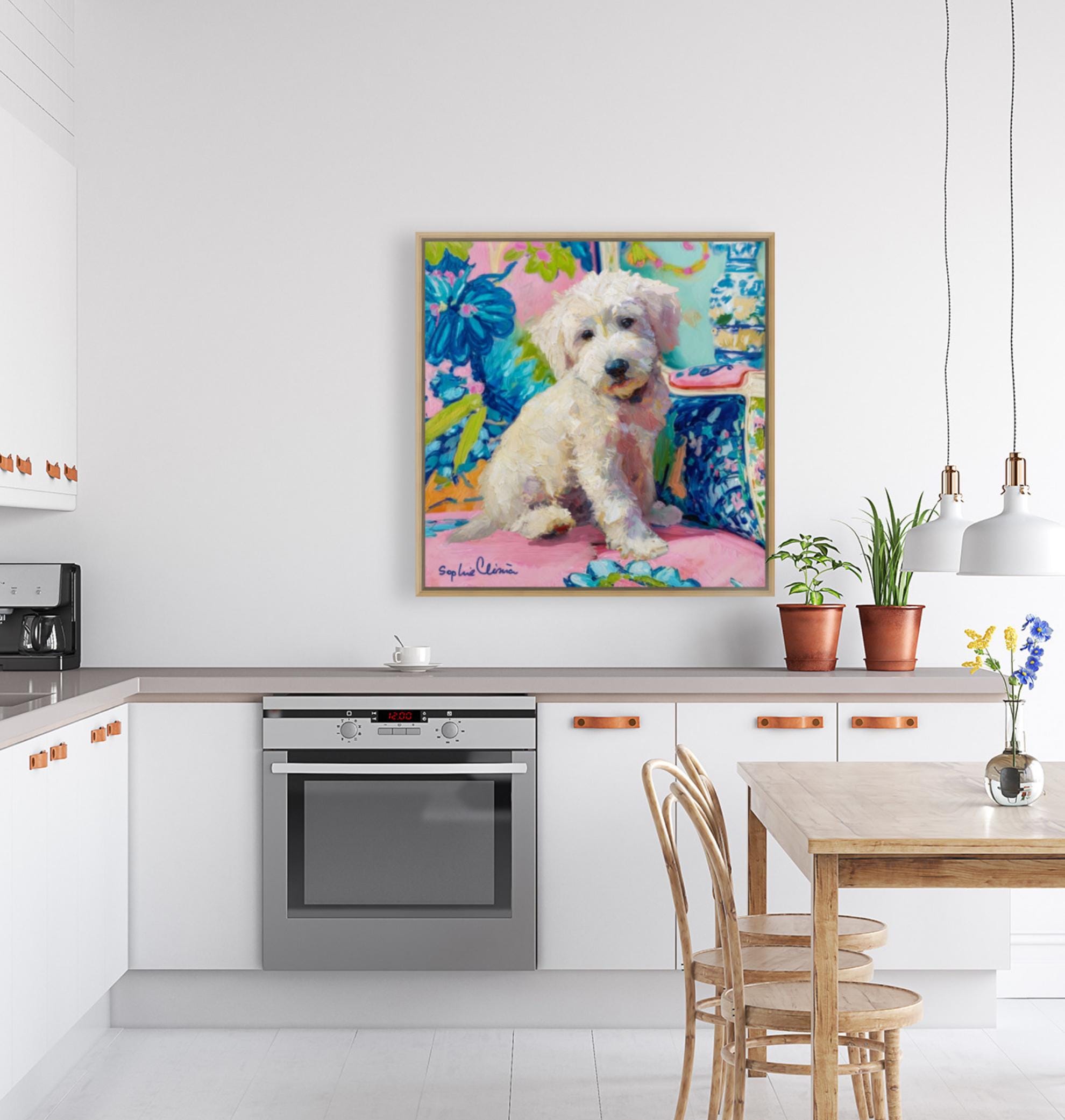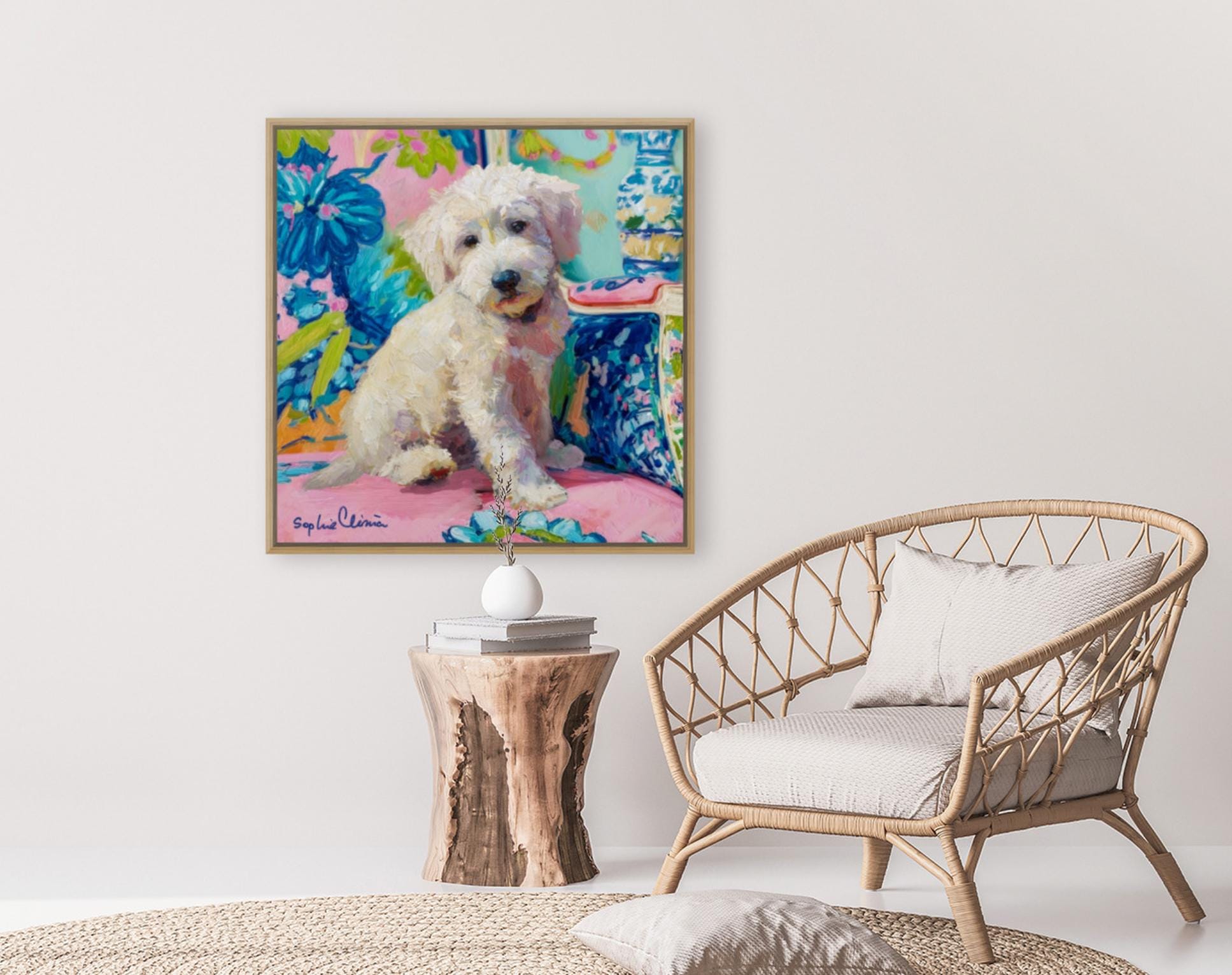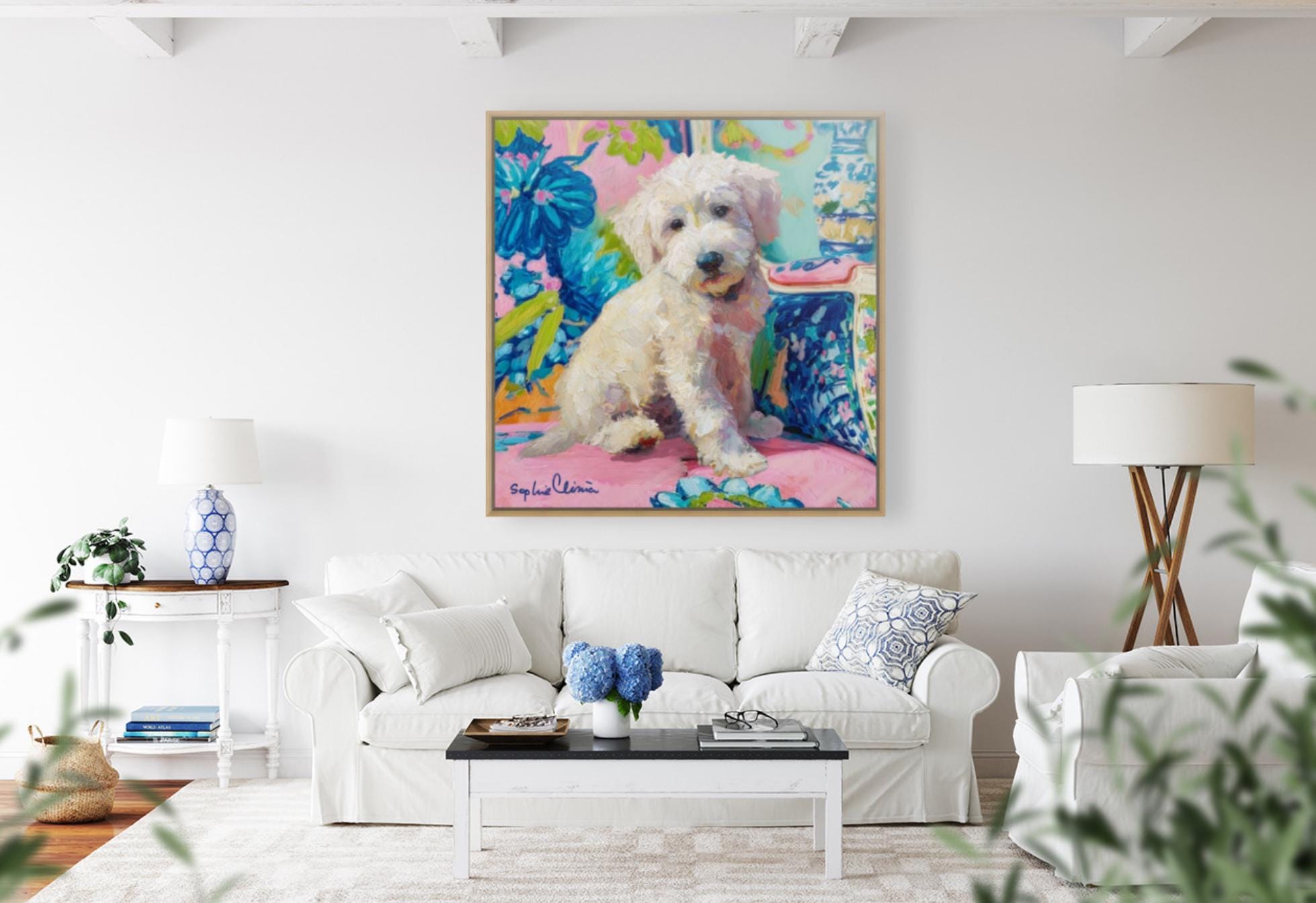 Grandmillennial art, White Labradoodle in preppy chinoiserie interior, whimsical dog art