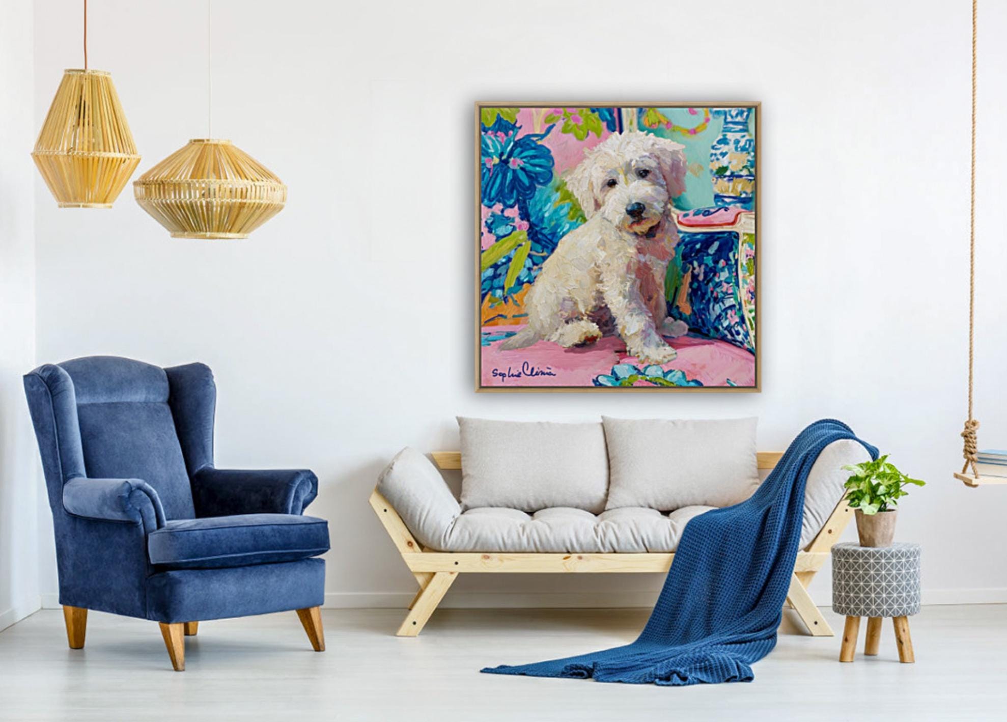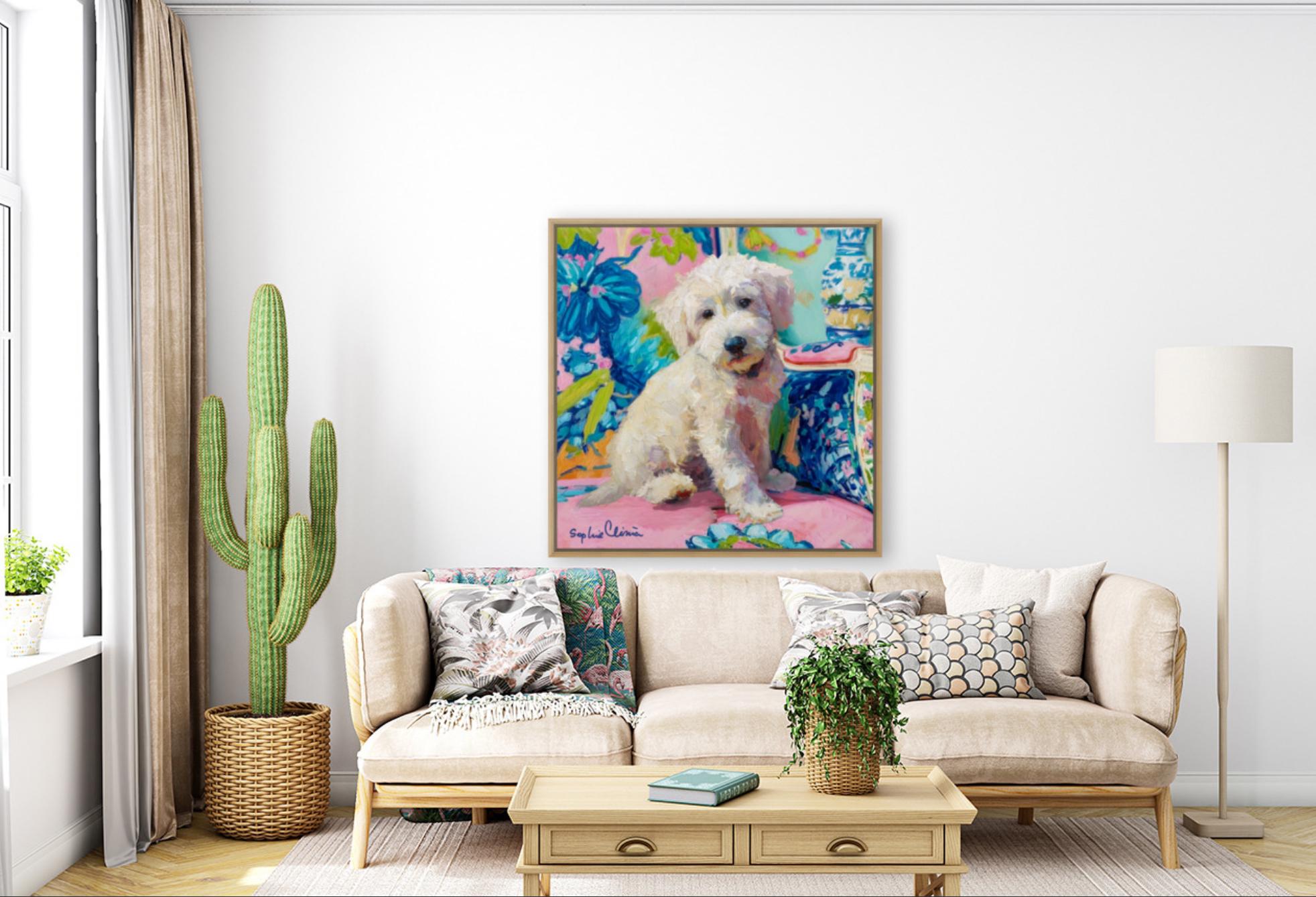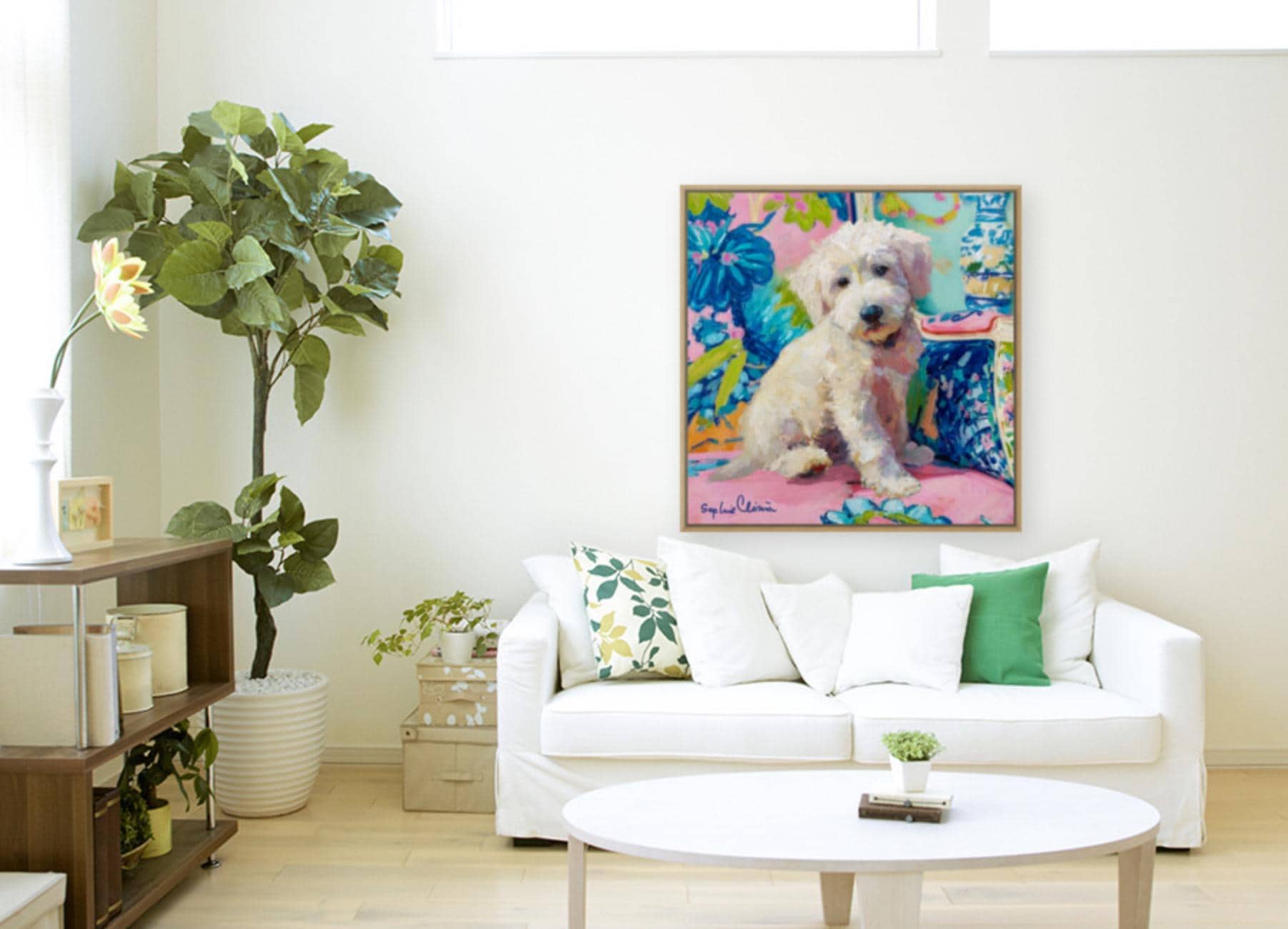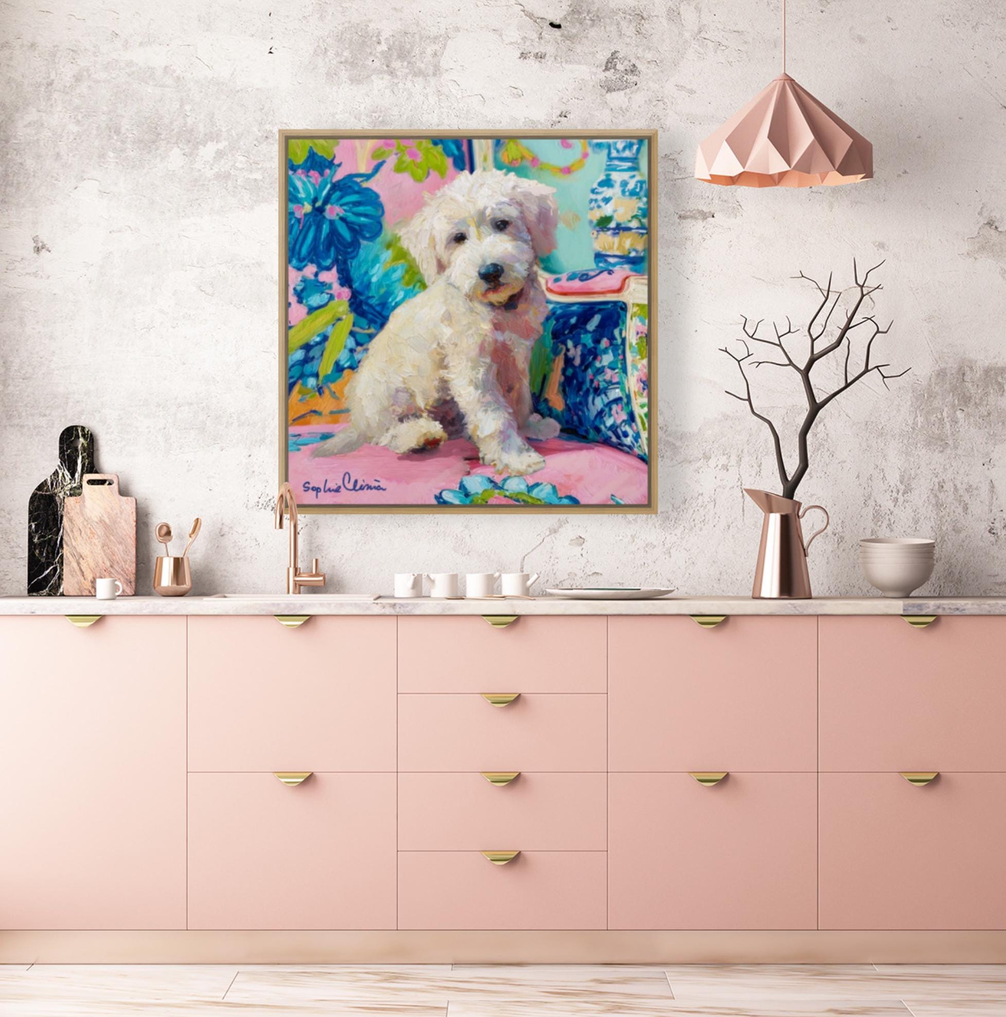 Grandmillennial art, White Labradoodle in preppy chinoiserie interior, whimsical dog art