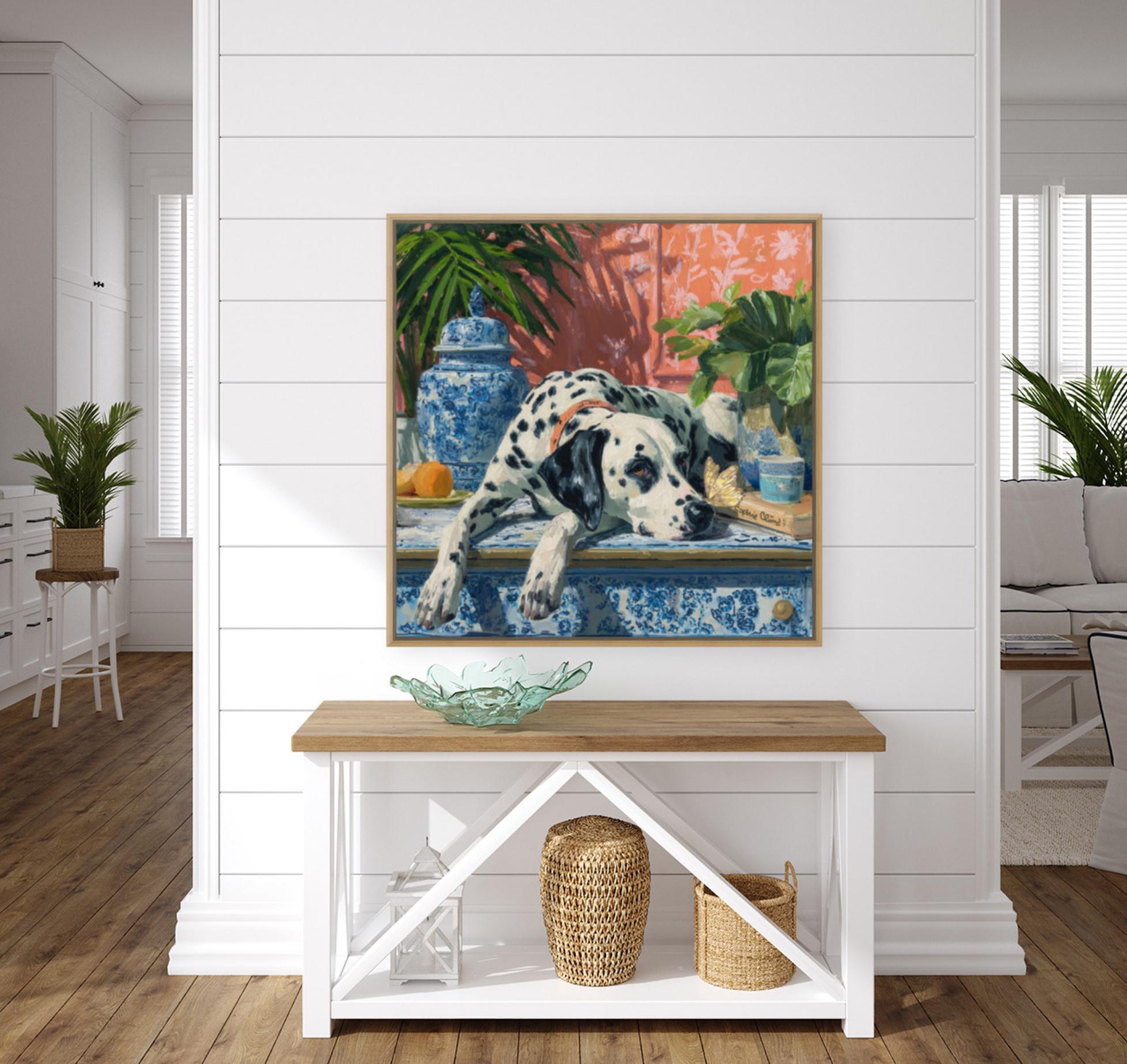 Bring timeless charm into your home with this whimsical Dalmatian dog art print, featuring a spotted pup resting among blue-and-white chinoiserie ginger jars, tropical greenery, and with a yellow  butterfly sitting on his nose. Perfect for lovers of Grandmillennial style, Palm Beach vibe interiors, and preppy dog décor, this piece blends vibrant coral, timeless blue porcelain, and playful whimsy.