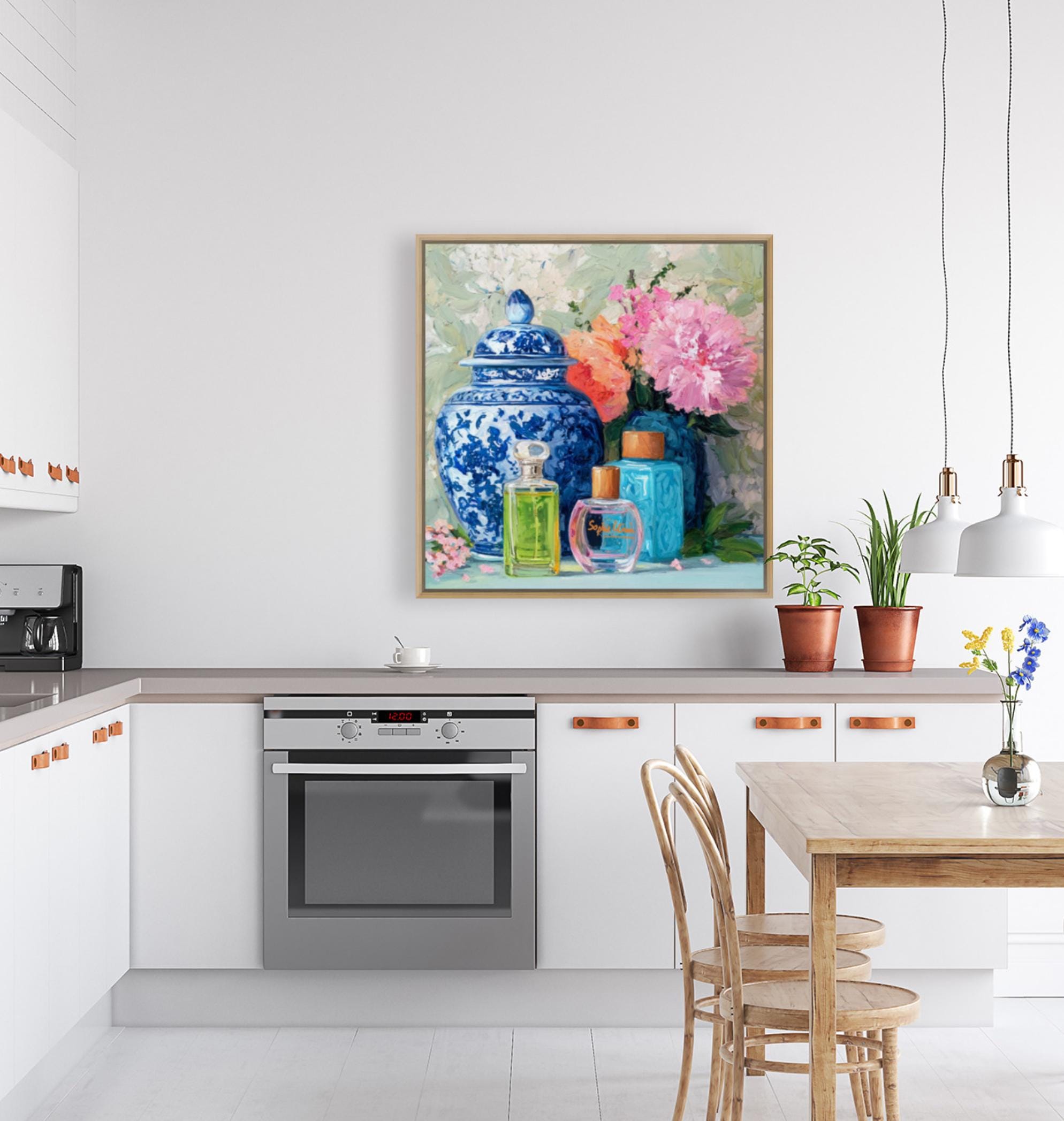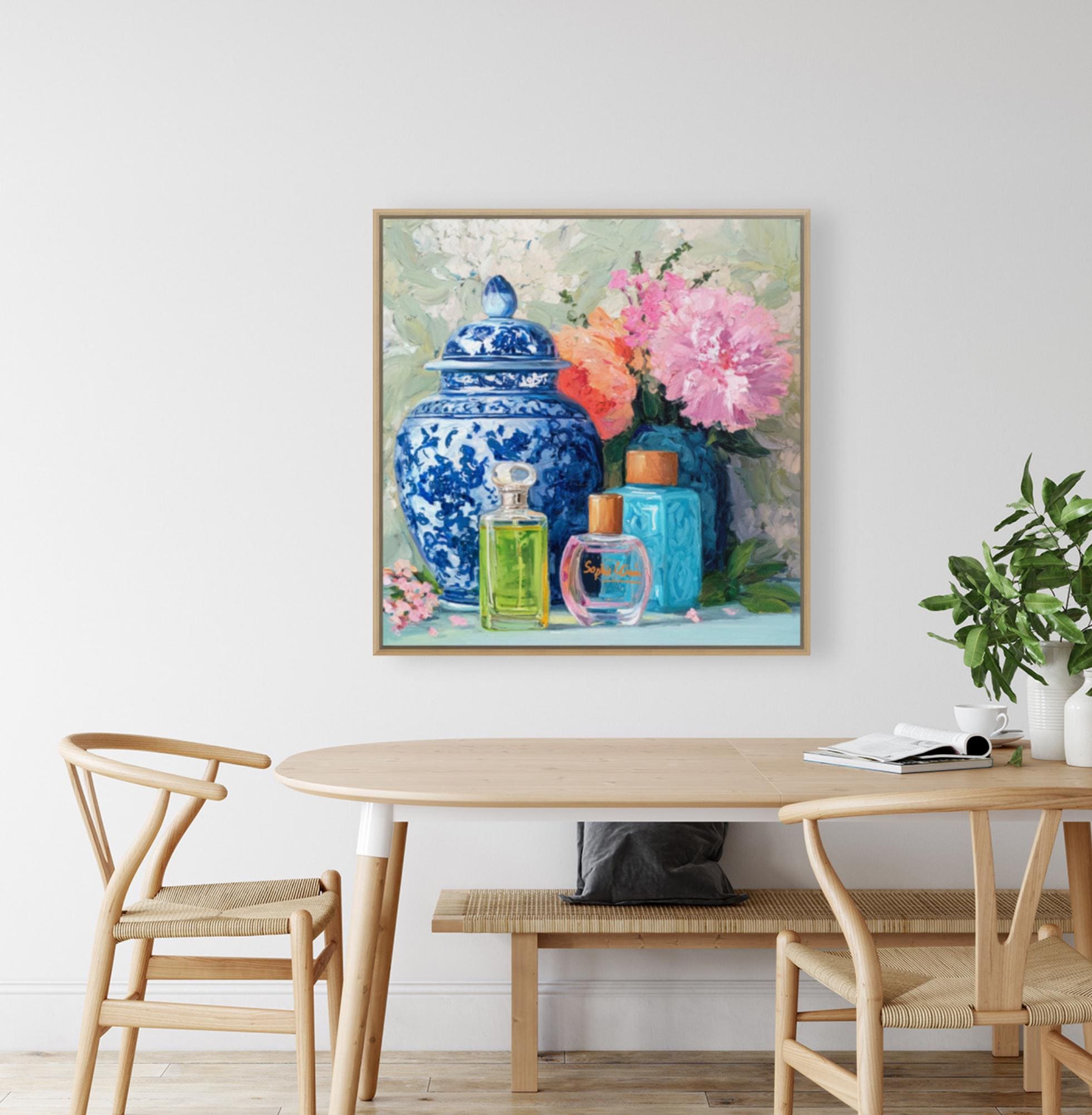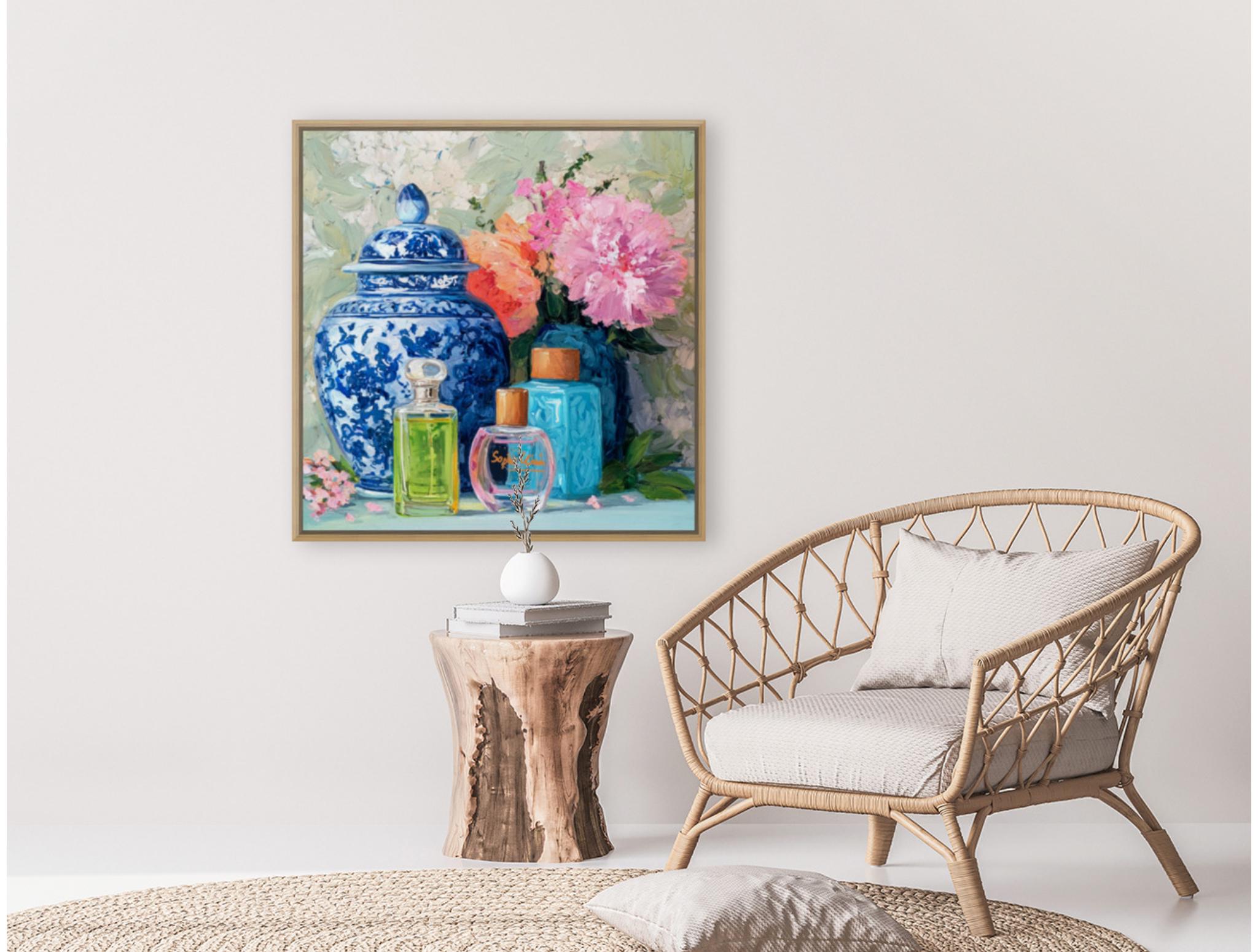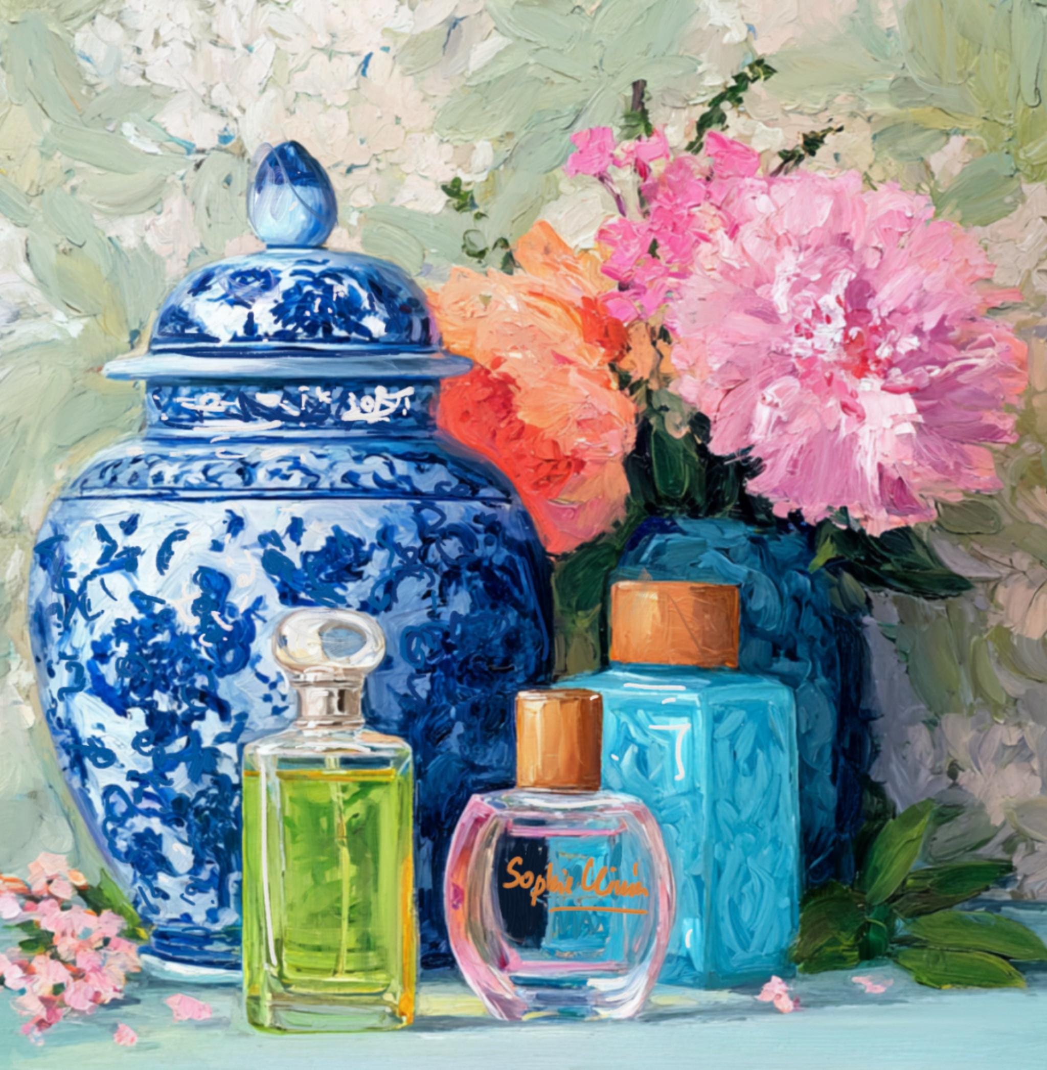Grandmillennial art, Still life with peonies in ginger jars and perfume bottles