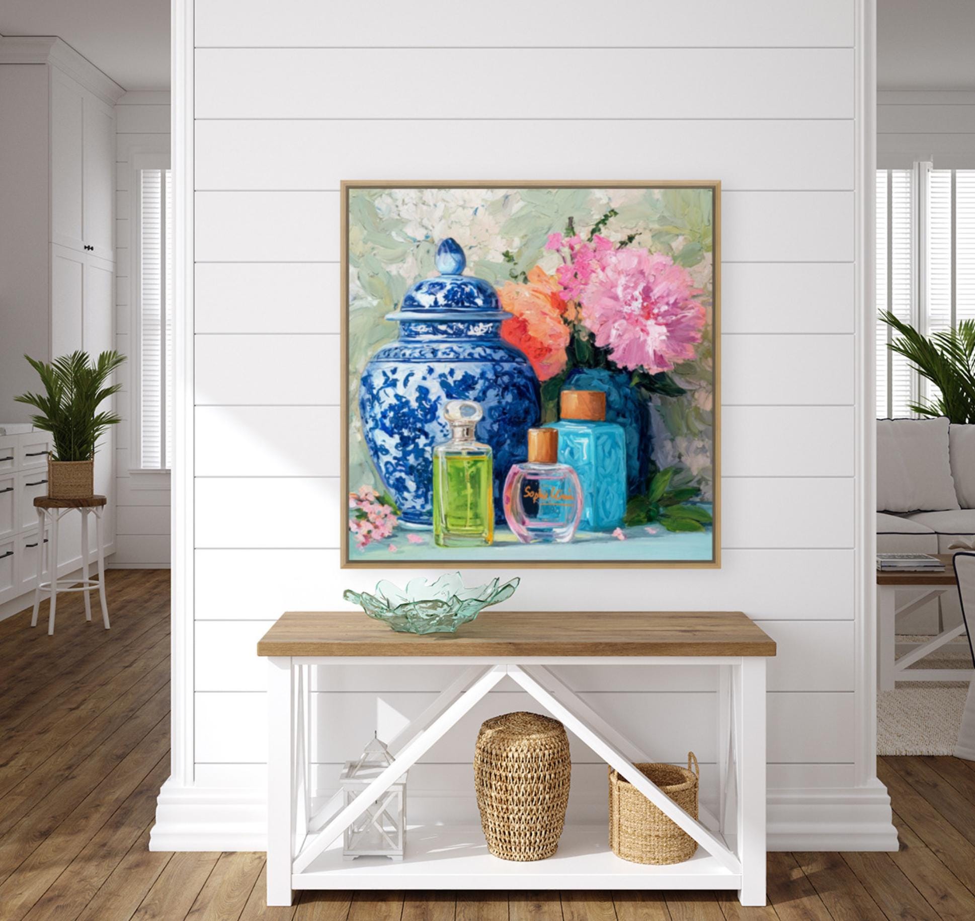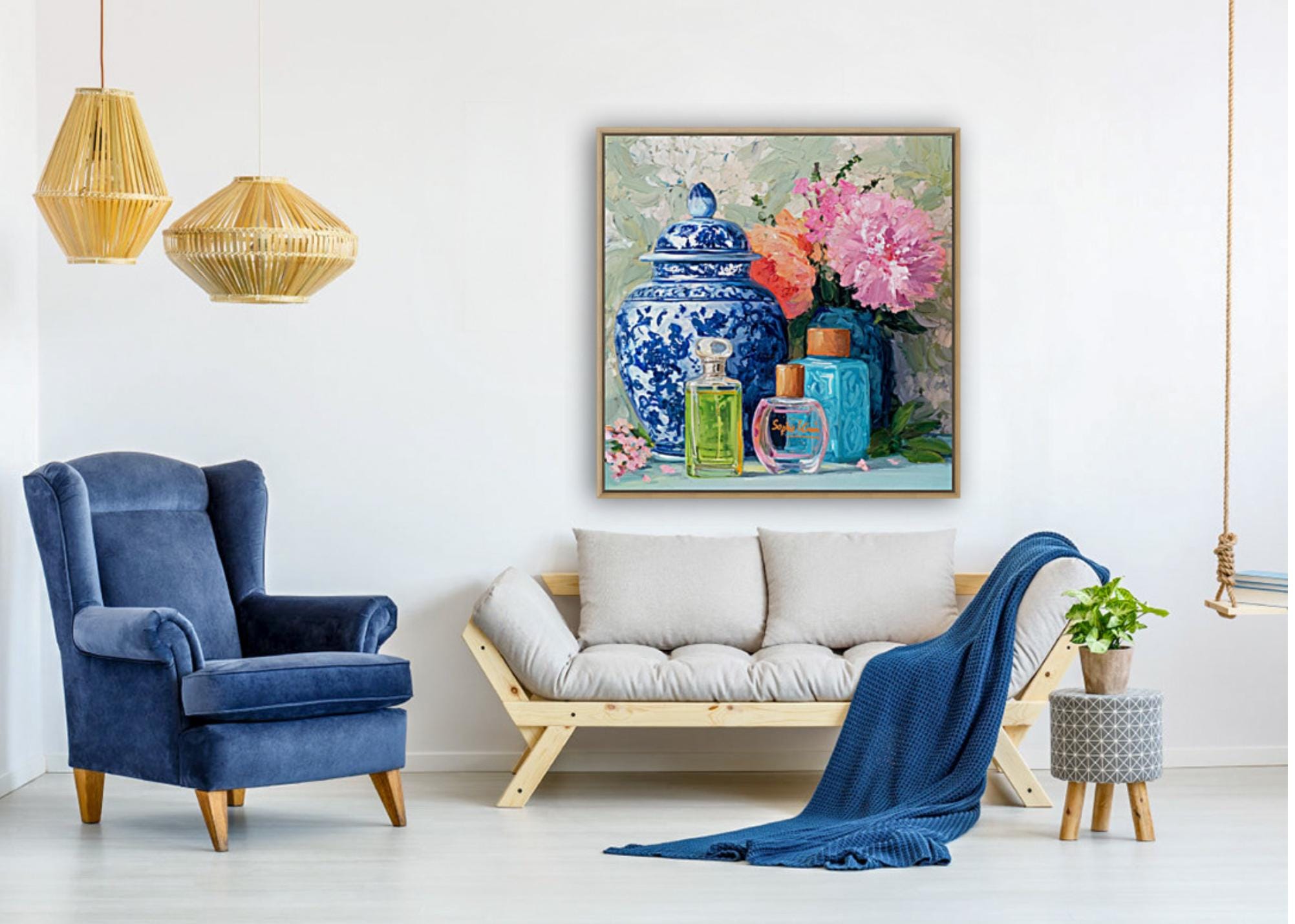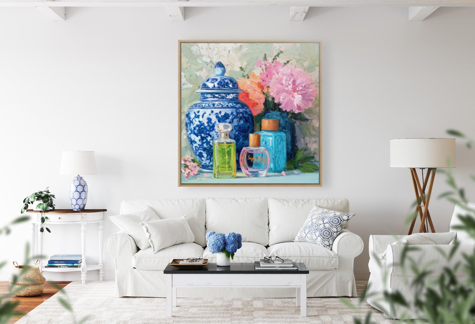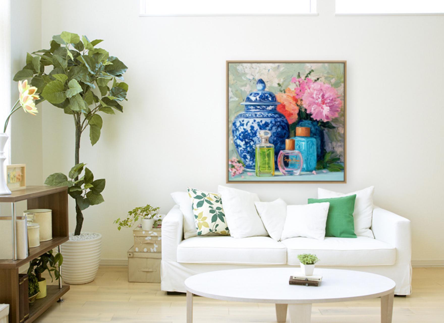 Grandmillennial art, Still life with peonies in ginger jars and perfume bottles