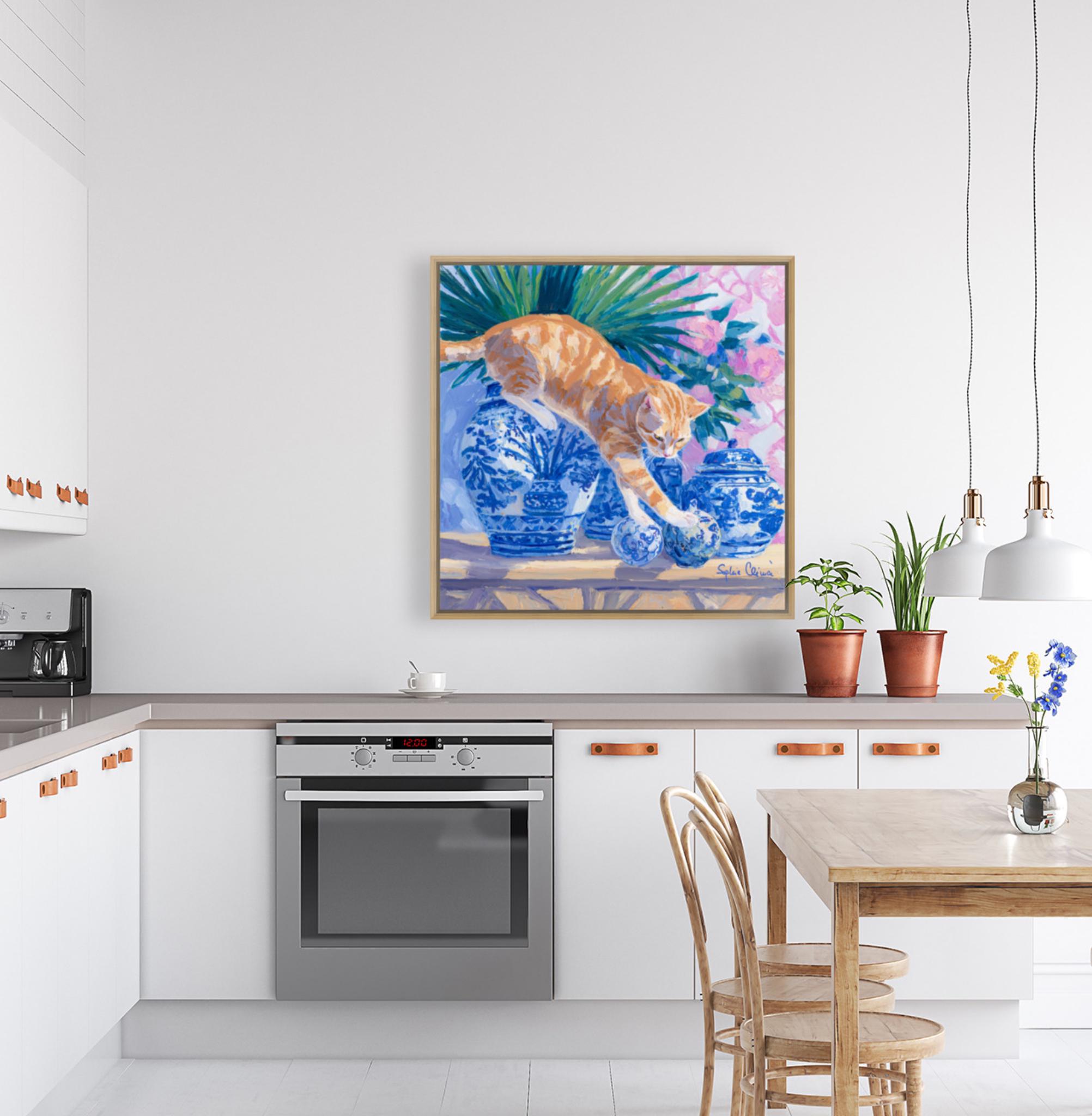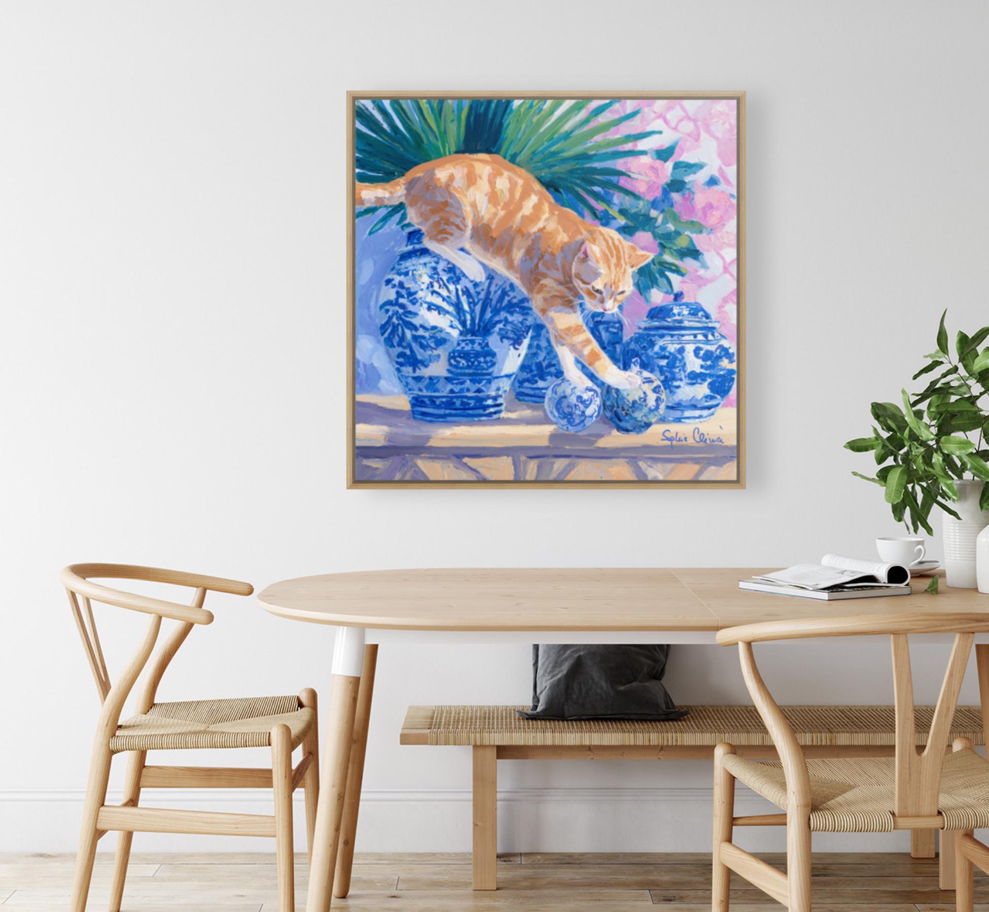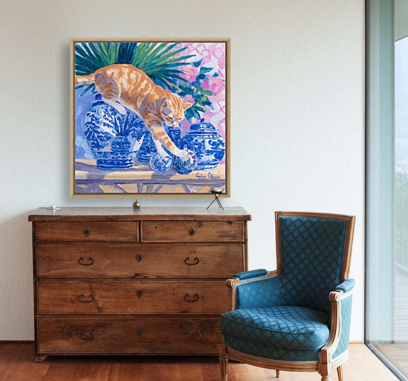 Grandmillennial art, A Risky Move, Whimsical Ginger Cat and chinoiserie vases art