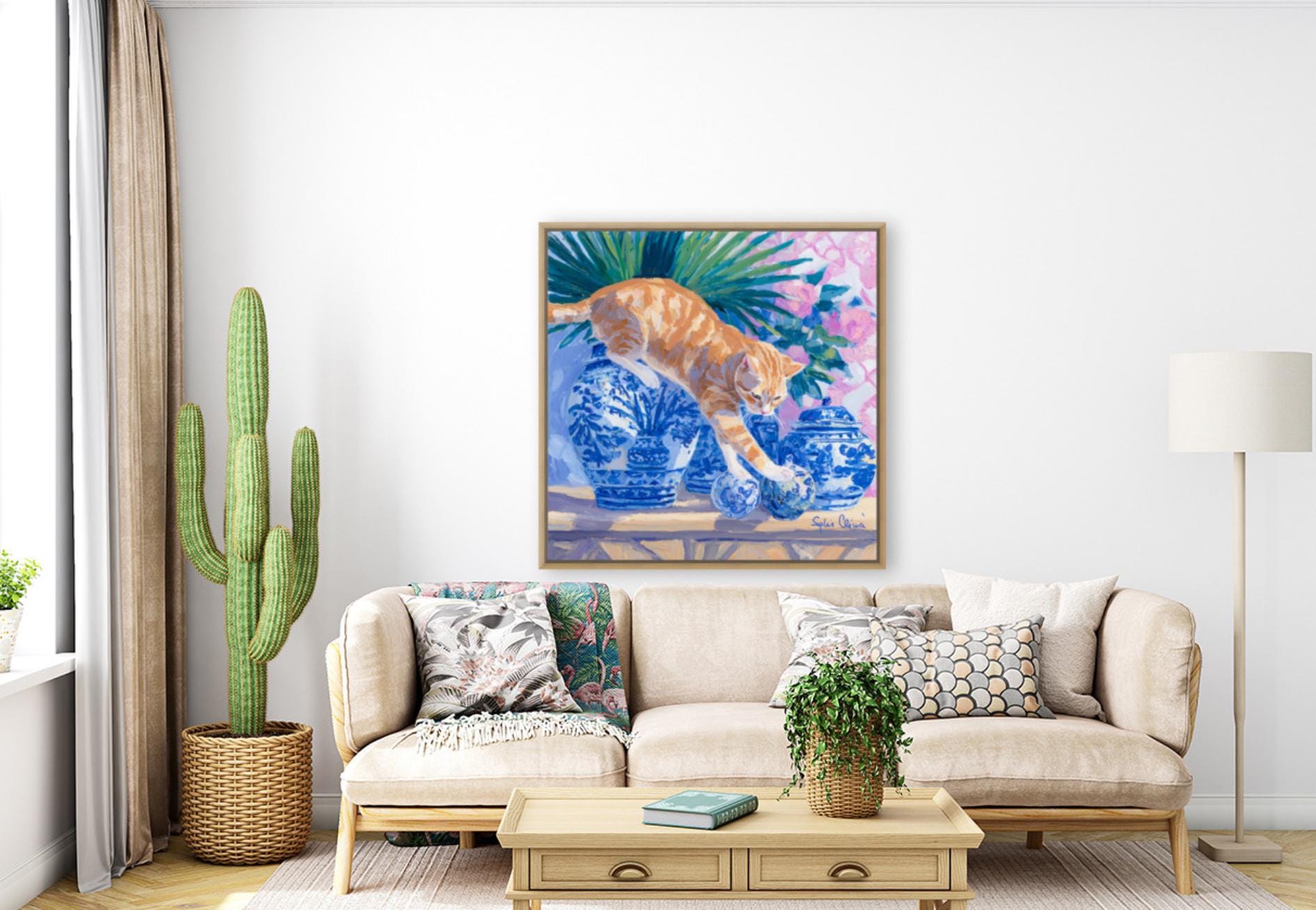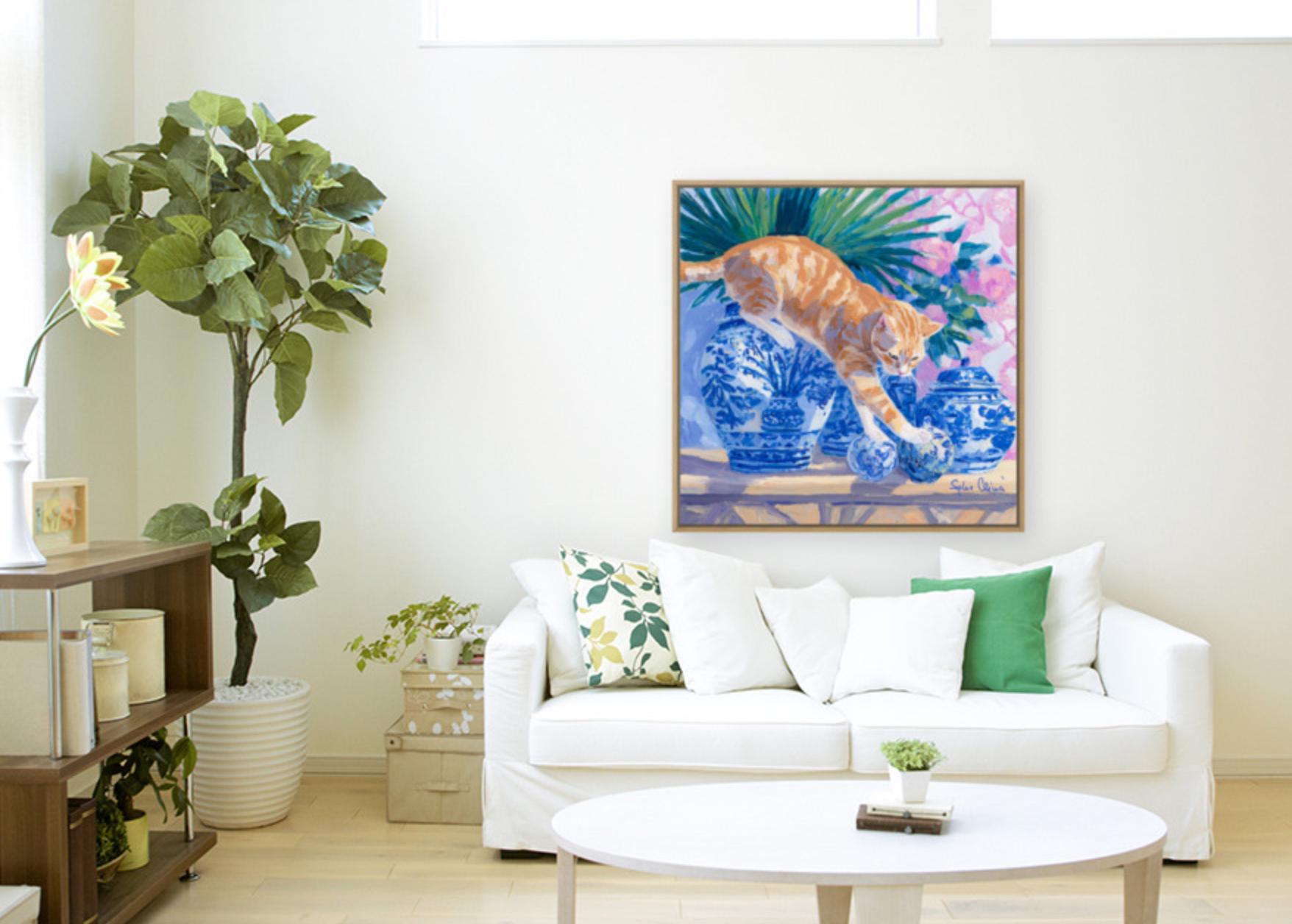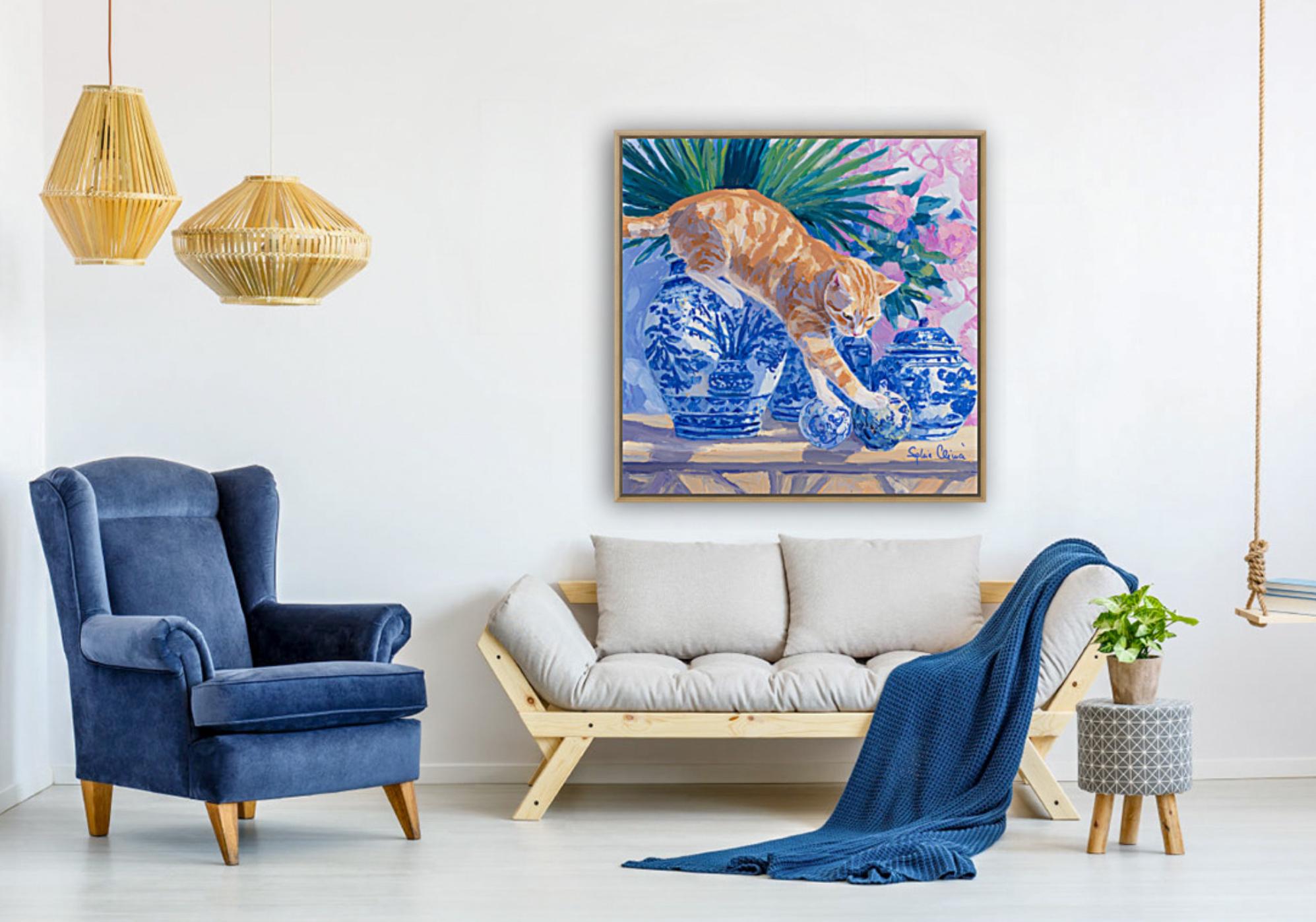 Grandmillennial art, A Risky Move, Whimsical Ginger Cat and chinoiserie vases art