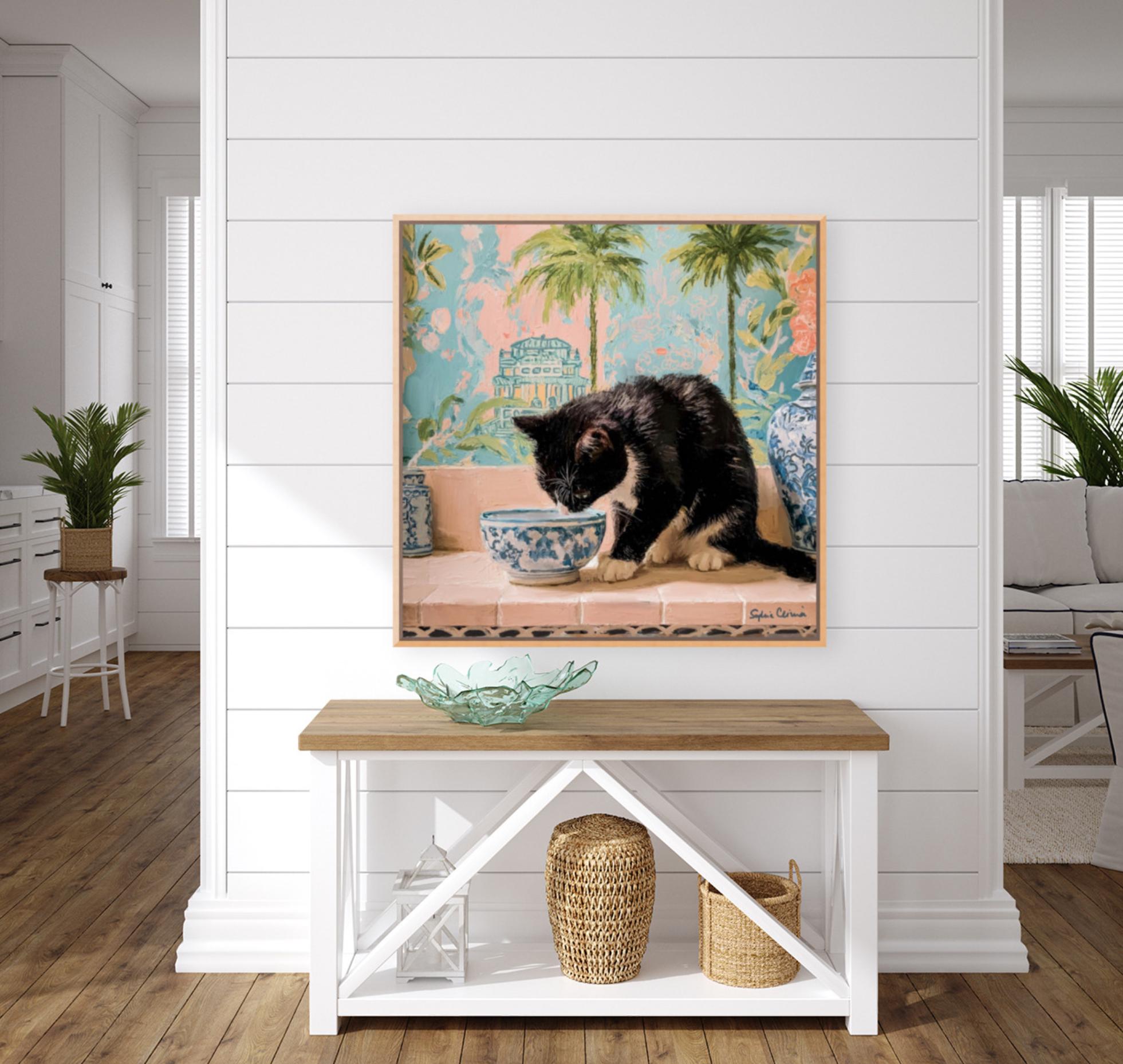 Bring timeless Palm Beach charm to your home with this preppy cat tea art print. A black-and-white kitten lounges beside a vintage floral teacup, surrounded by vibrant chinoiserie blooms. This piece blends grandmillennial elegance with whimsical warmth—perfect for cat lovers, tea lovers, or anyone who adores cheerful interiors.