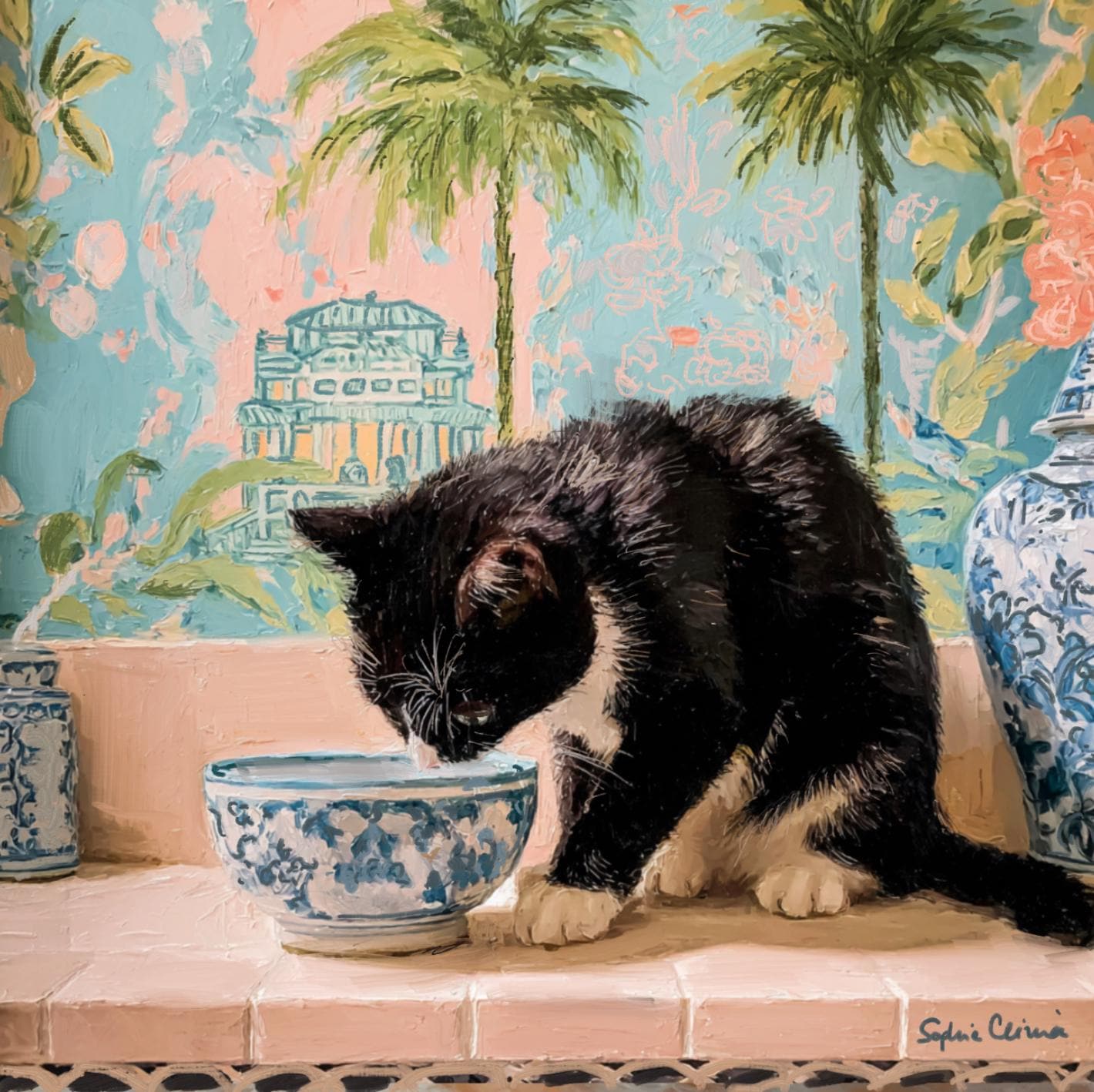 Unique cat + chinoiserie tea theme (rare in art prints).
