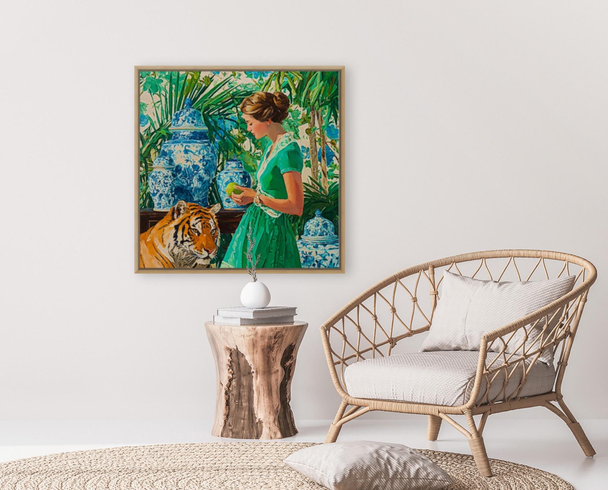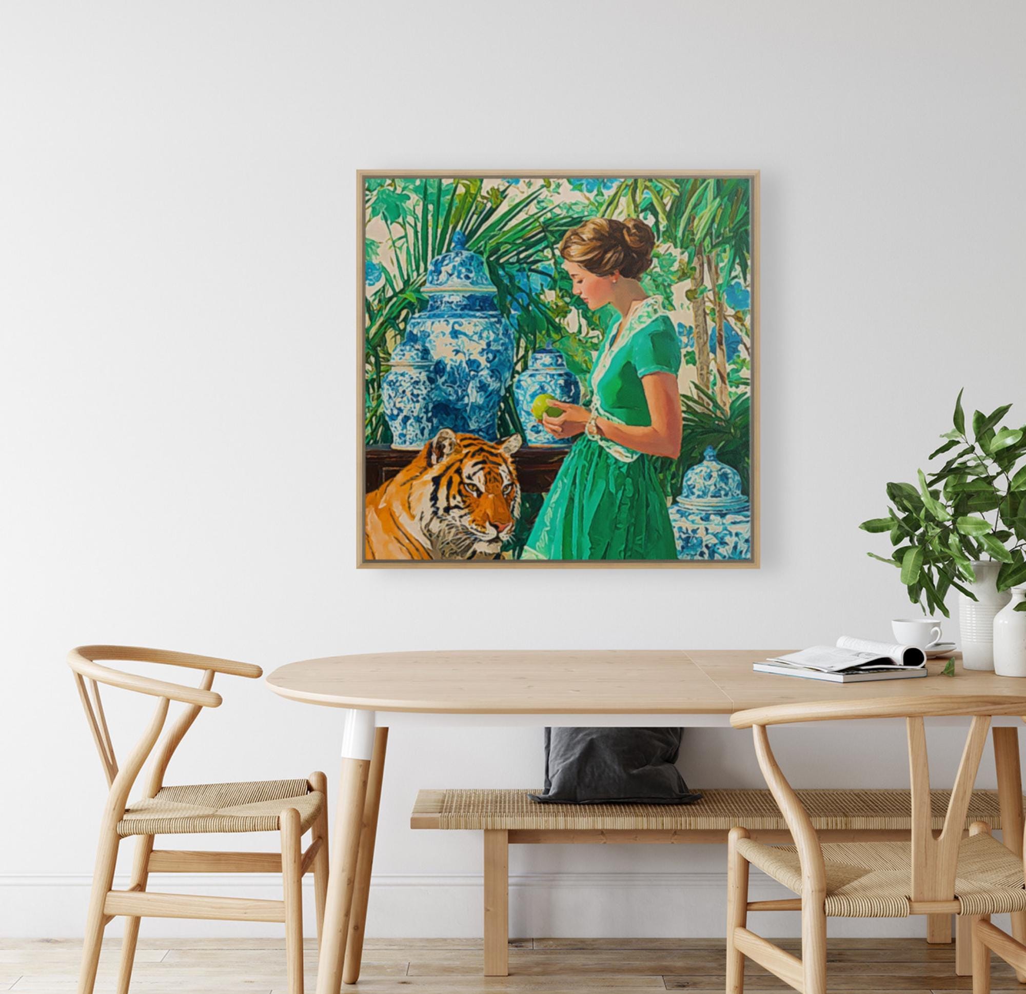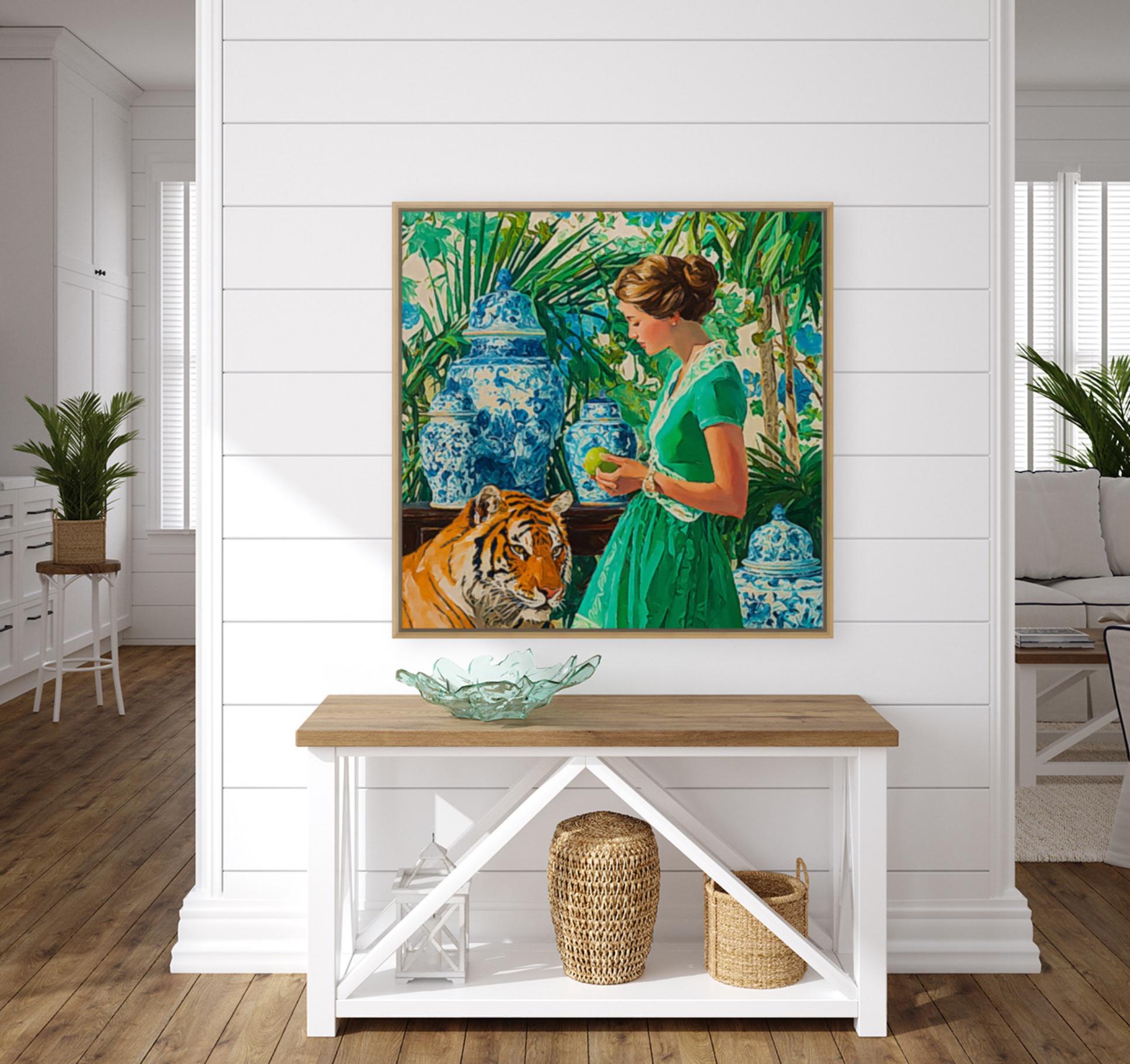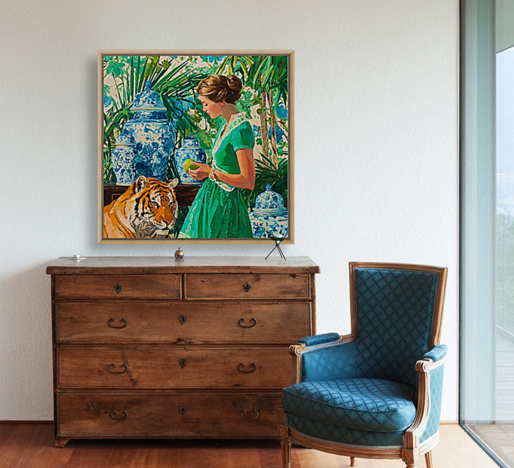 Grandmillennial art, Girl and tiger in green chinoiserie interior, whimsical fine art