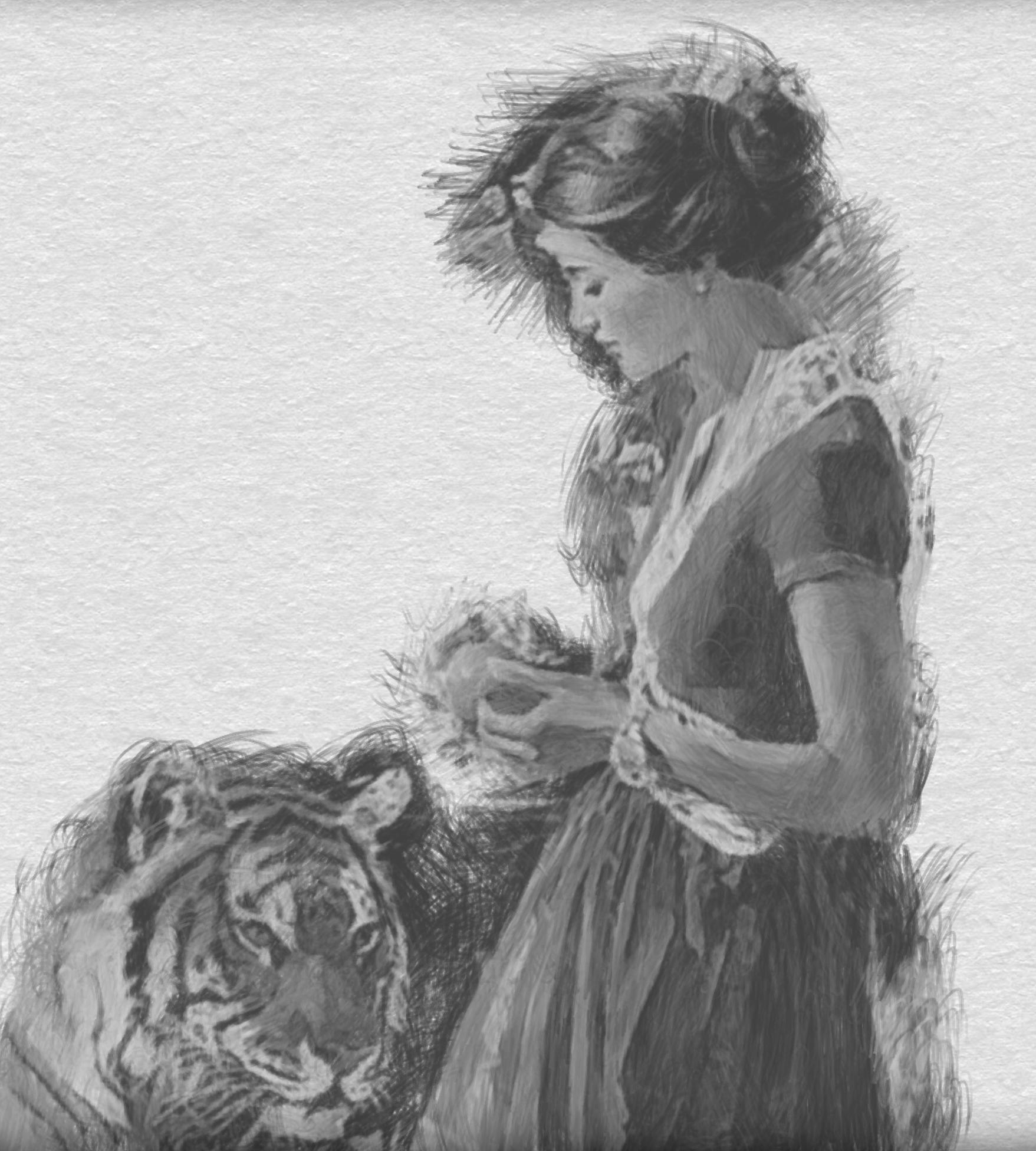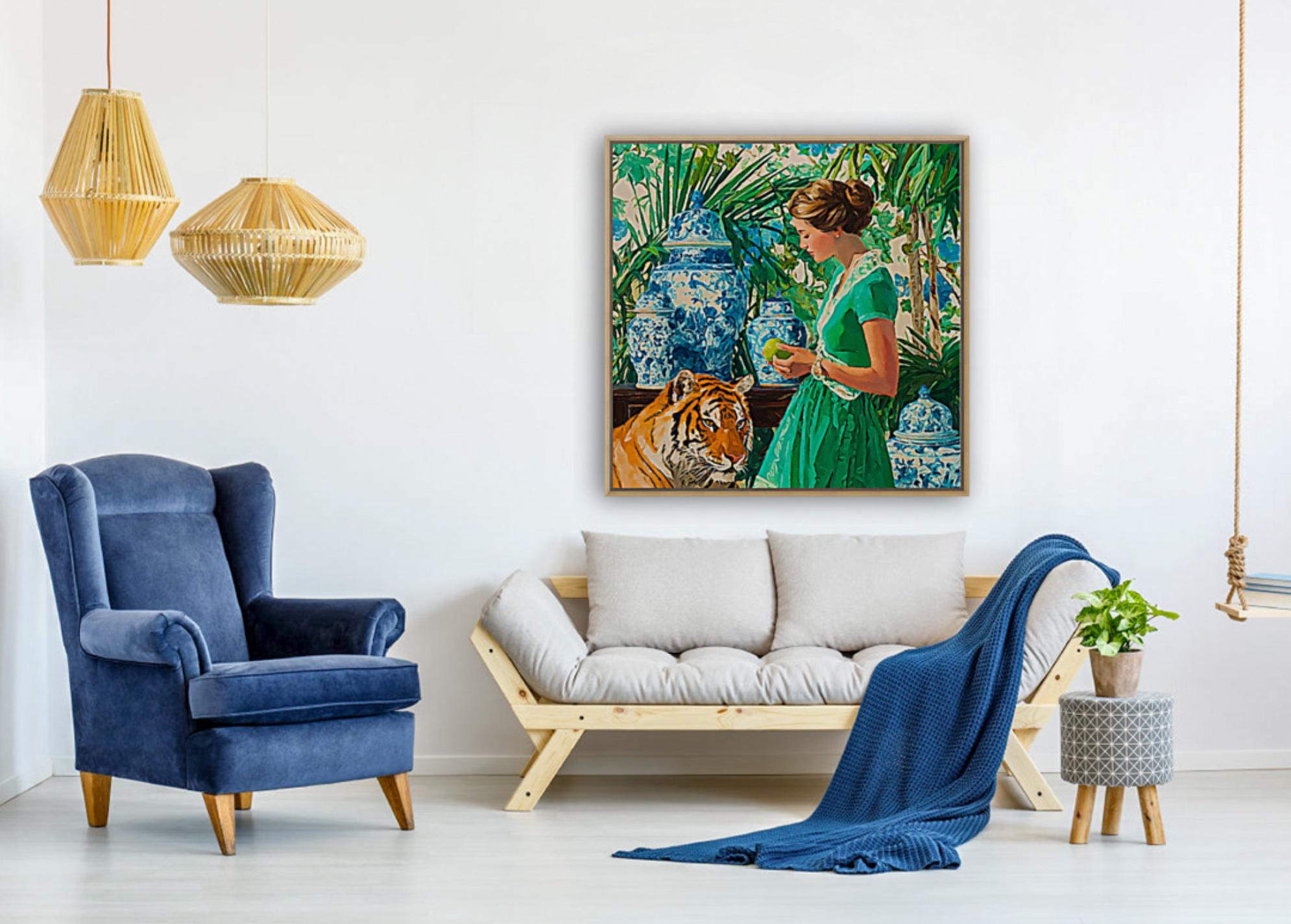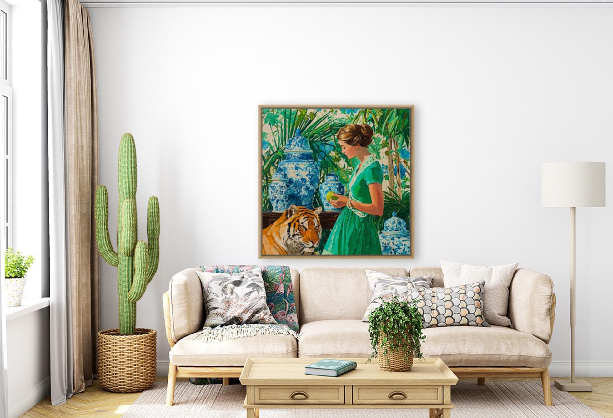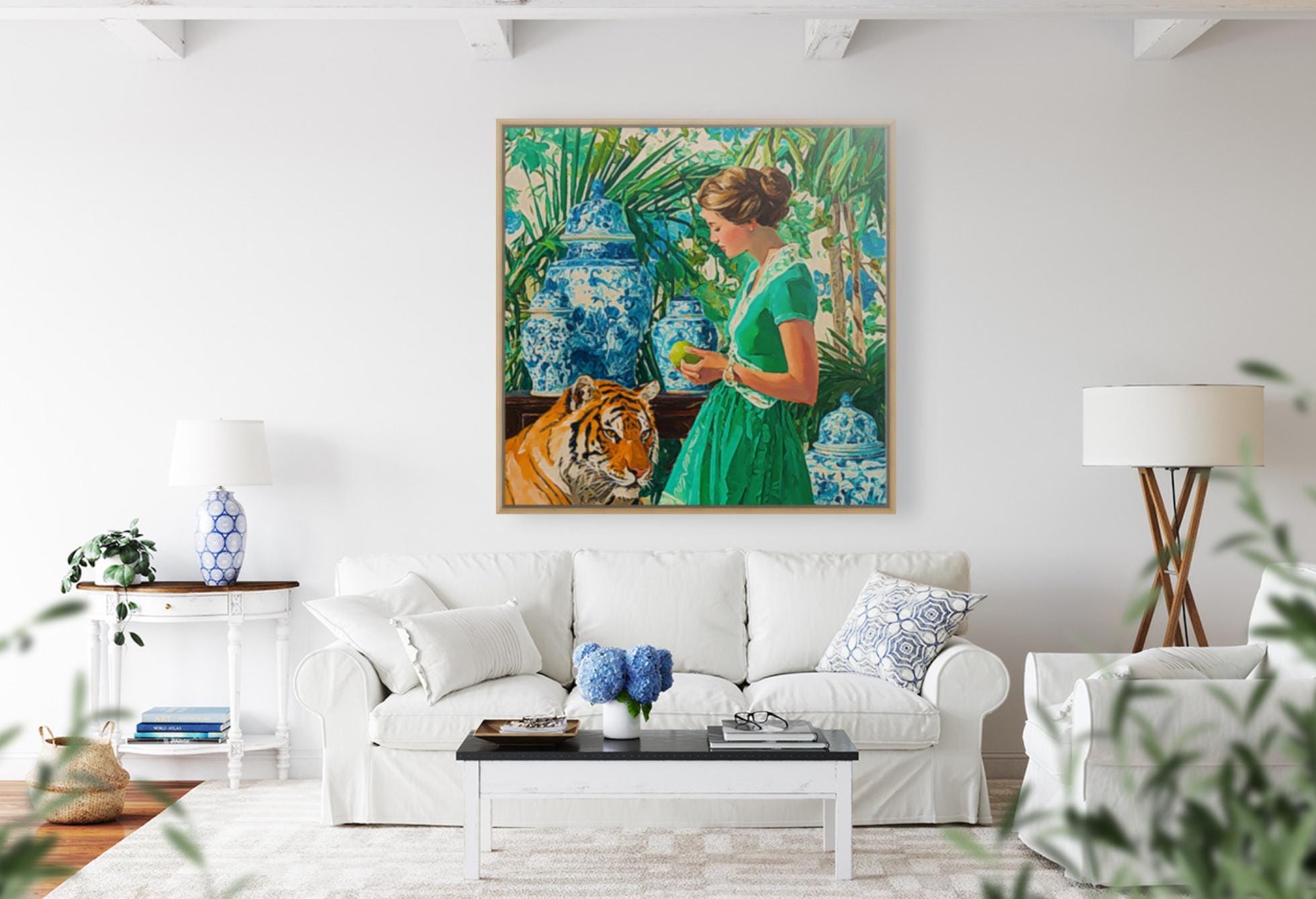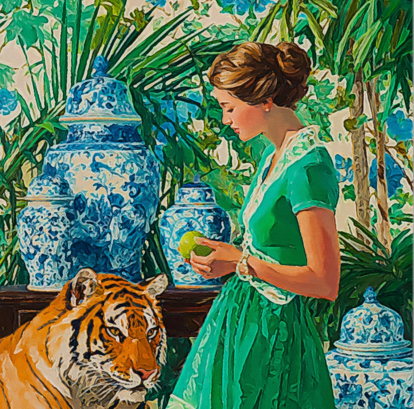 Grandmillennial art, Girl and tiger in green chinoiserie interior, whimsical fine art