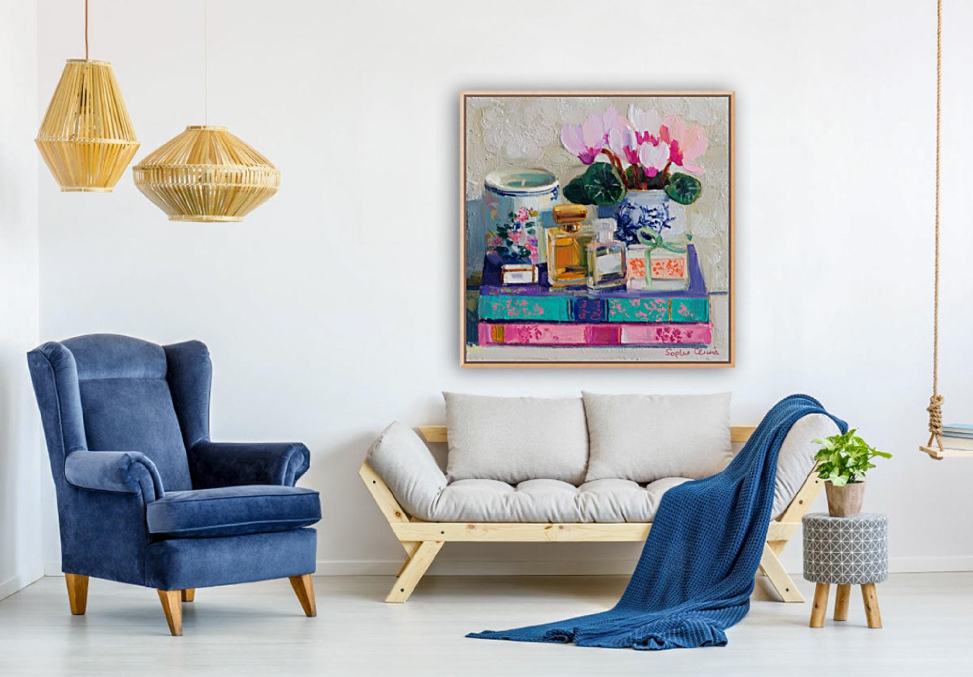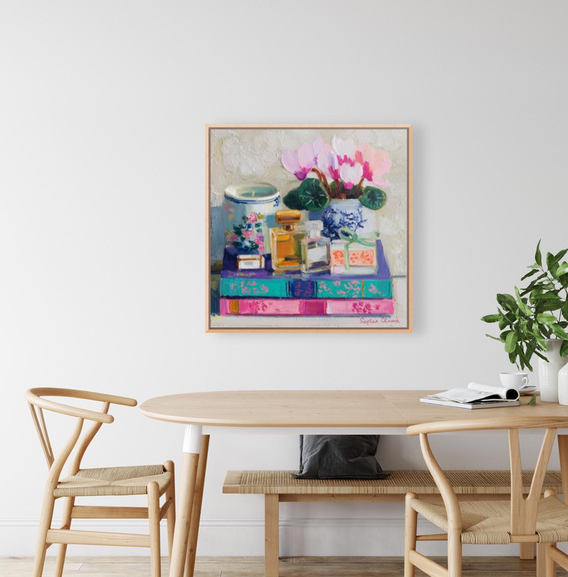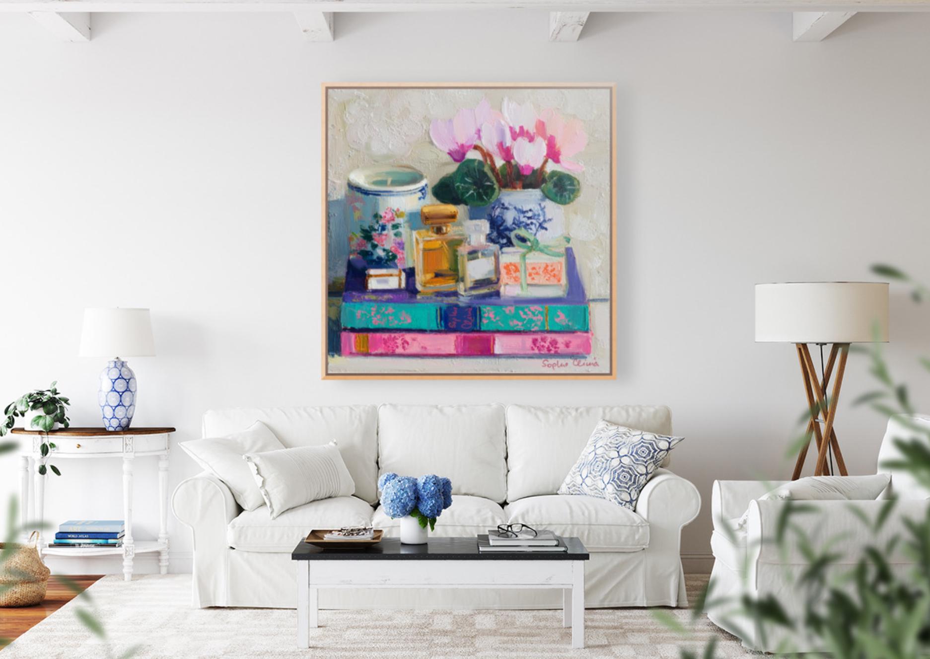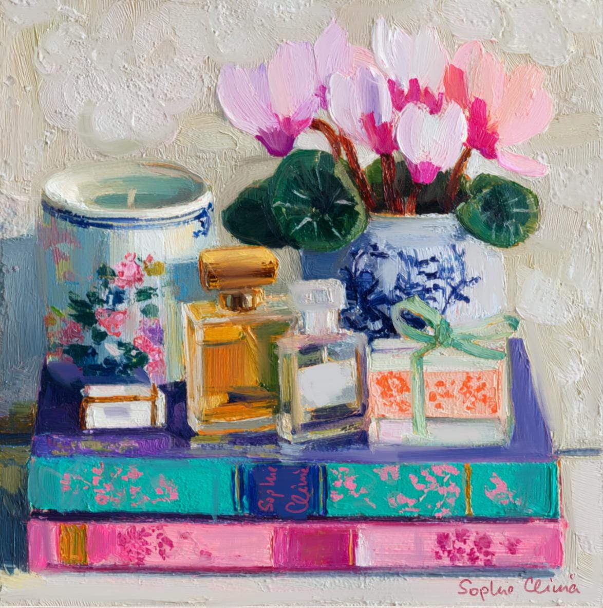 grandmillennial art, Still life with Cyclamen flowers, books and perfume bottles, oil painting