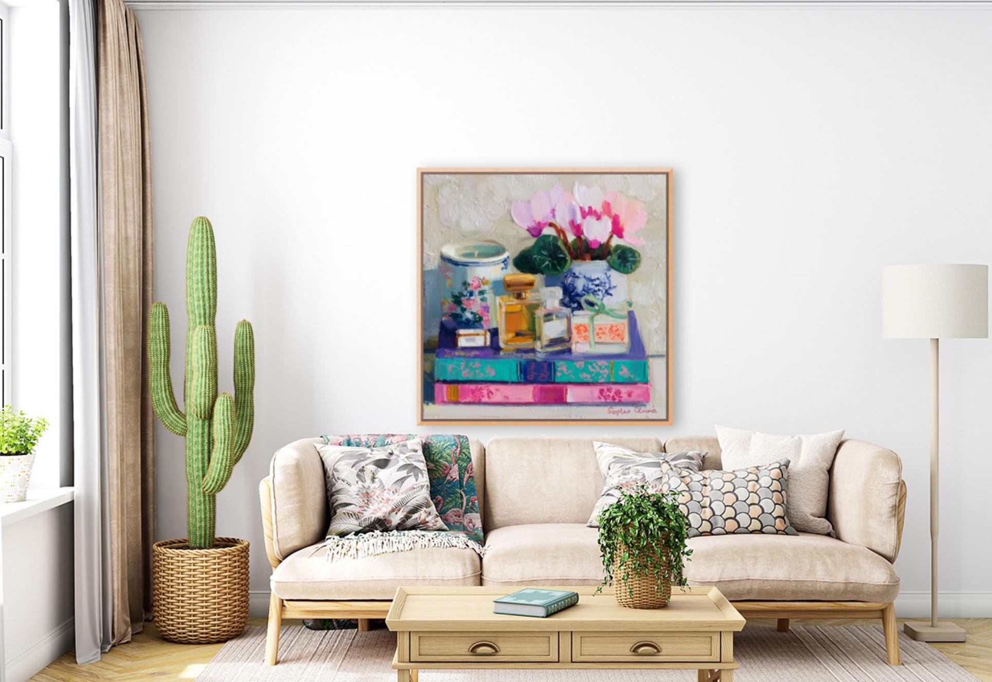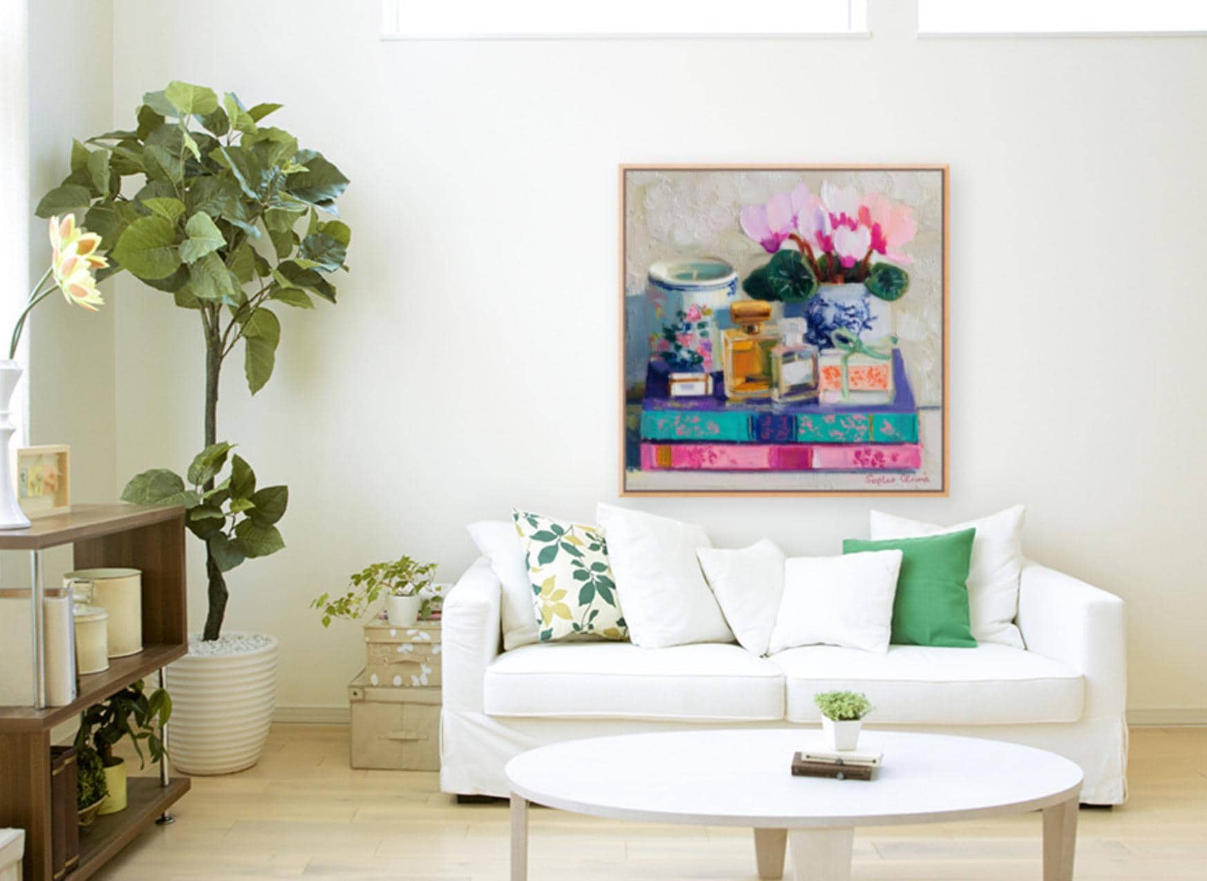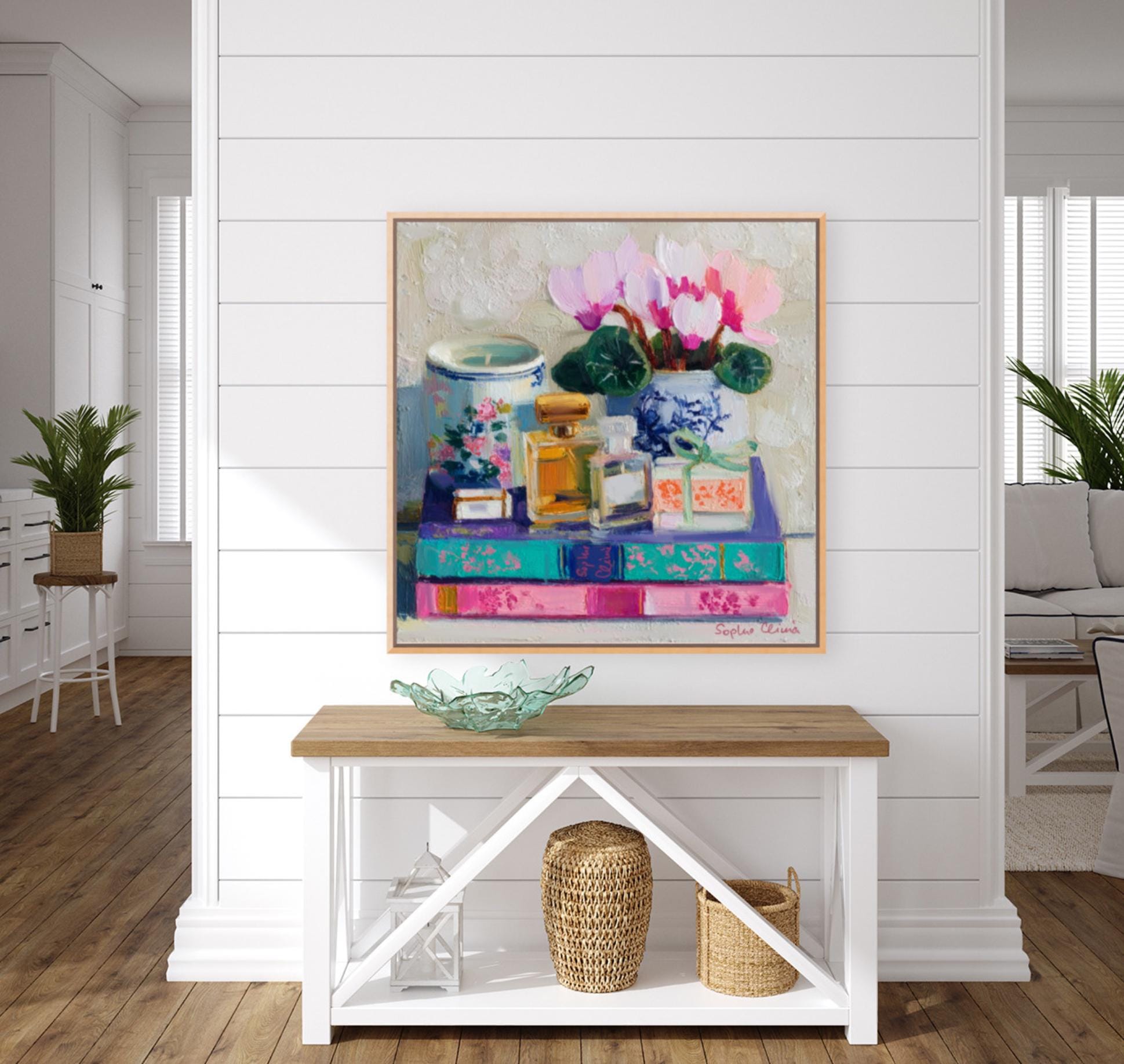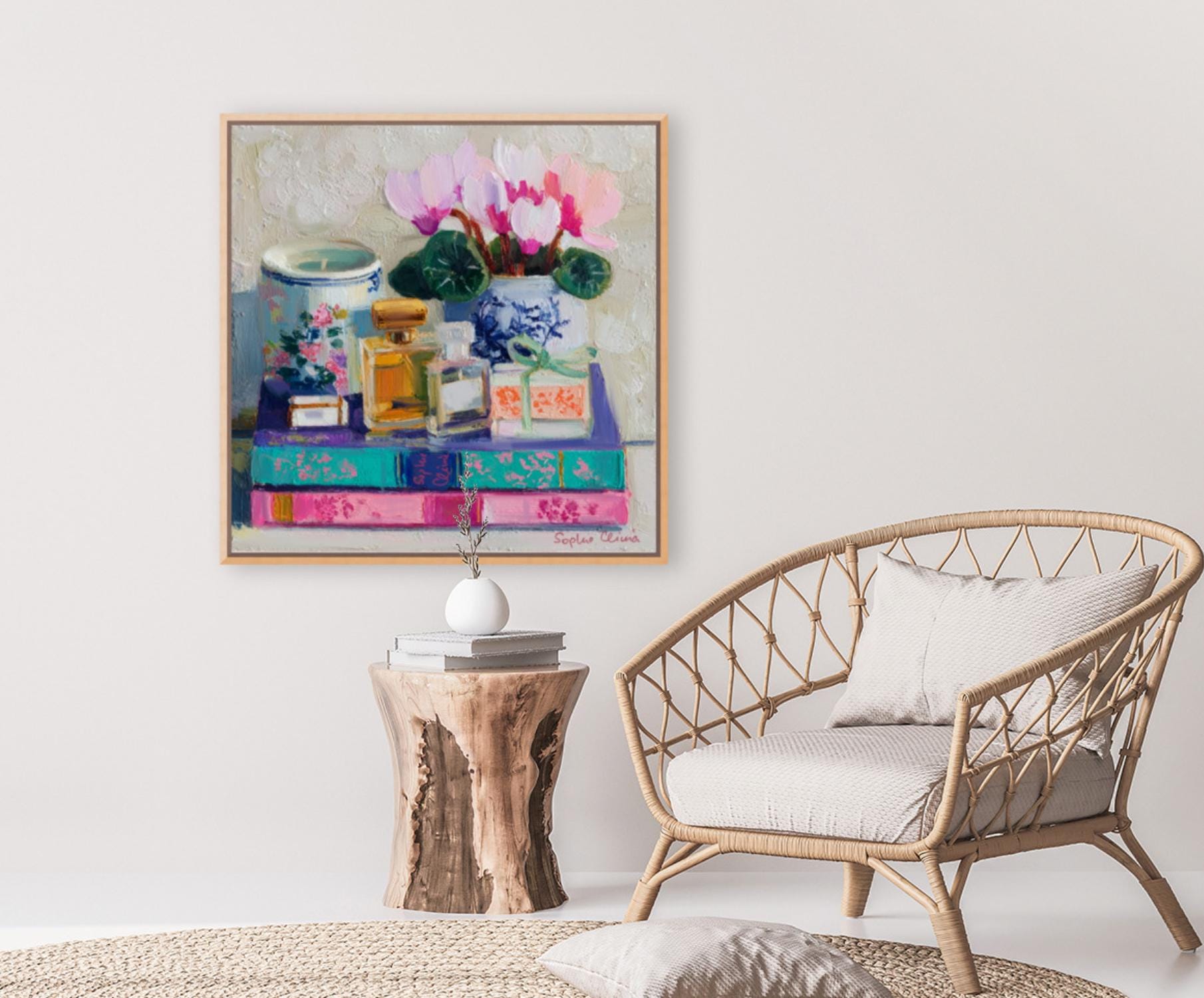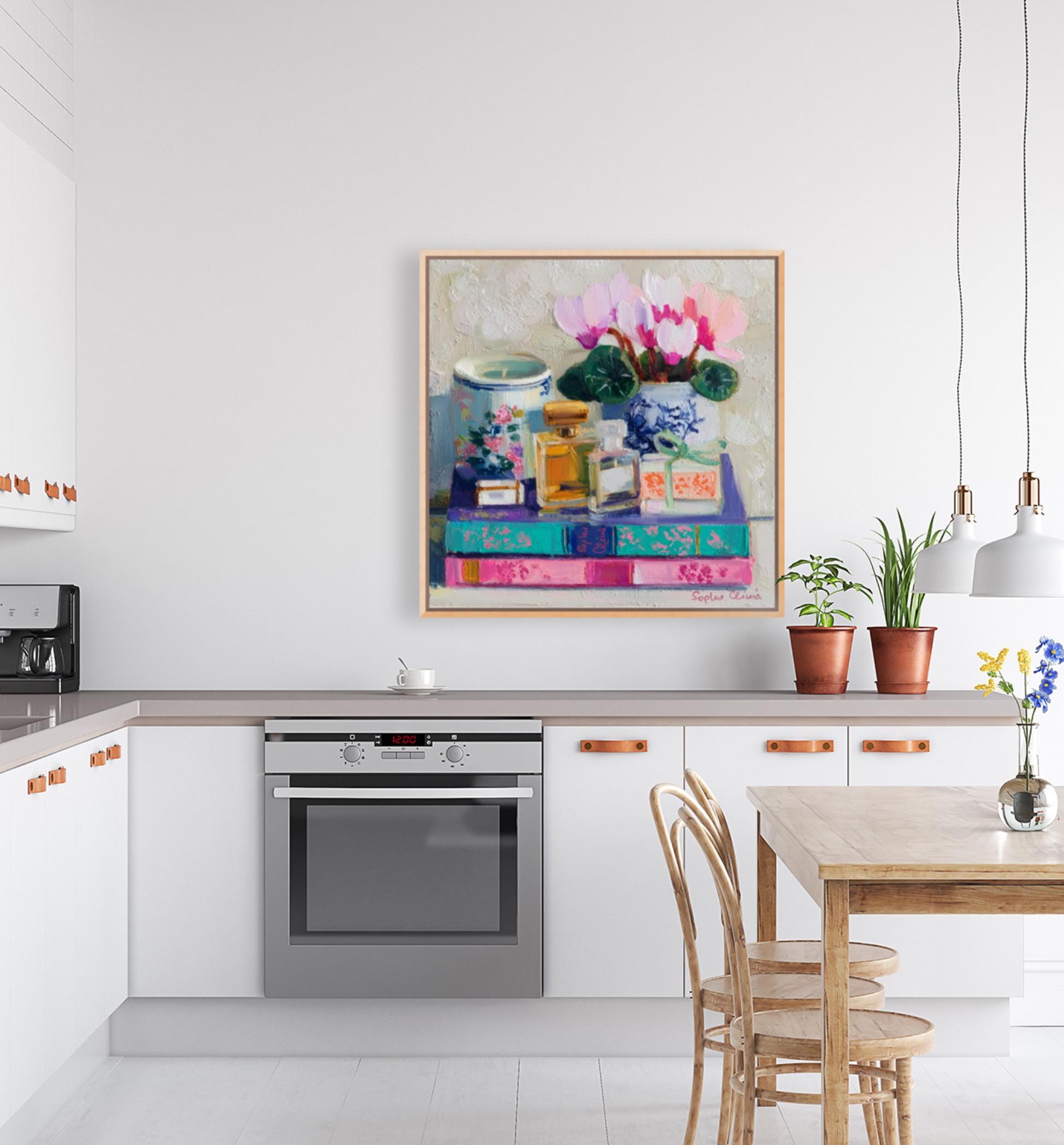 grandmillennial art, Still life with Cyclamen flowers, books and perfume bottles, oil painting