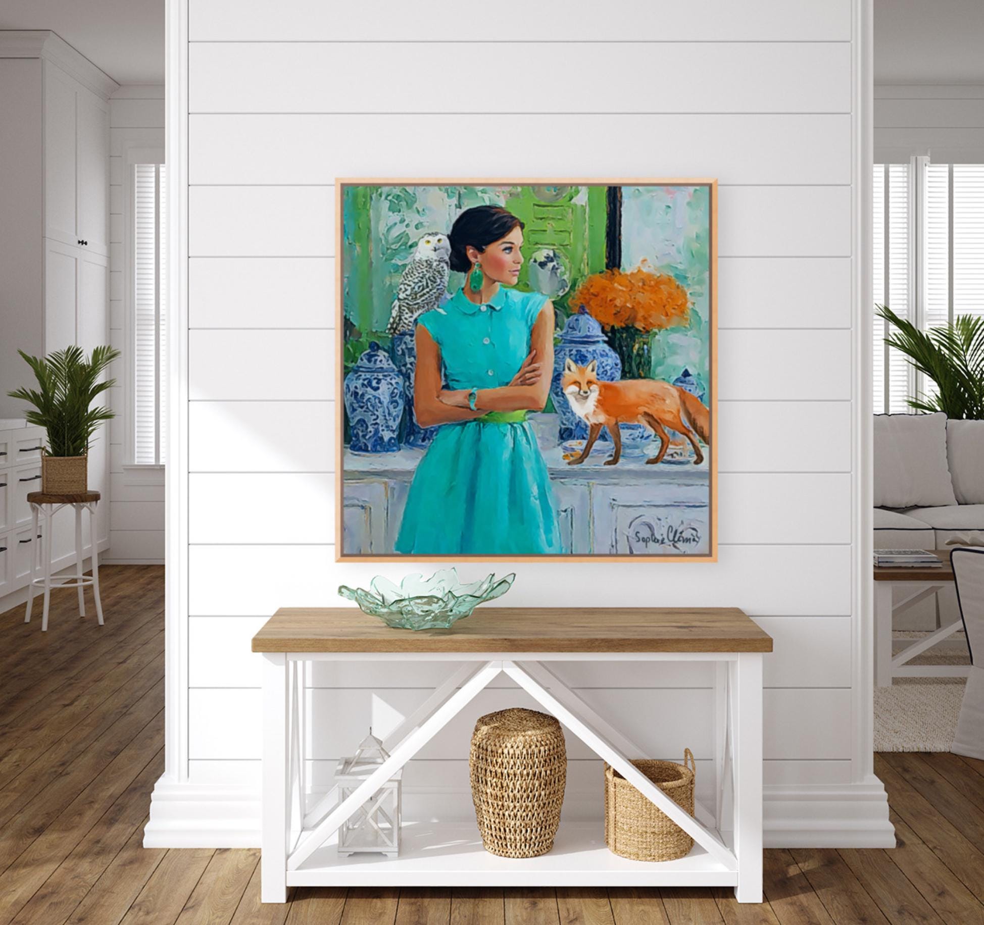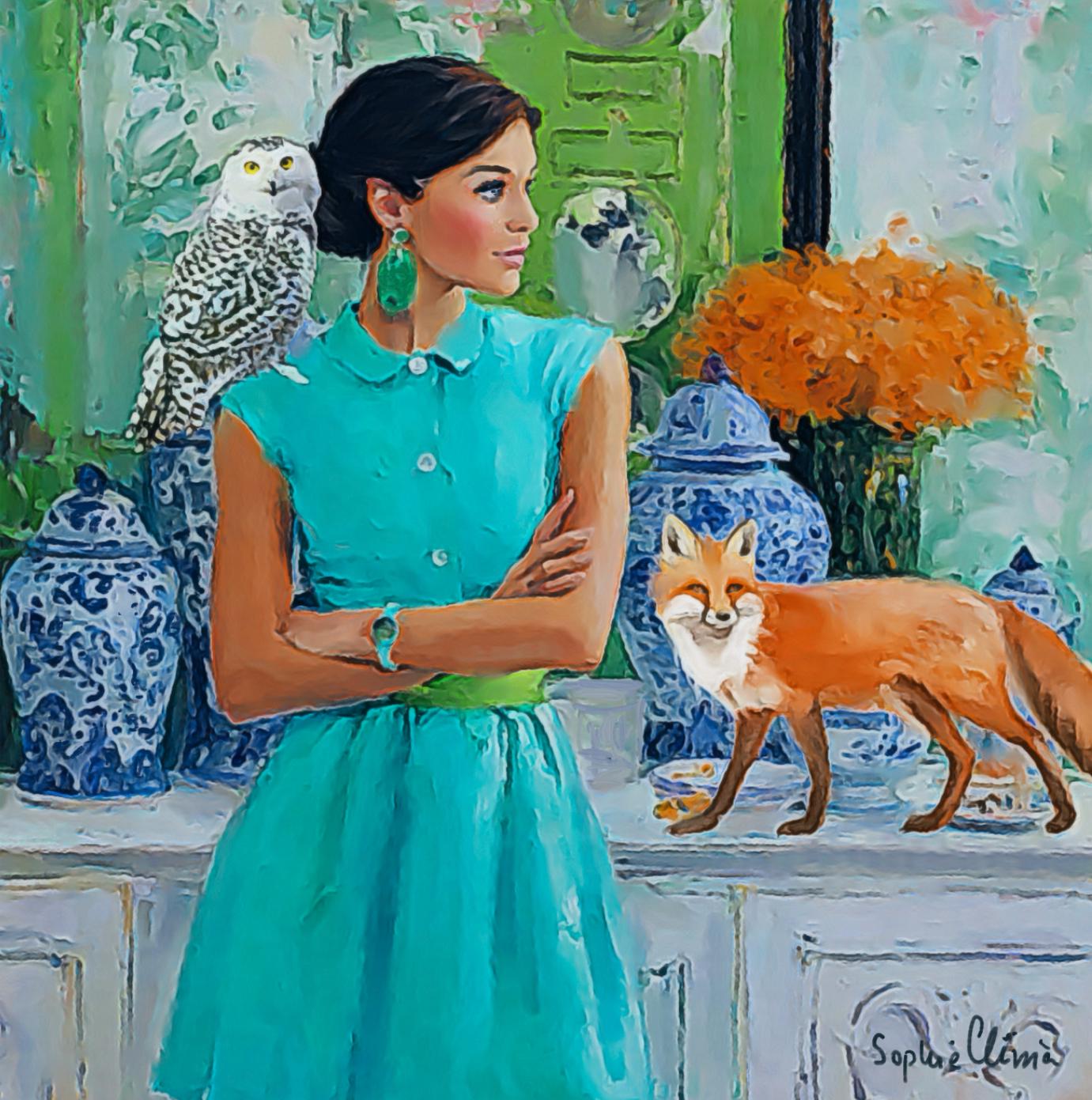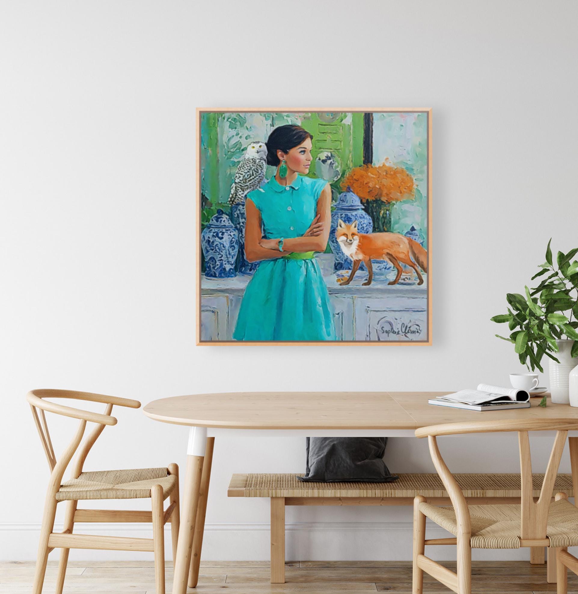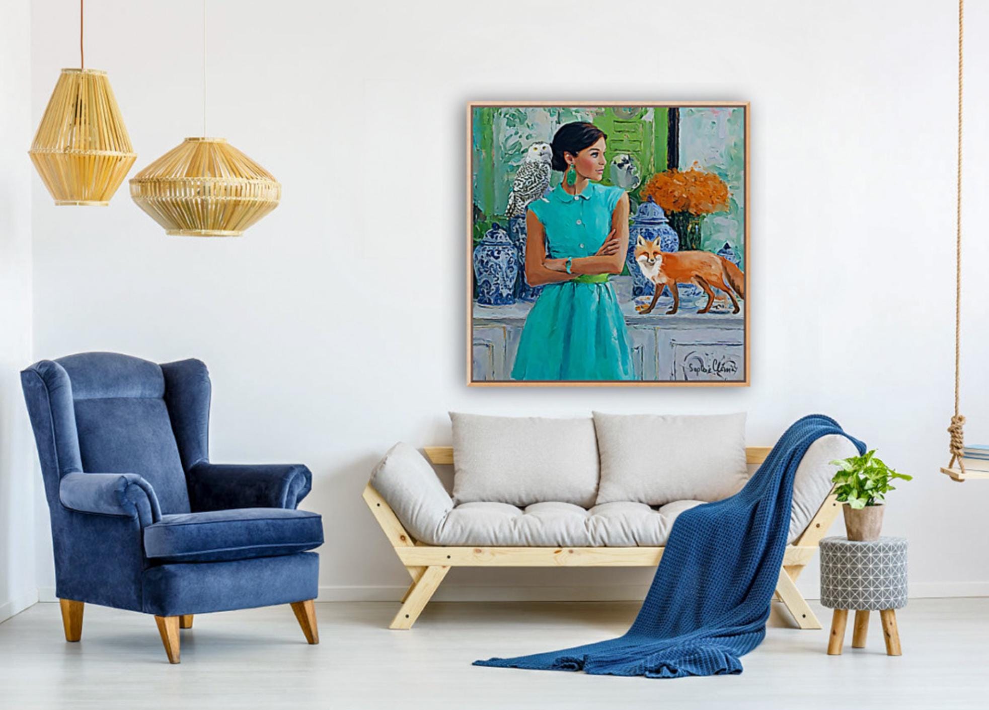 PLEASE NOTE SIZES ARE IN CM. Large giclee print of an original art by Sophie. Fun and whimsical piece. Paper prints are printed using archival ink, on 310 gsm Hahnemuhle German Etching paper. Canvas prints ship ready stretched and UV varnished, Paper prints are shipped rolled in a hard cardboard tube. Bring timeless charm and preppy elegance into your home with this Grandmillennial art print, featuring a stylish woman in a turquoise dress, a wise snowy owl, and a playful fox amidst classic blue and white chinoiserie jars. Perfect for those who adore Palm Beach style, southern chic interiors, and whimsical animal art, this piece adds sophistication with a touch of imagination.