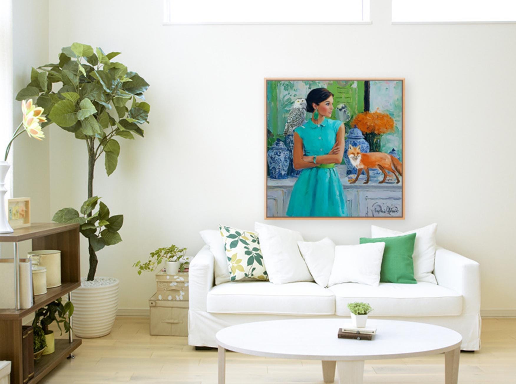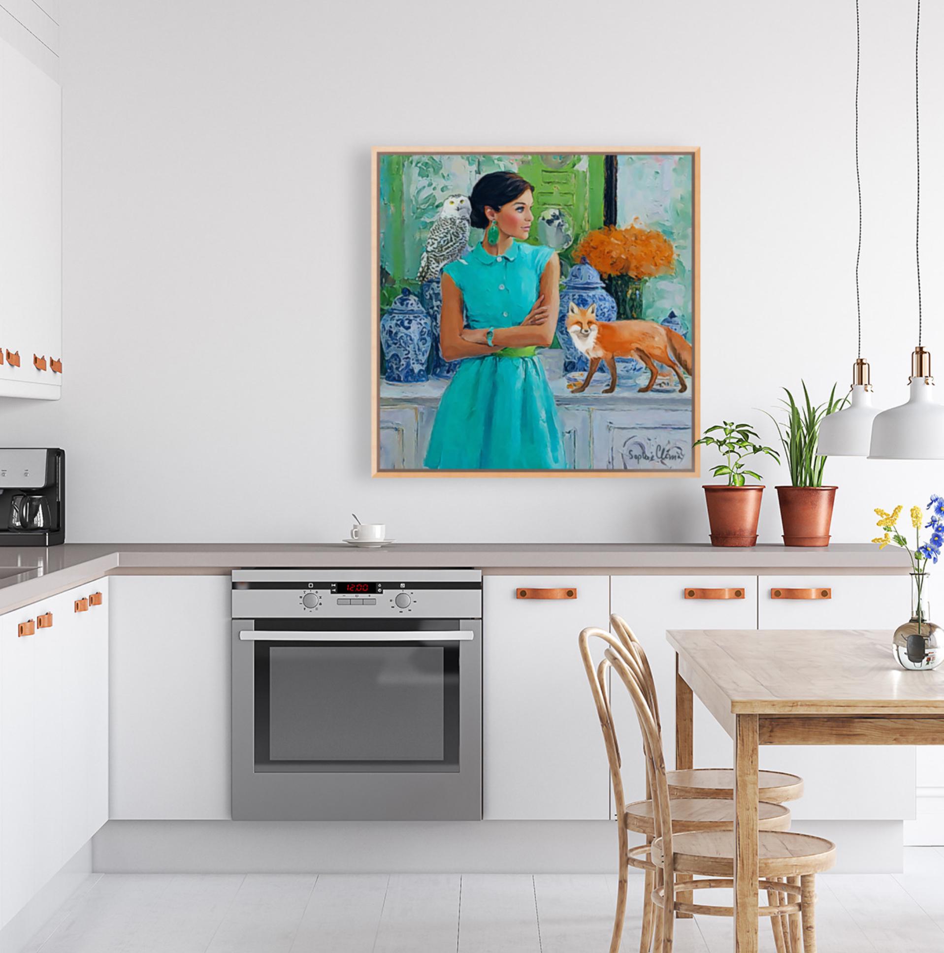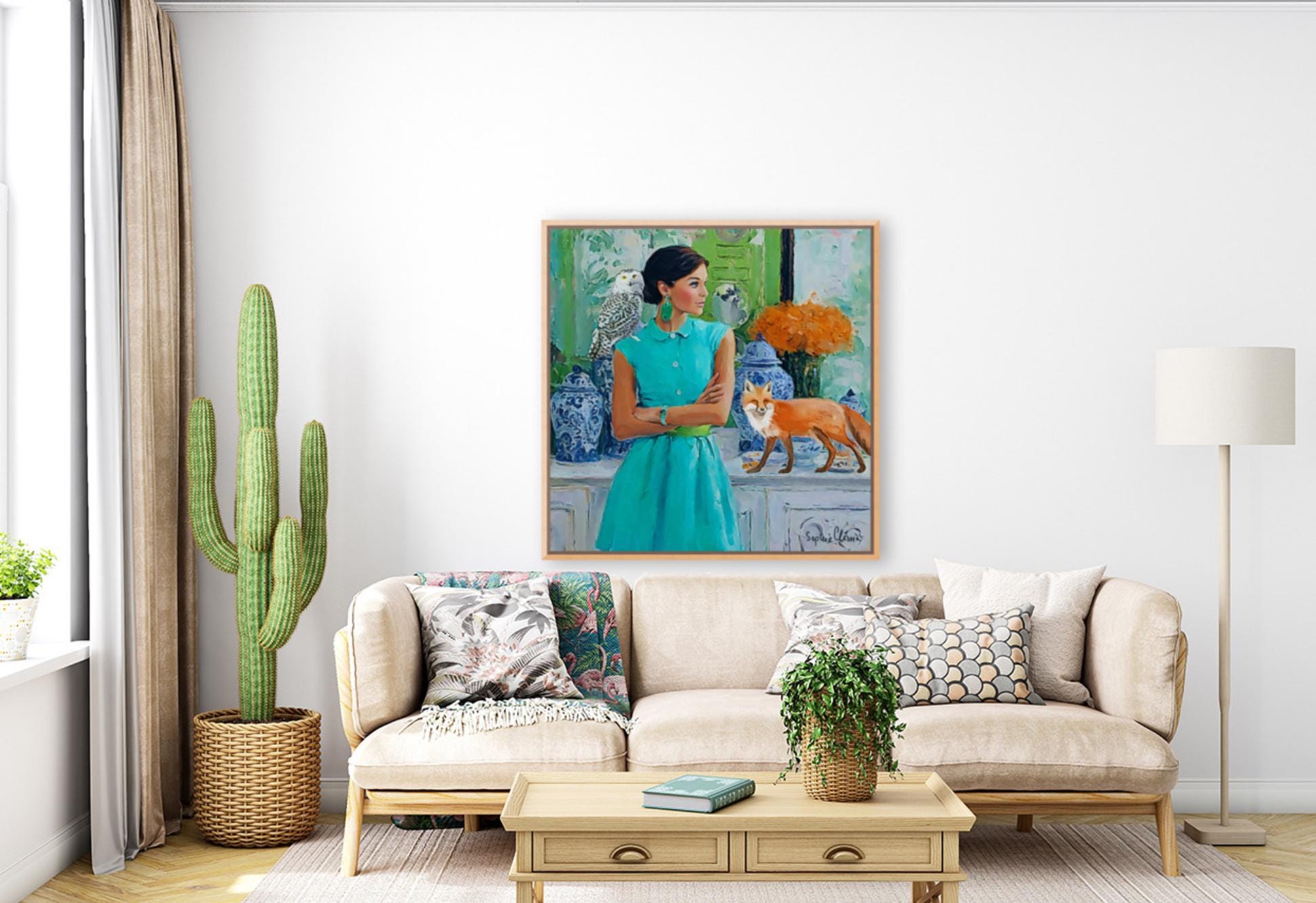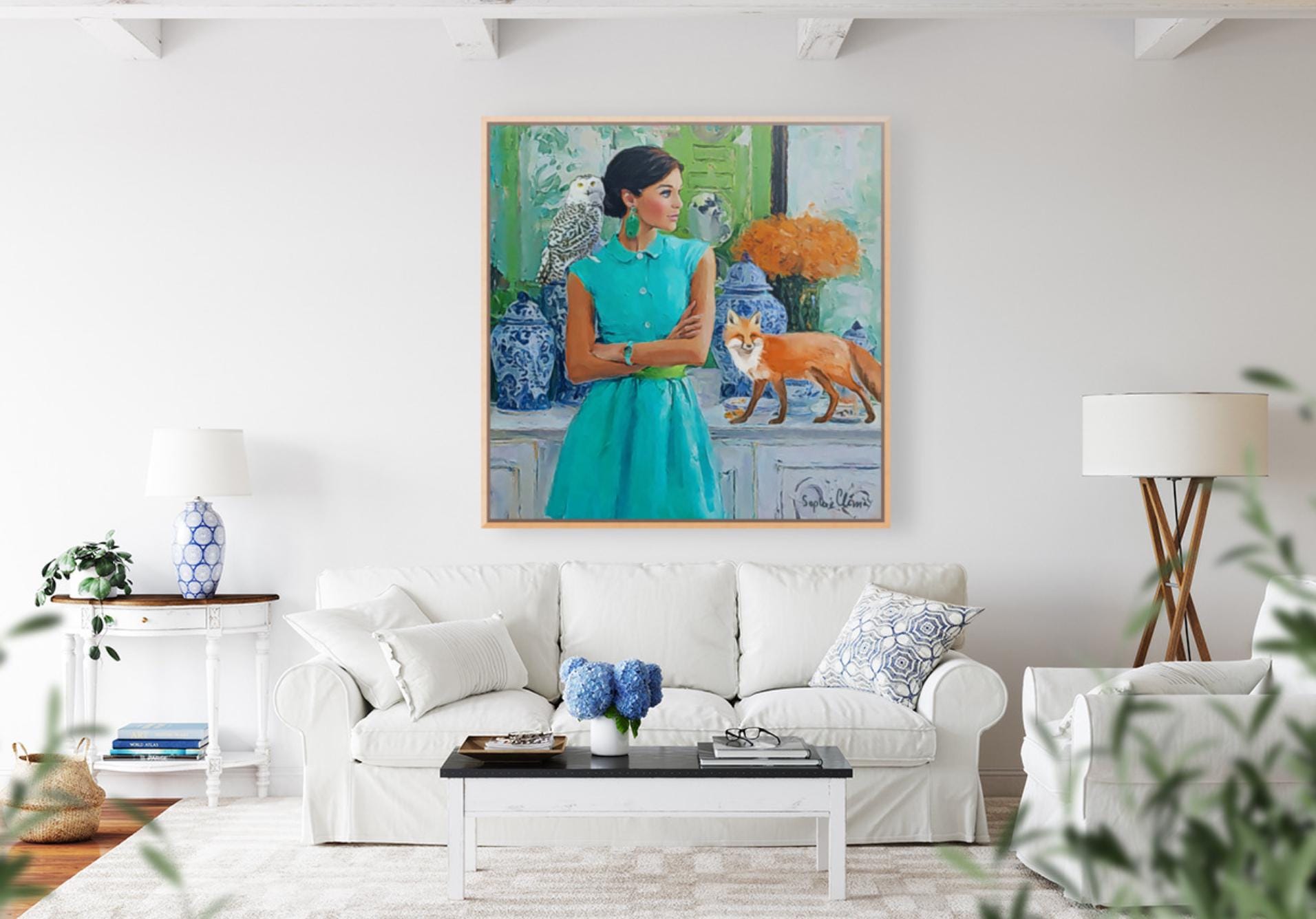 PLEASE NOTE SIZES ARE IN CM. Large giclee print of an original art by Sophie. Fun and whimsical piece. Paper prints are printed using archival ink, on 310 gsm Hahnemuhle German Etching paper. Canvas prints ship ready stretched and UV varnished, Paper prints are shipped rolled in a hard cardboard tube. Bring timeless charm and preppy elegance into your home with this Grandmillennial art print, featuring a stylish woman in a turquoise dress, a wise snowy owl, and a playful fox amidst classic blue and white chinoiserie jars. Perfect for those who adore Palm Beach style, southern chic interiors, and whimsical animal art, this piece adds sophistication with a touch of imagination.