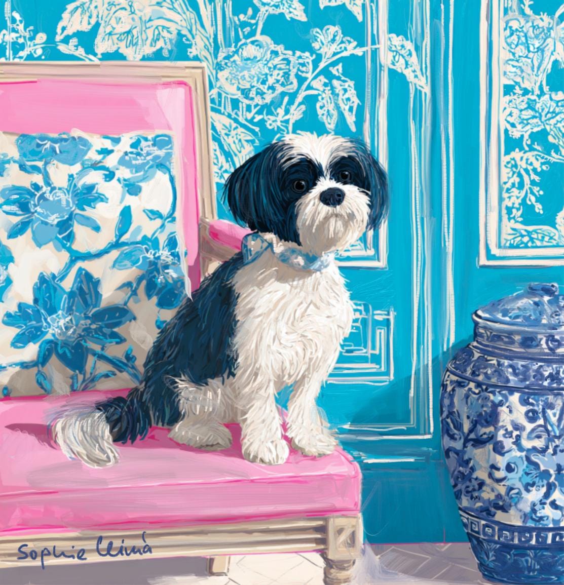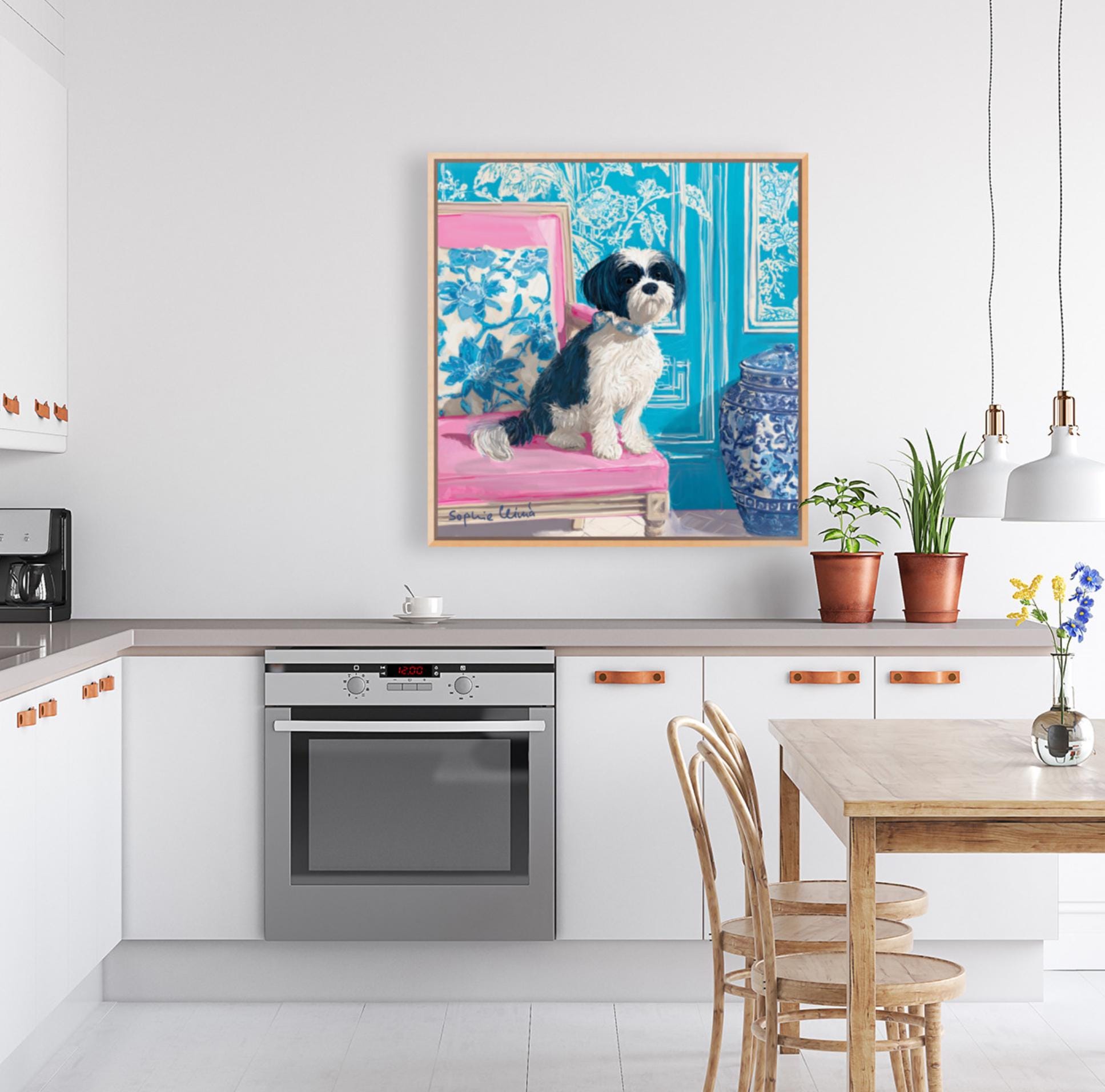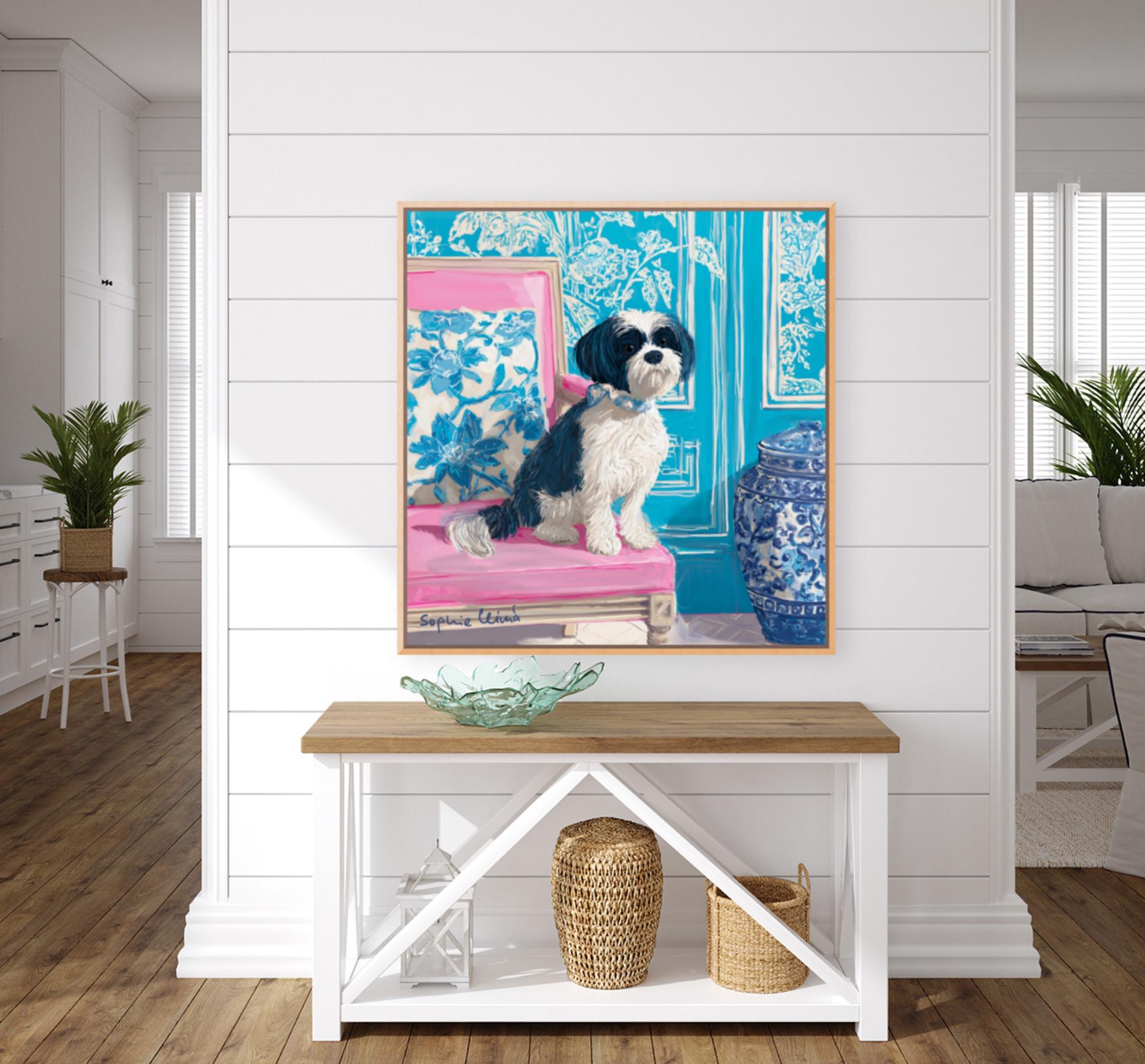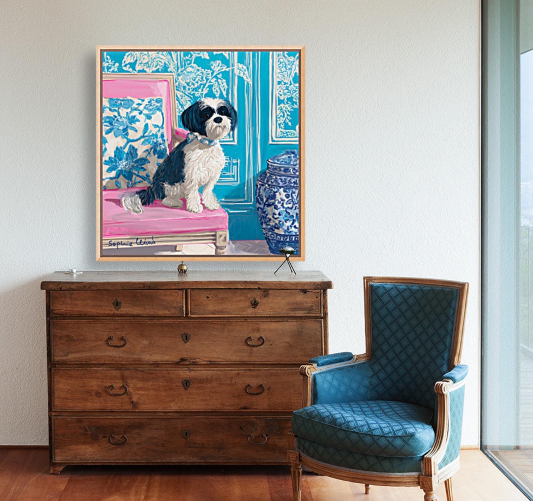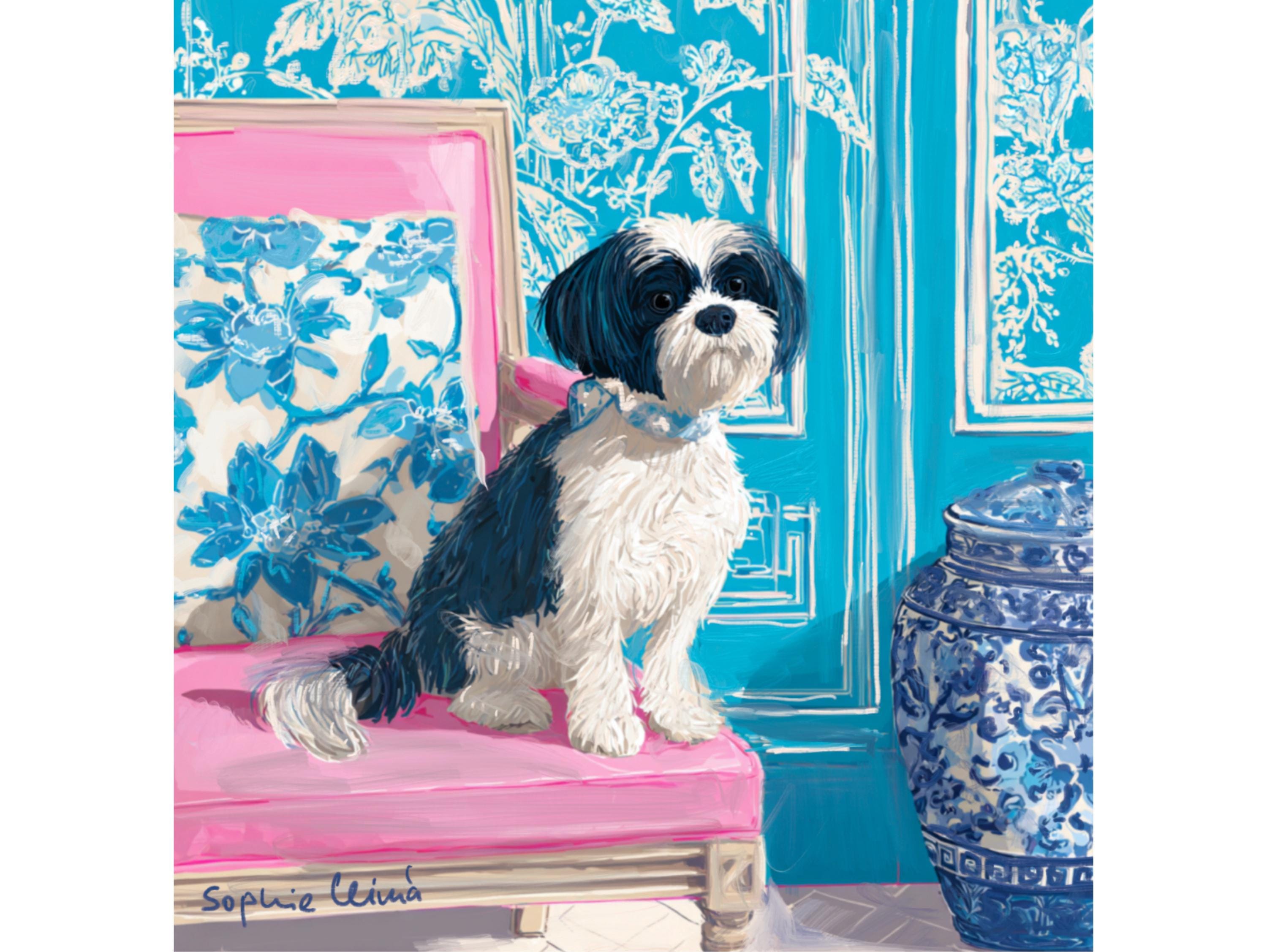 Grandmillennial art, Fluffy terrier in preppy turquoise chinoiserie interior, whimsical dog art