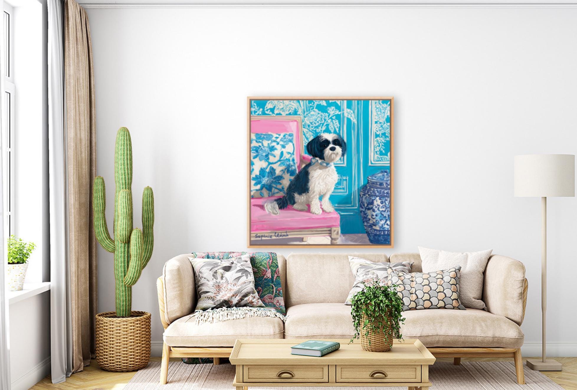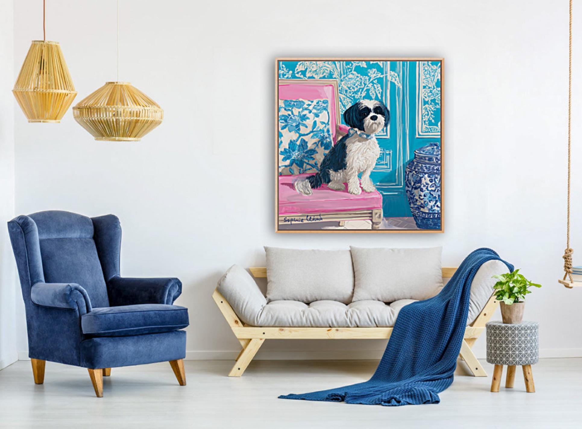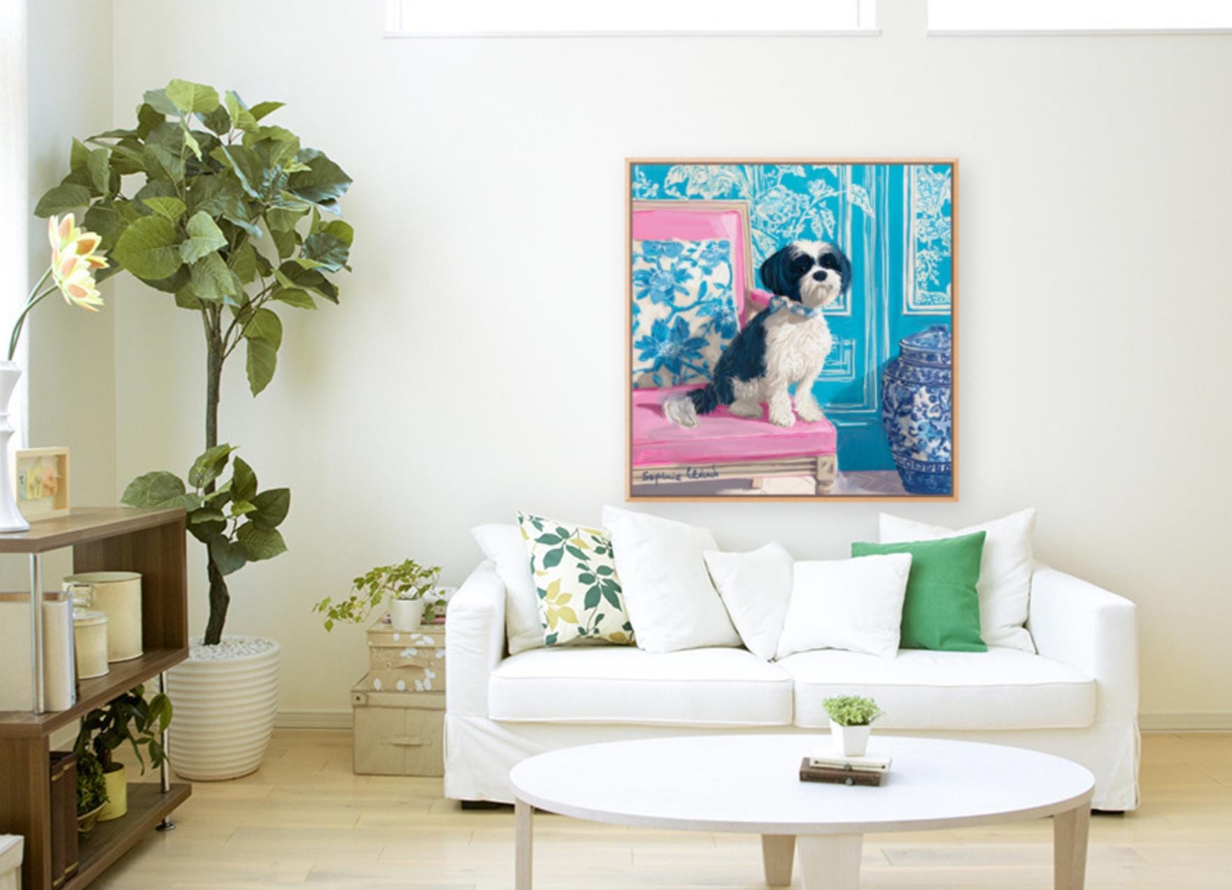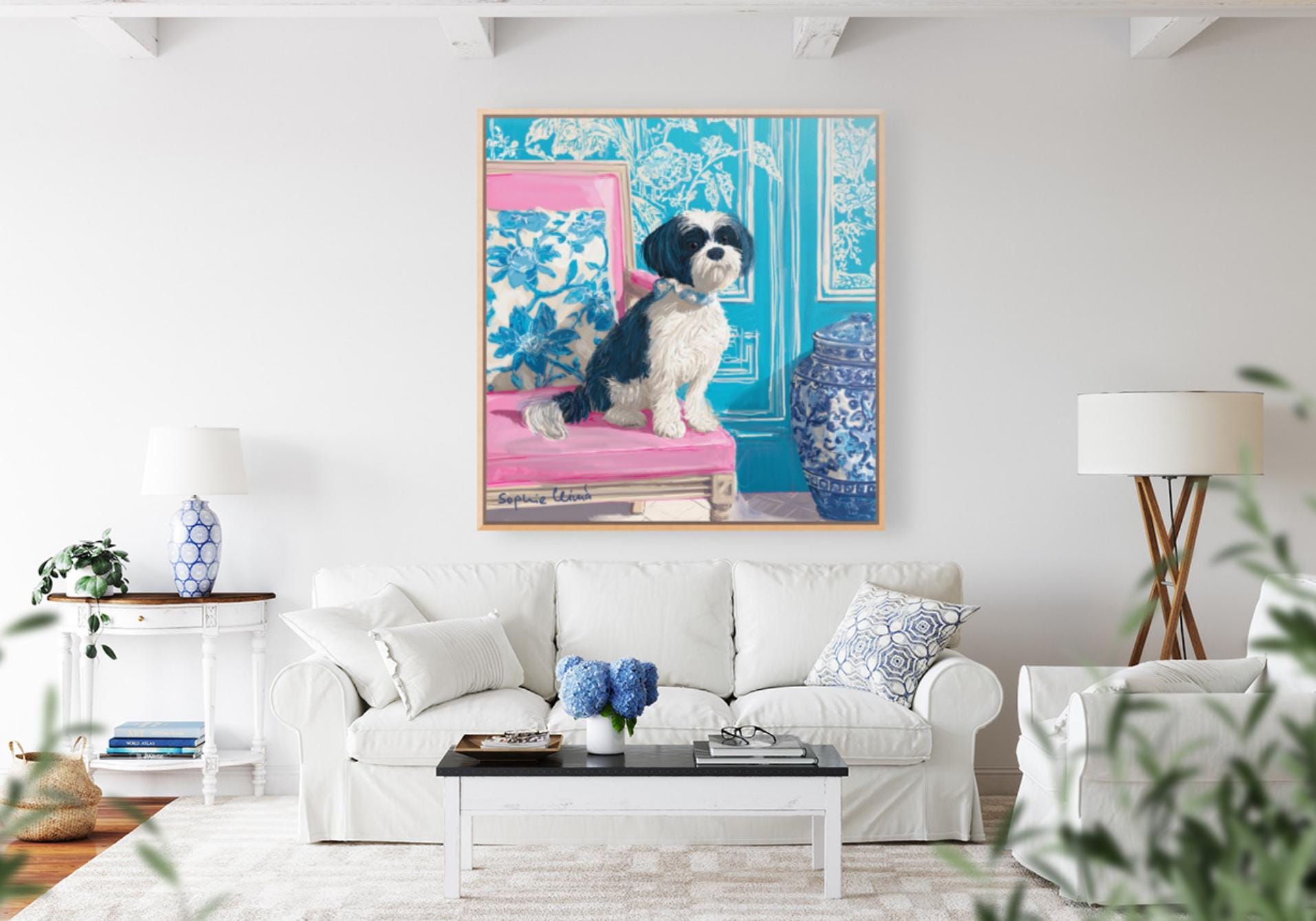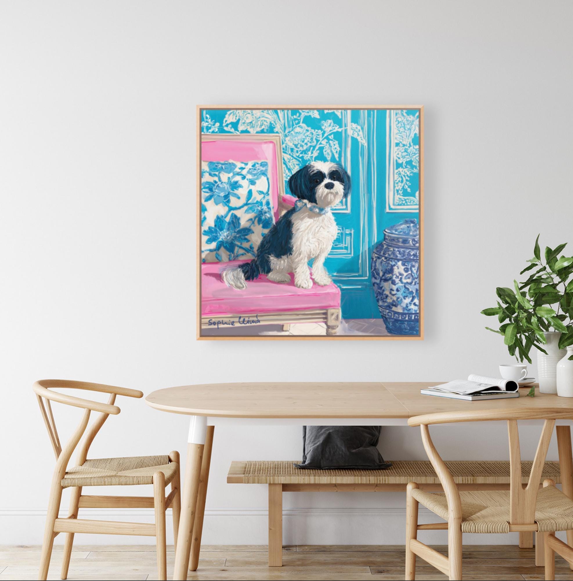 Grandmillennial art, Fluffy terrier in preppy turquoise chinoiserie interior, whimsical dog art