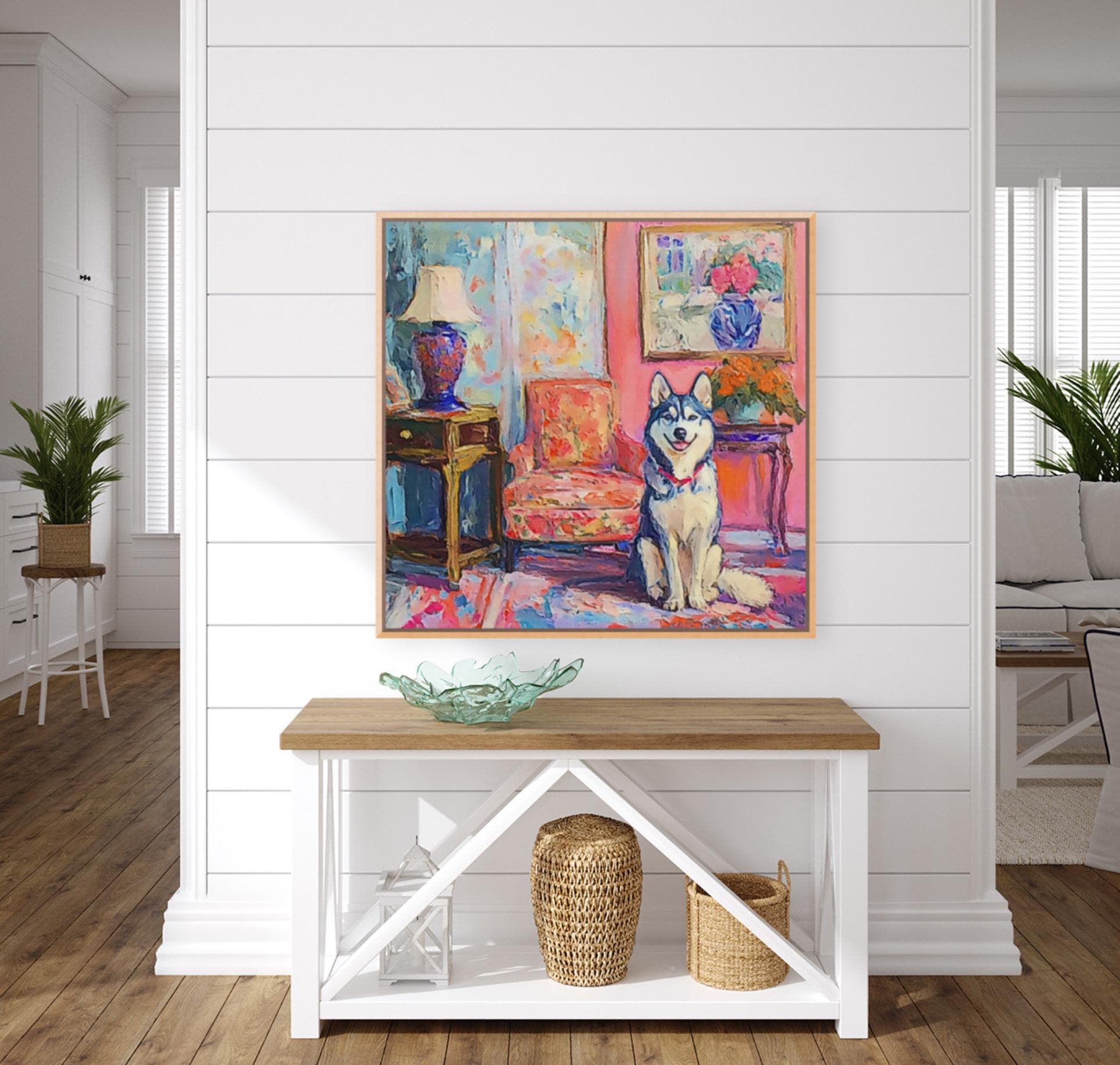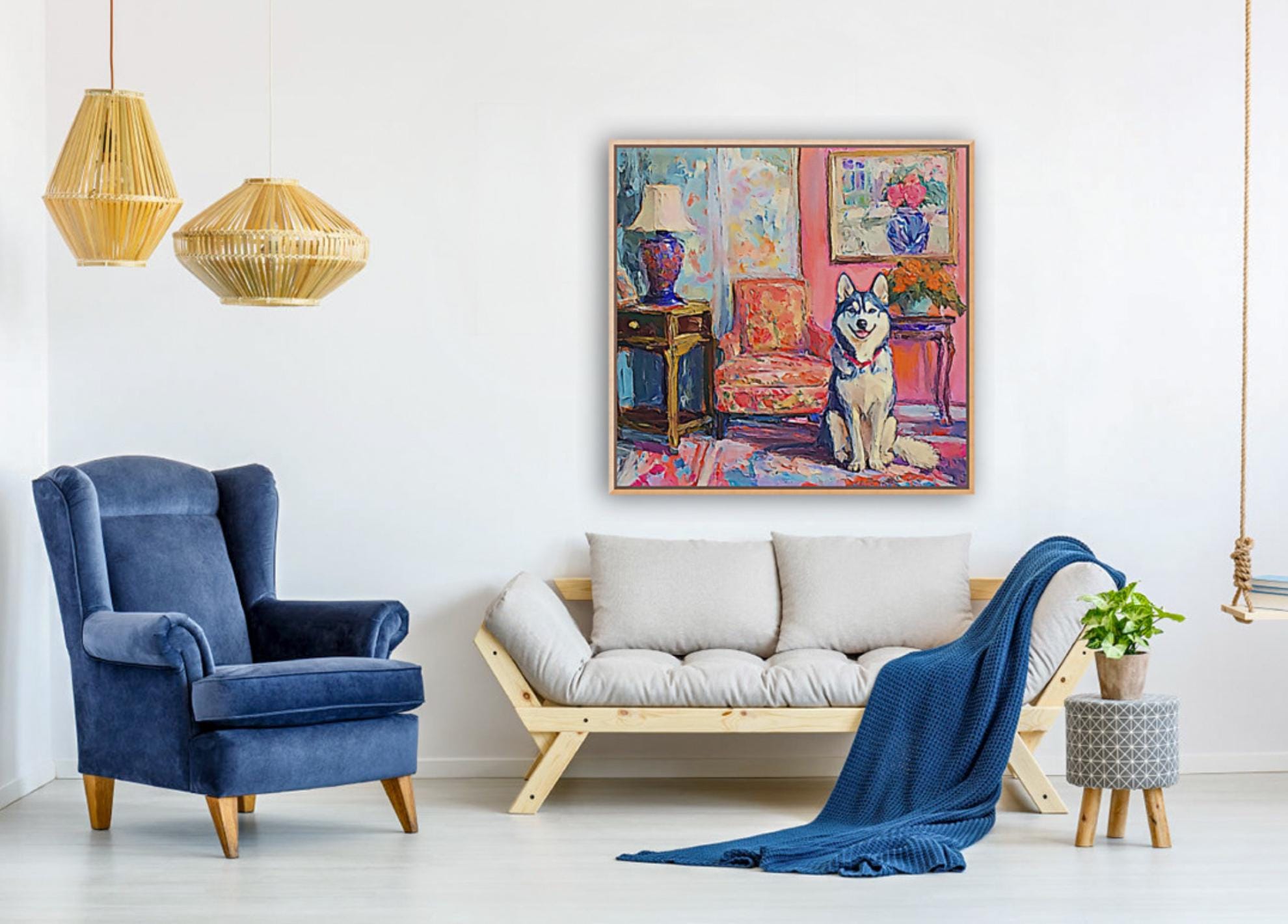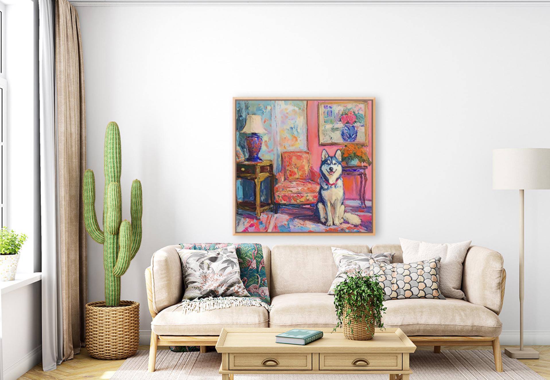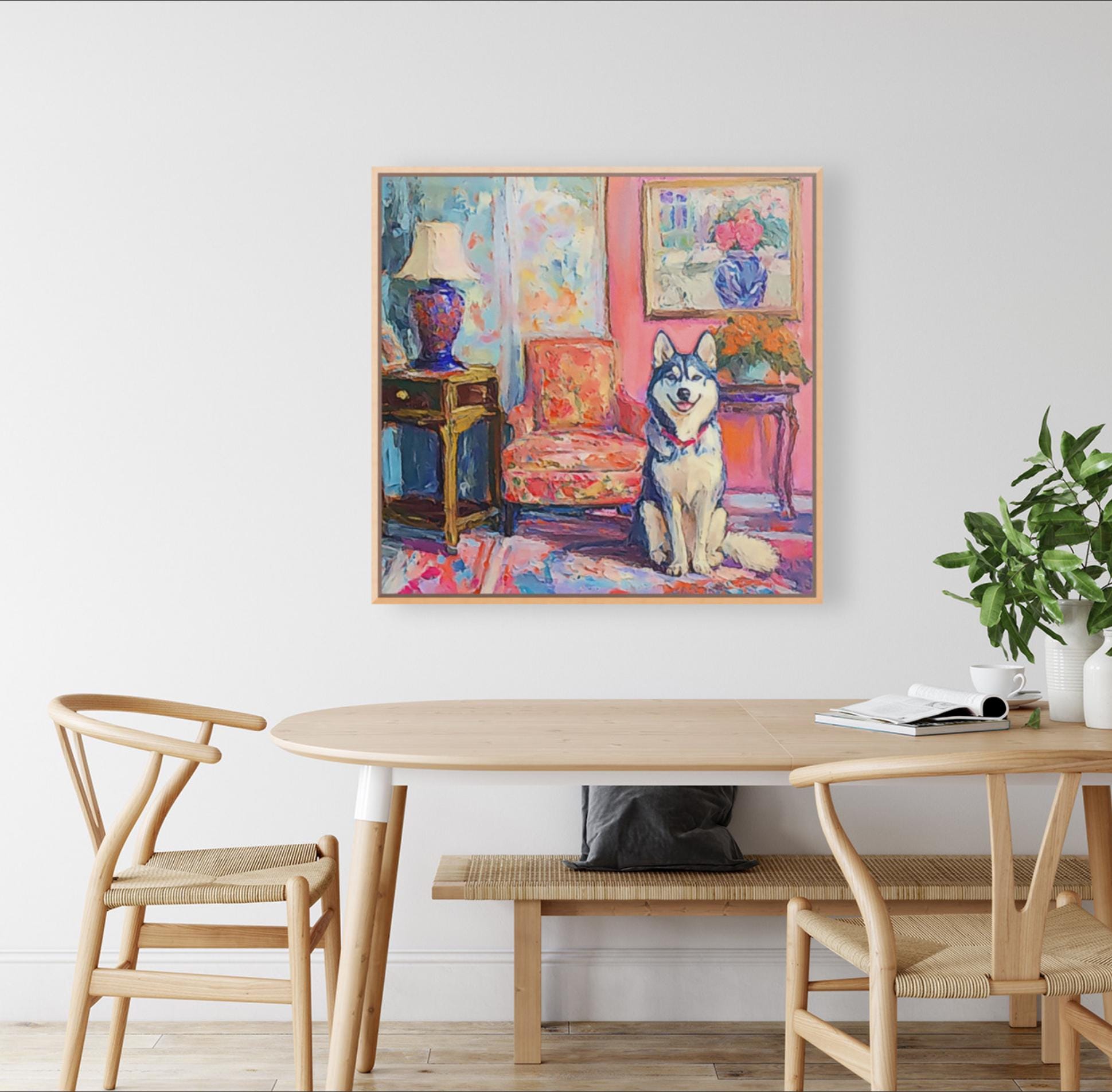 Grandmillennial art, Smiling Husky in Orange interior, whimsical fine art